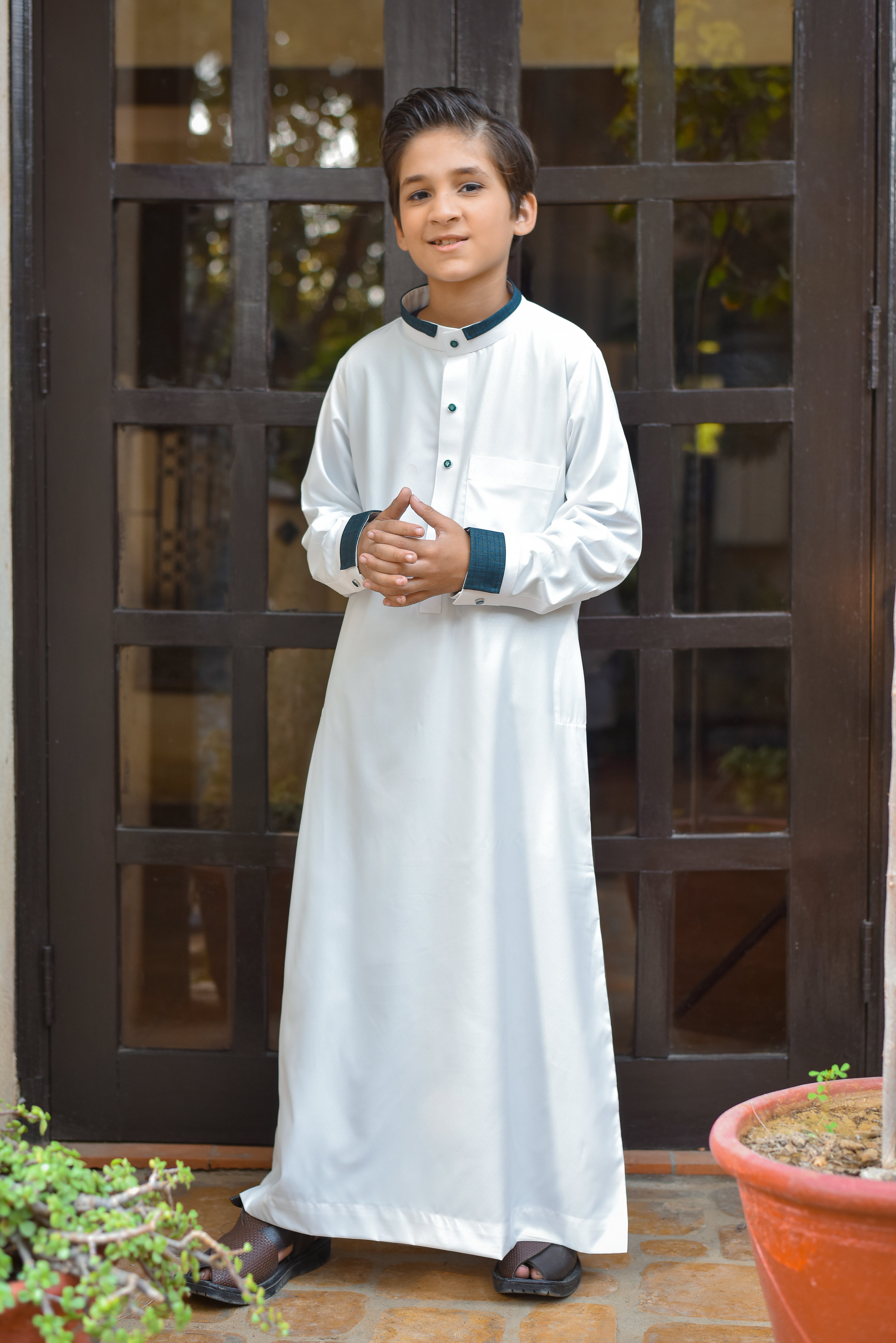White Omani Round Neck Long Sleeve Jubba with Stitched Embroidery Design
