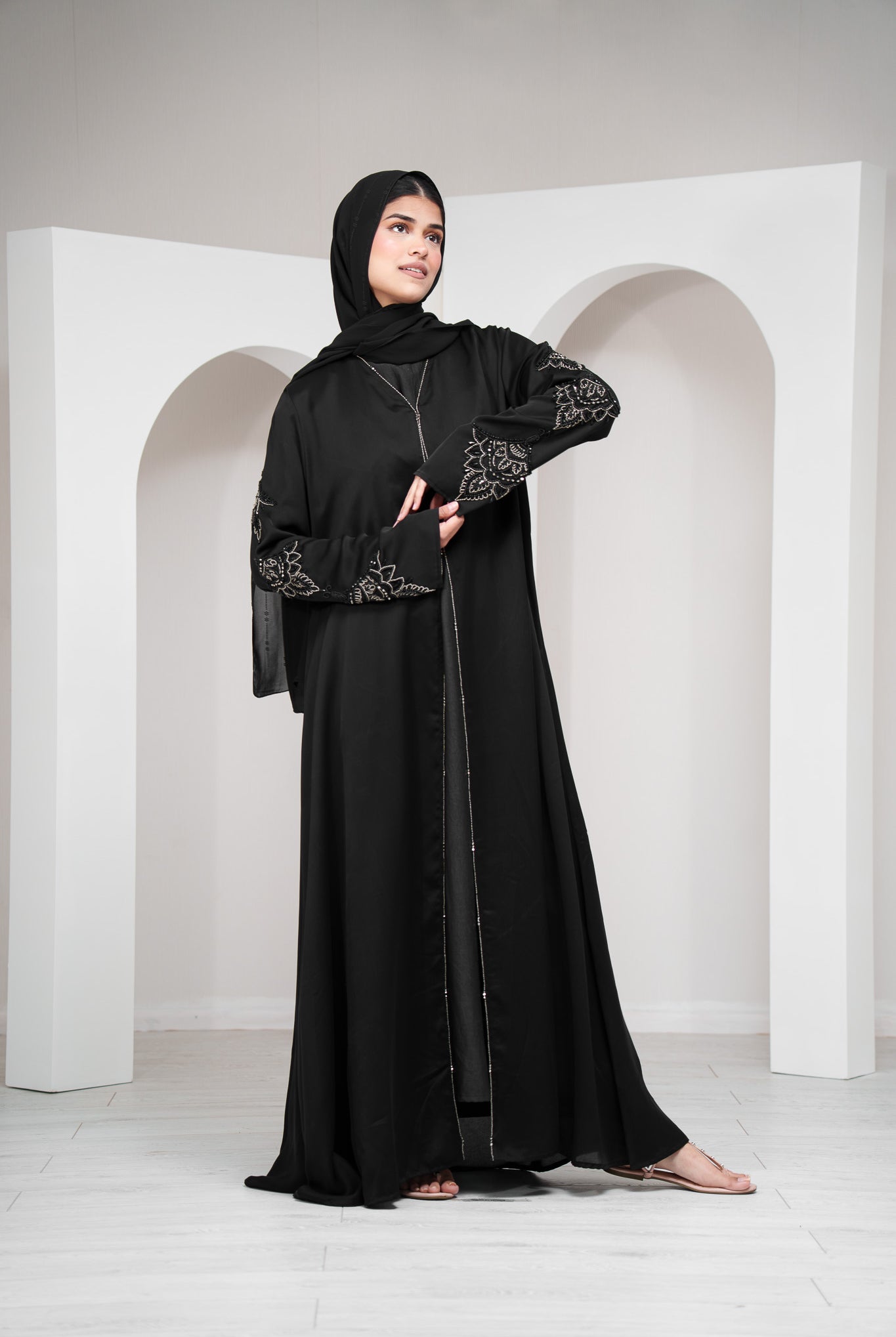 Black Luxury Women’s Satin/Silk Abaya with Clasp Closure – Beaded Embroidered Sleeves
