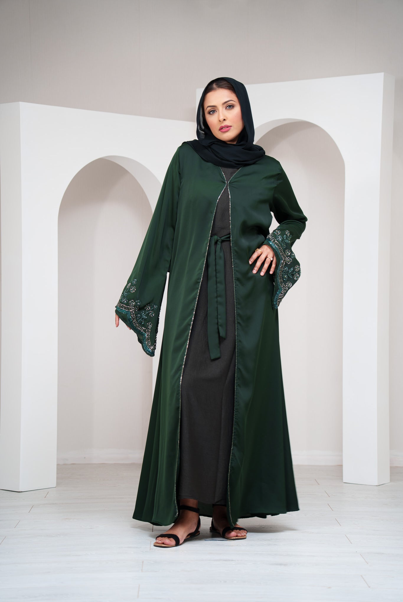 Emerald Green Elegant Women’s 2-Piece Open Abaya Set with Diamanté Cape Sleeves