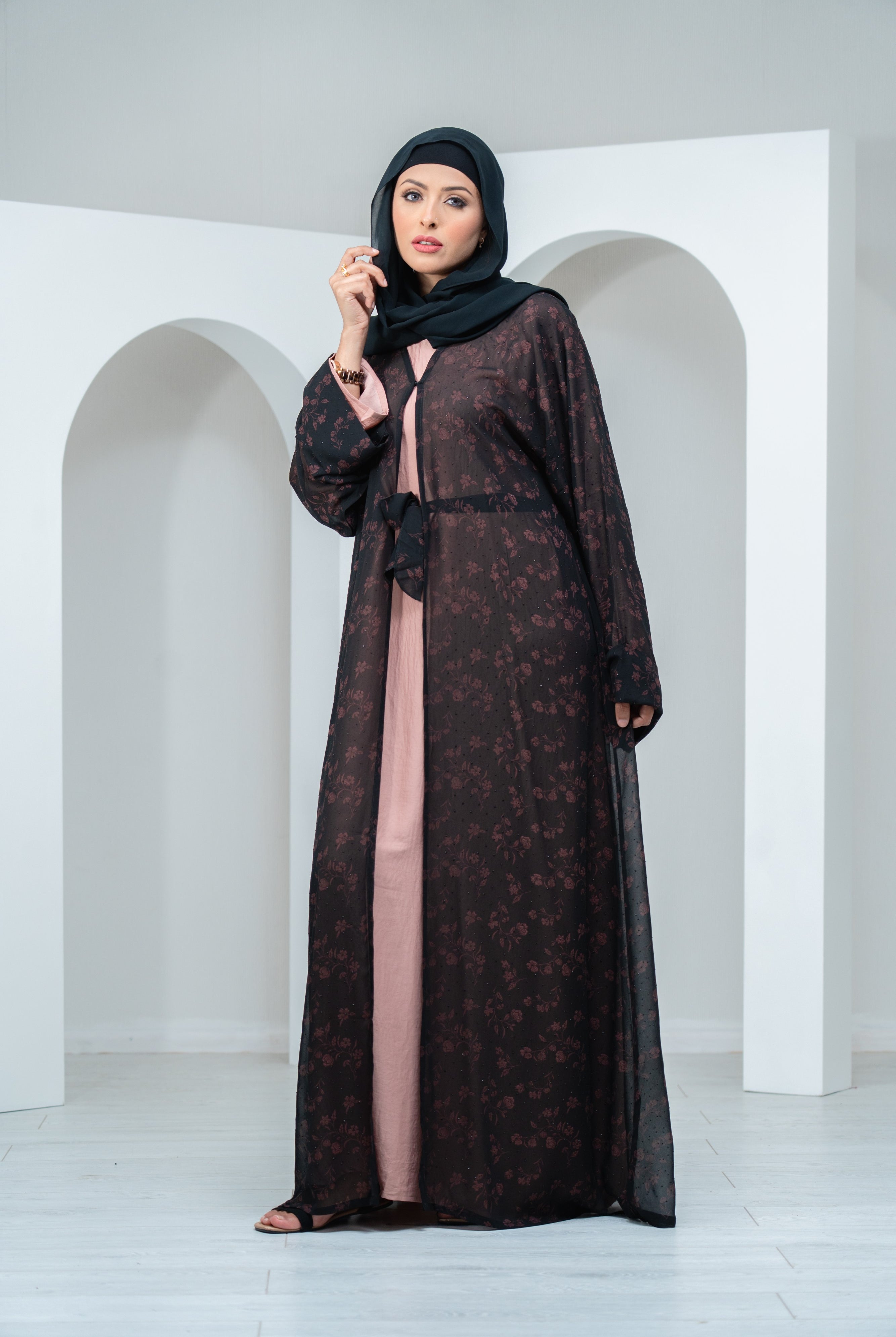 Pink Chiffon Summer Abaya/Kimono with Matching Printed Belt