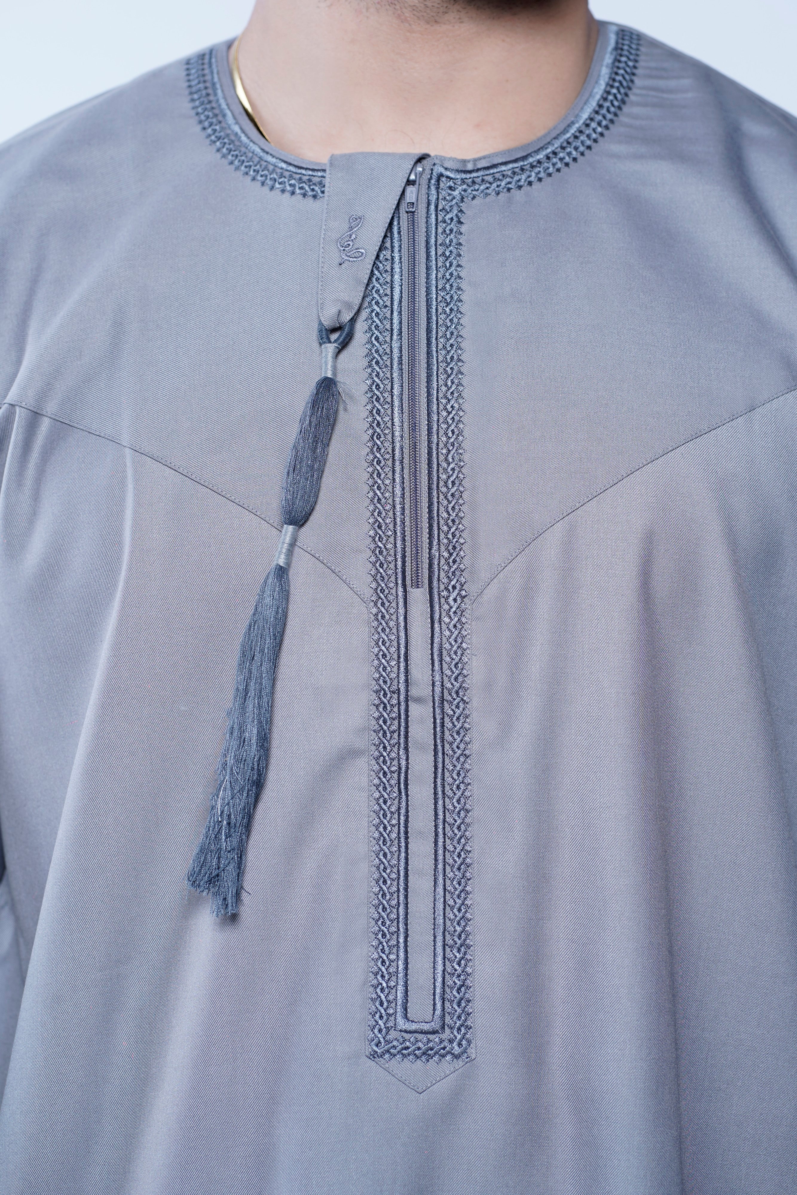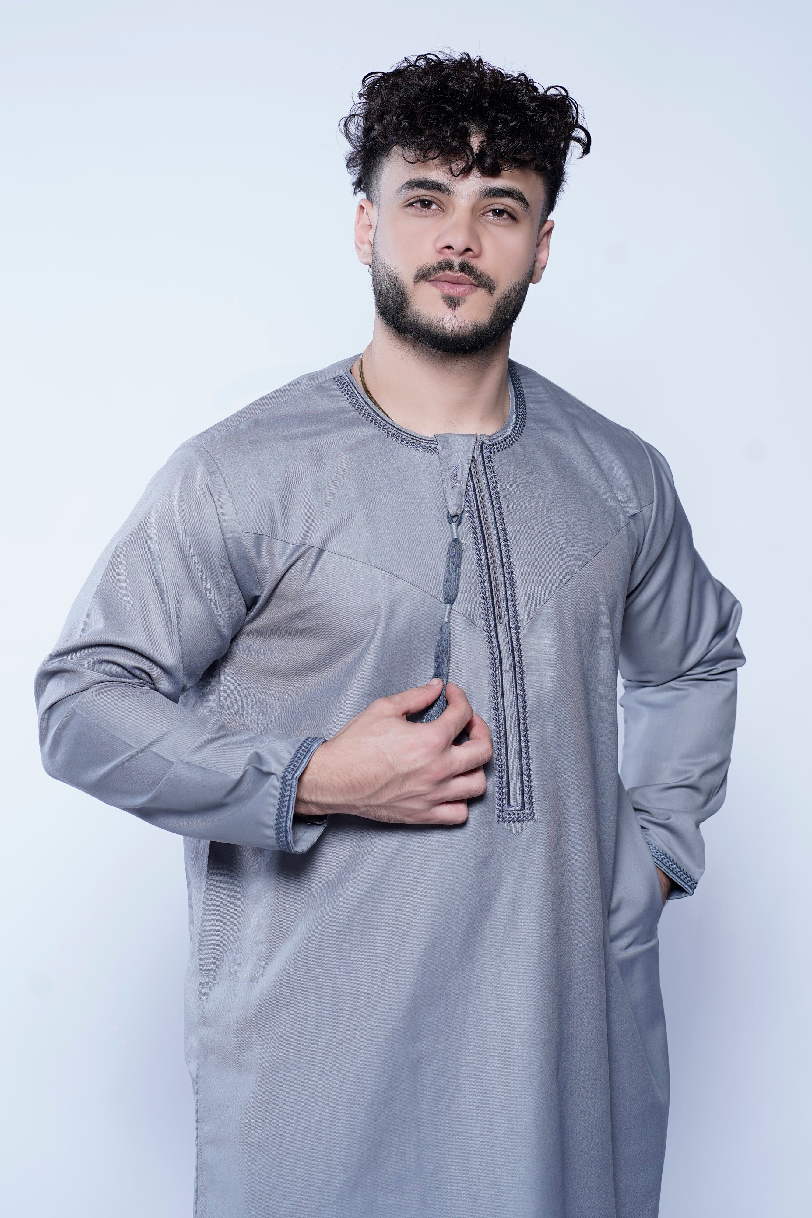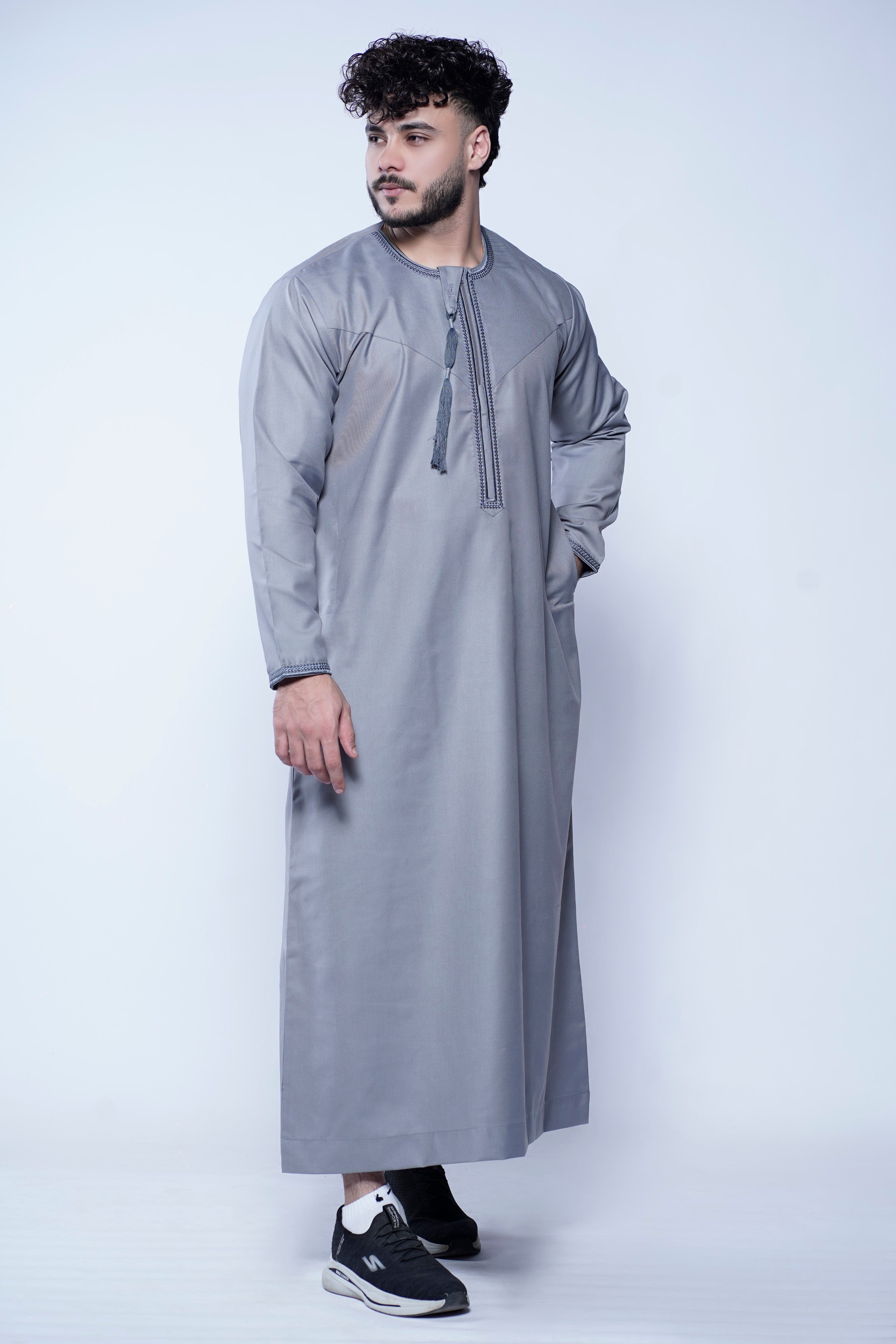 Experience timeless tradition with our Men’s Omani Embroidery Tassel Jubba, designed to reflect authentic Omani craftsmanship with refined modern touches. This elegant Omani thobe features a classic tassel design at the neckline, complemented by intricate embroidery and fine pipe stitching running throughout the front for a structured and distinguished finish.