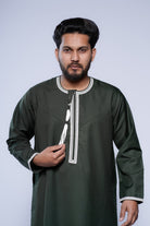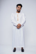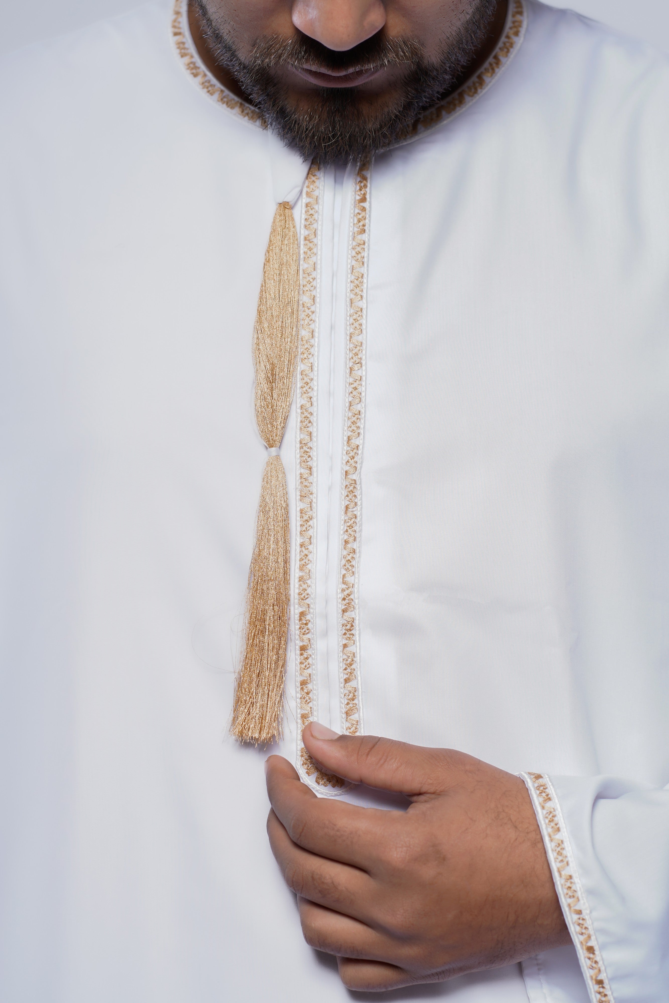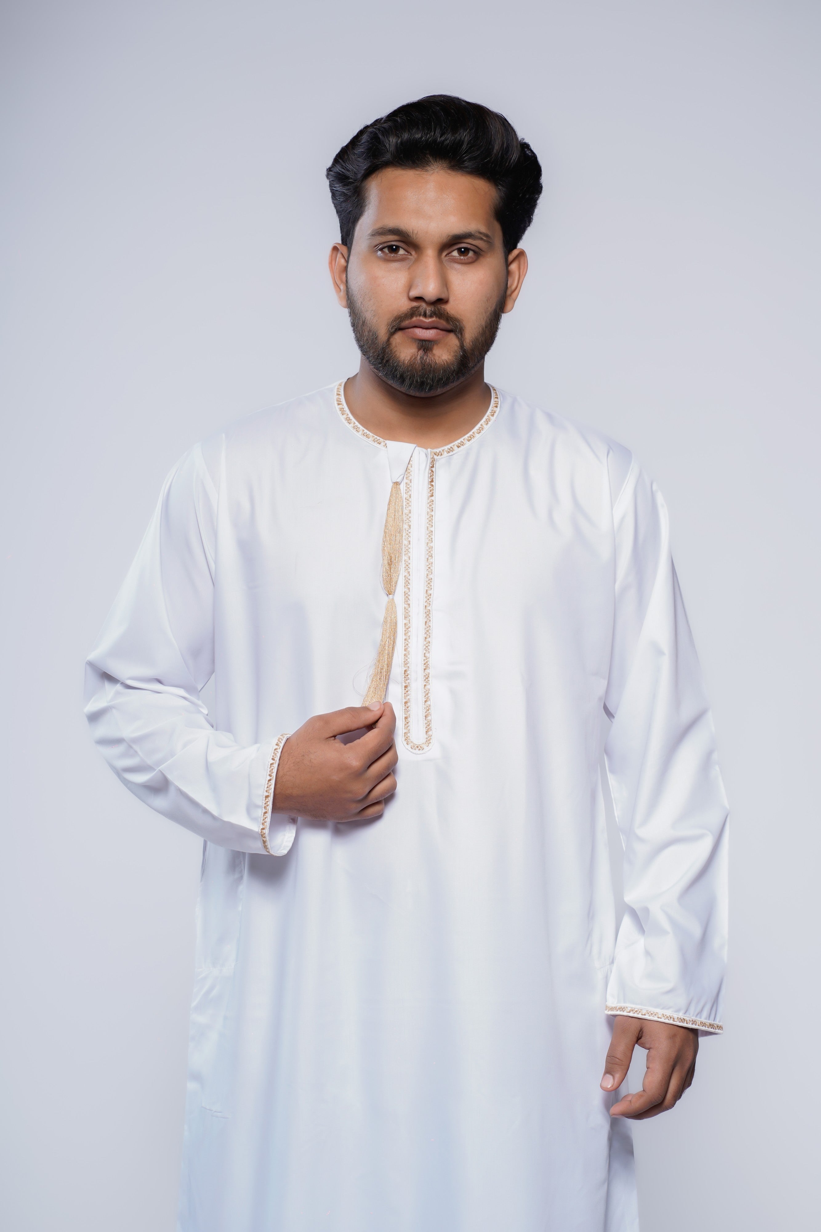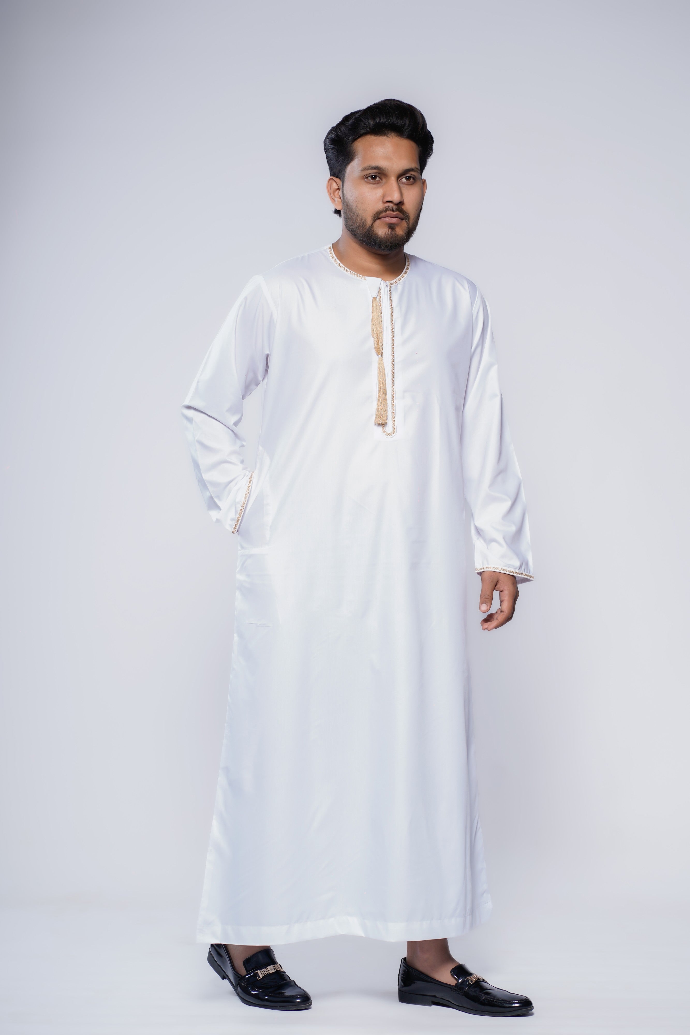 Experience timeless tradition with our Men’s Omani Embroidery Tassel Jubba, designed to reflect authentic Omani craftsmanship with refined modern touches. This elegant Omani thobe features a classic tassel design at the neckline, complemented by intricate embroidery and fine pipe stitching running throughout the front for a structured and distinguished finish.