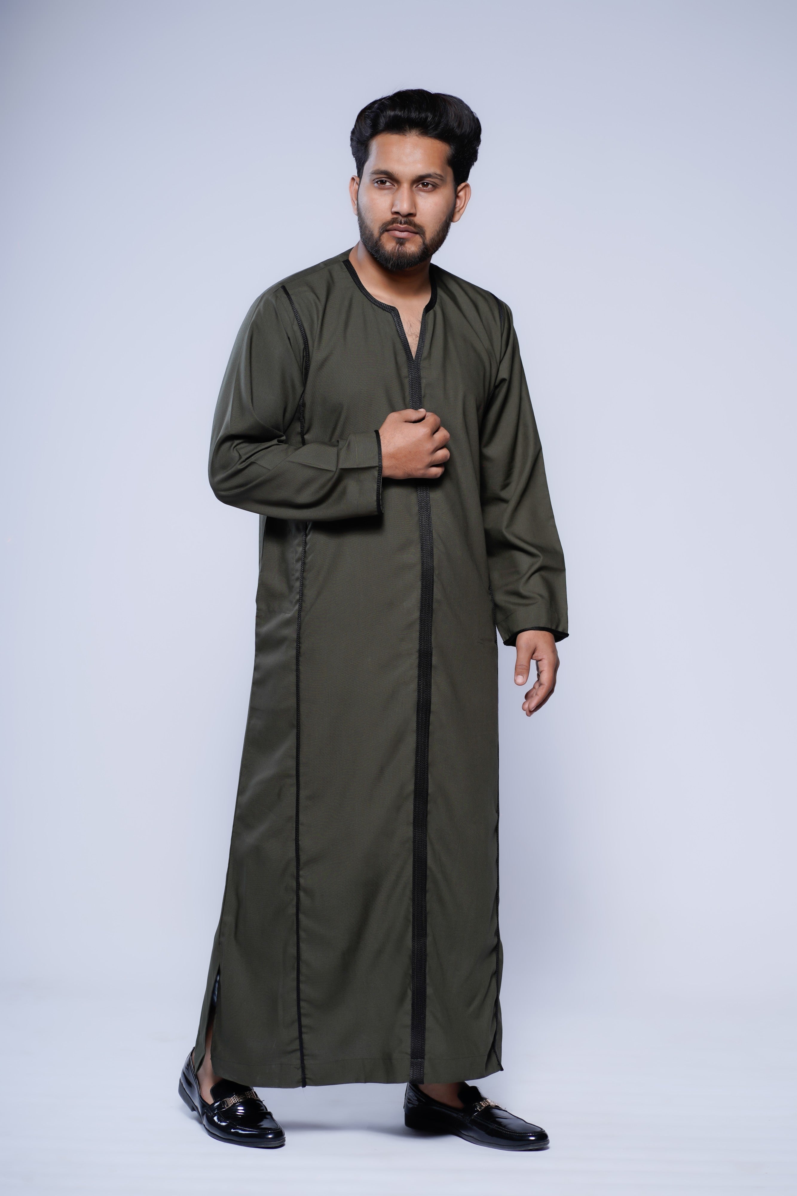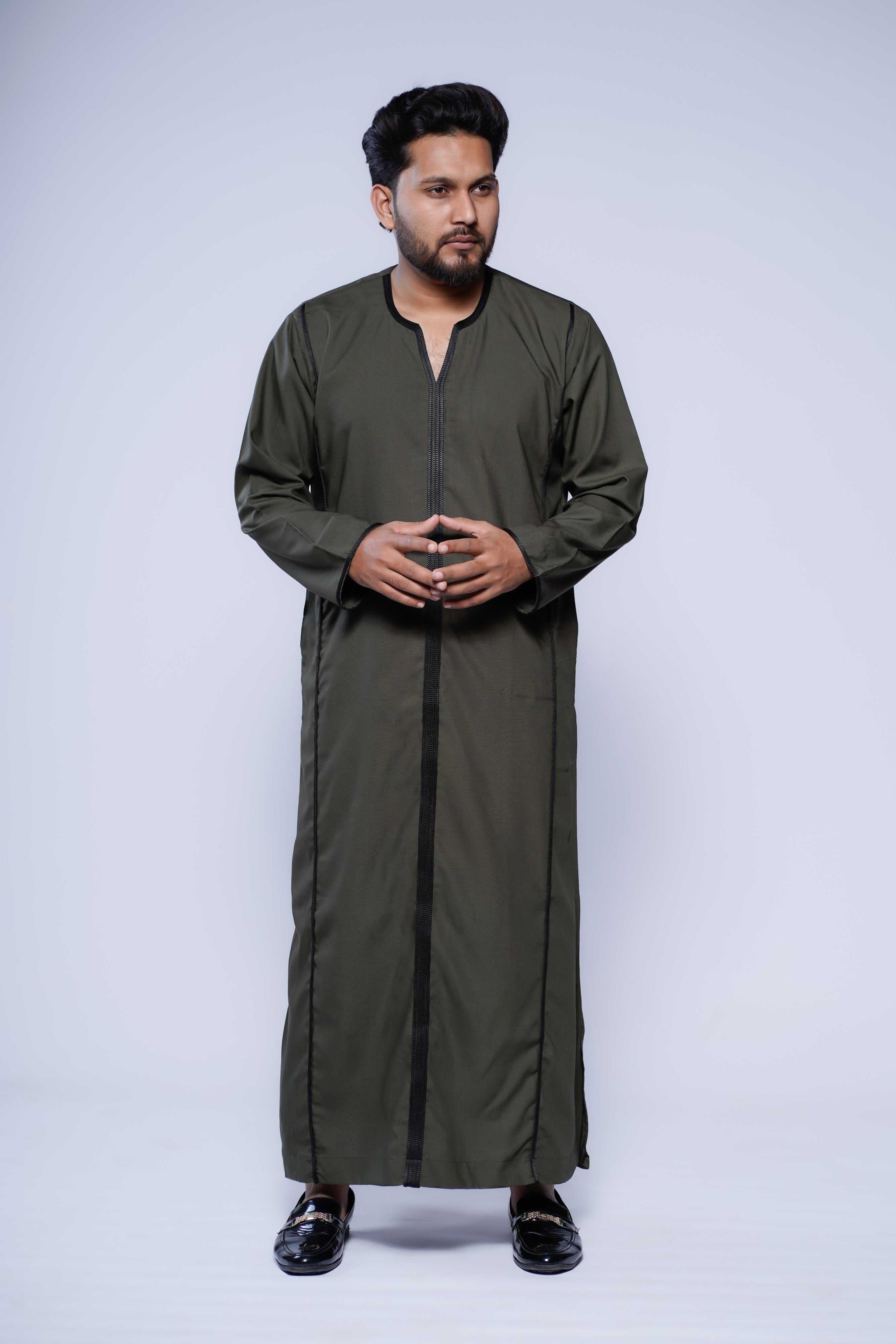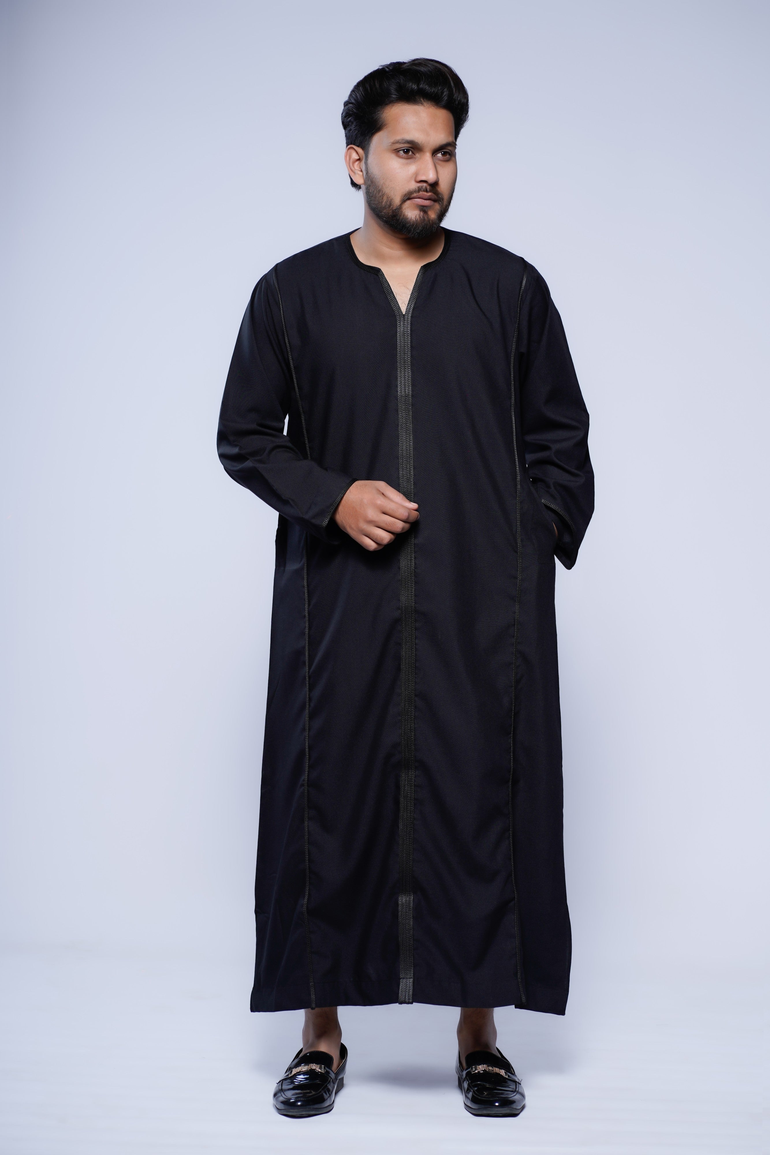 Crafted from high-quality, breathable fabric, this Moroccan V-neck jubba is super soft and comfortable, making it ideal for long hours of wear during Ramadan, Eid, Jummah prayers, weddings, or special gatherings. Functional side pockets add practical convenience without compromising the sleek, sophisticated silhouette.