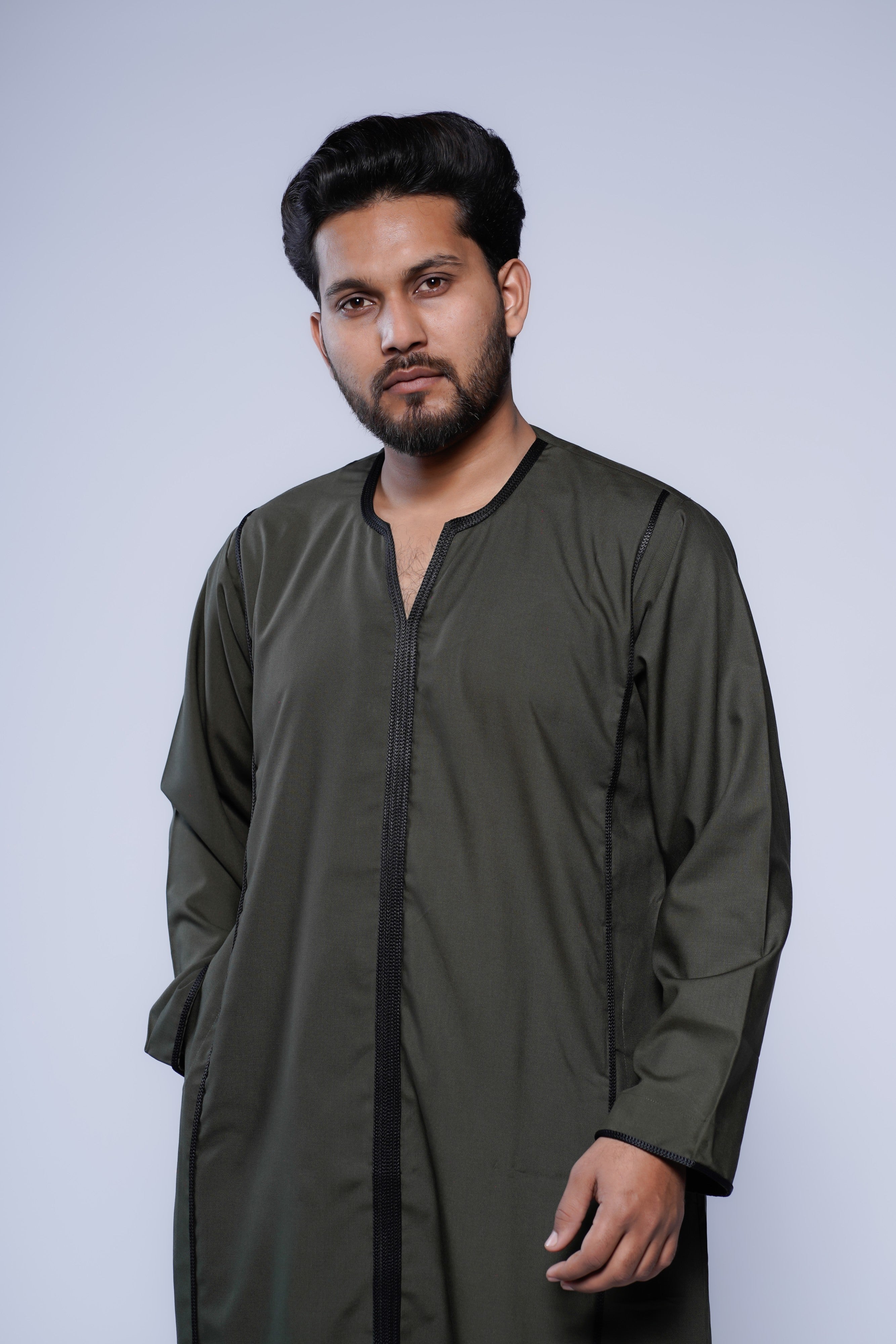 Add this Moroccan V-neck jubba to your collection for a stylish, versatile, and effortlessly sophisticated look that lasts season after season.