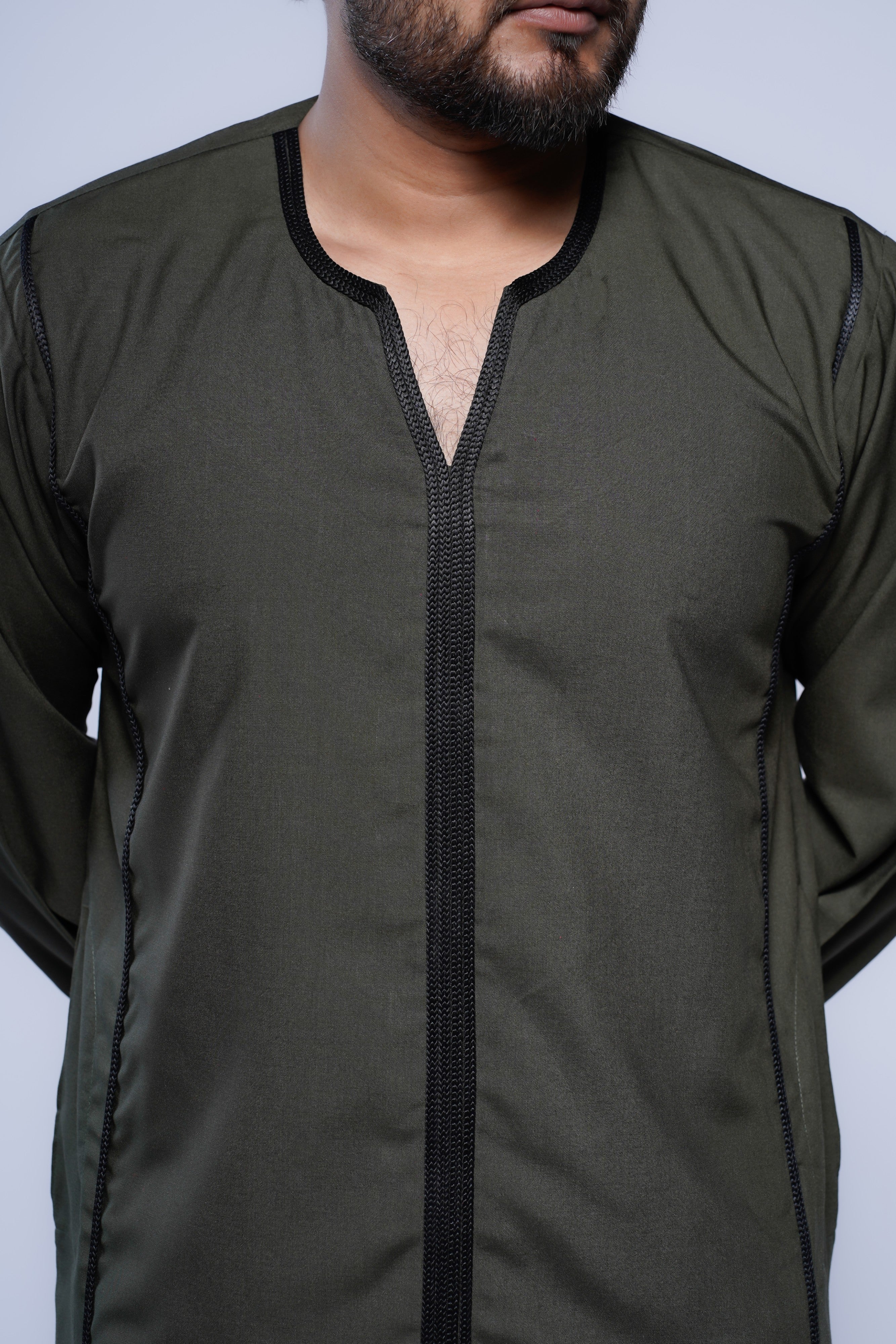 Upgrade your modest wardrobe with our Men’s Moroccan V-Neck Jubba, a timeless piece that blends traditional Moroccan elegance with modern craftsmanship. Featuring a unique and intricate design throughout, complemented by fine pipe detailing, this jubba creates a polished and distinguished look for any occasion.