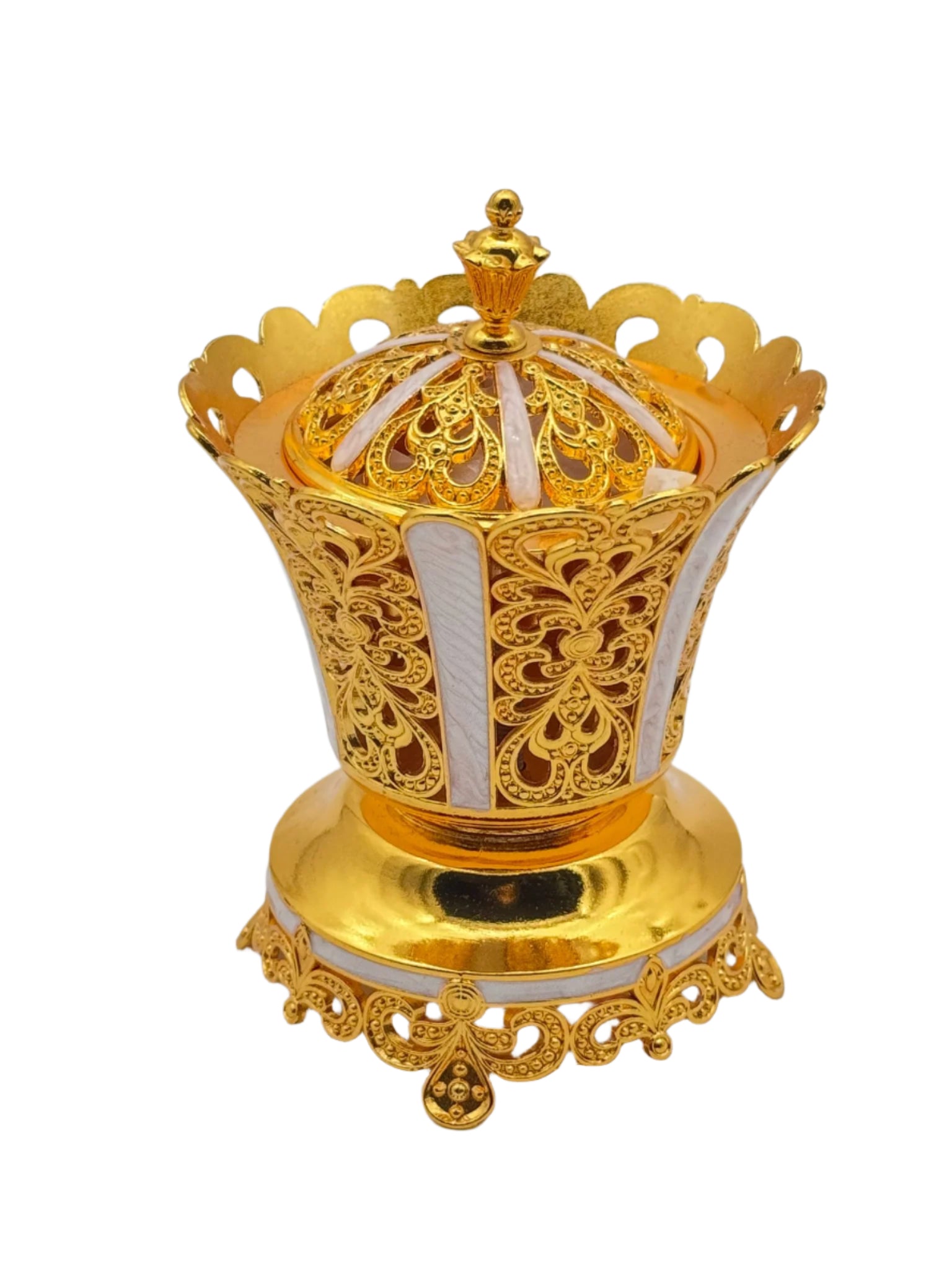 مبخرة بخور صغيرة متينة تجمع بين المتانة والأناقة. تتميز هذه المبخرة بتصميمها الجميل وتشطيبها المعدني الذهبي الغني مع لمسات لؤلؤية رقيقة، مما يضفي عليها مظهرًا راقيًا وراقيًا. على الرغم من حجمها الصغير، تتميز المبخرة بمتانتها وقدرتها على التحمل، مما يجعلها مثالية للاستخدام اليومي. تضفي درجات اللون الذهبي الدافئة، مع لمعان اللؤلؤ الرقيق، لمسةً من الفخامة على أي مساحة. مثالية لإشعال البخور أو البخور، تجمع هذه المبخرة بين العملية والأناقة، مما يجعلها إضافةً رائعةً لمنزلك أو هديةً أنيقةً ومميزةً للمناسبات الخاصة.