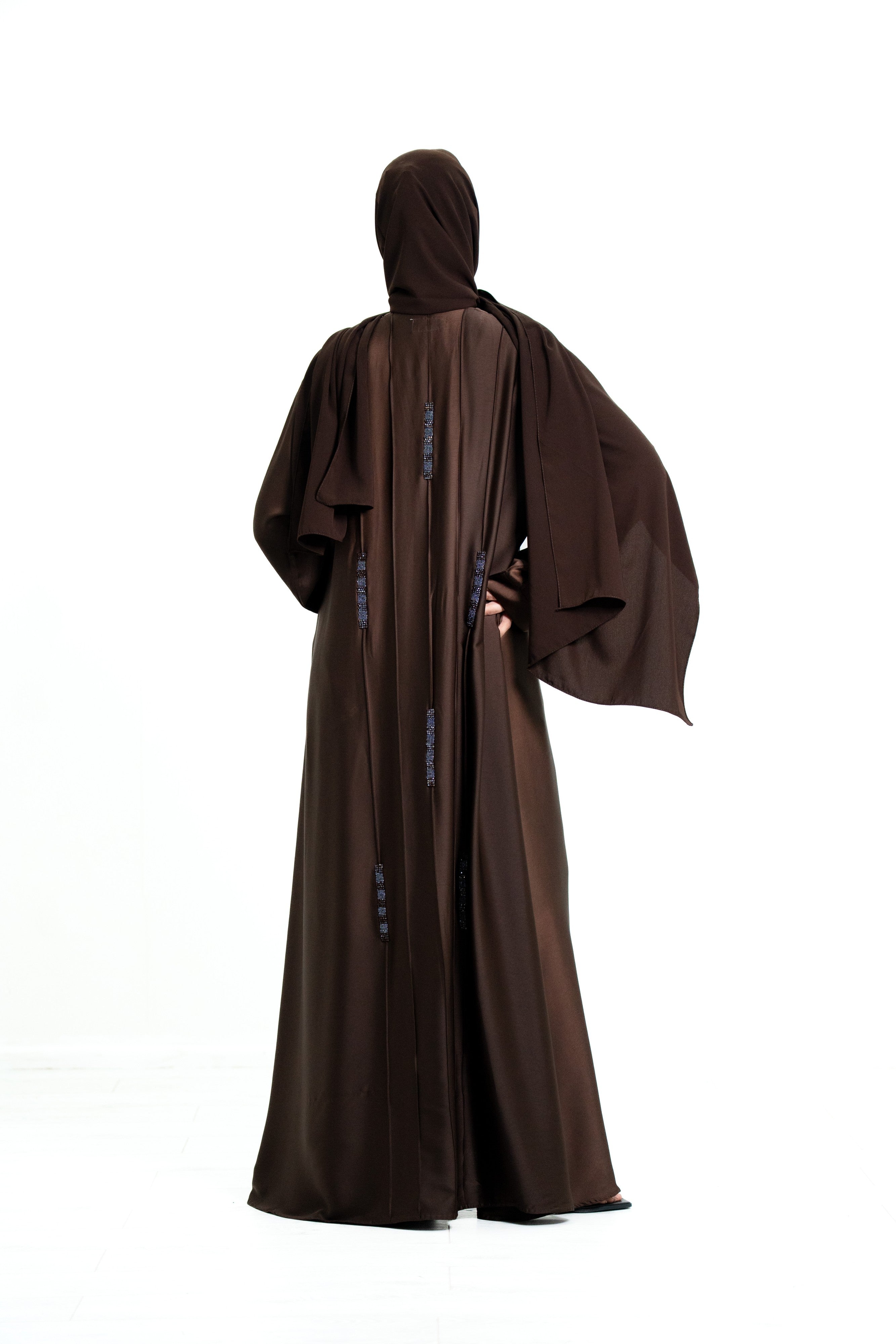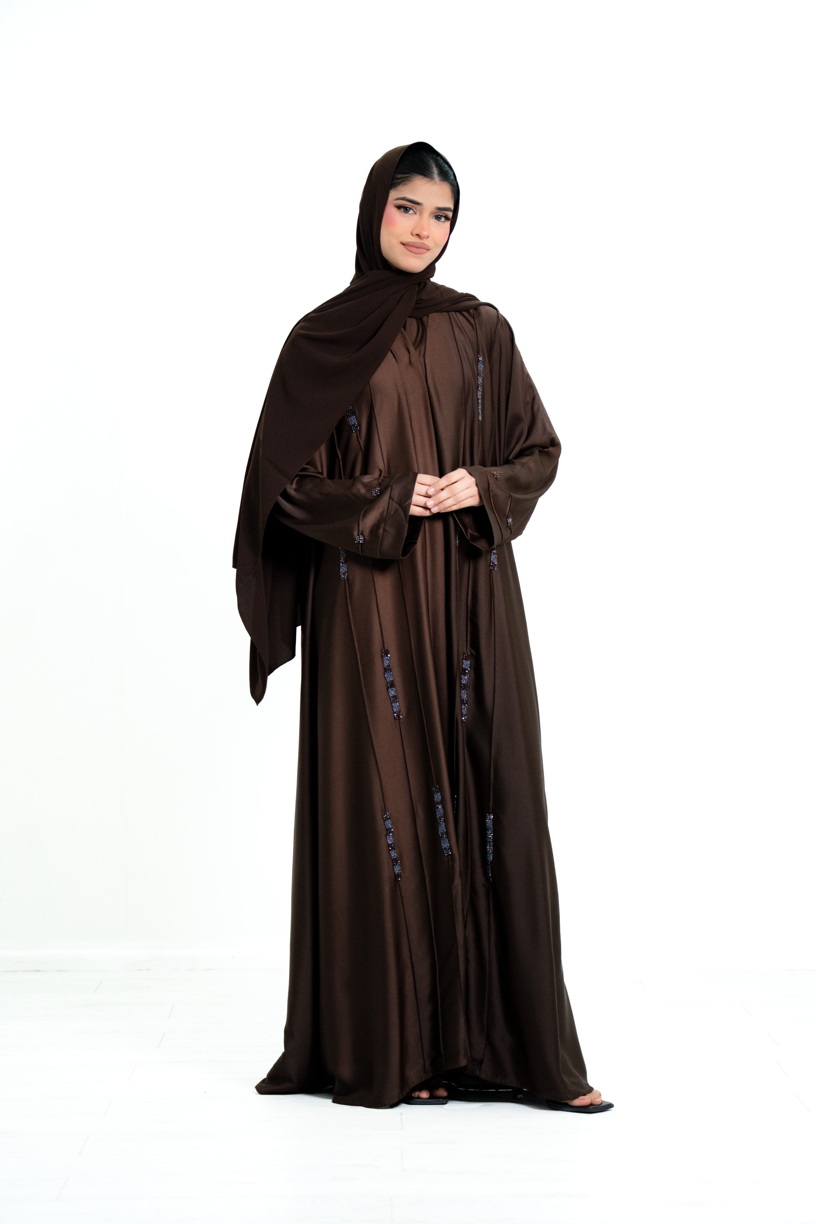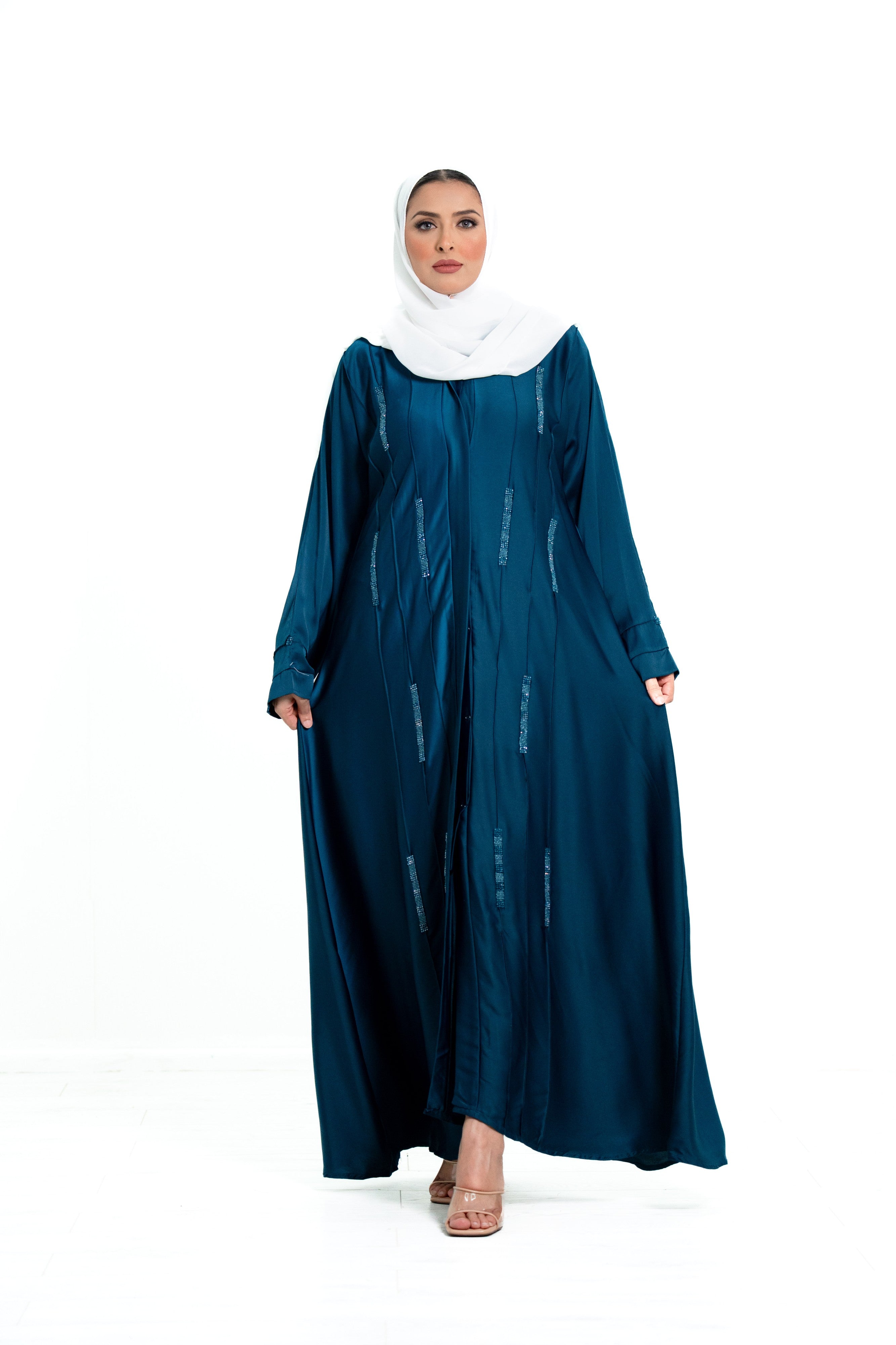 Elevate your modest fashion collection with this stunning satin abaya with diamante embroidery, designed to bring elegance, sparkle, and sophistication to any occasion.