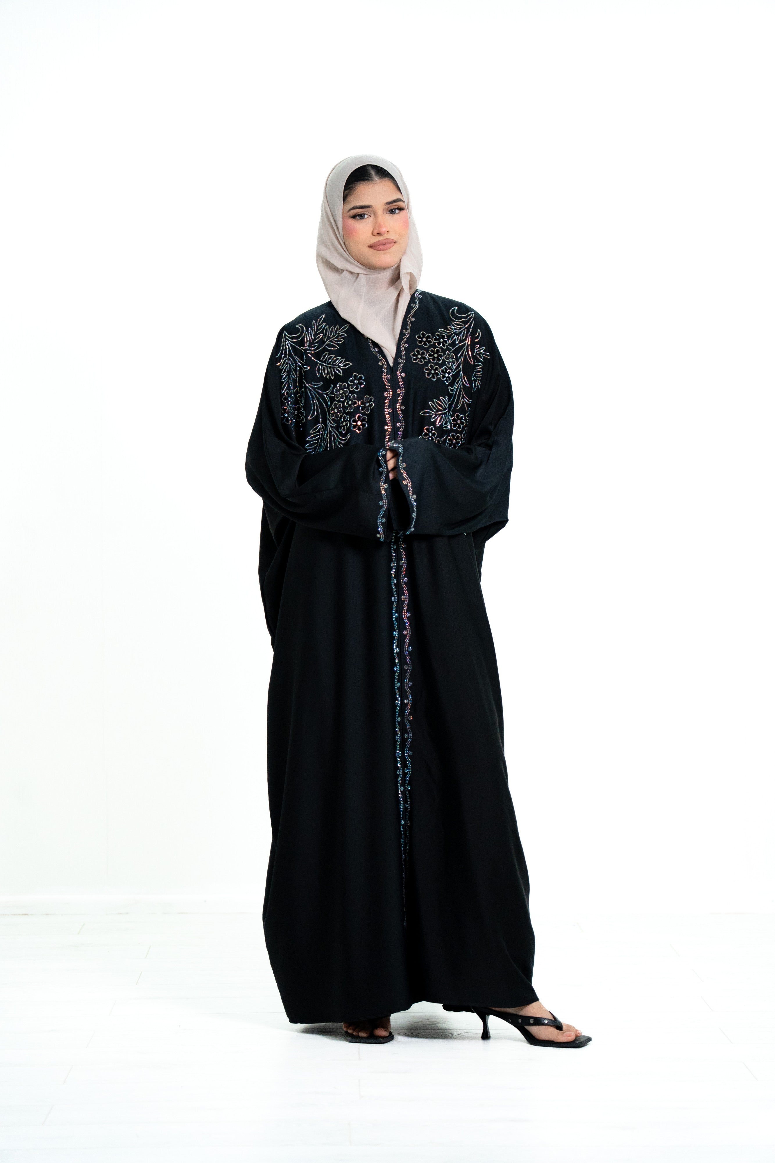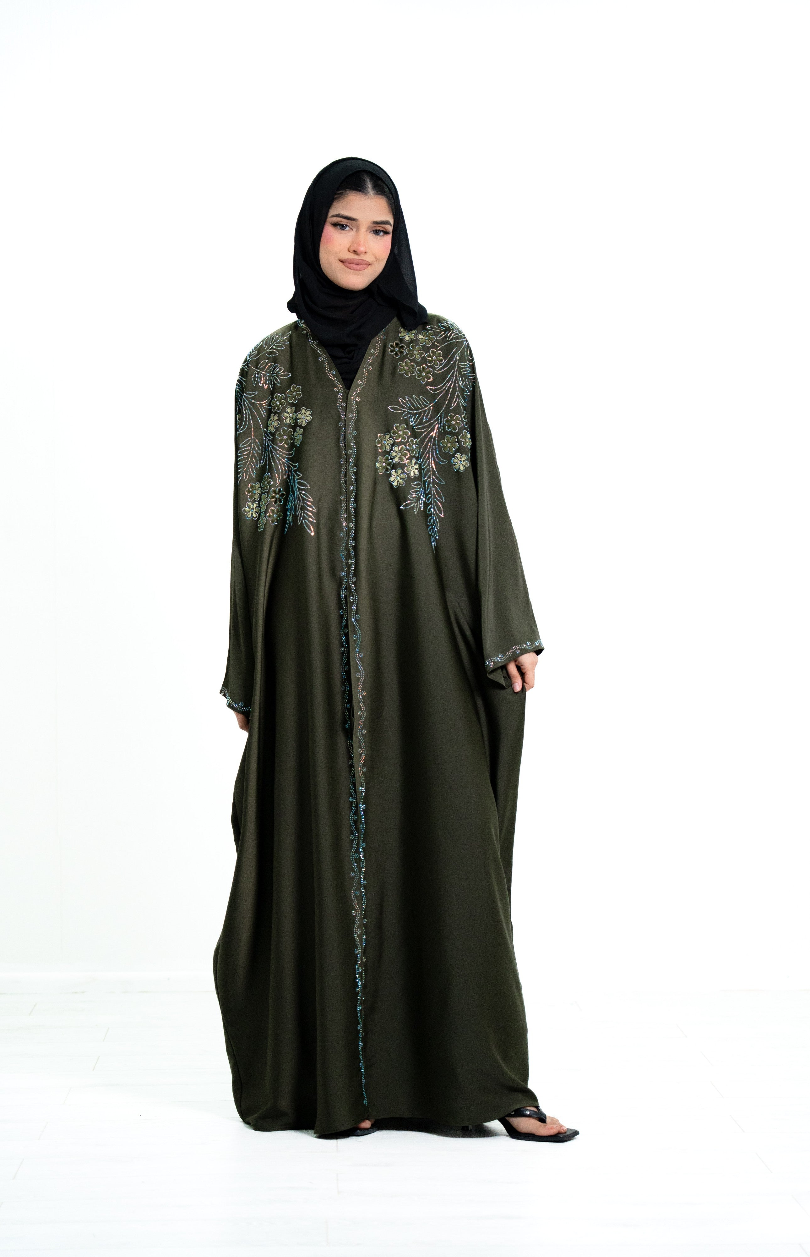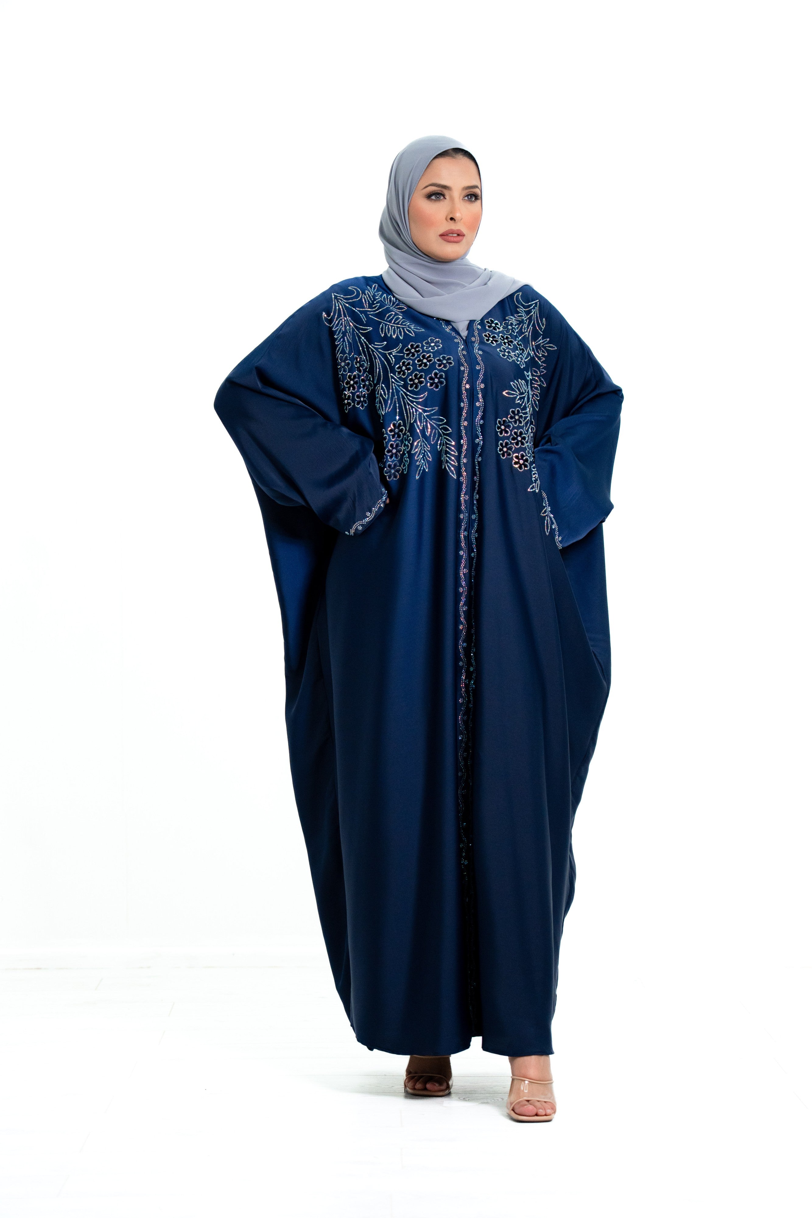 This abaya features a unique butterfly-style design, providing a loose, graceful fit that flatters all body shapes while ensuring comfort and modesty. The highlight of this piece is the heavy diamante embellishment across the full front of the abaya, creating a striking and glamorous look.