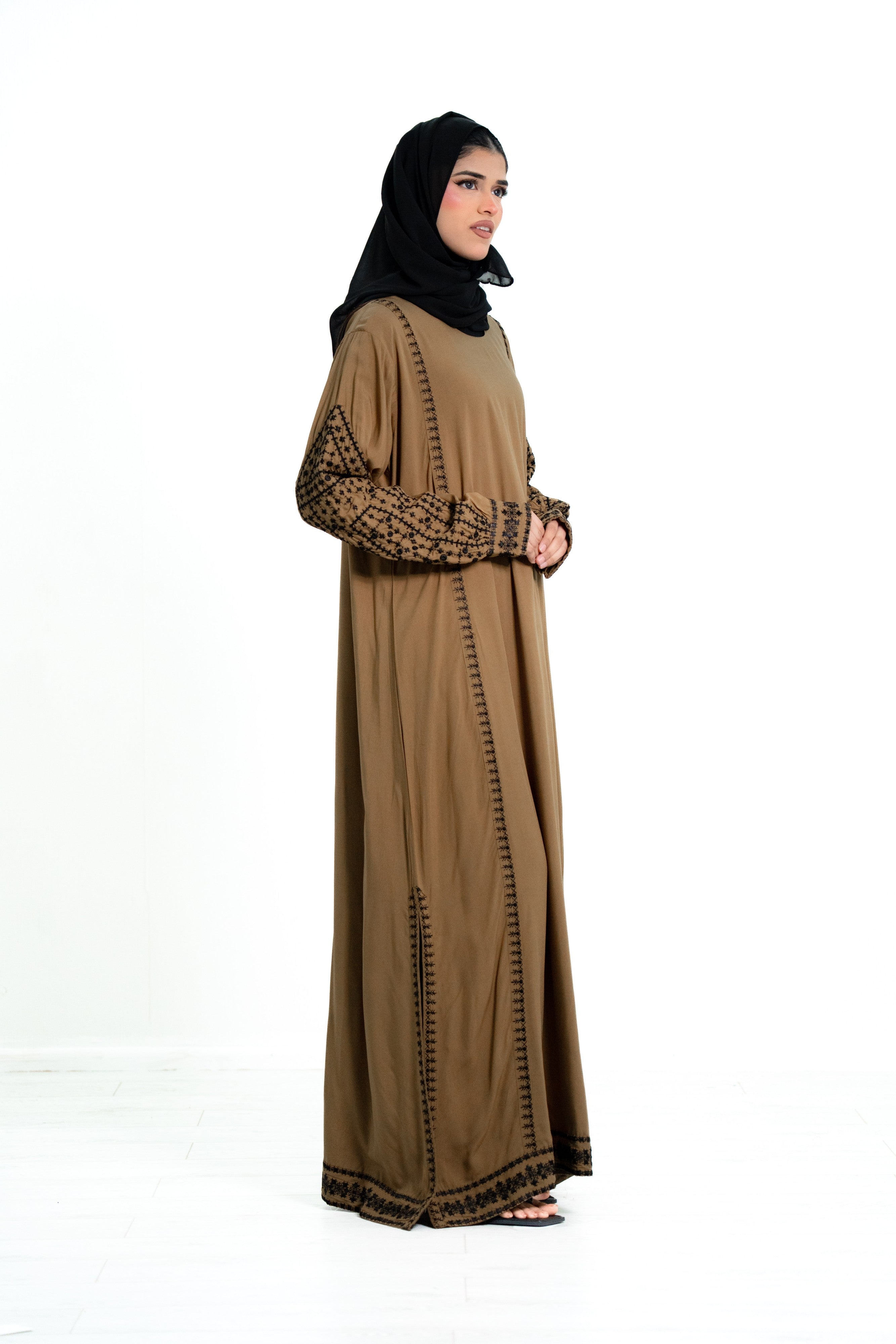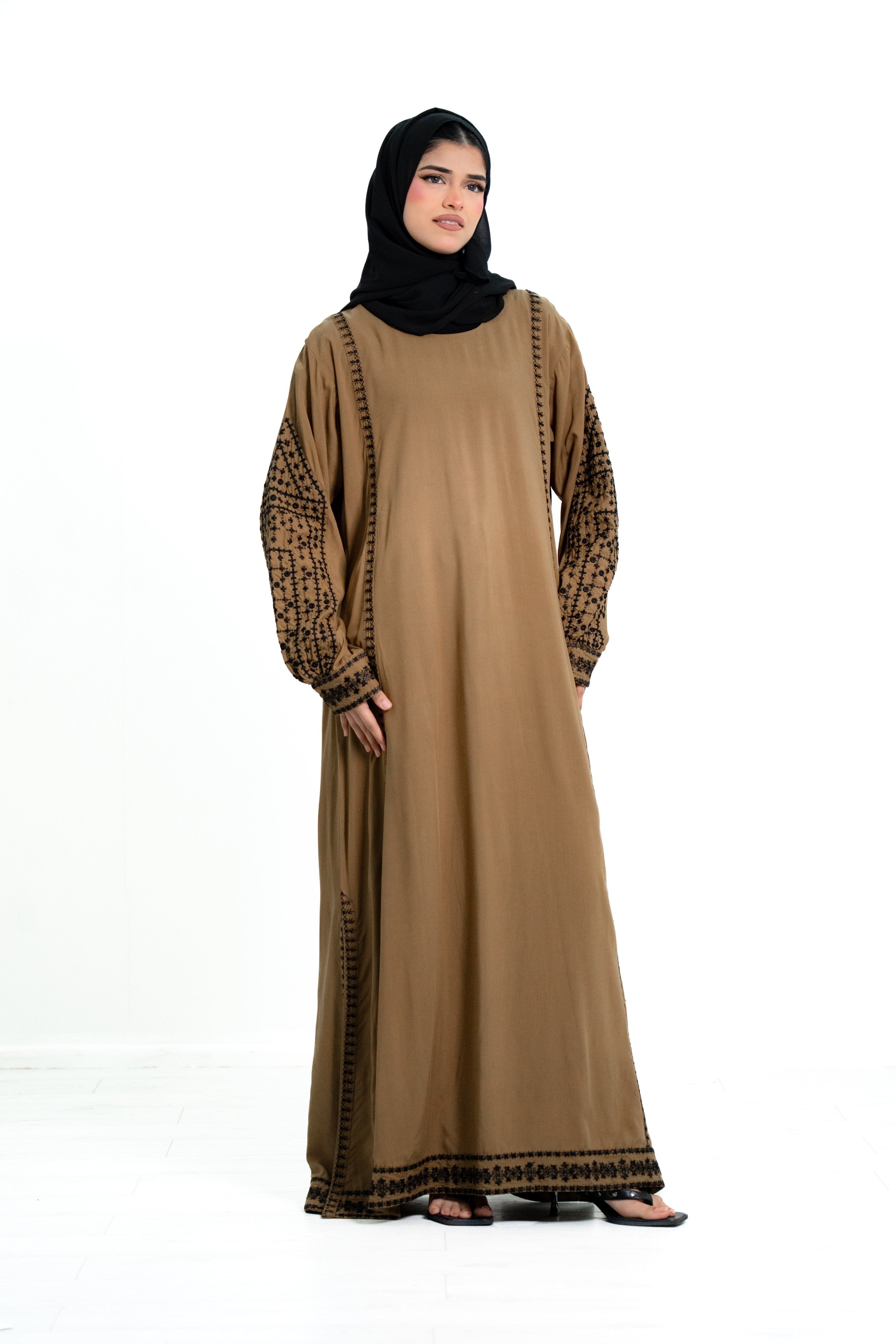 The design features cuffed sleeves with delicate stitched embroidery running throughout the arms, creating a refined and elegant look. The embroidery continues along the full length of the abaya, adding subtle detail that enhances its graceful silhouette while maintaining a modest and sophisticated style.