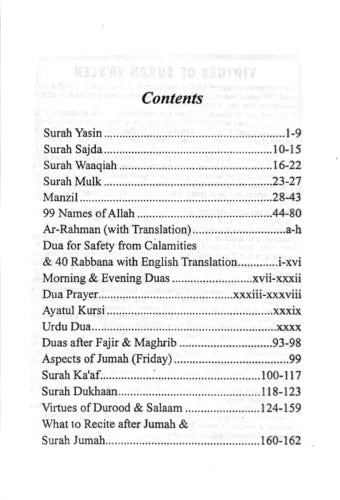 Includes Manzil, Surah Yasin, As-Sajda, Al-Waqi'ah, Al-Mulk, Ar-Rahman, Al-Kahf, Ad-Dukhan, and Al-Jumuah, 40 Rabbana, the 99 names of Allah and du'as for the morning and evening. Also includes 40 duroods (Salutations on the Prophet sallallahu 'alayhi wasallam)