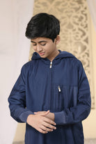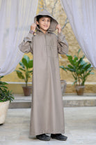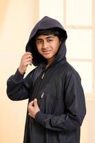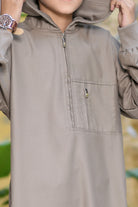 Elevate your child's wardrobe with our stylish Boys Hooded Jubba / Thobe, designed for both comfort and modern flair. Featuring unique zip neck detailing and zip pocket accents, this contemporary take on the traditional thobe combines practicality with a sleek, fashionable look. The thick cuffs on the sleeves provide a polished finish, adding structure and style to the overall design.