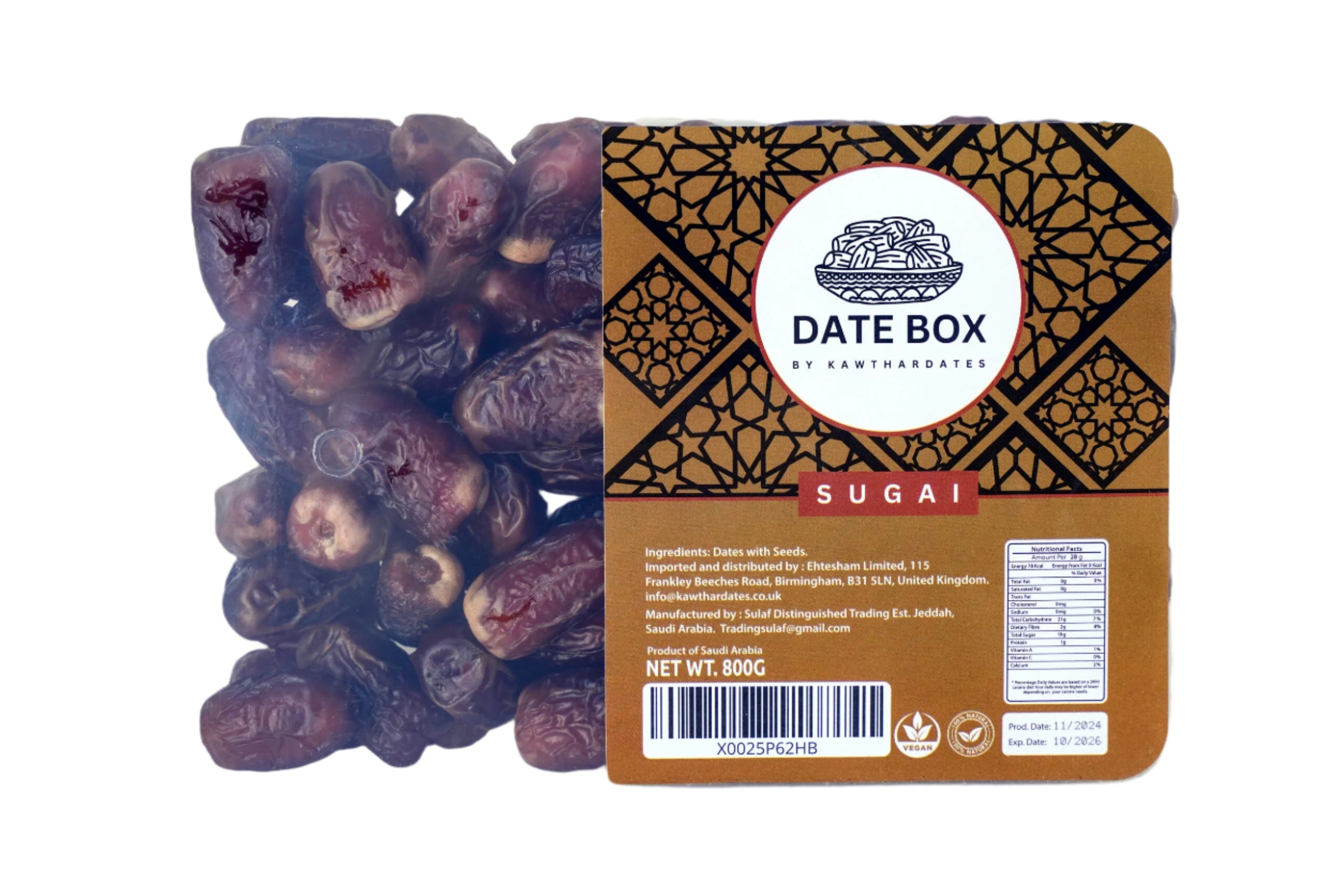 Date Box Sugai 800g features a premium selection of Sugai dates from Madina, Saudi Arabia. Known for their soft, chewy texture and rich, sweet flavor, these dates are a delightful treat for anyone who enjoys natural, wholesome snacks. Sugai dates are packed with nutrients like fiber, vitamins, and minerals, making them a great source of energy and an ideal choice for a healthy, natural indulgence. The 800g box offers a generous portion, perfect for sharing with family or friends or for enjoying on your own as a nutritious snack throughout the day. Enjoy the authentic taste and high quality of these luxurious dates from Madina!