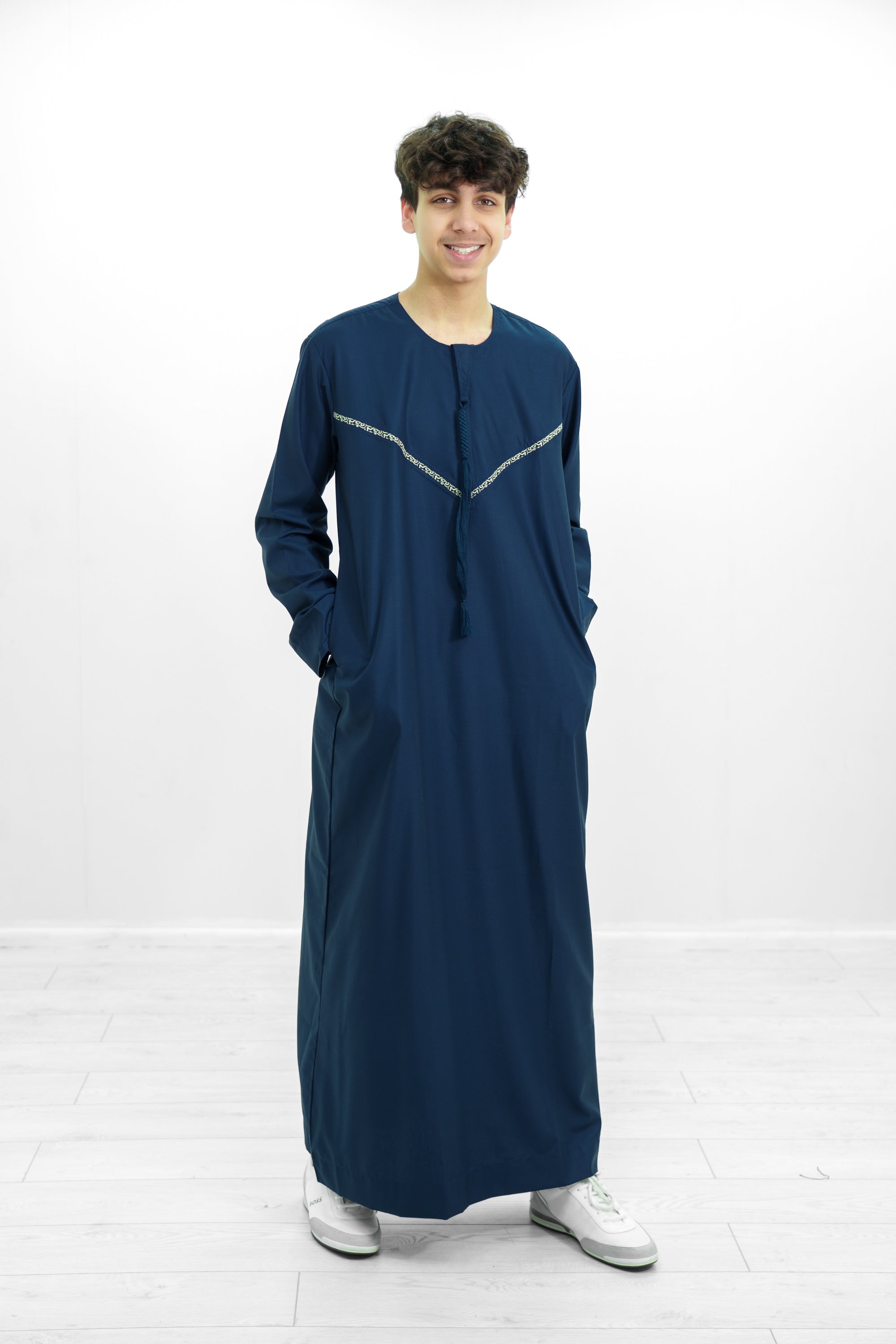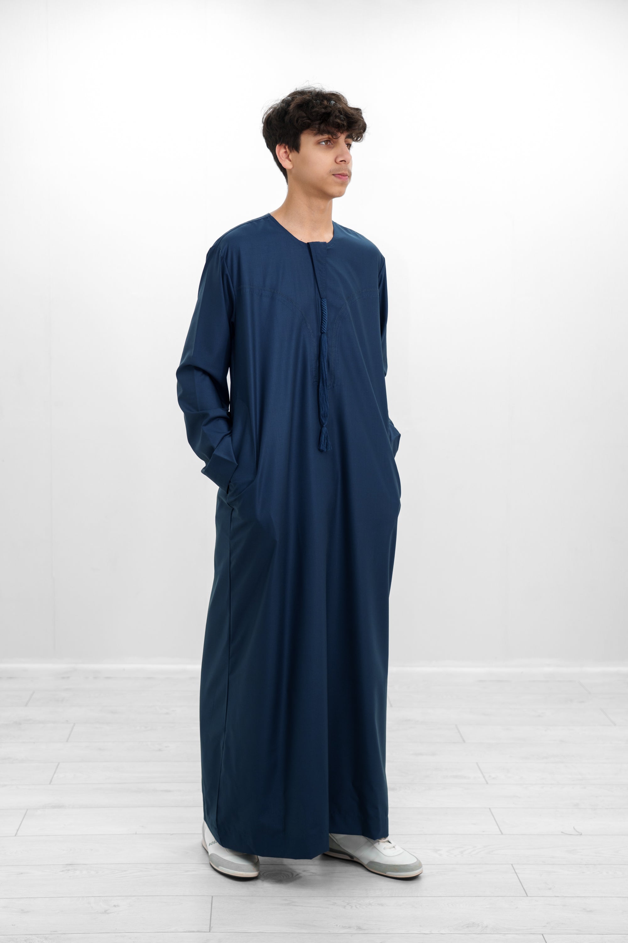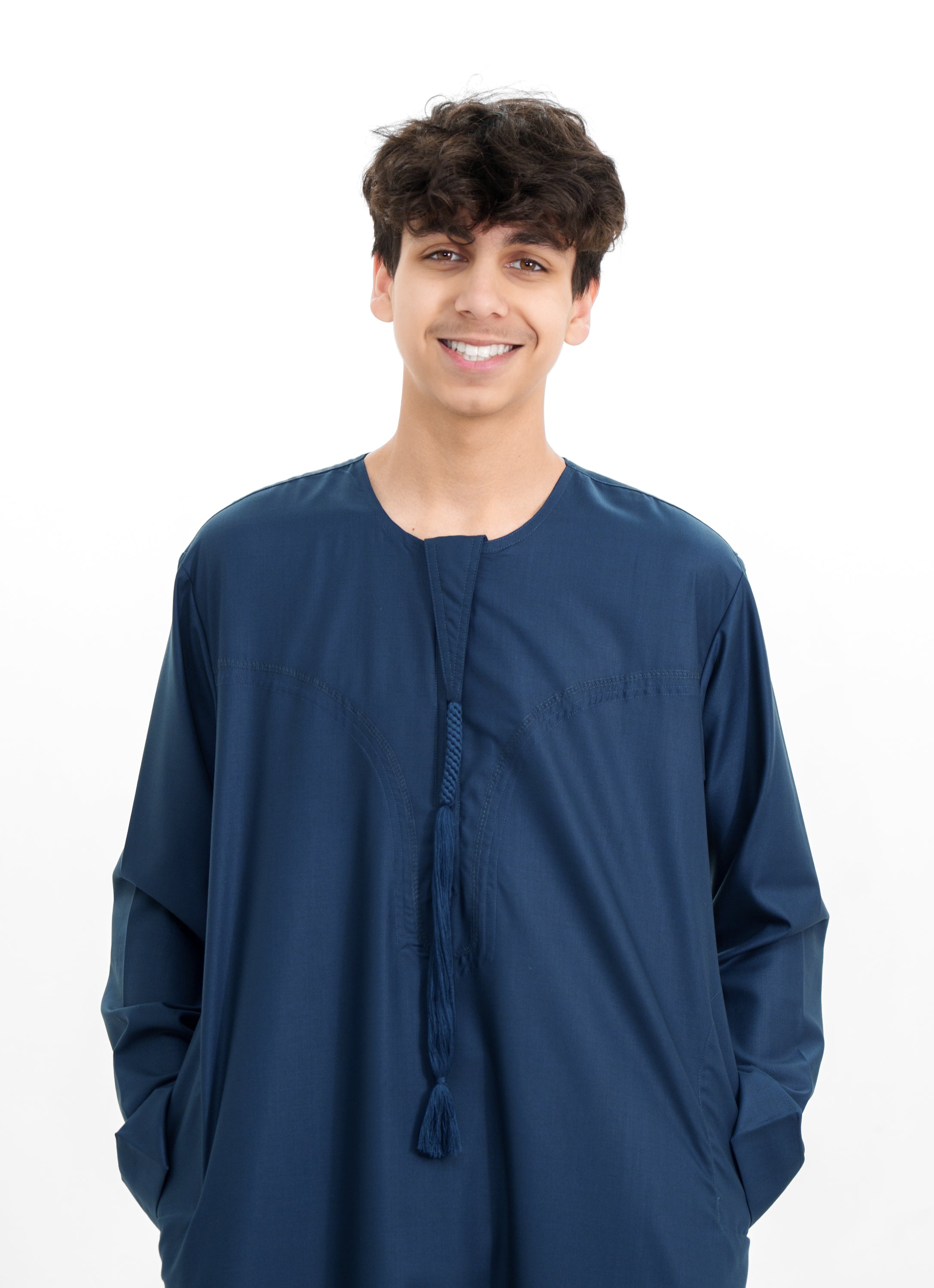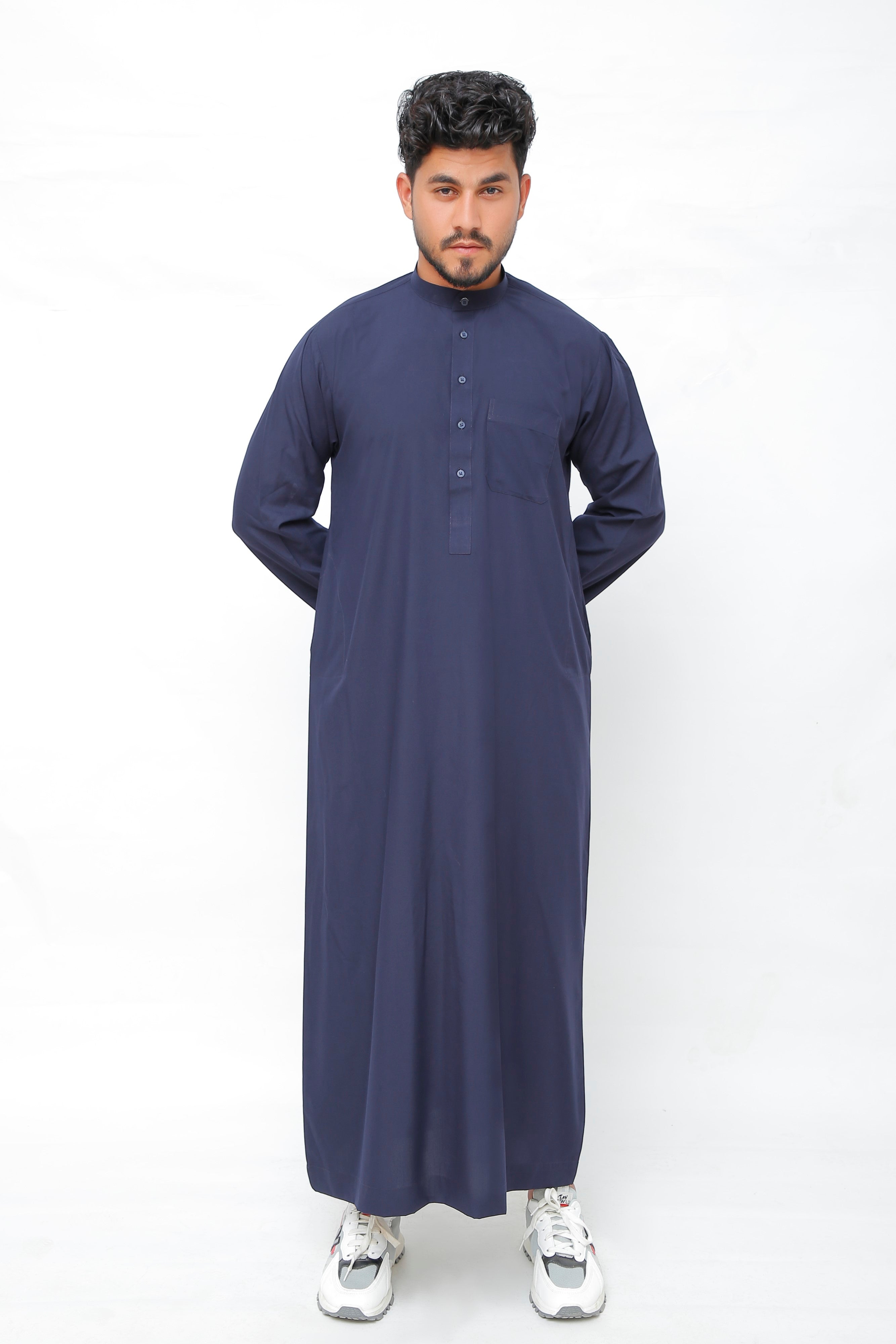 Navy Omani Round Neck Jubba with V Neck Stitched Embroidery