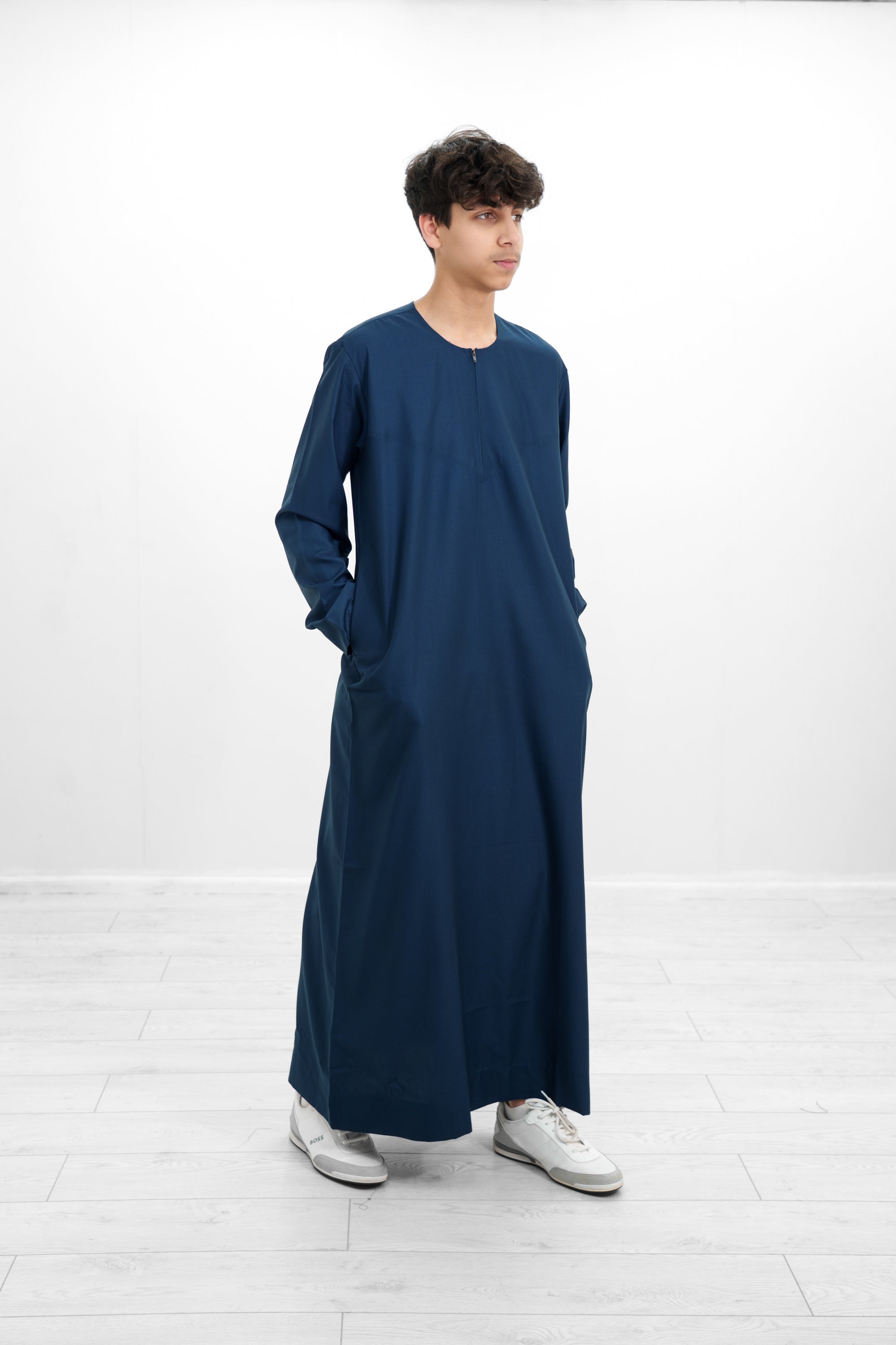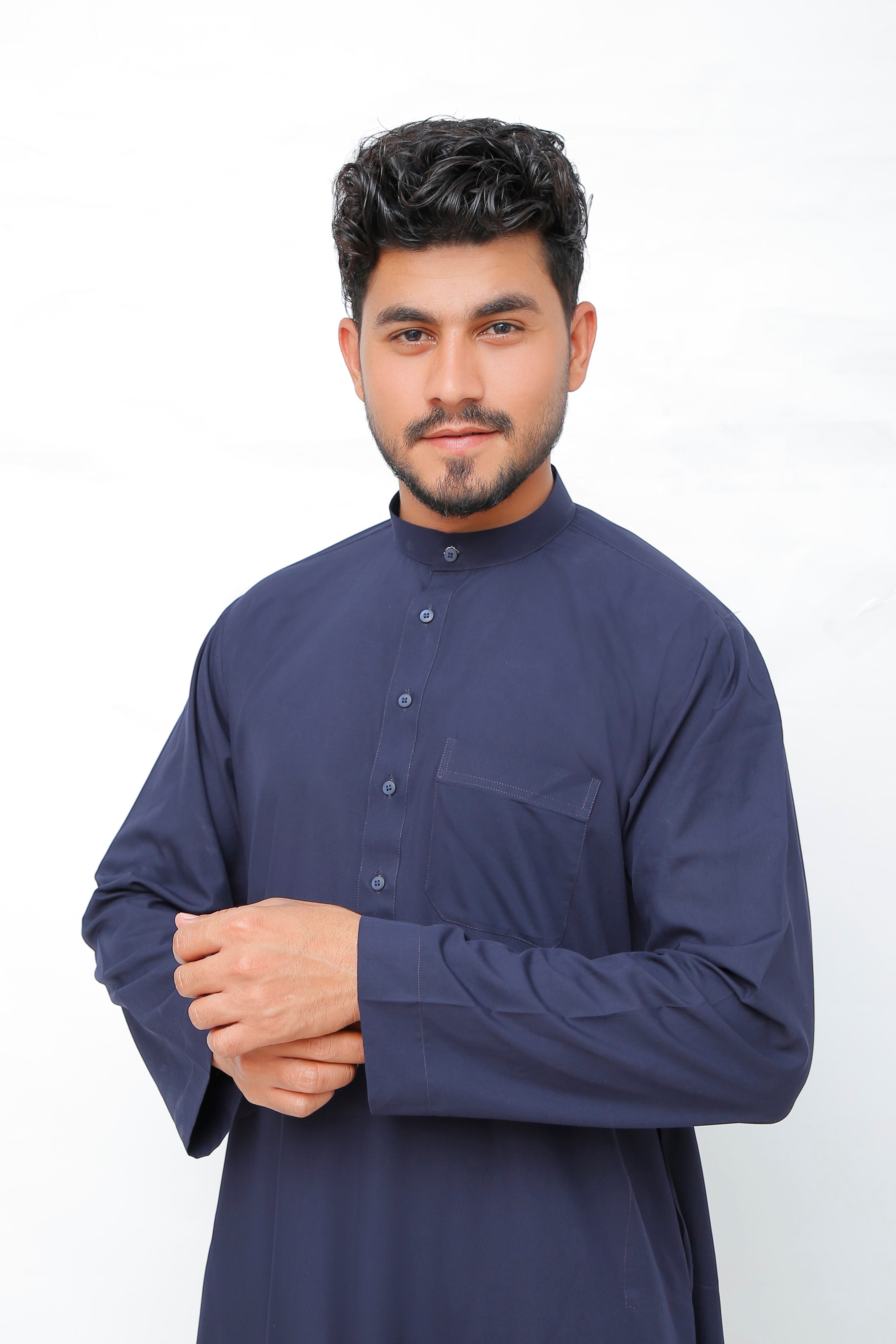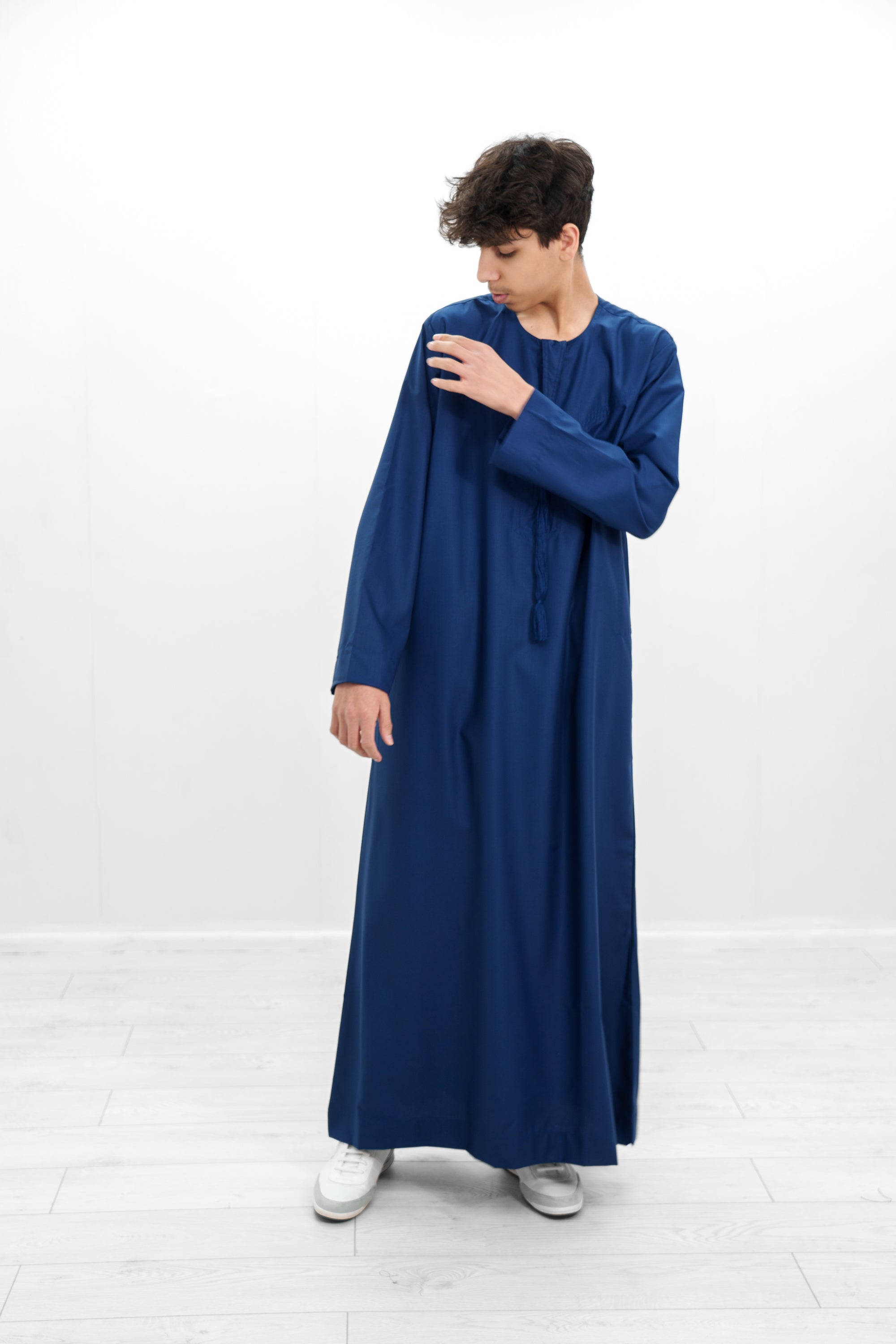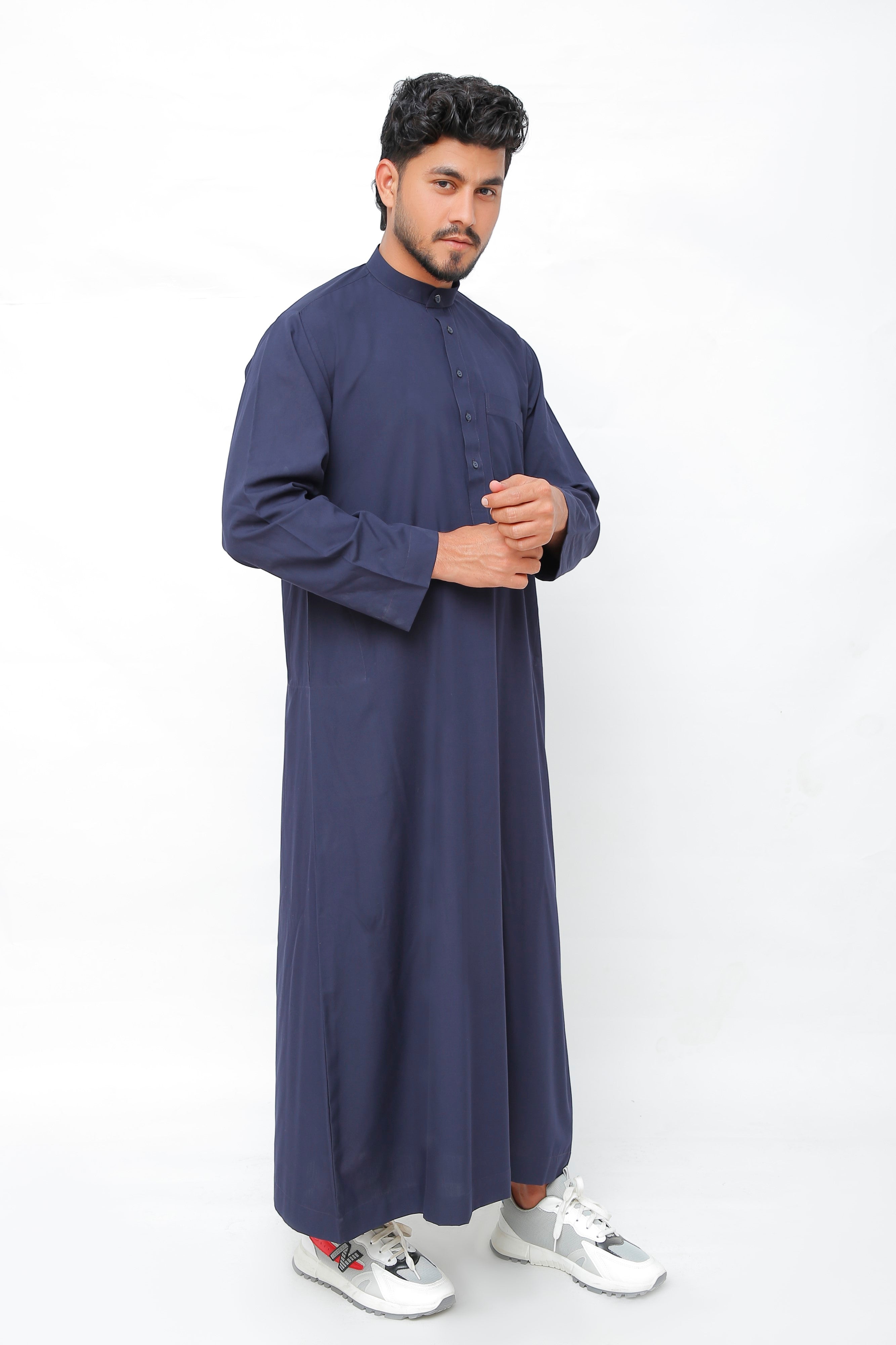 Navy Omani Round Neck Jubba with V Neck Stitched Embroidery