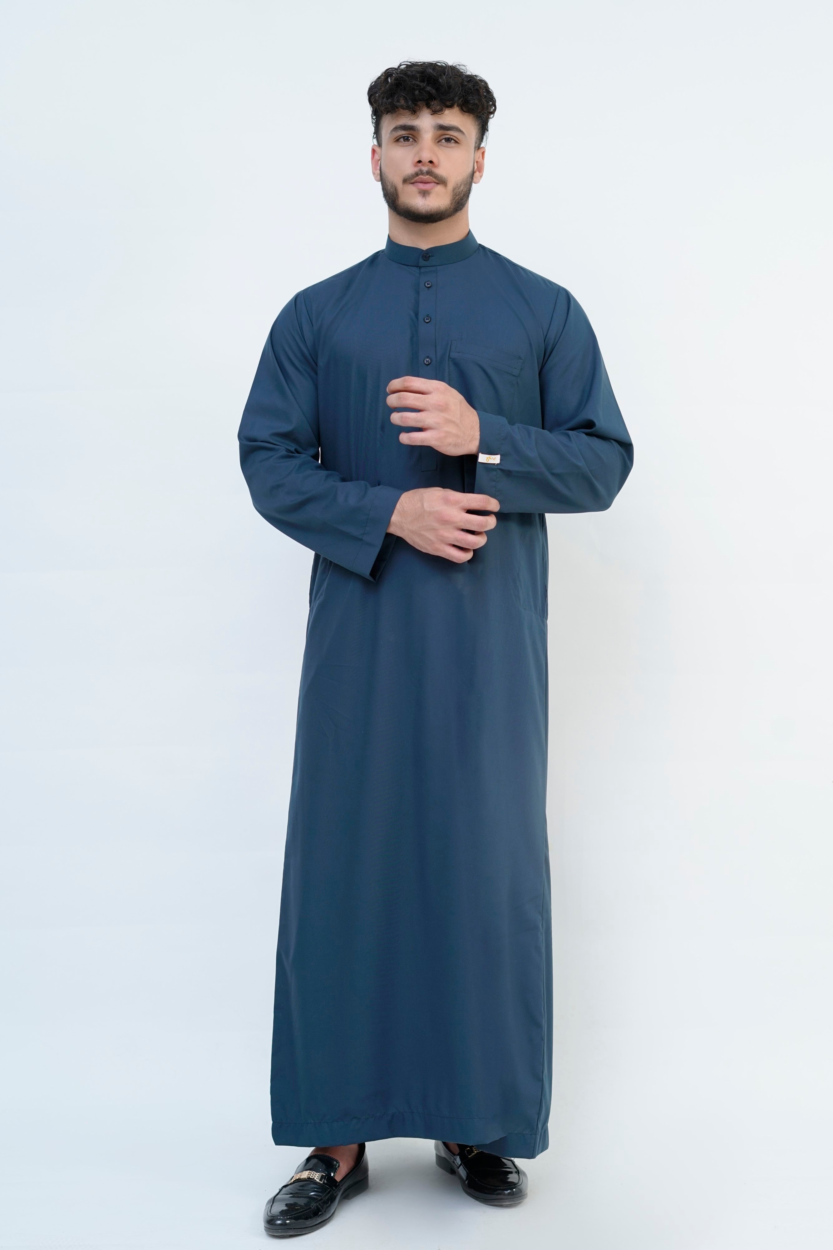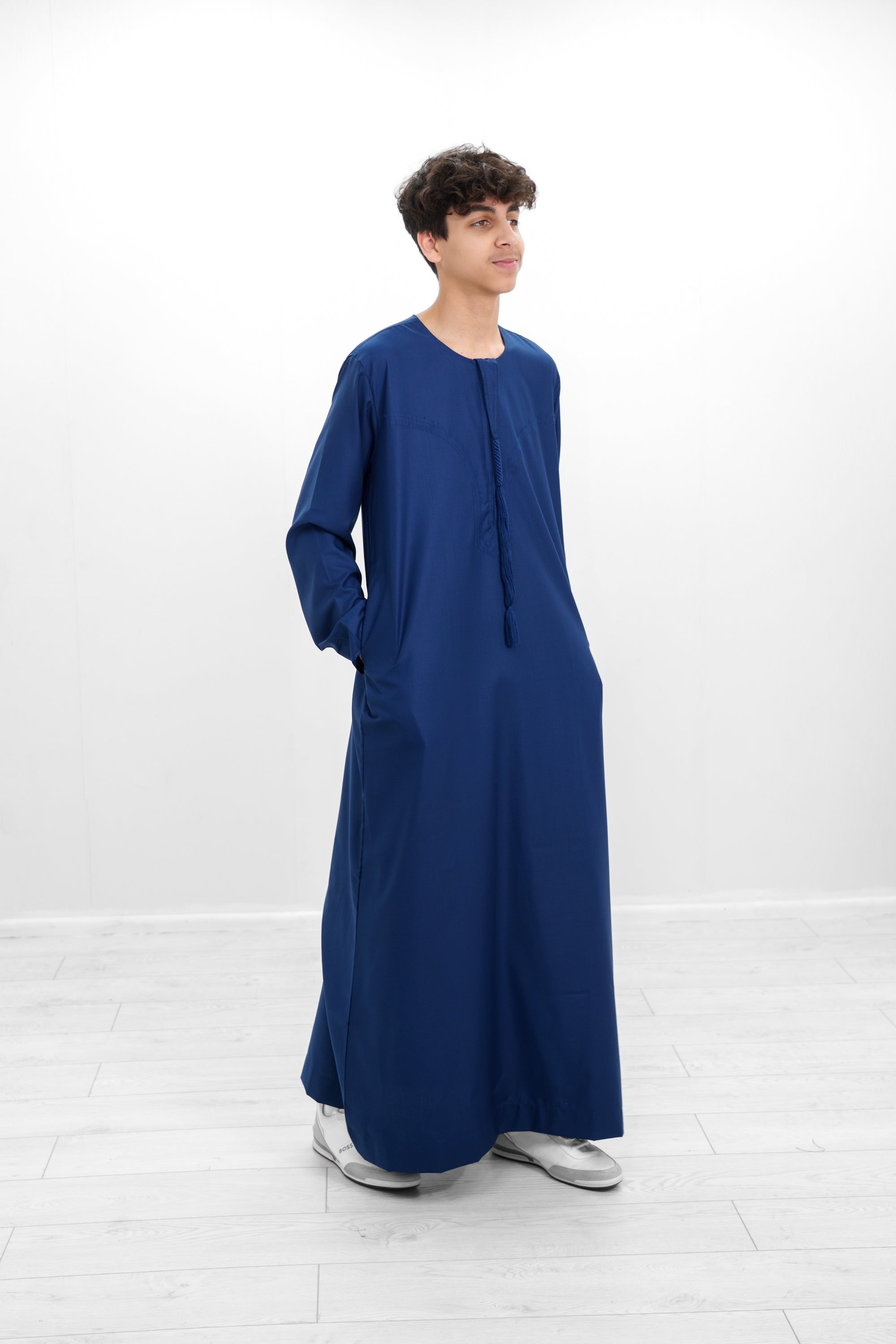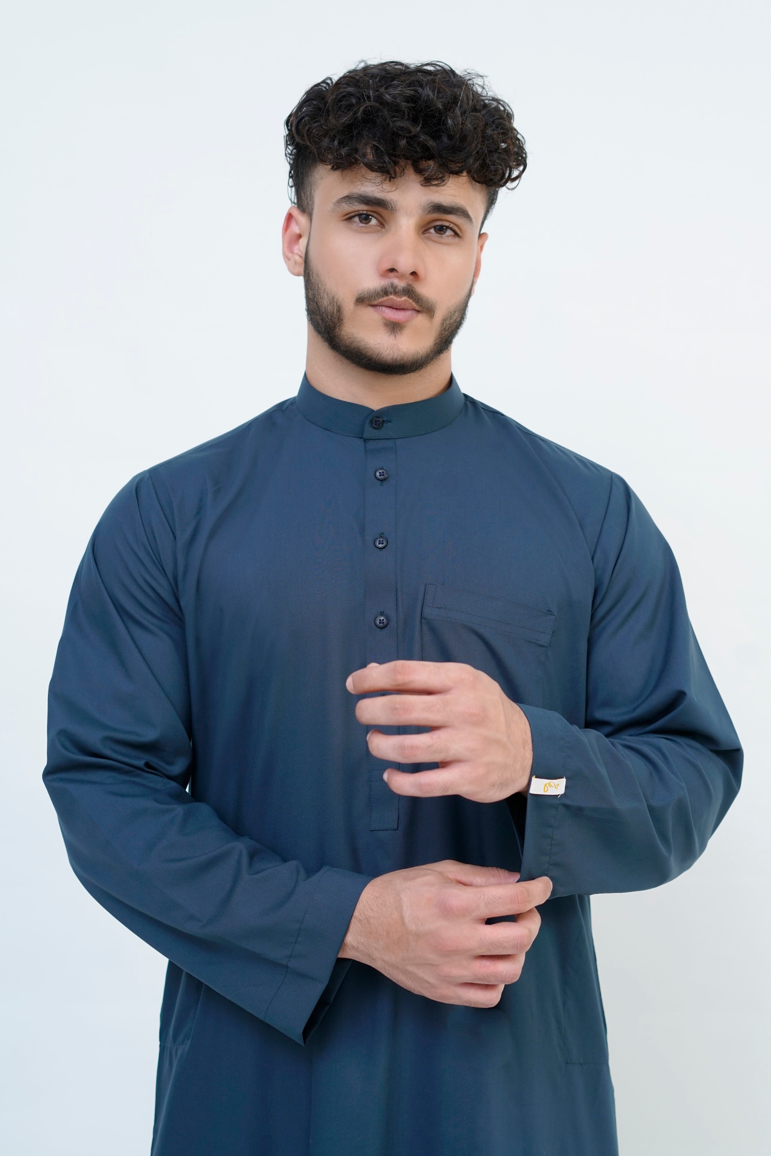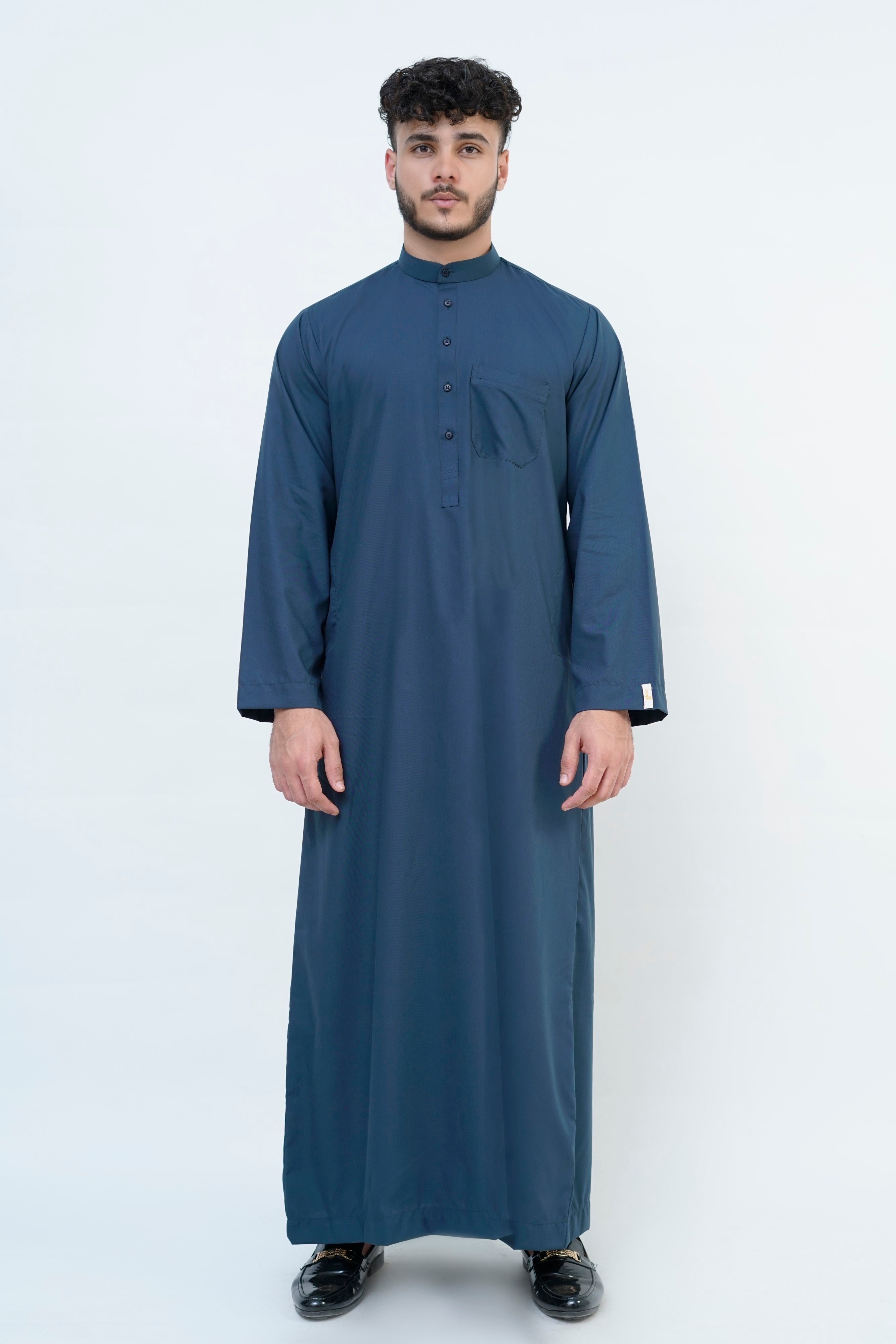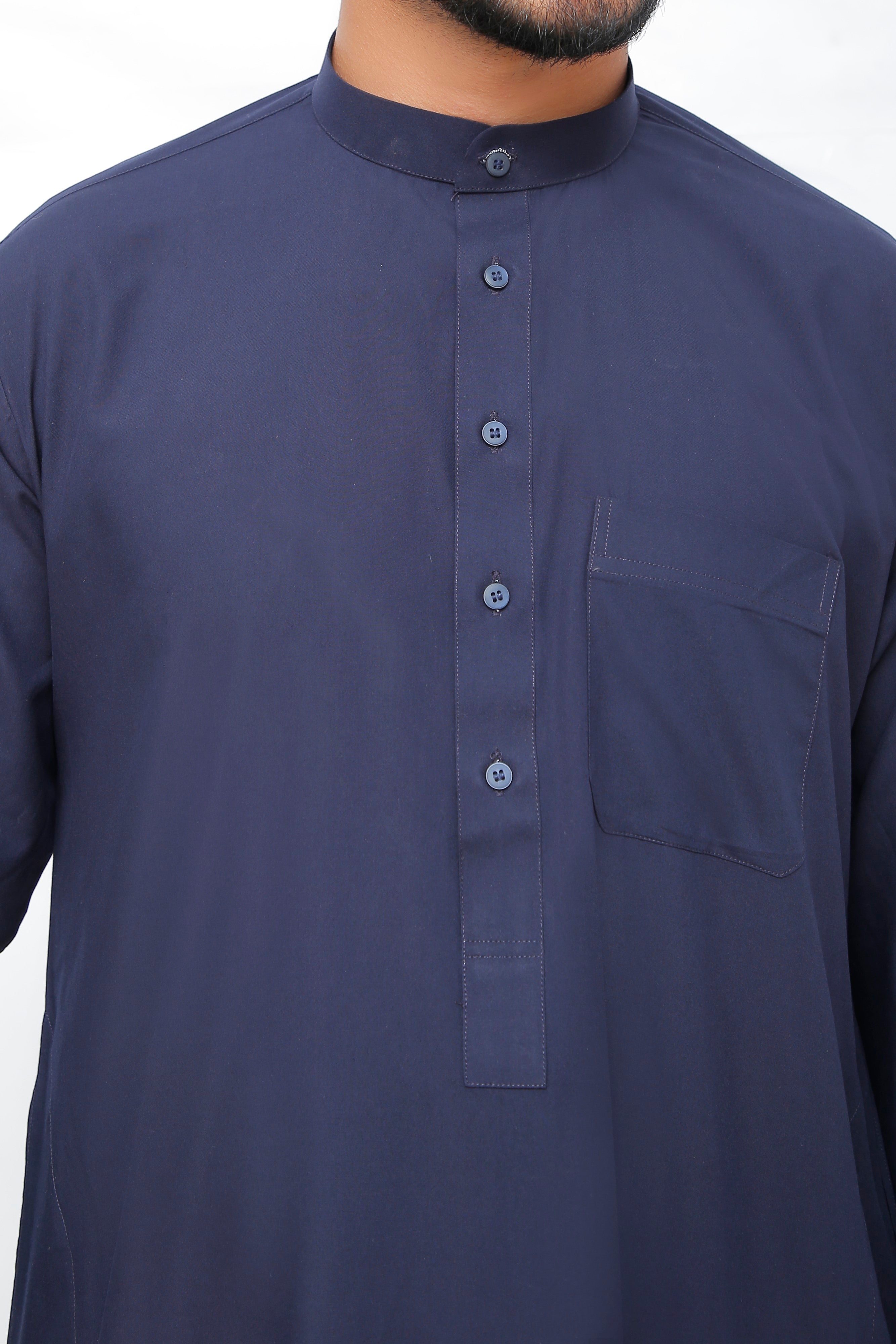 Navy Omani Round Neck Jubba with V Neck Stitched Embroidery