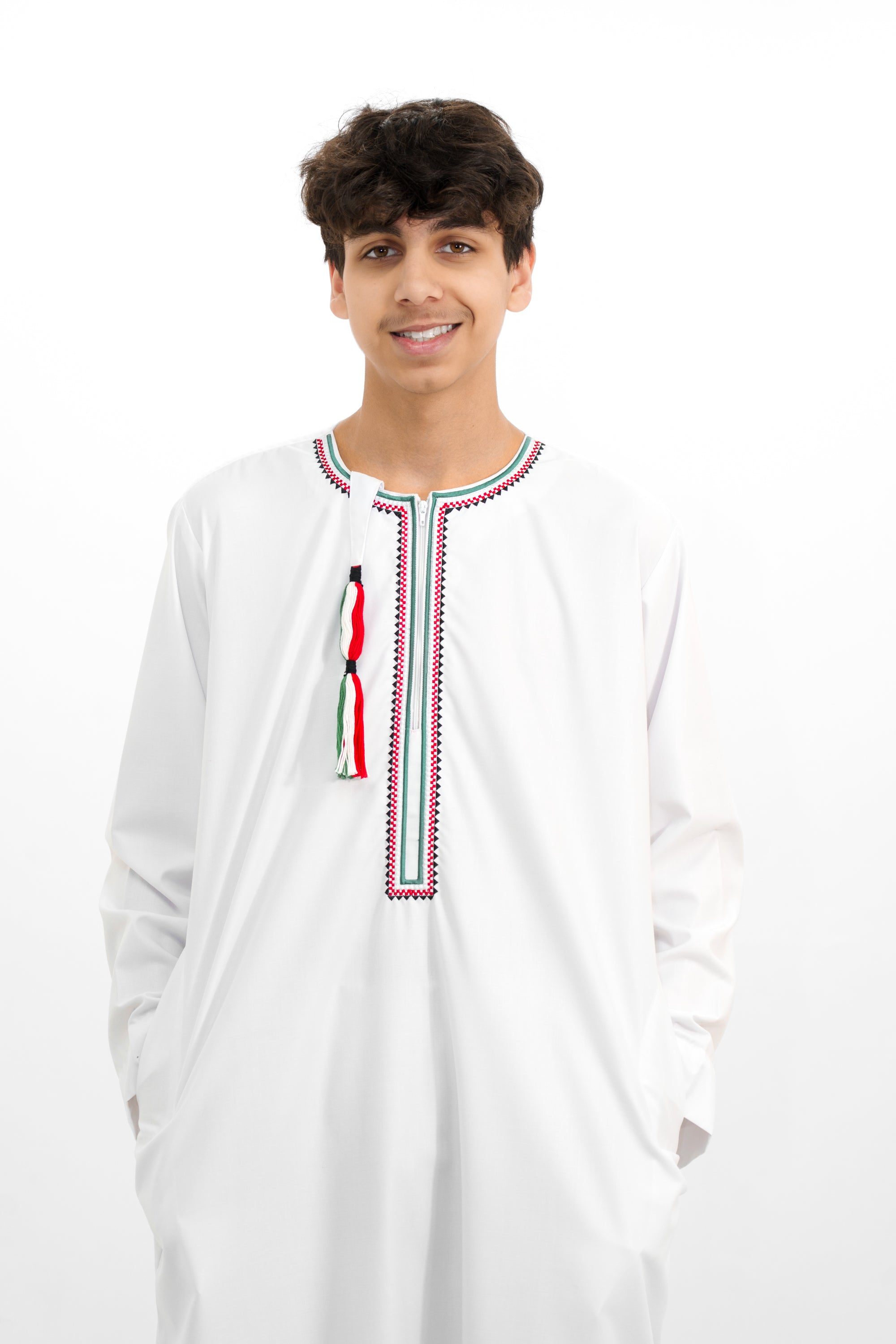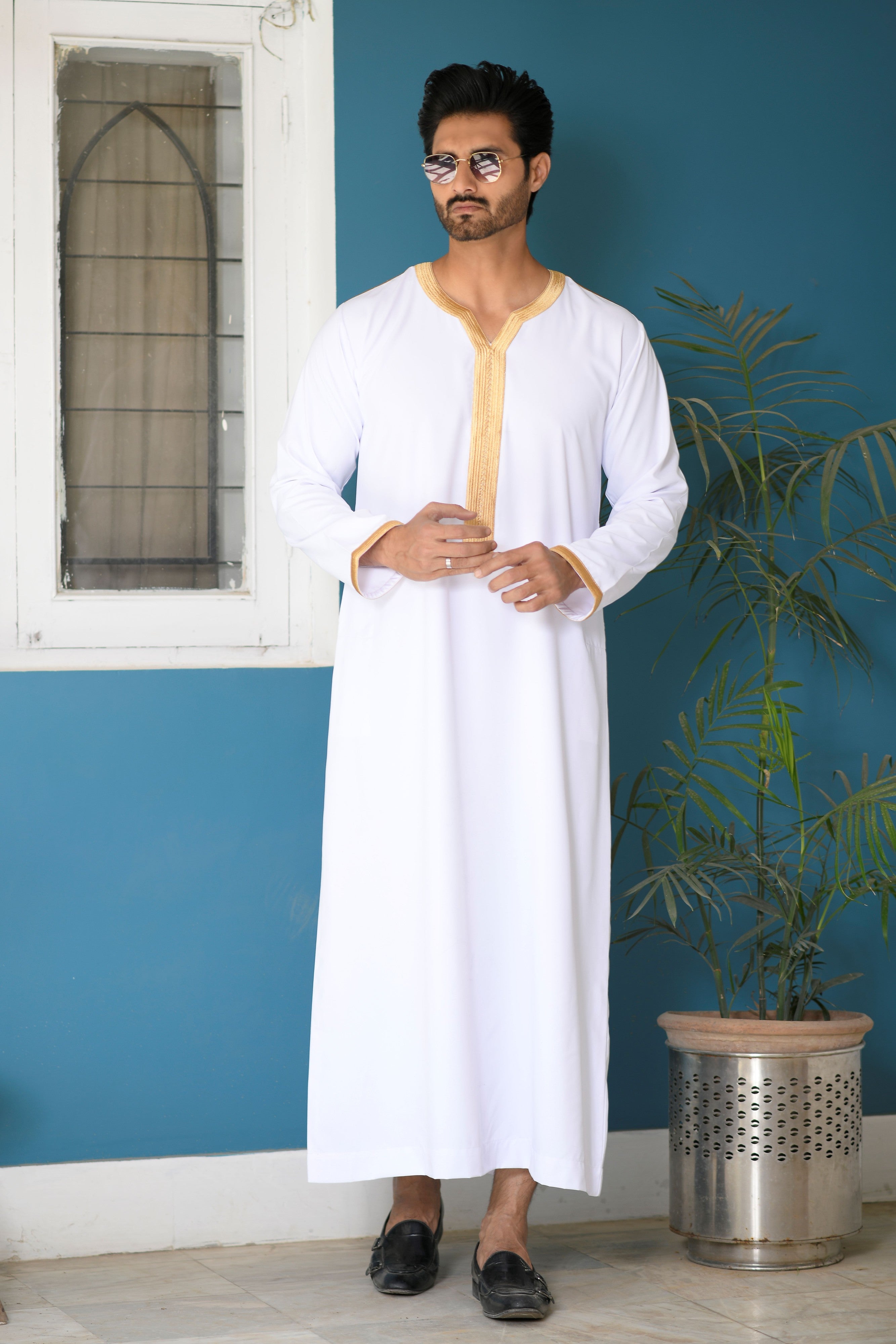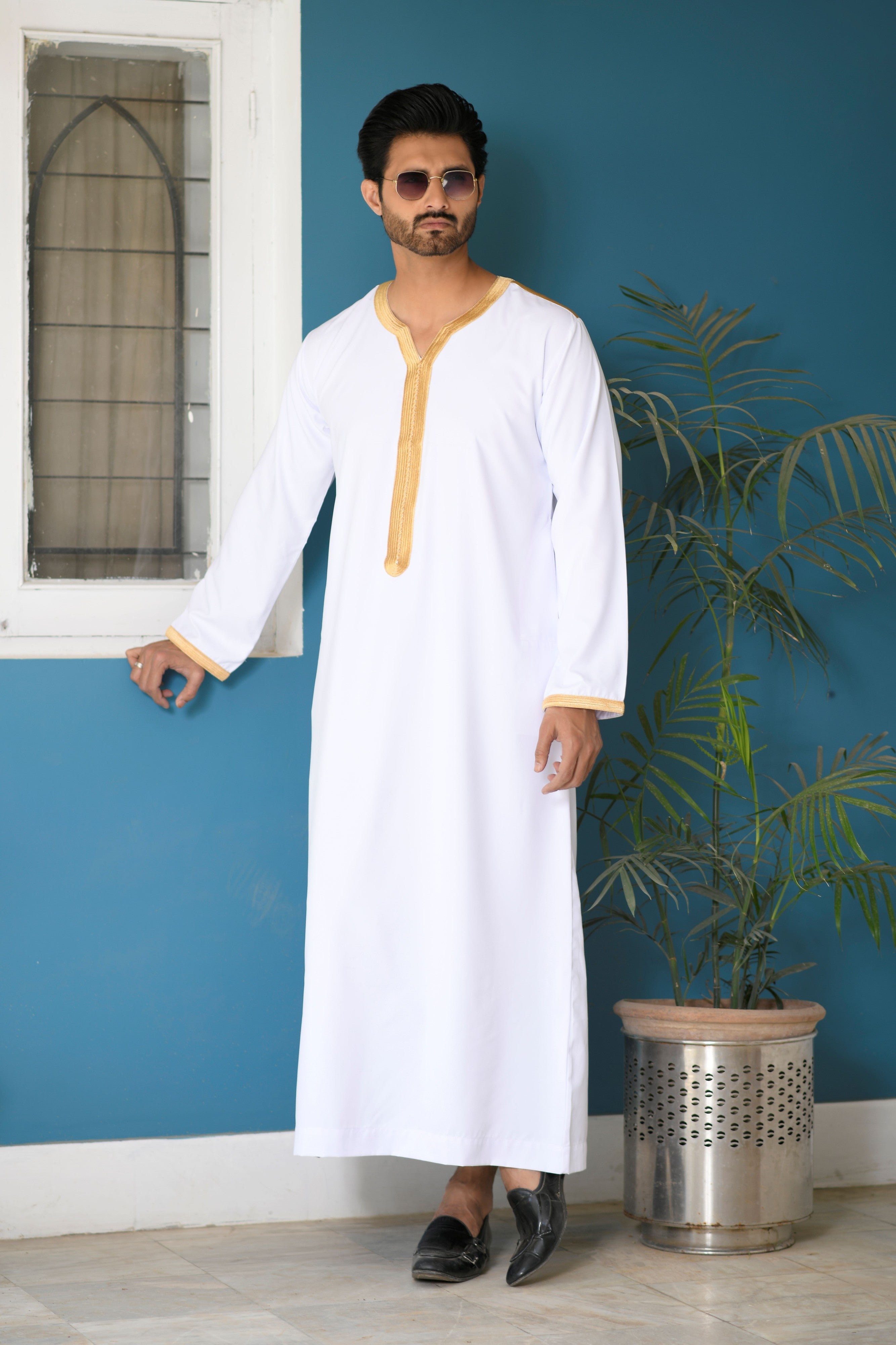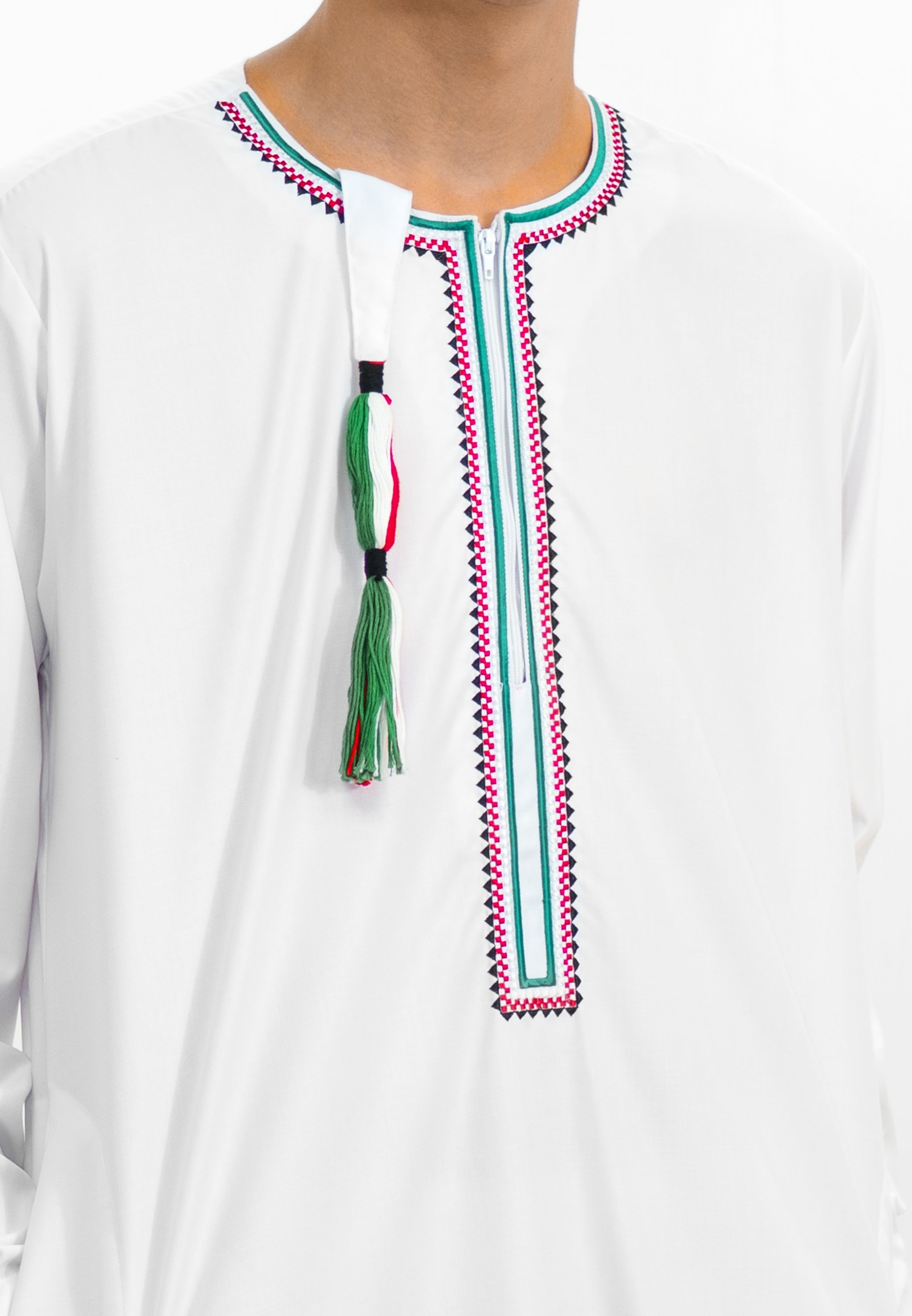 White Omani Round Neck Long Sleeve Jubba with Stitched Embroidery Design