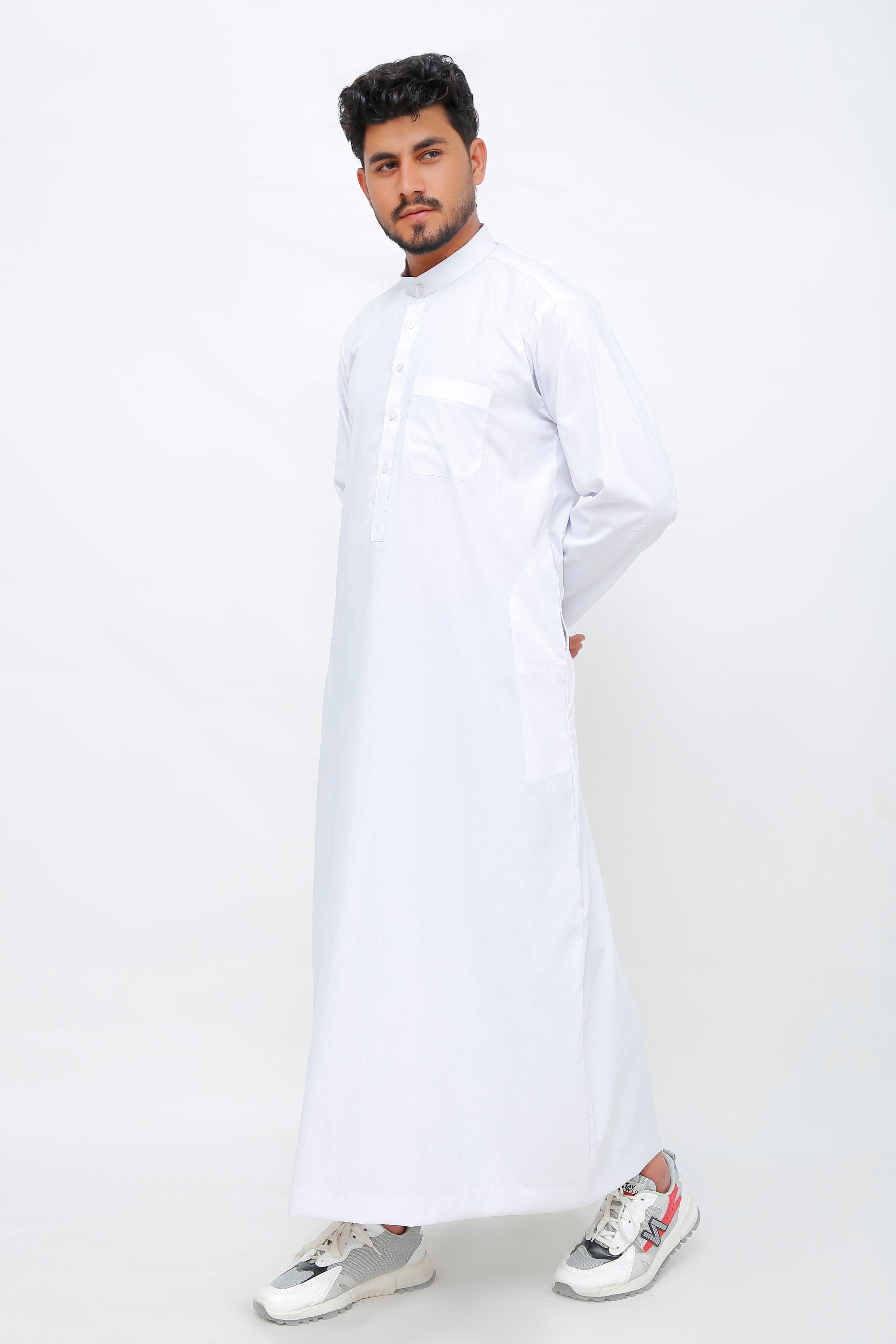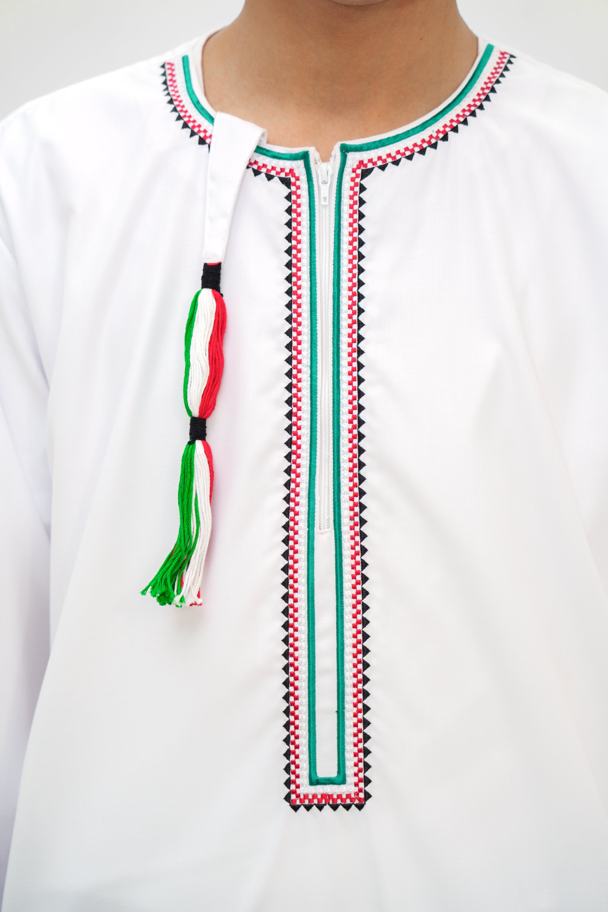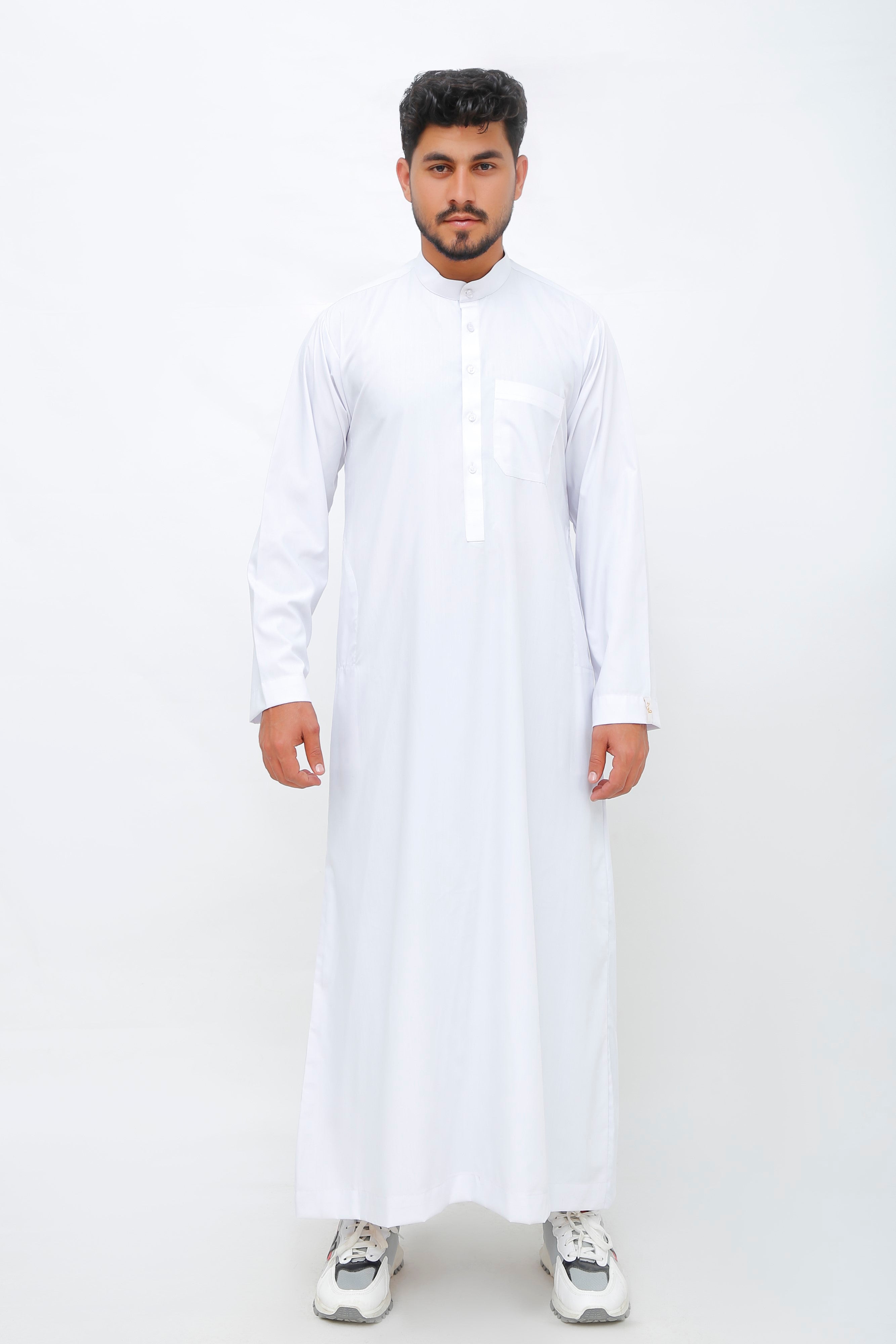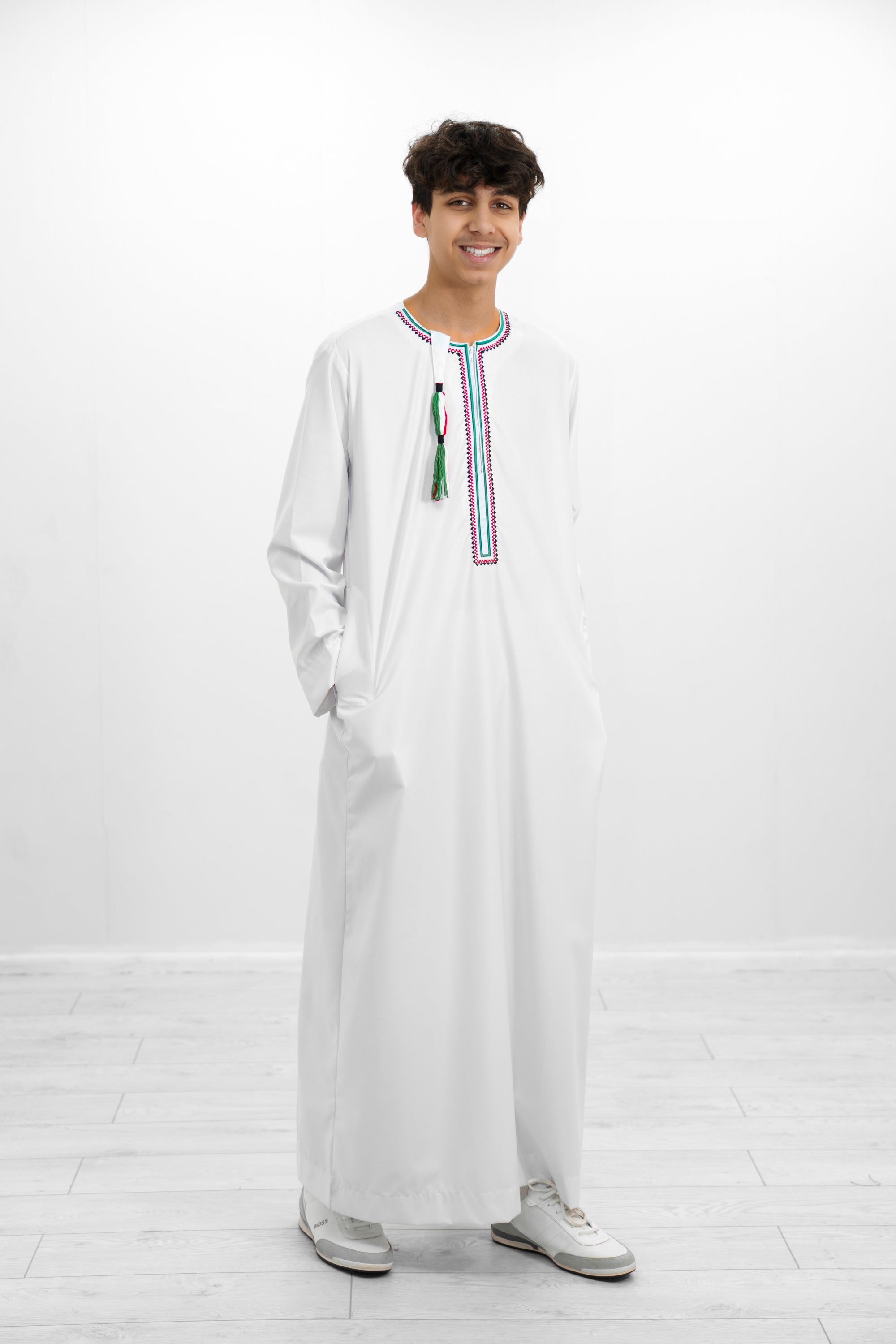 White Omani Round Neck Long Sleeve Jubba with Stitched Embroidery Design