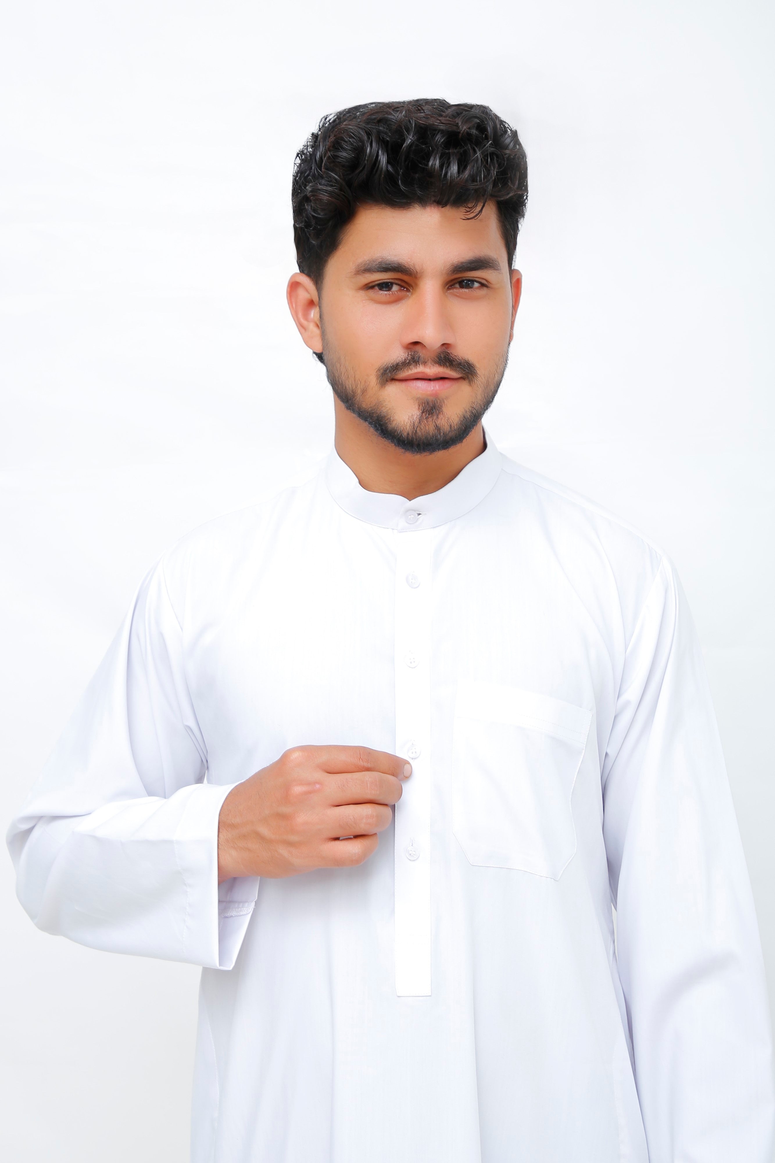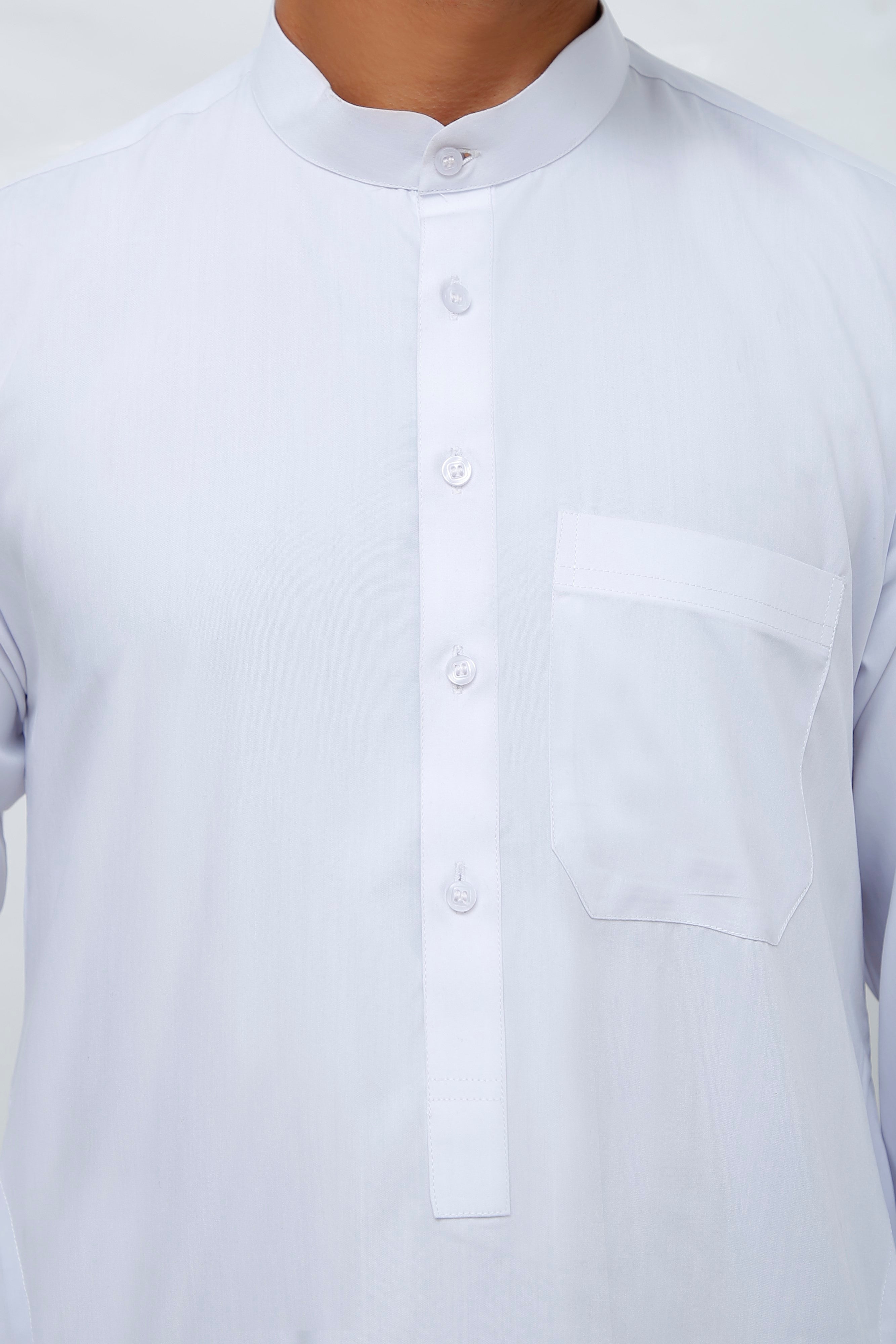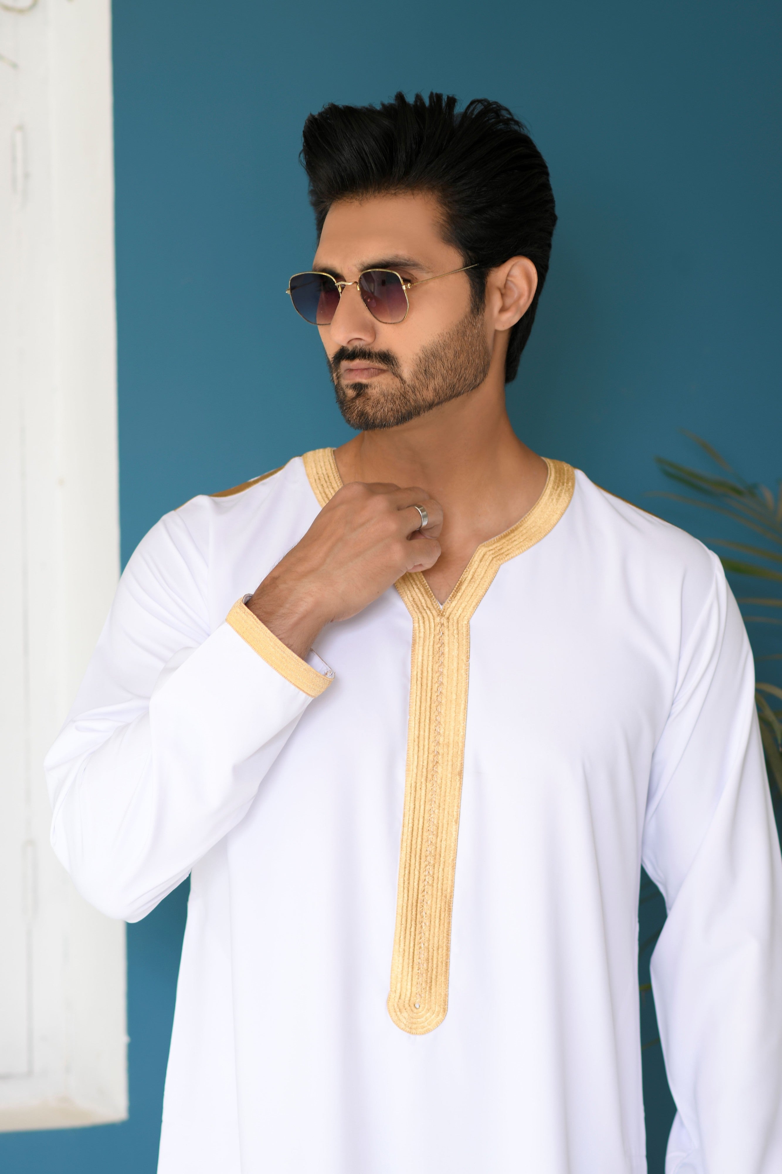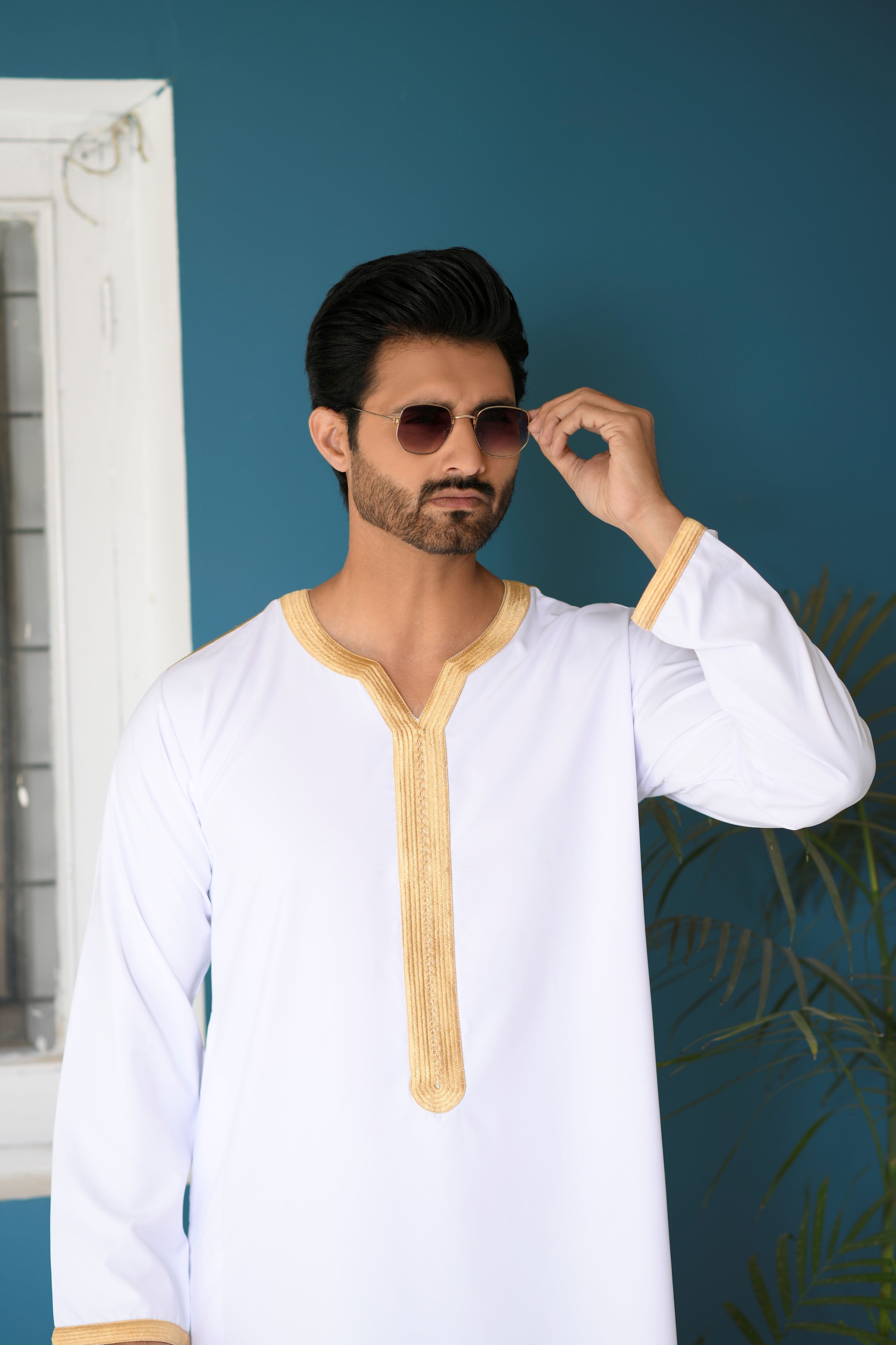 White Omani Round Neck Long Sleeve Jubba with Stitched Embroidery Design