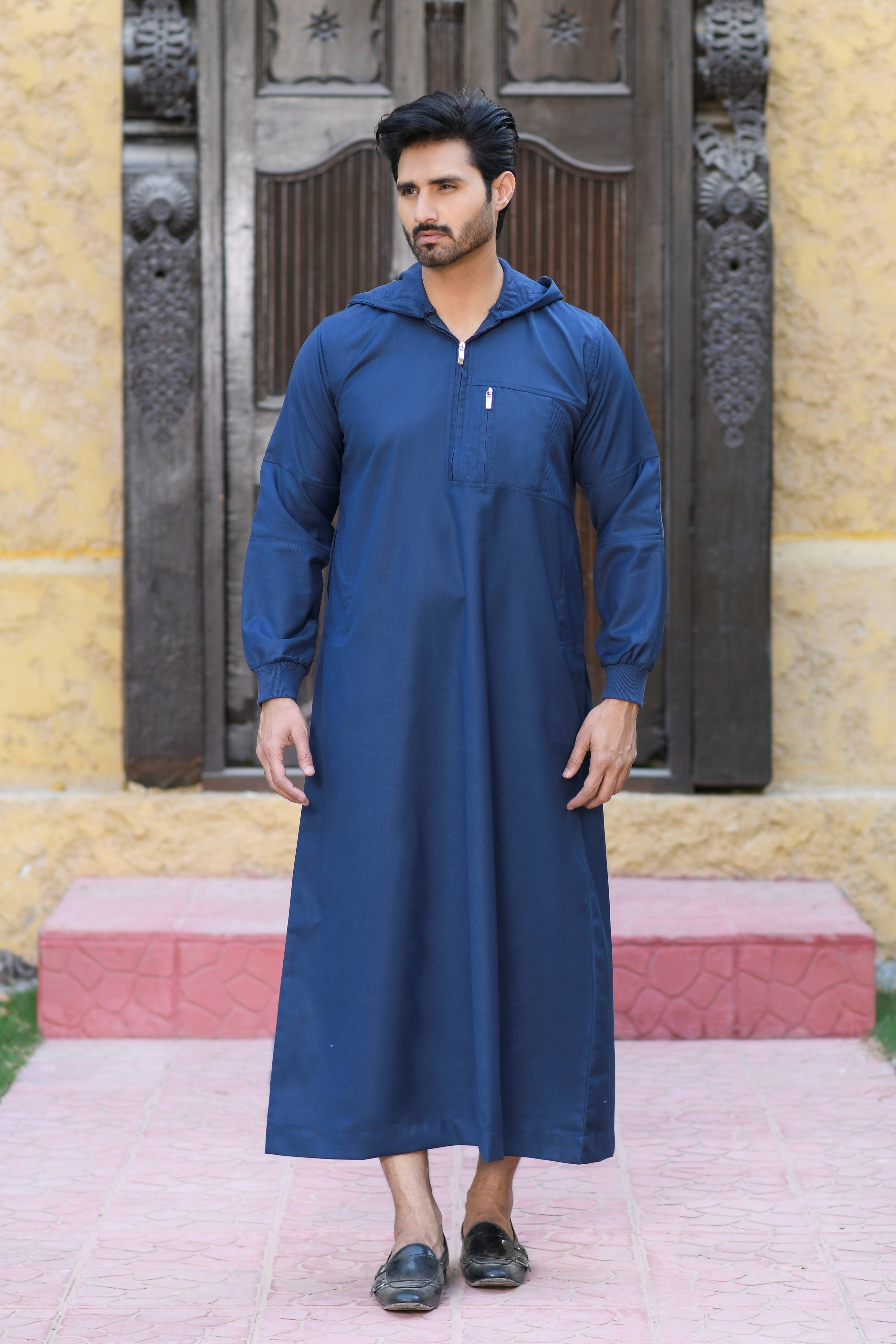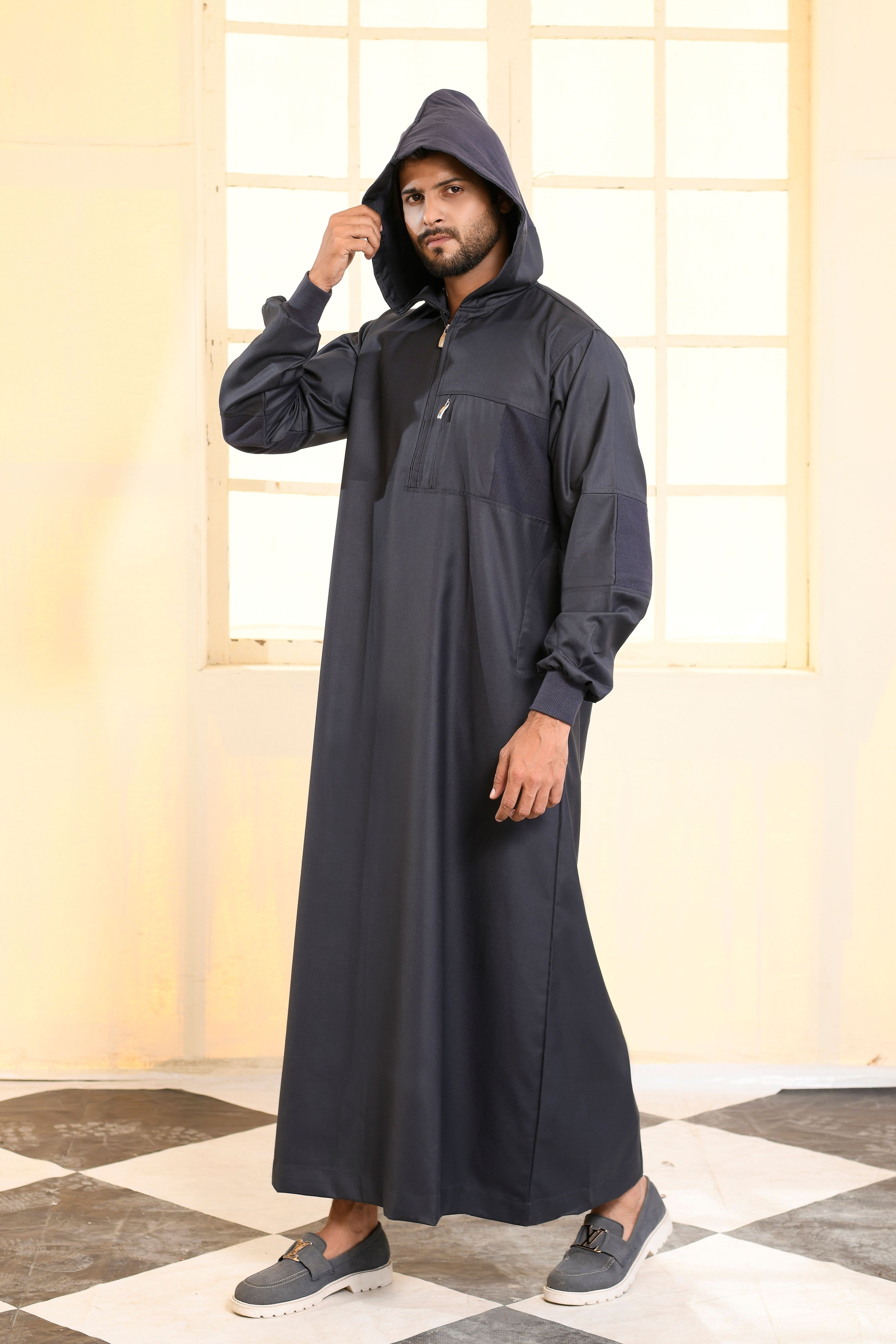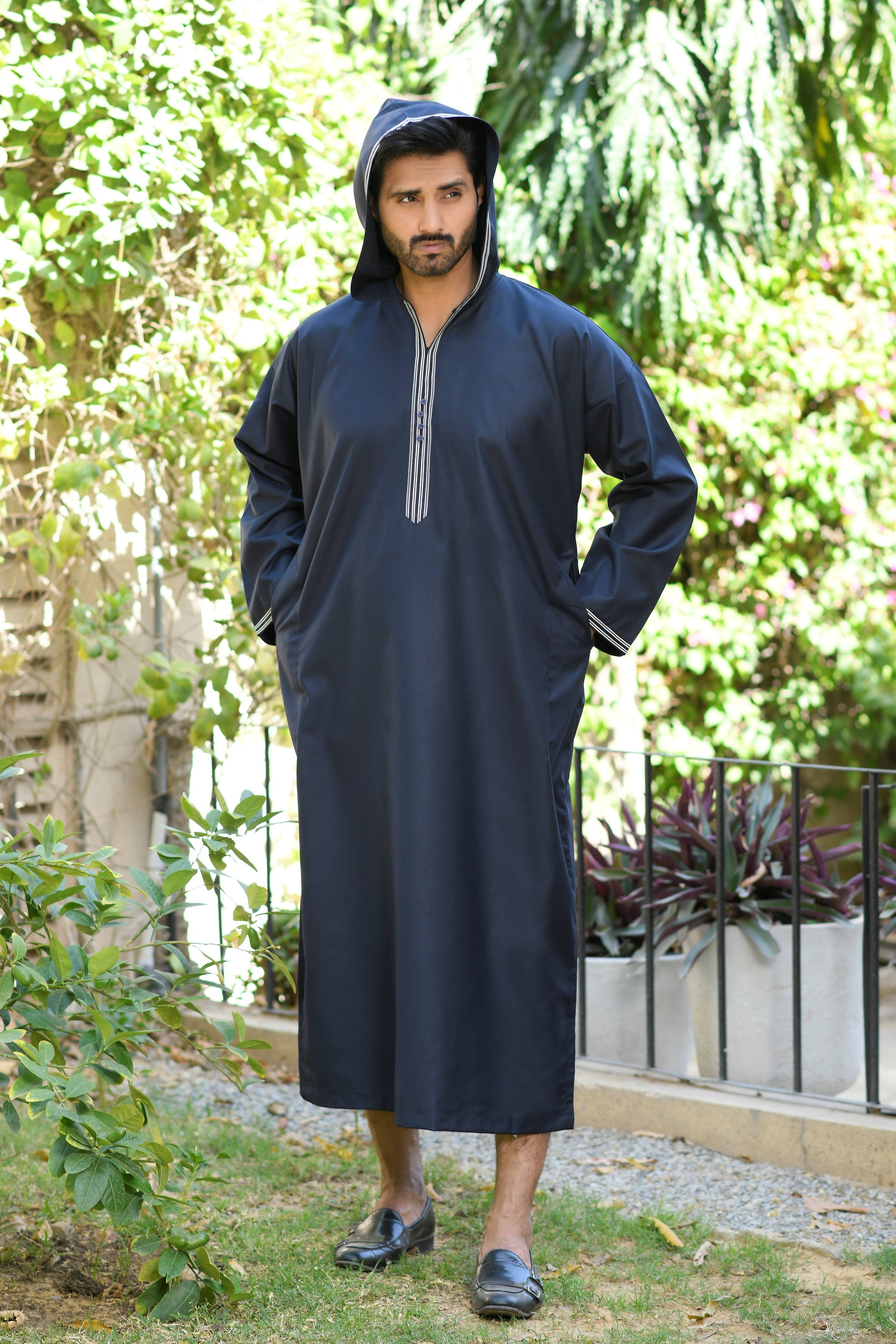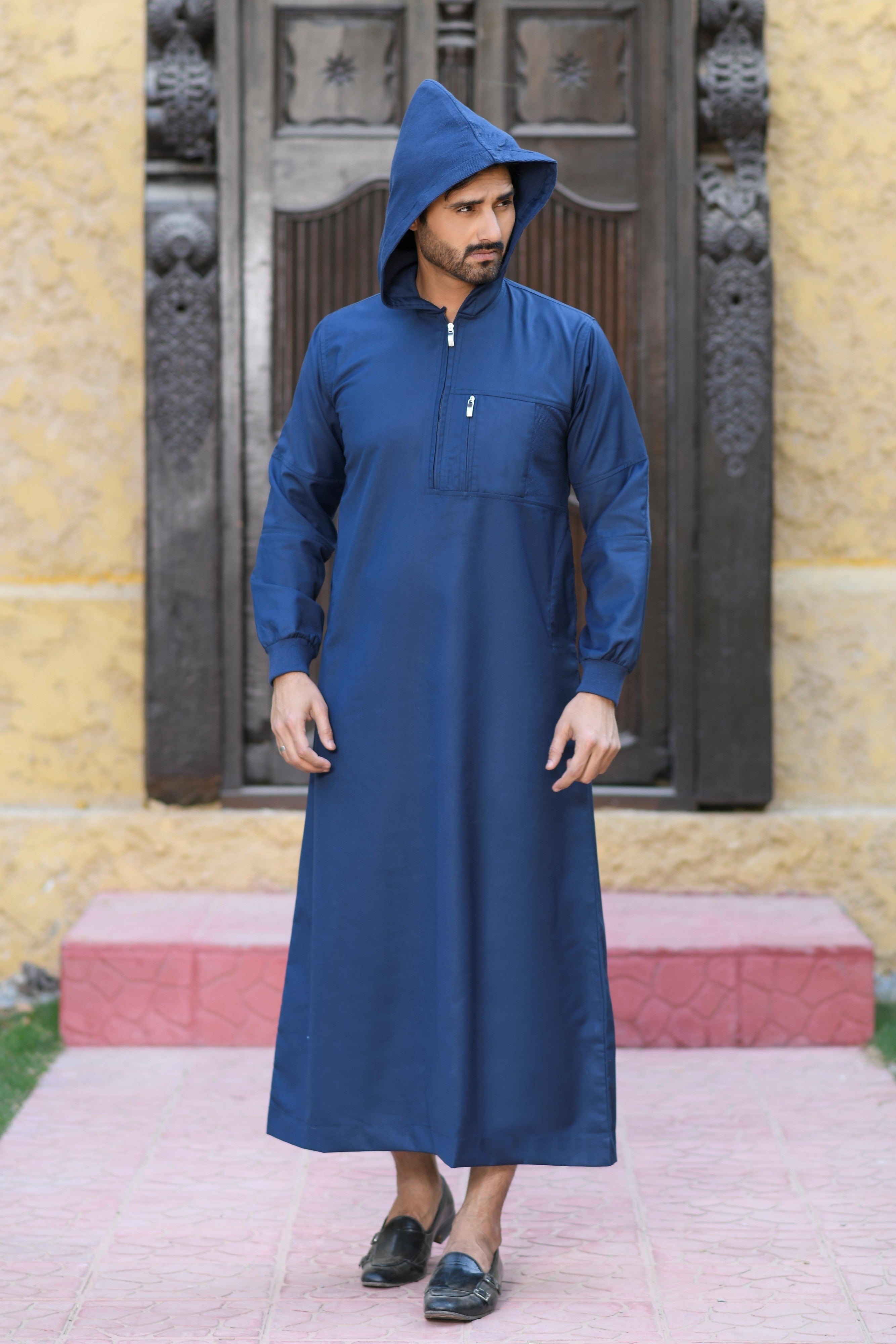 Navy Hooded Long Cuffed Sleeve Jubba with Pockets and Zip