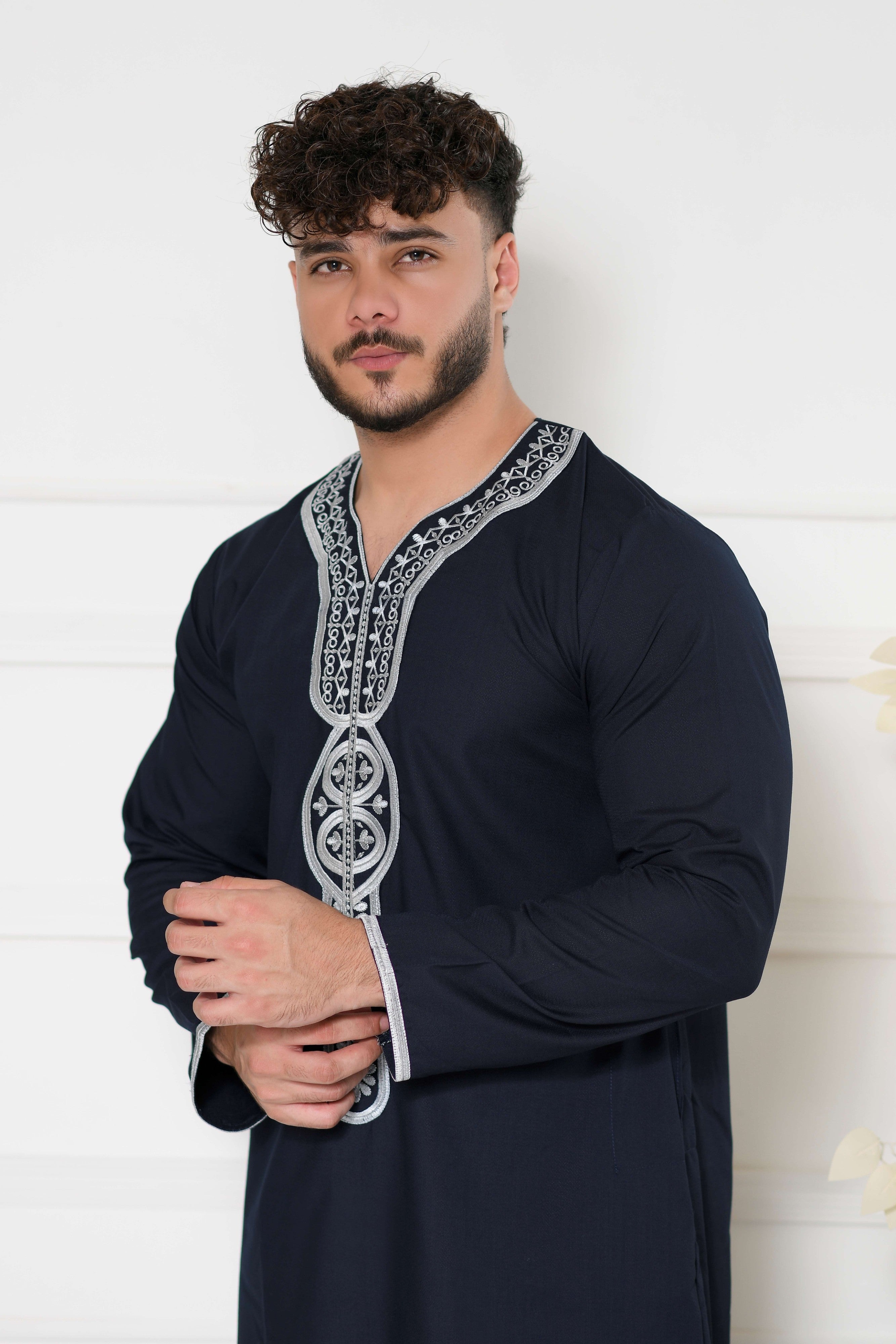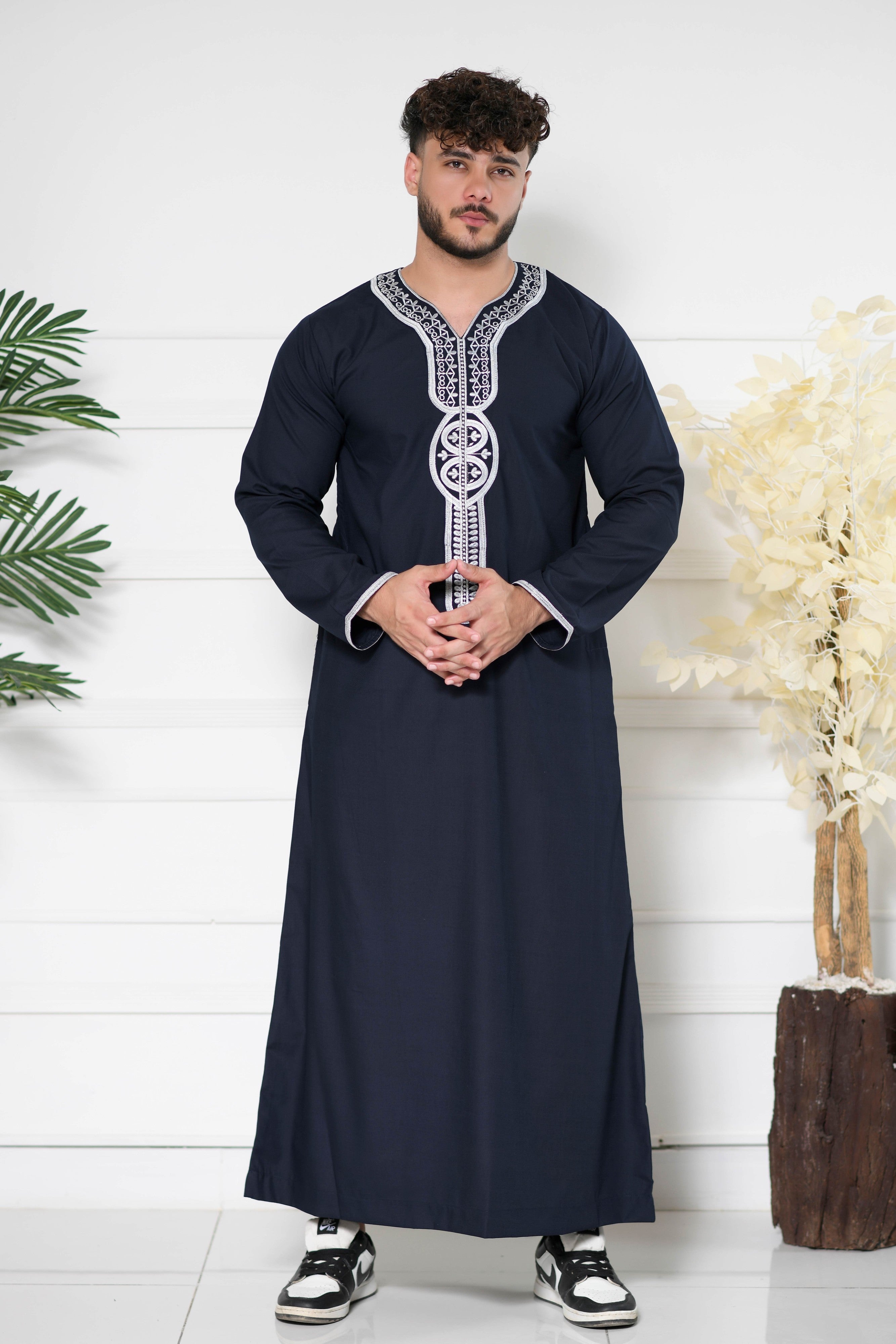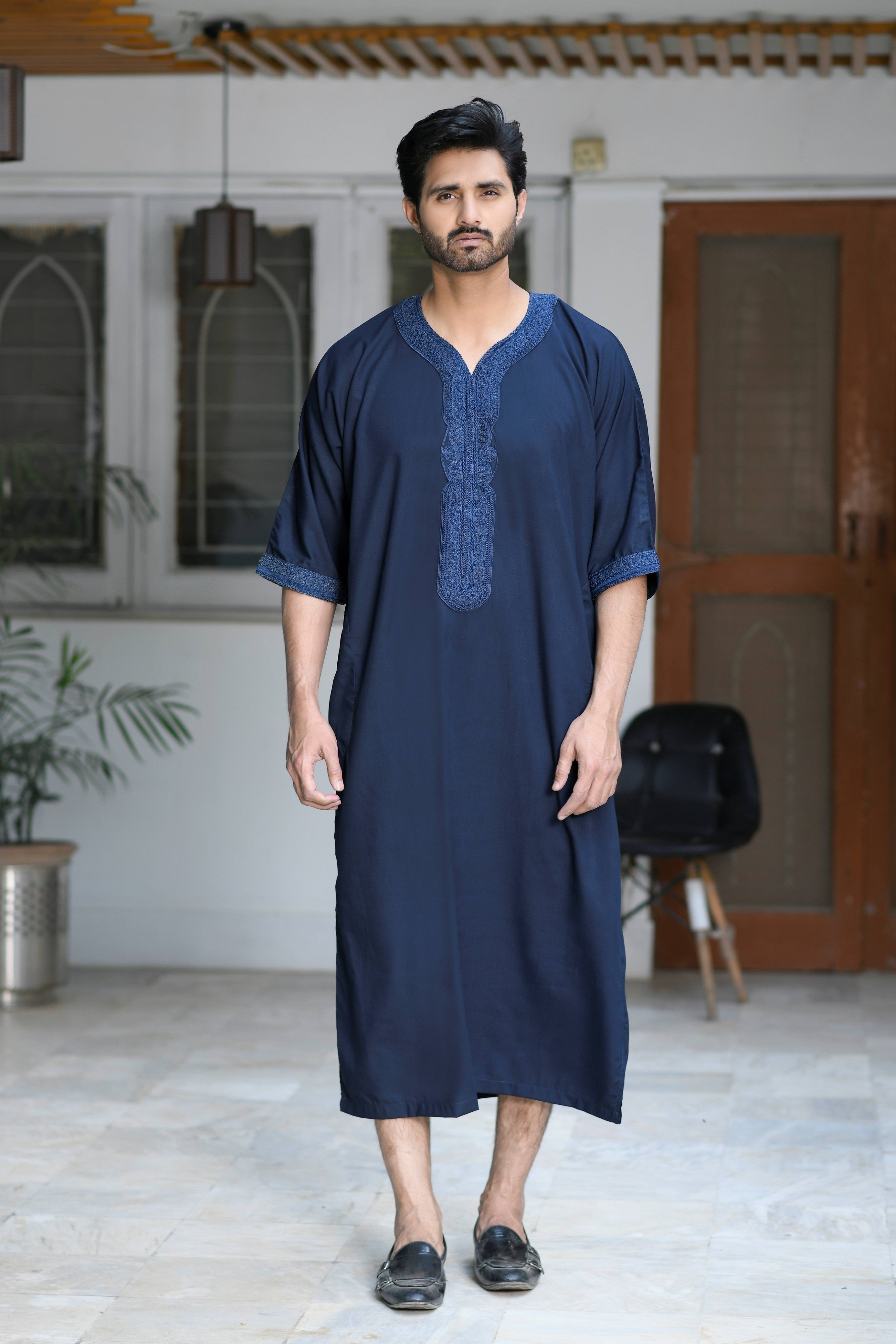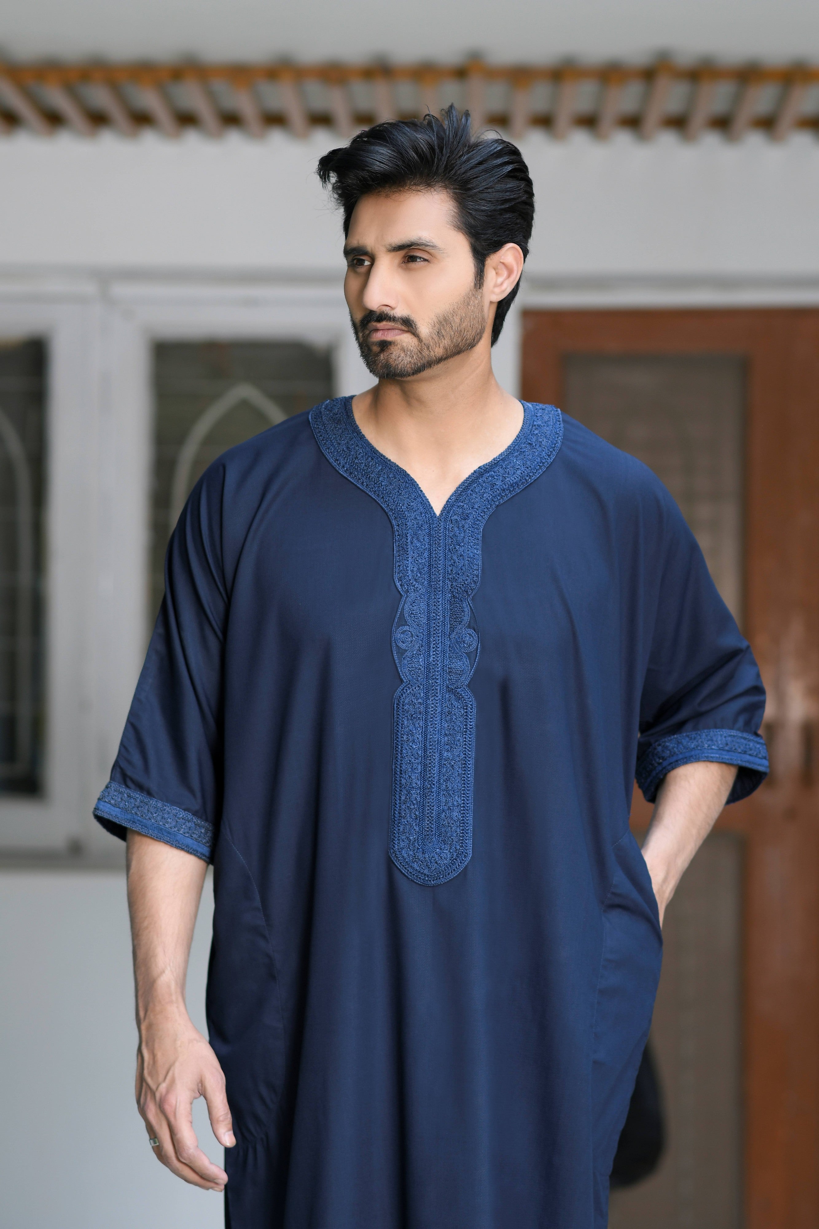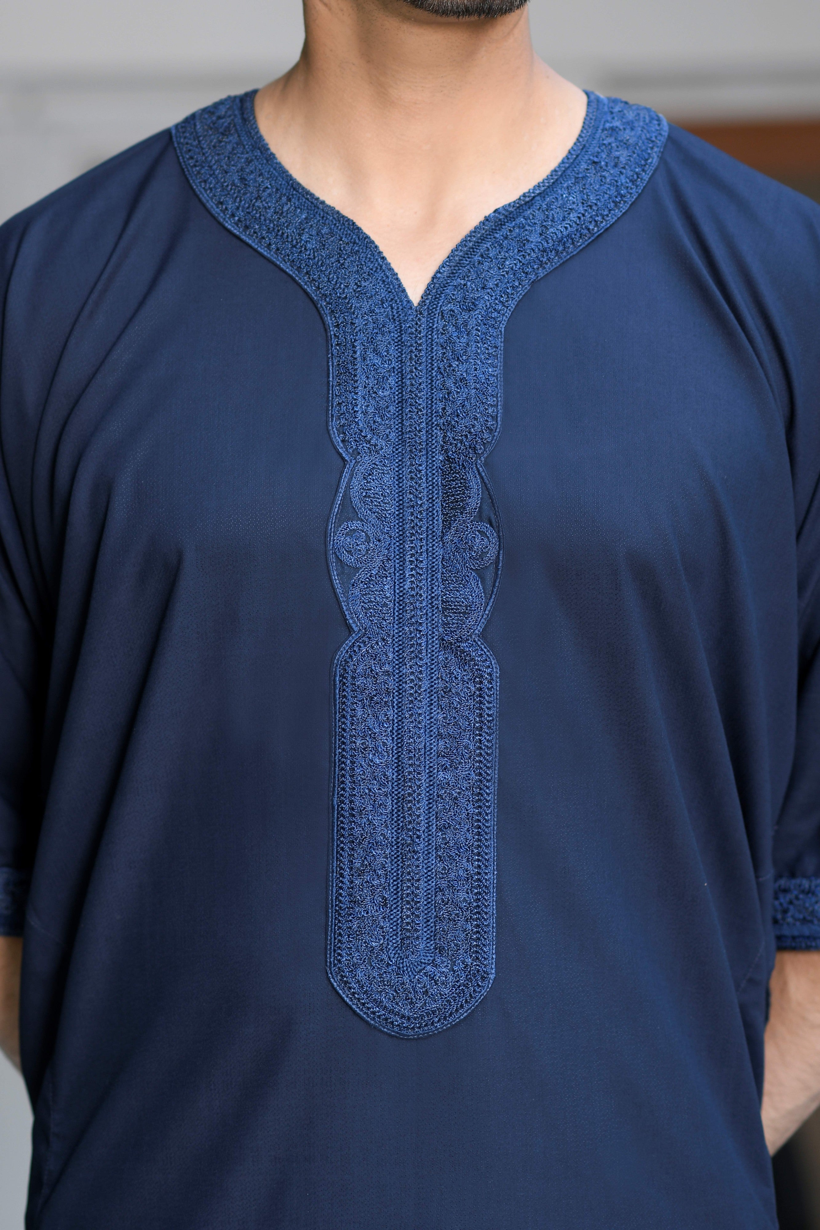 Navy Moroccan Half Sleeve Embroidery Jubba with Pockets
