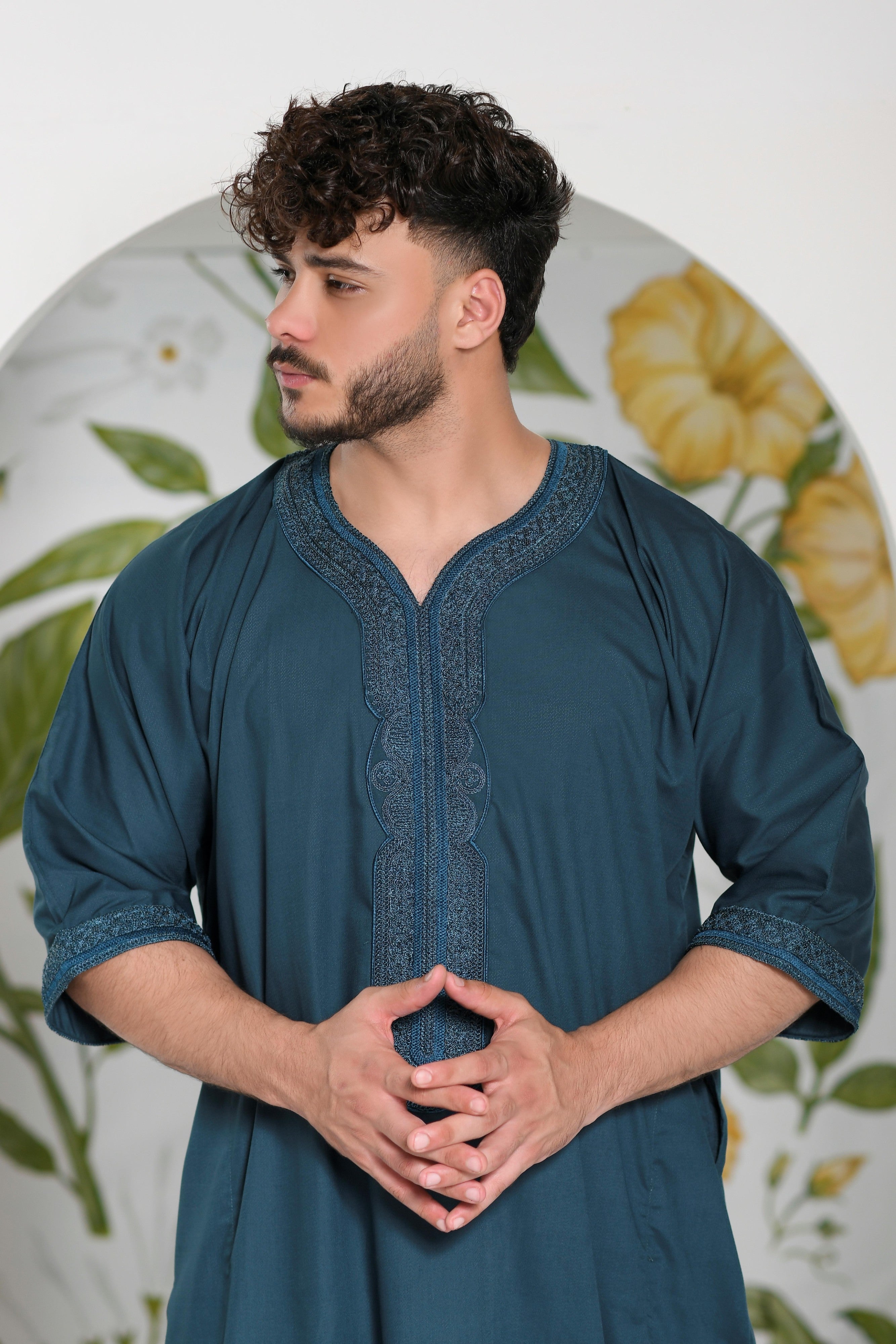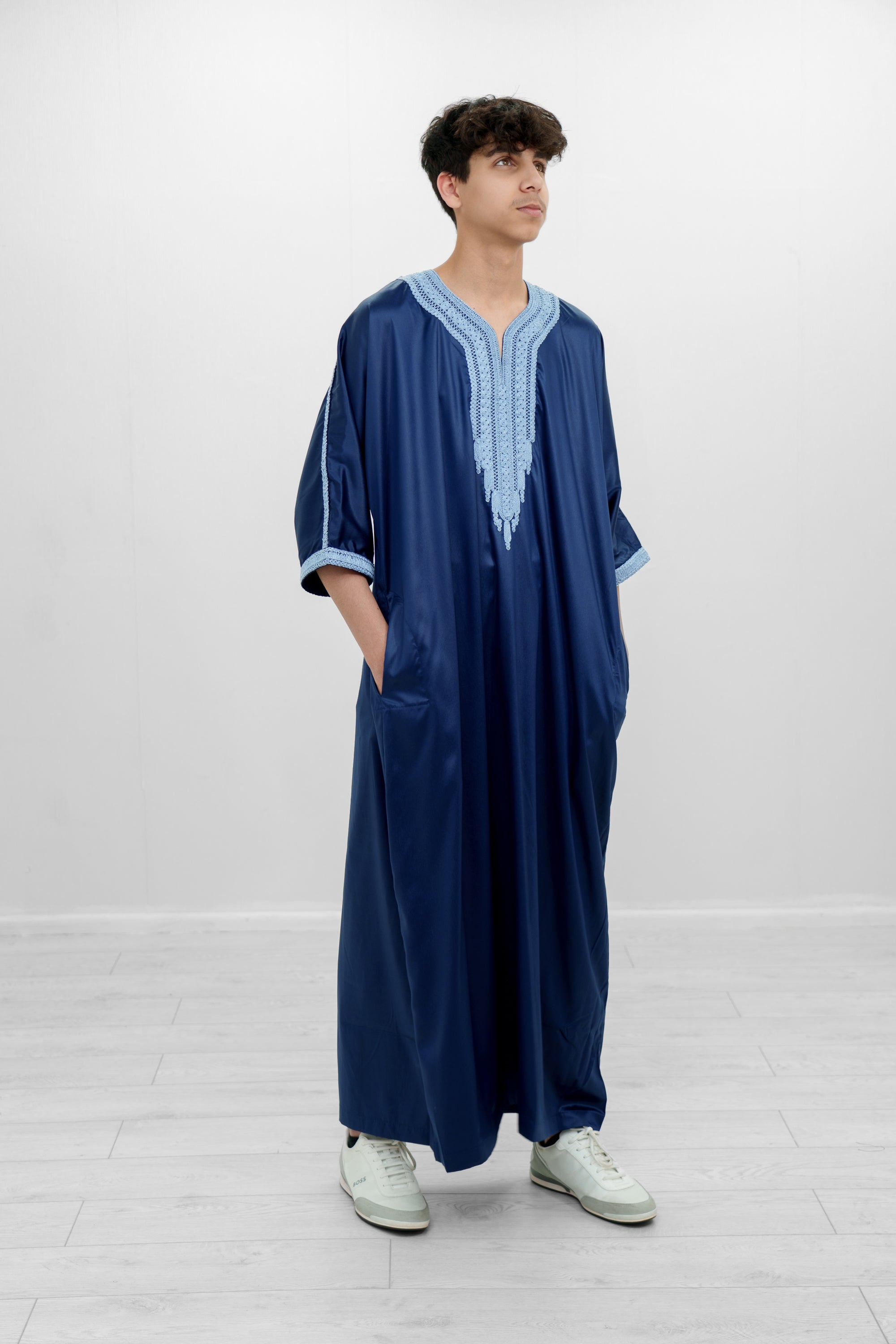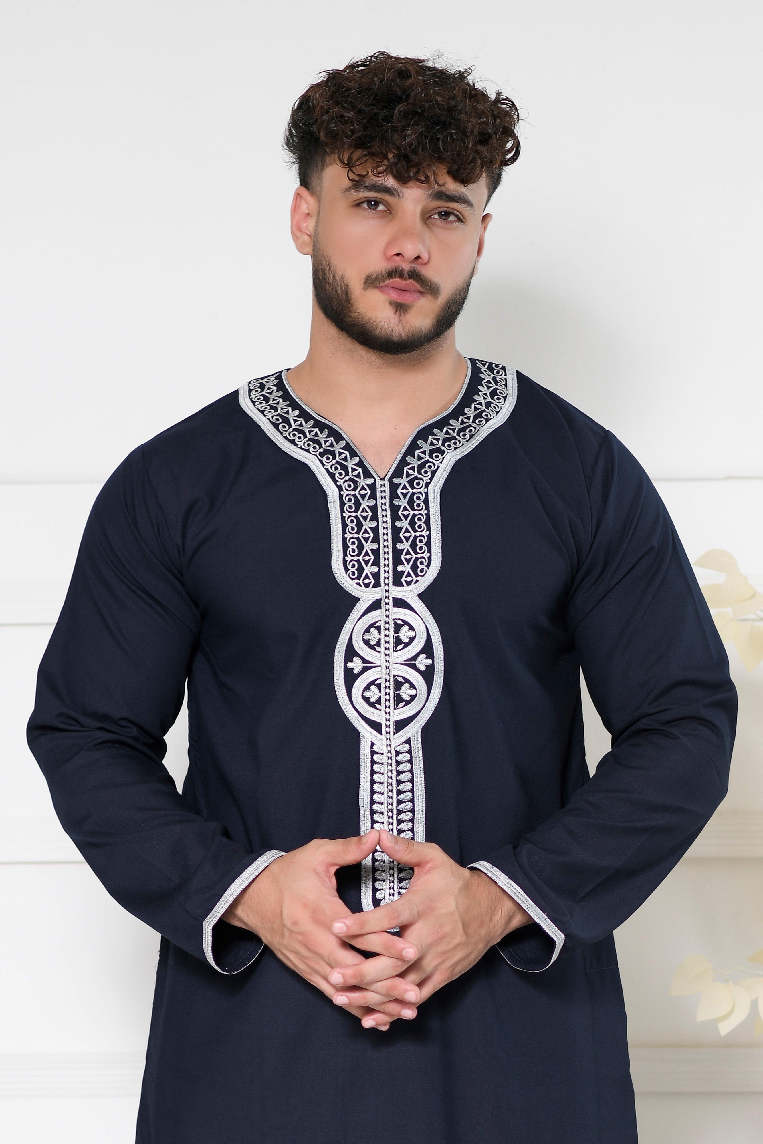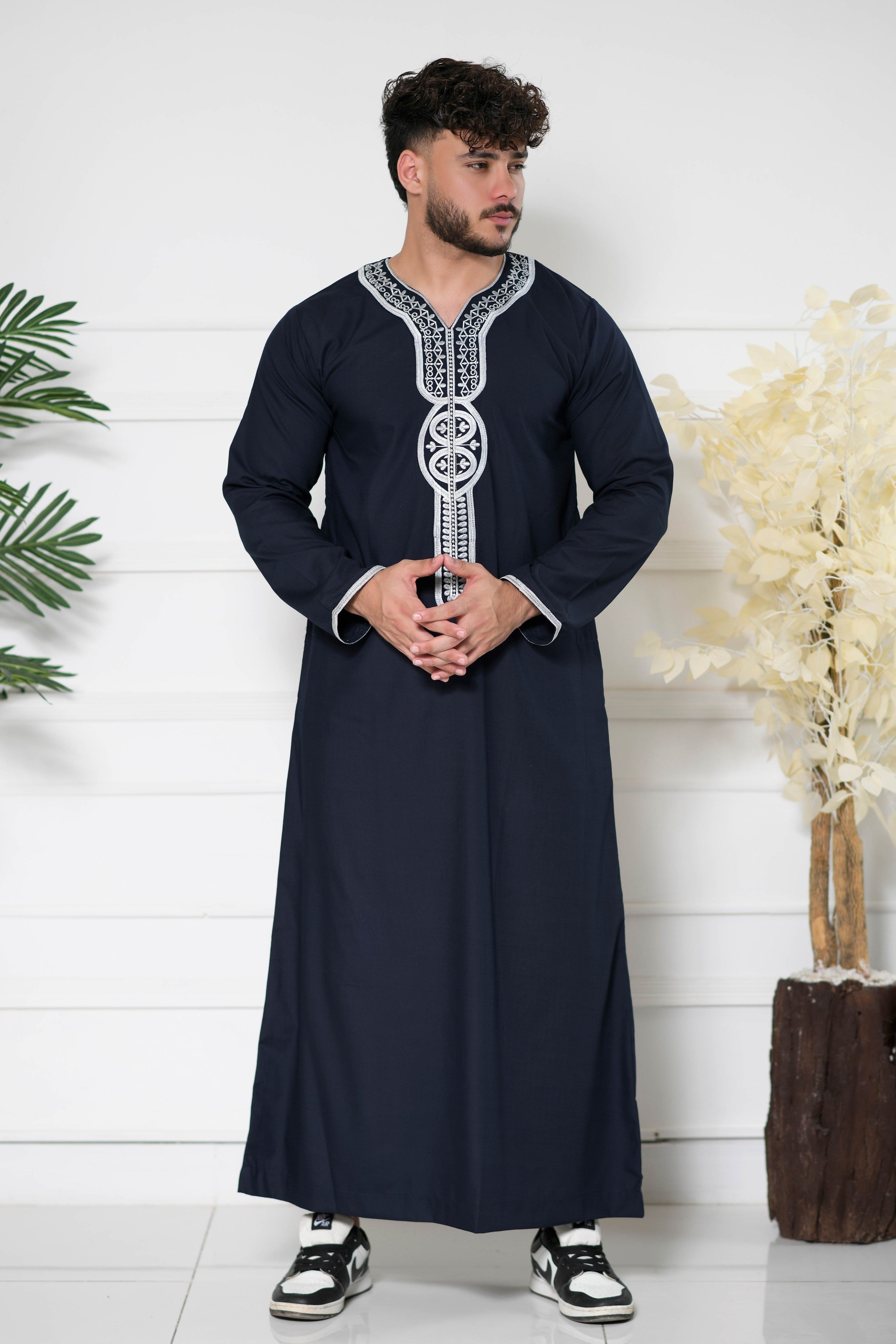 Navy Moroccan Half Sleeve Embroidery Jubba with Pockets