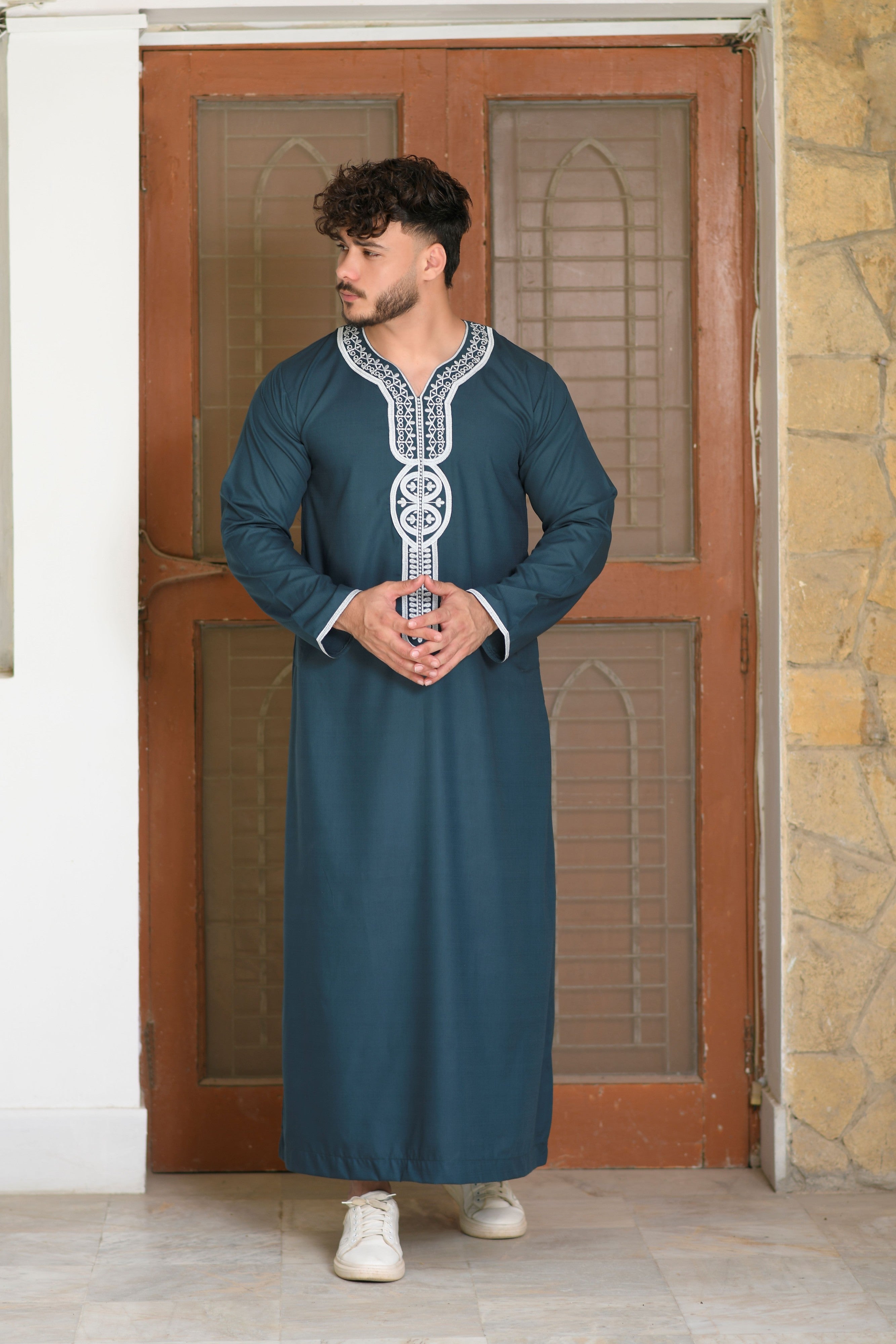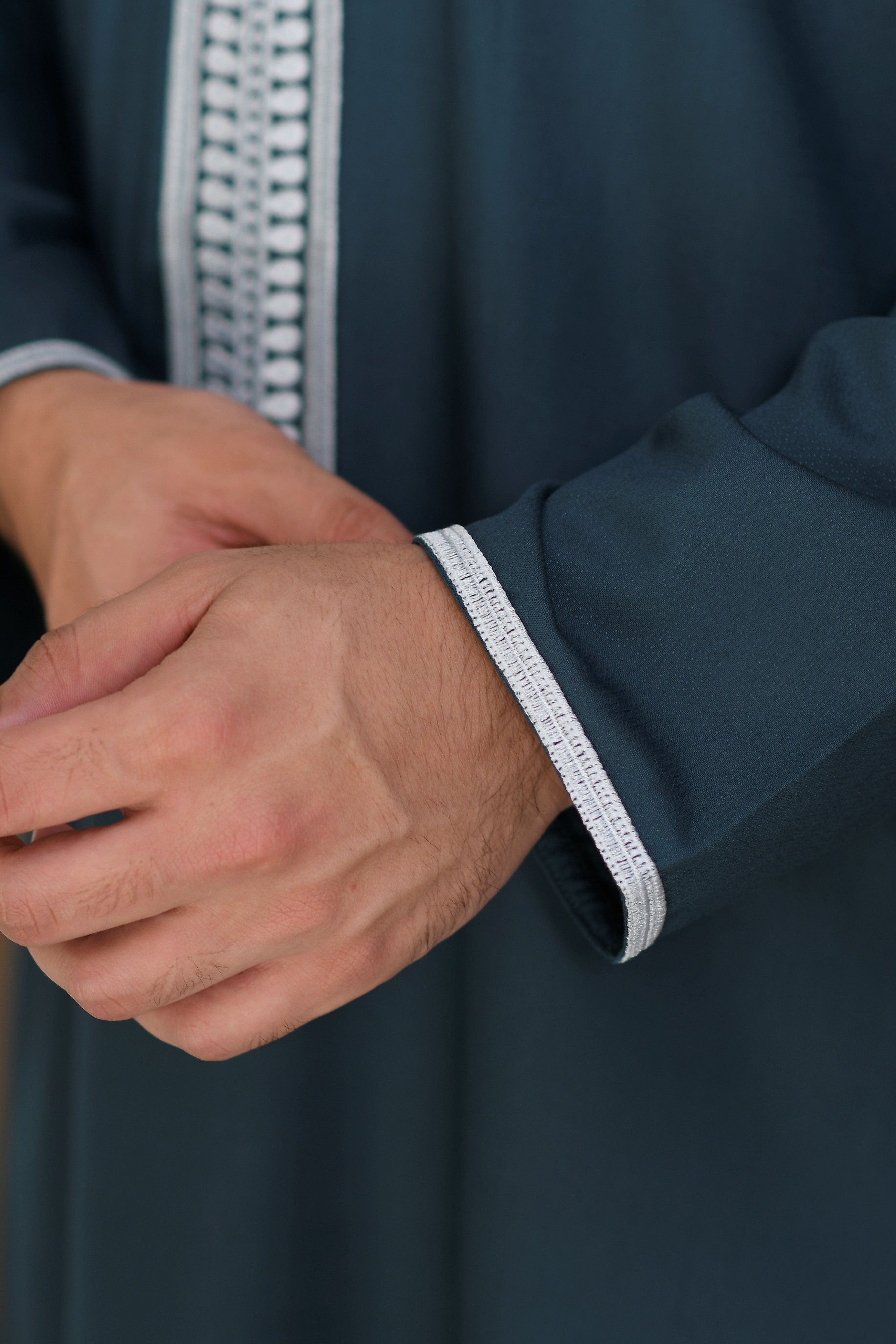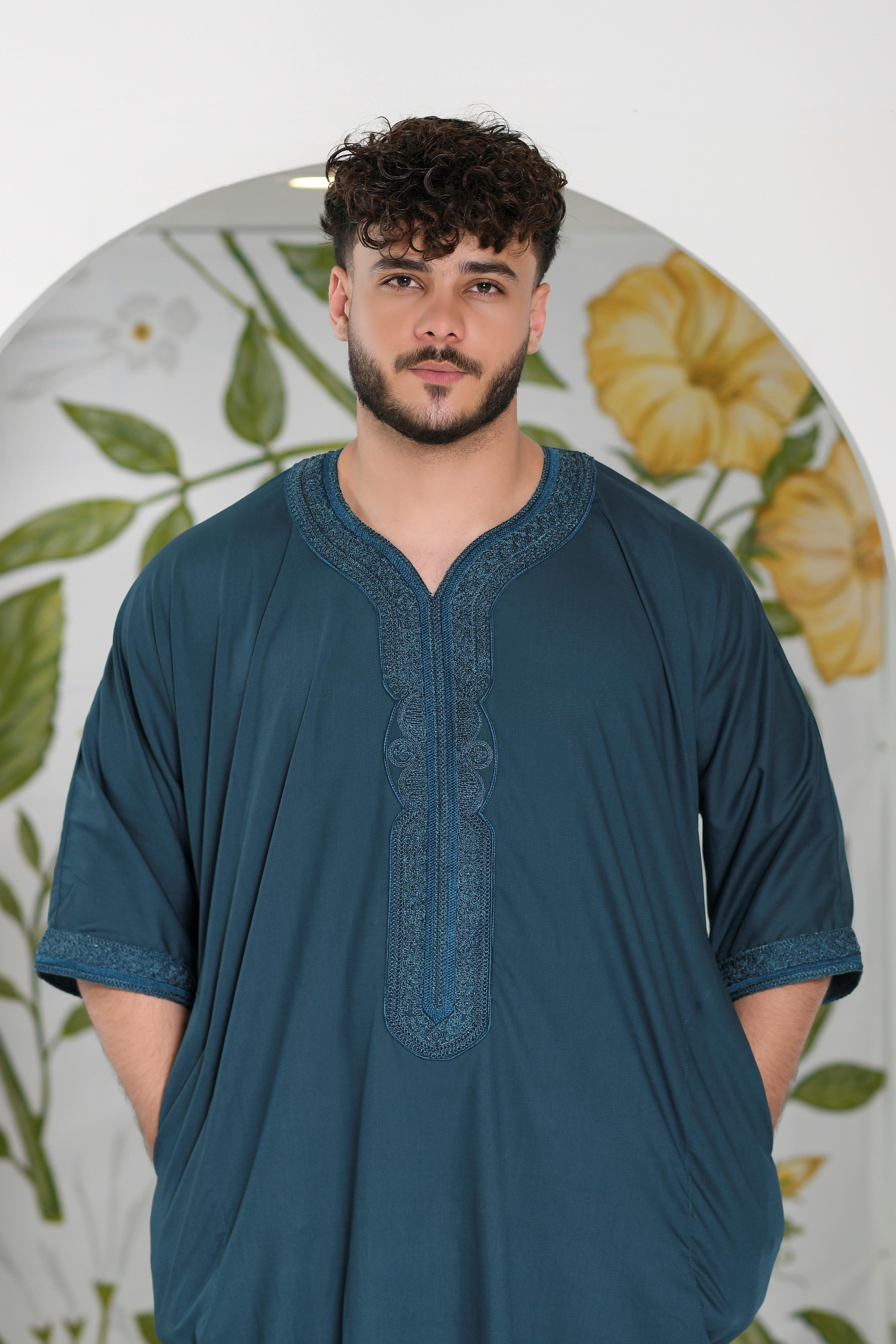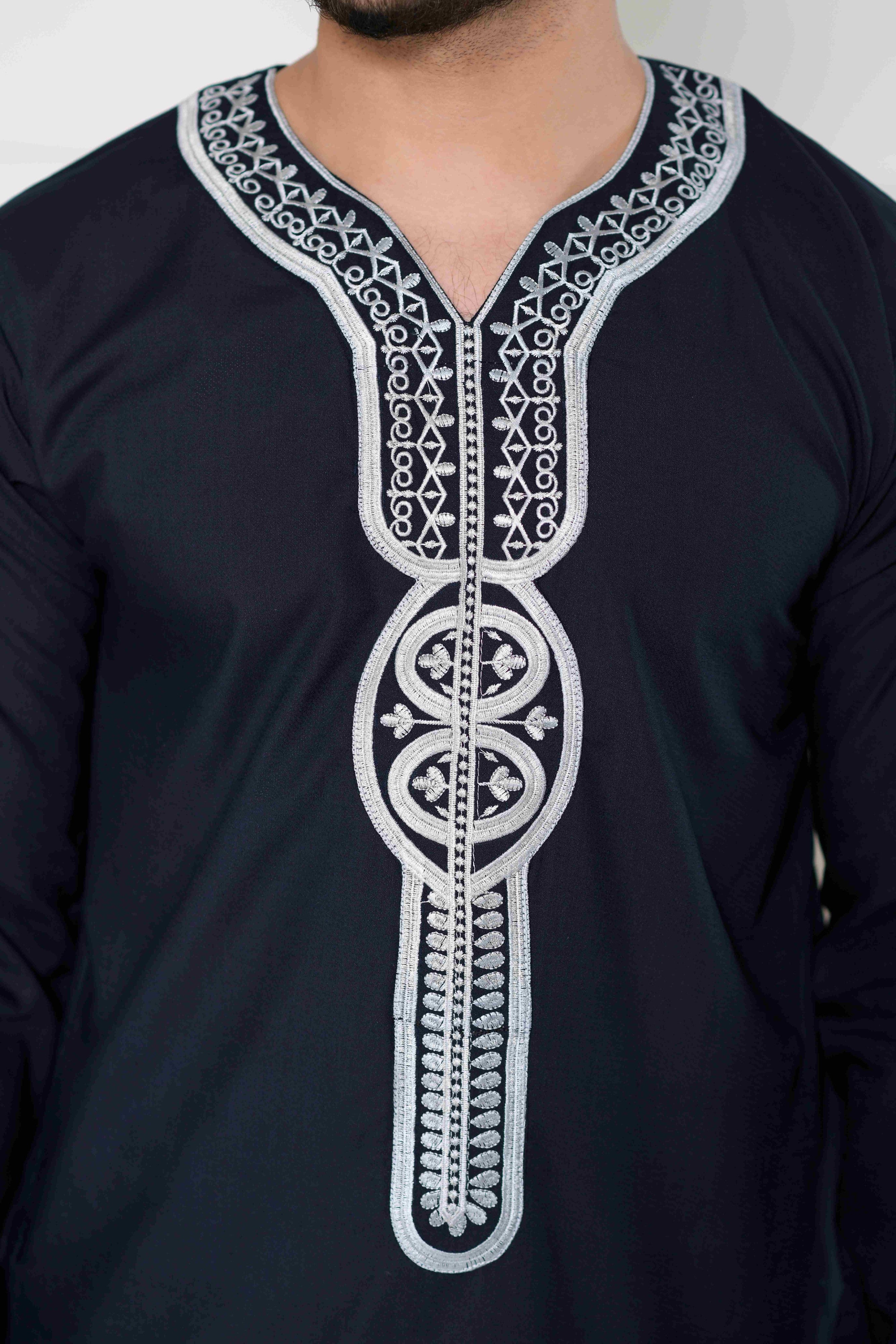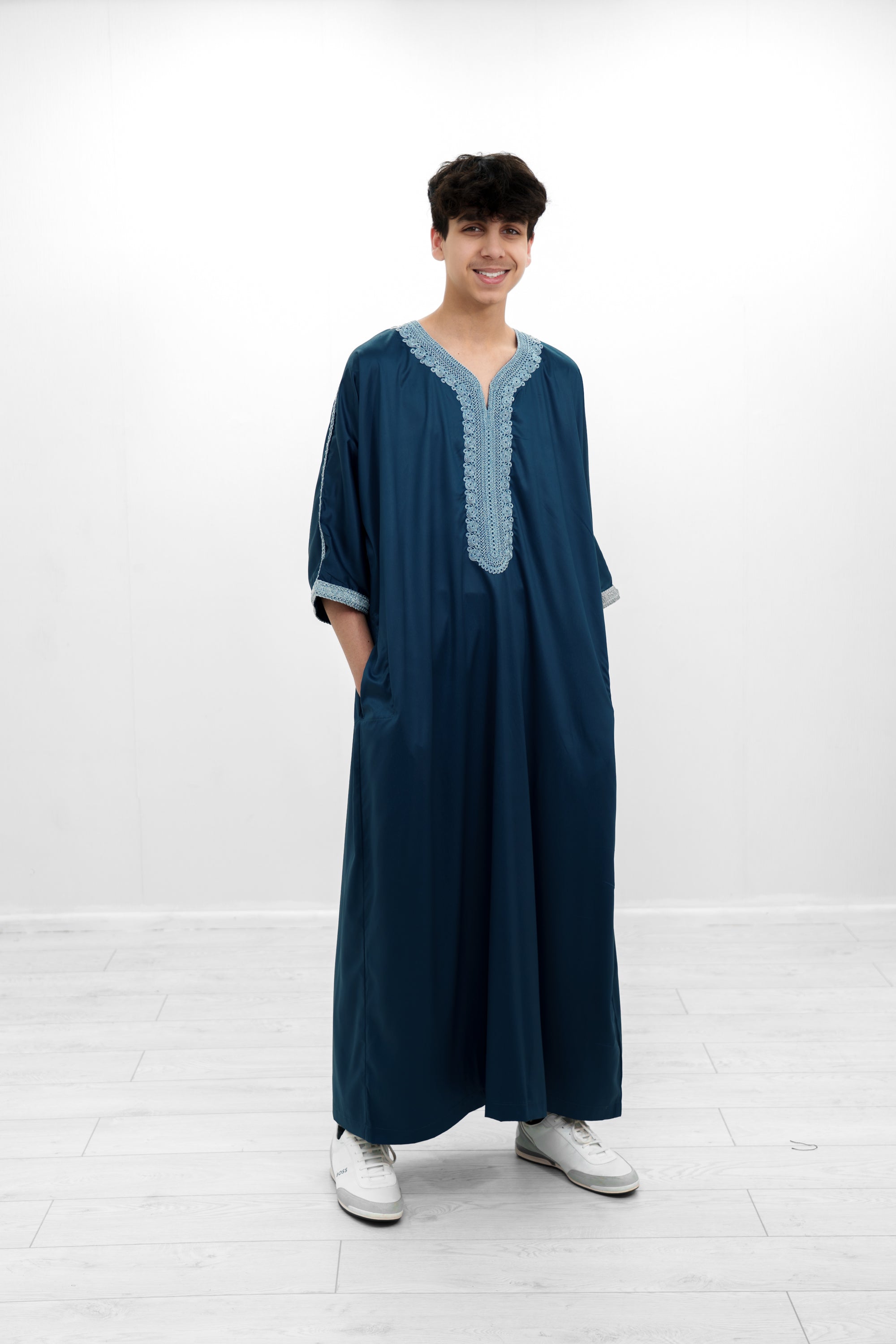 Navy Moroccan Half Sleeve Embroidery Jubba with Pockets