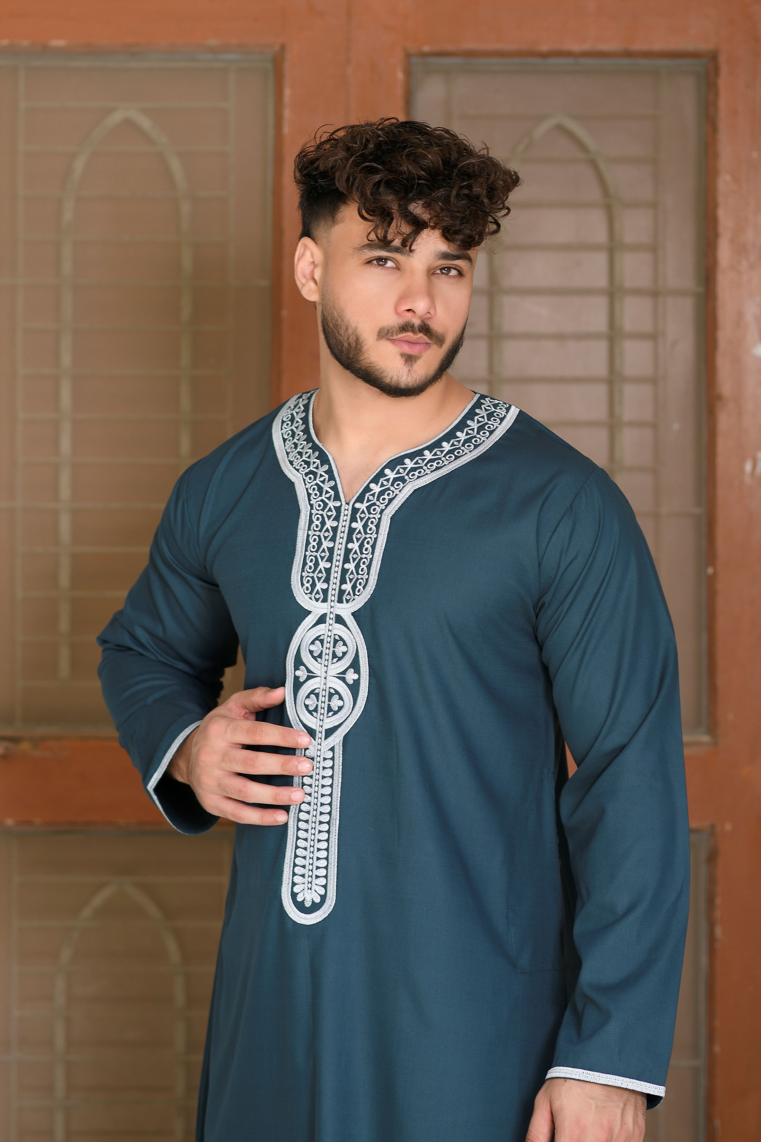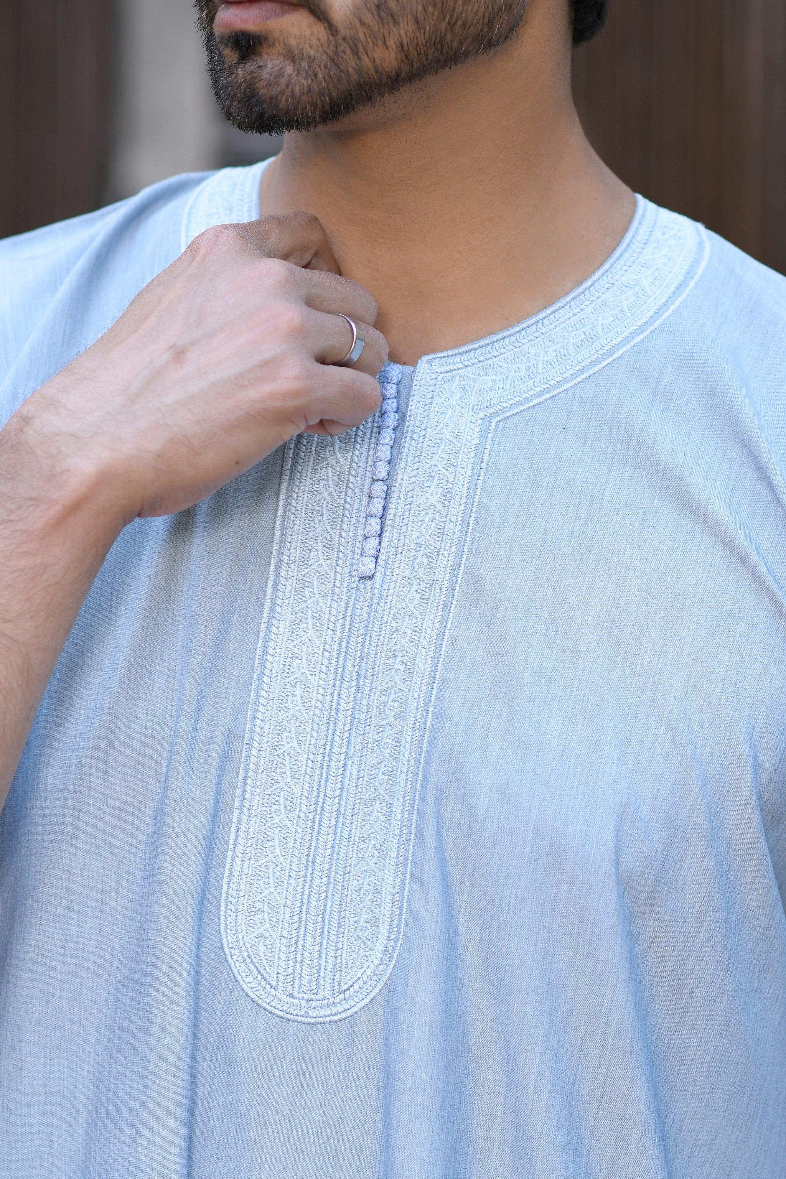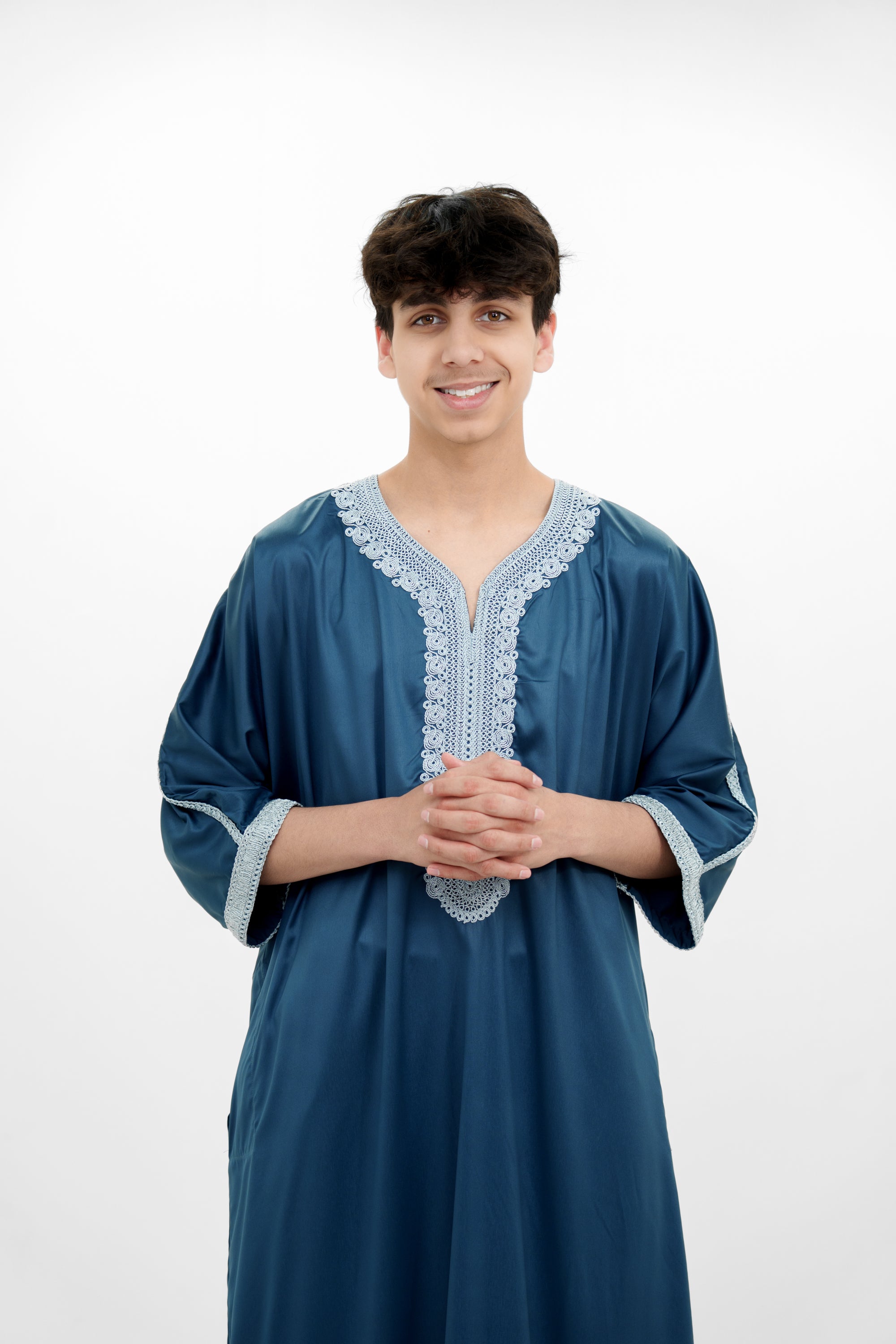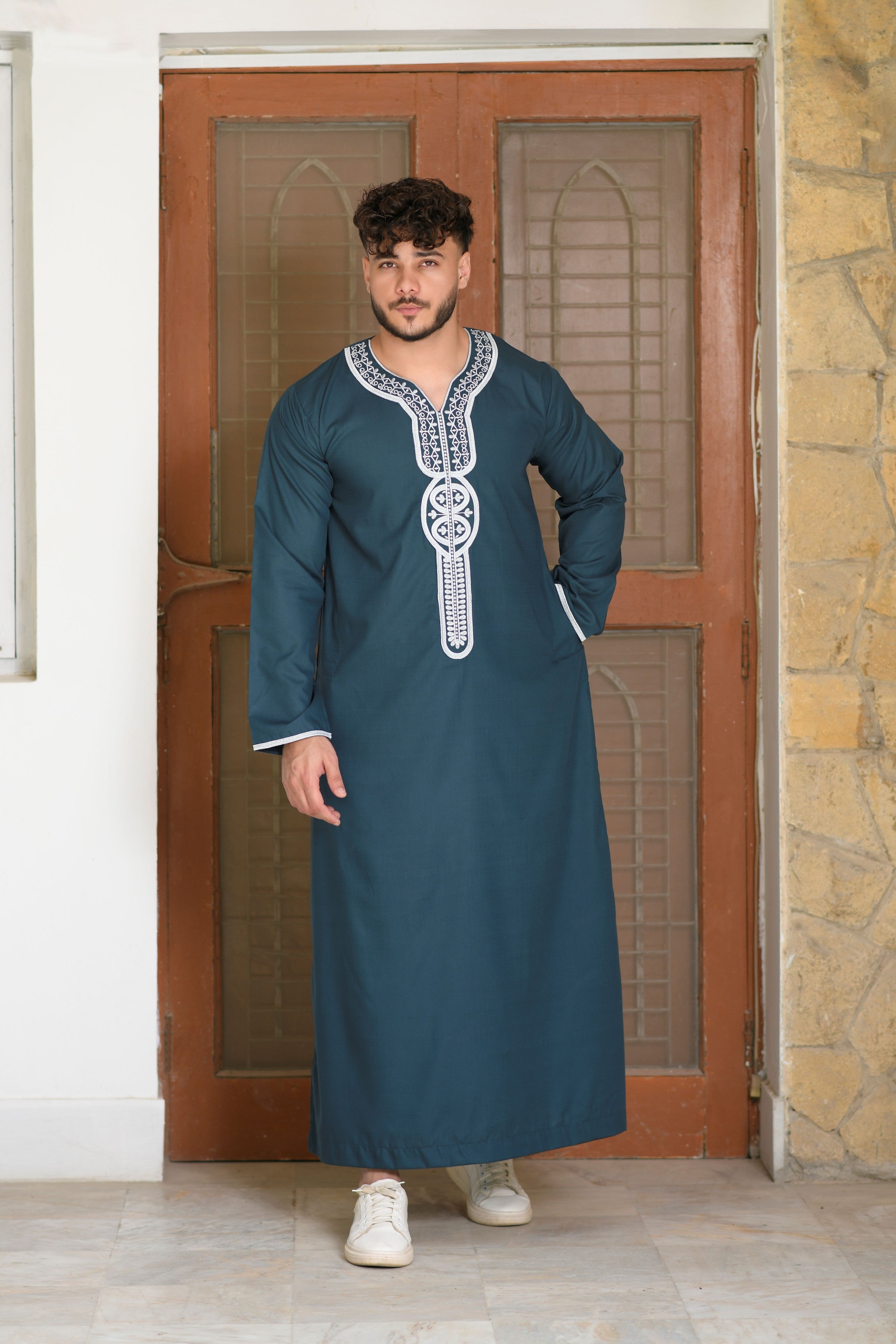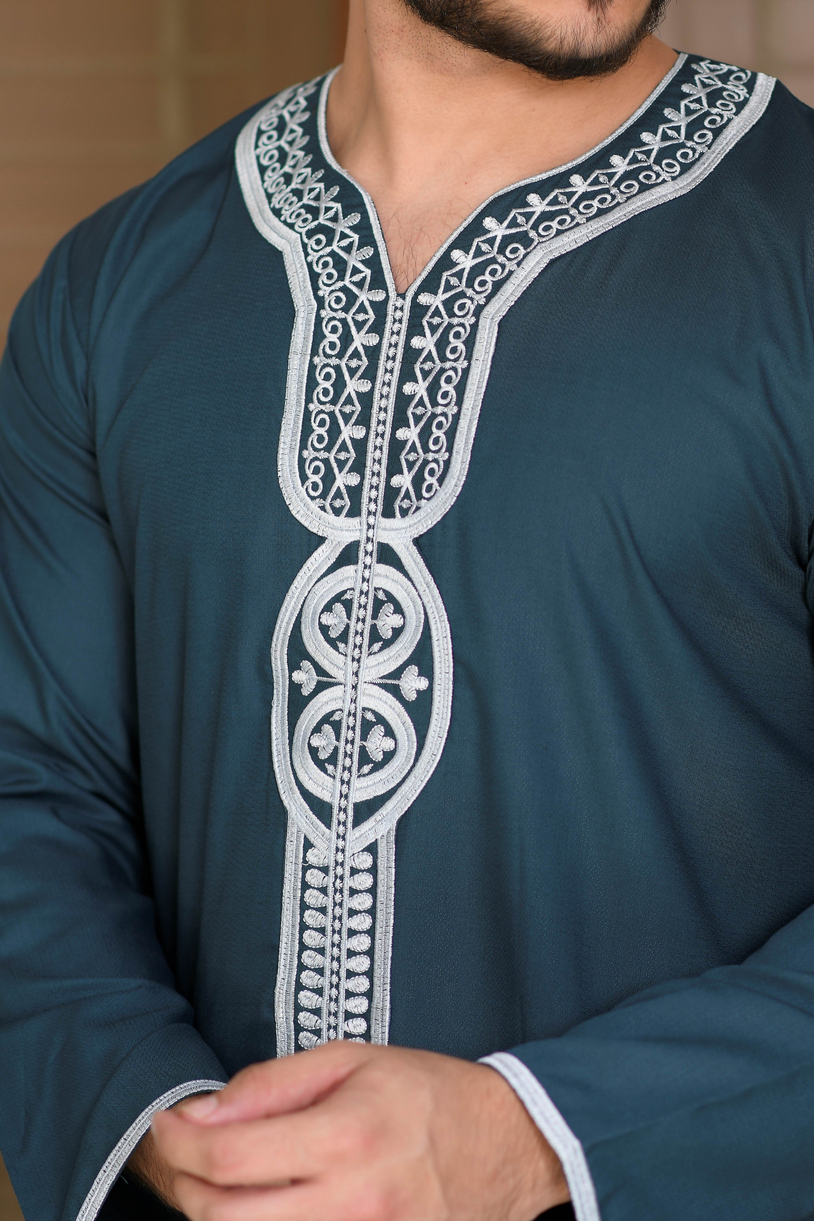 Navy Moroccan Half Sleeve Embroidery Jubba with Pockets