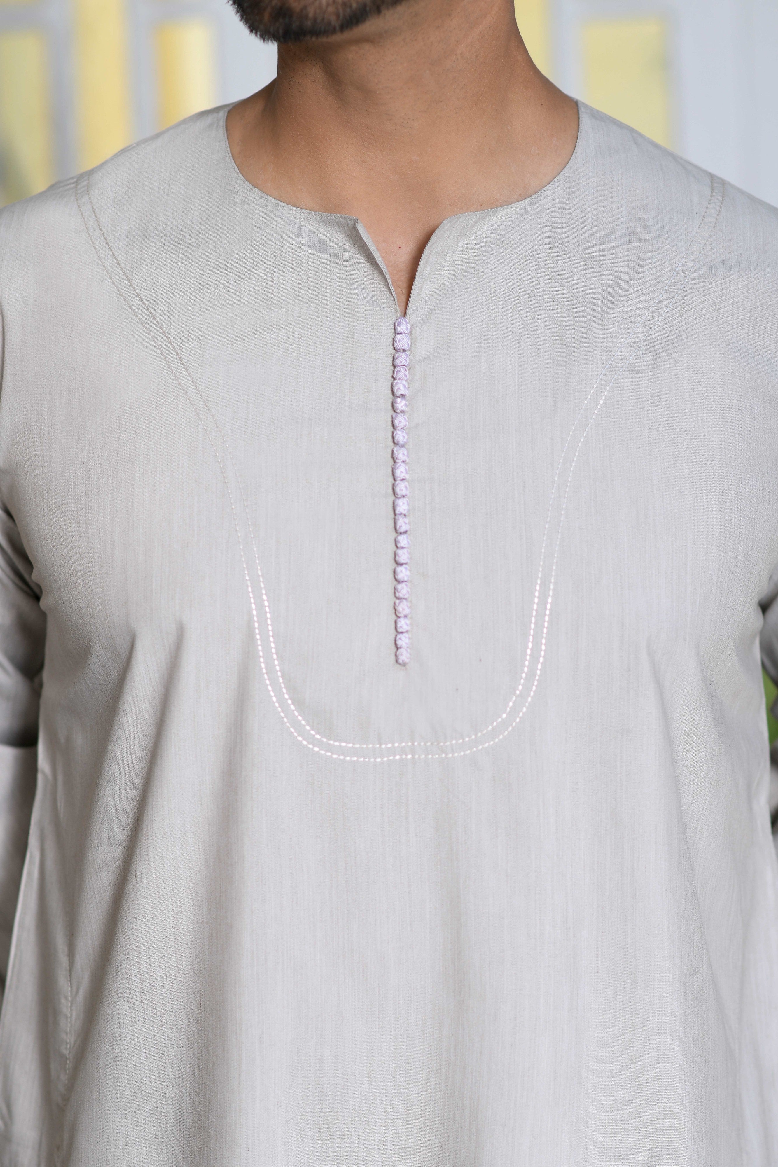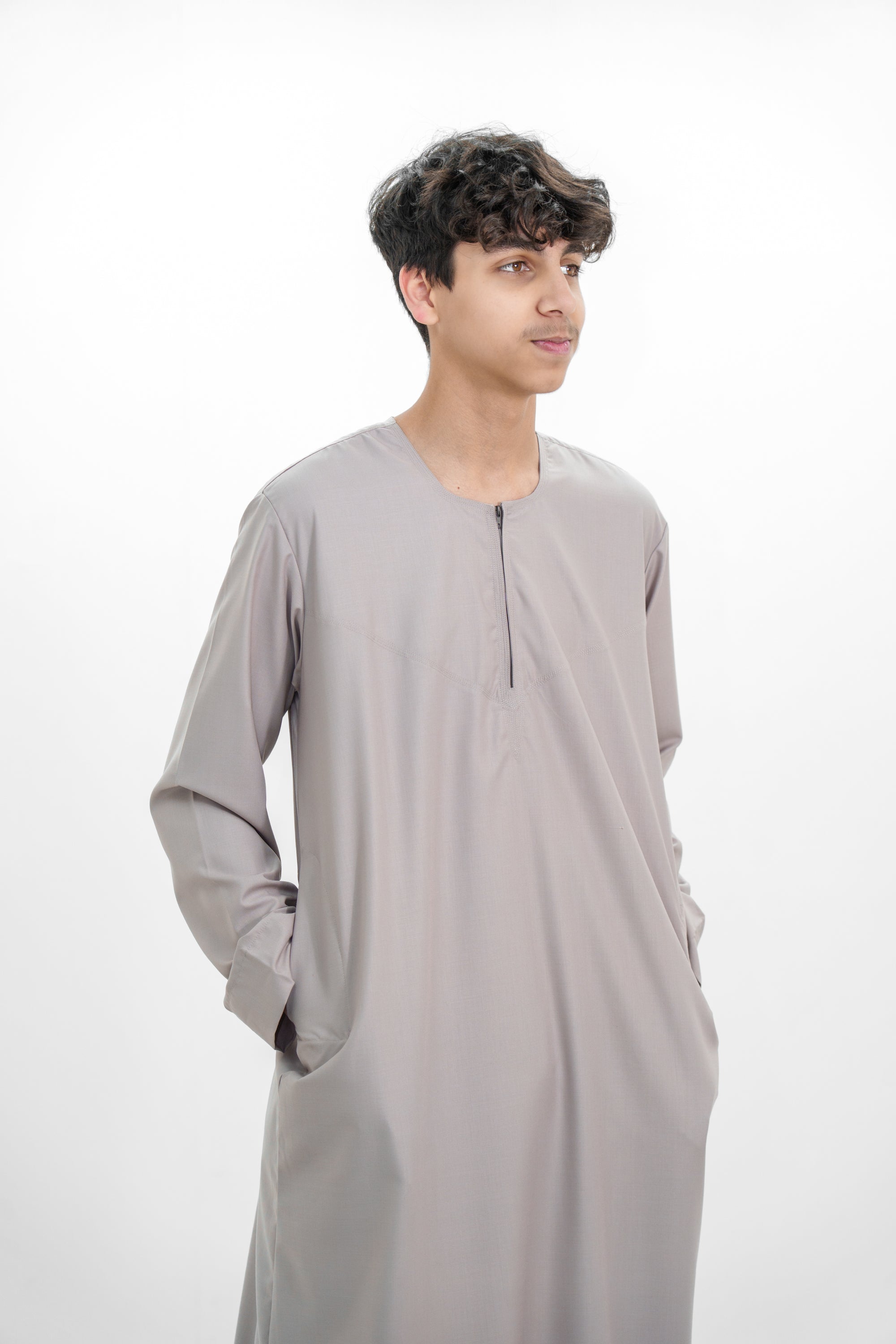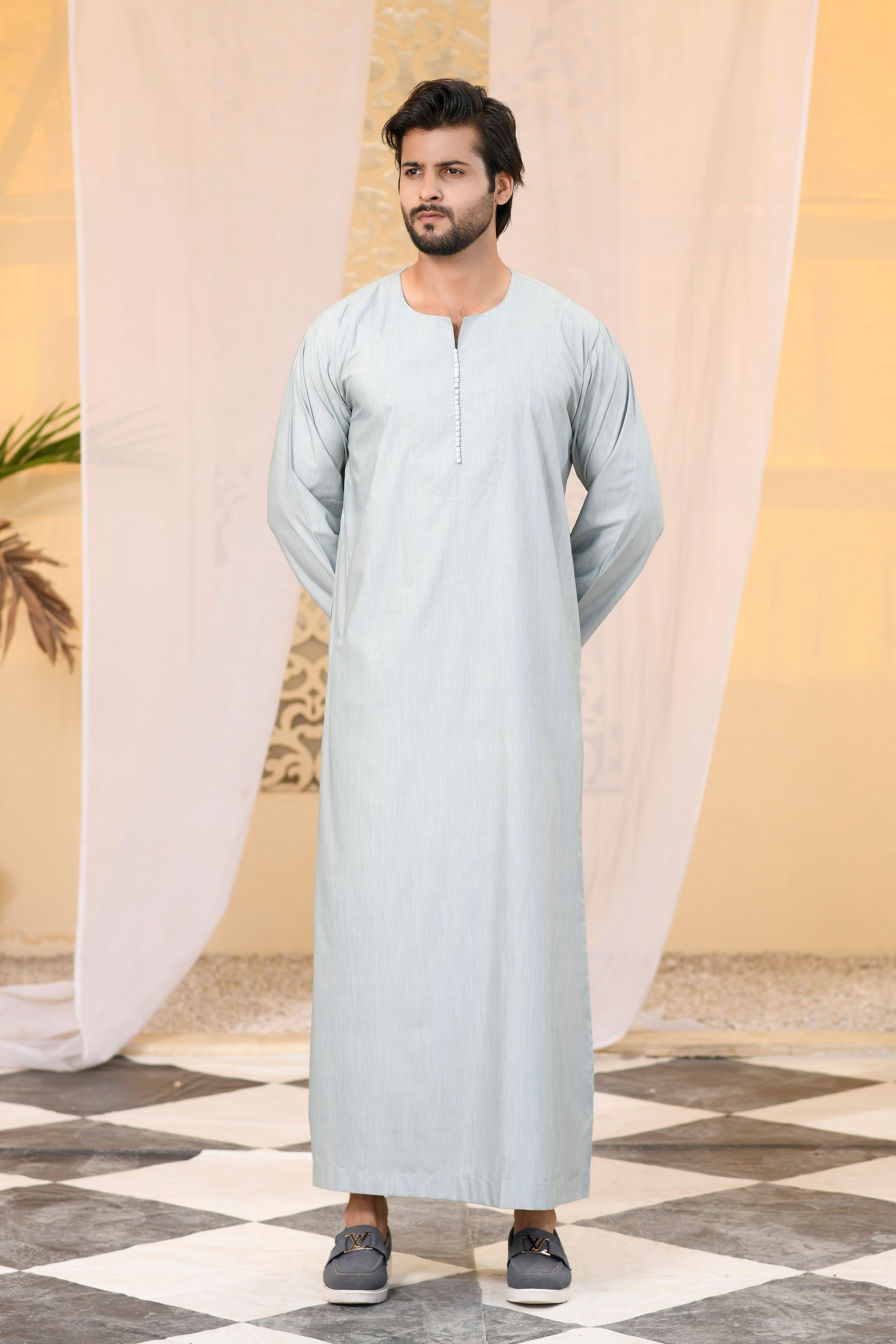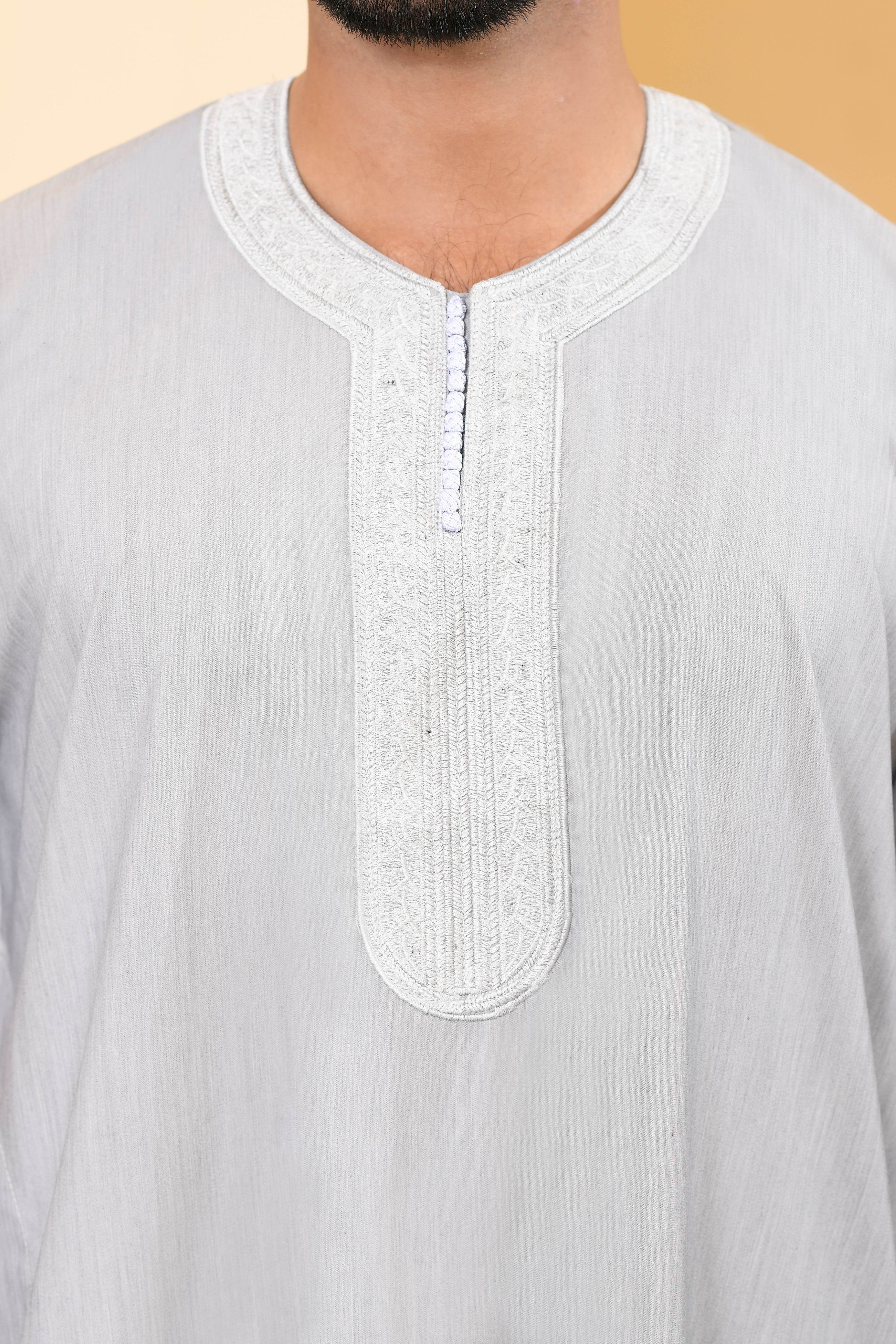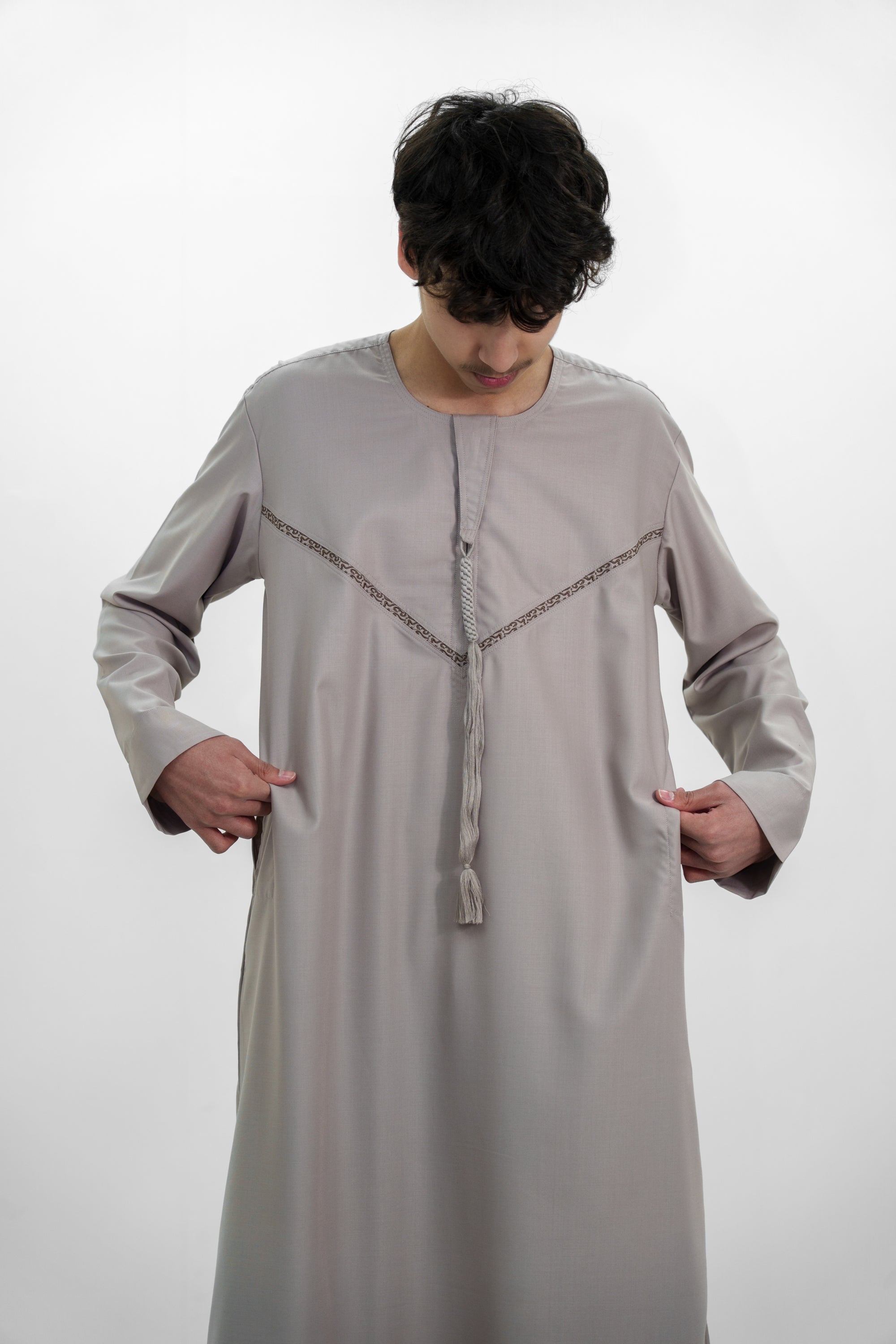 Grey Omani Zip Neck with V Neck Embroidery Design Jubba