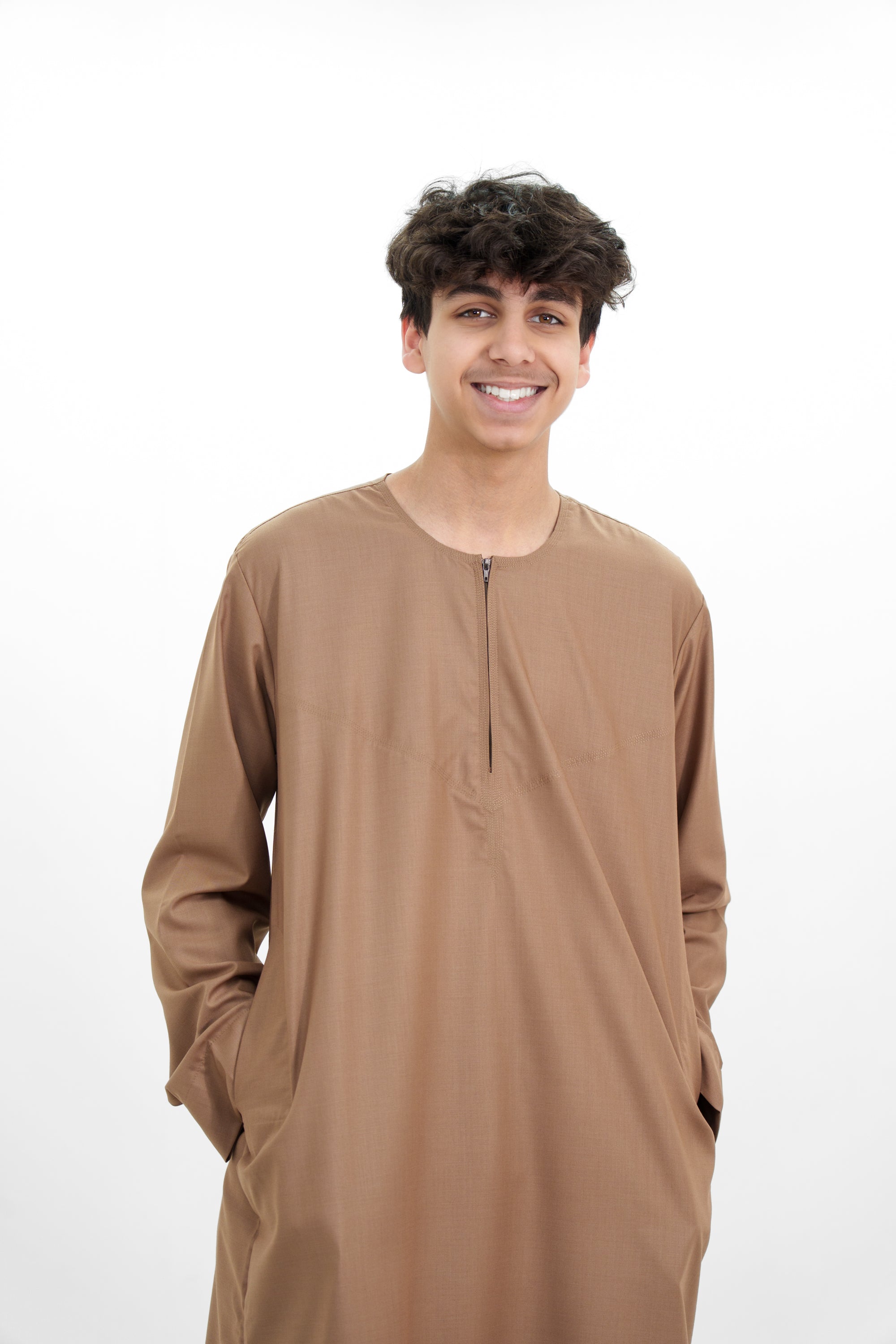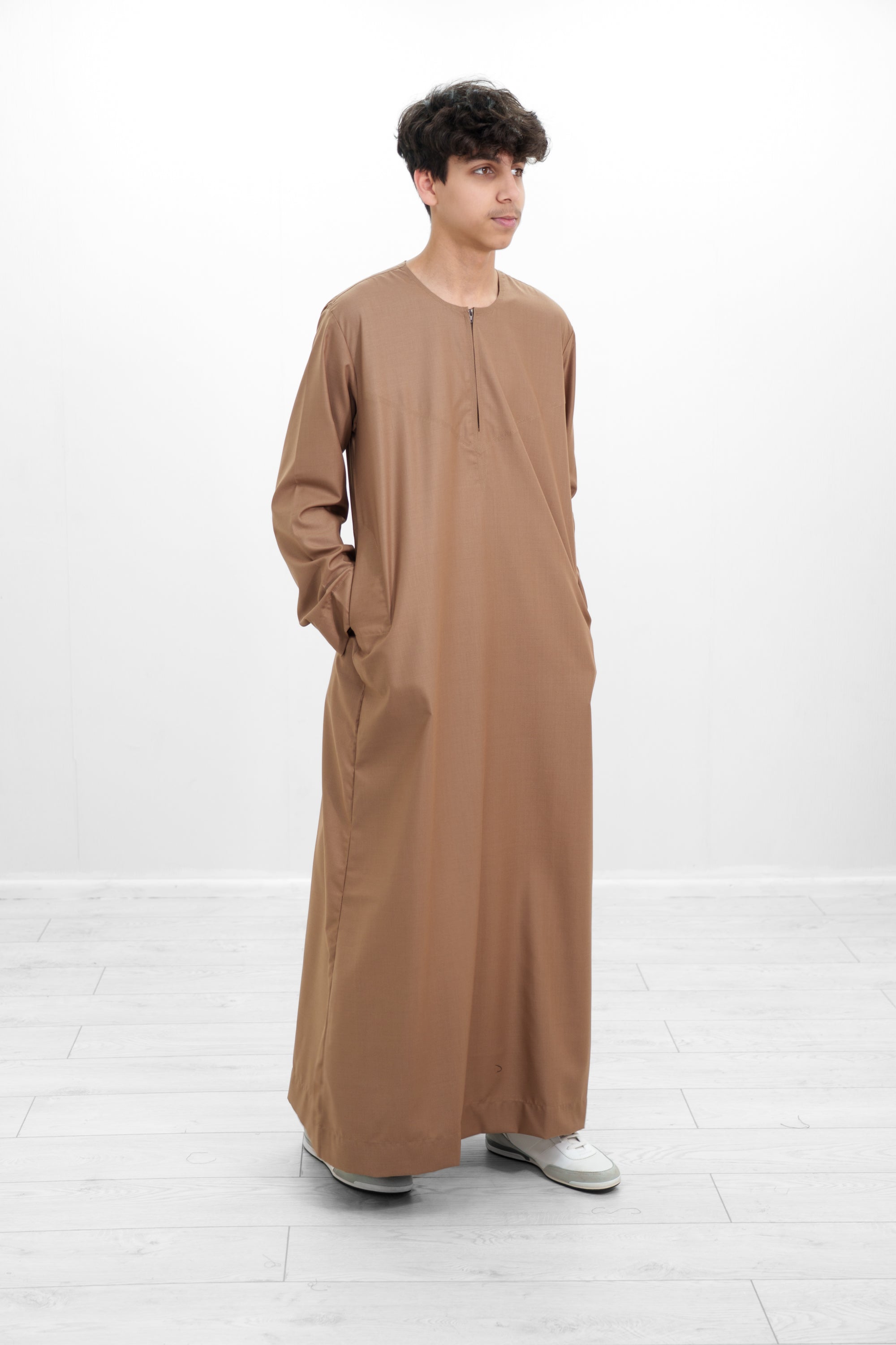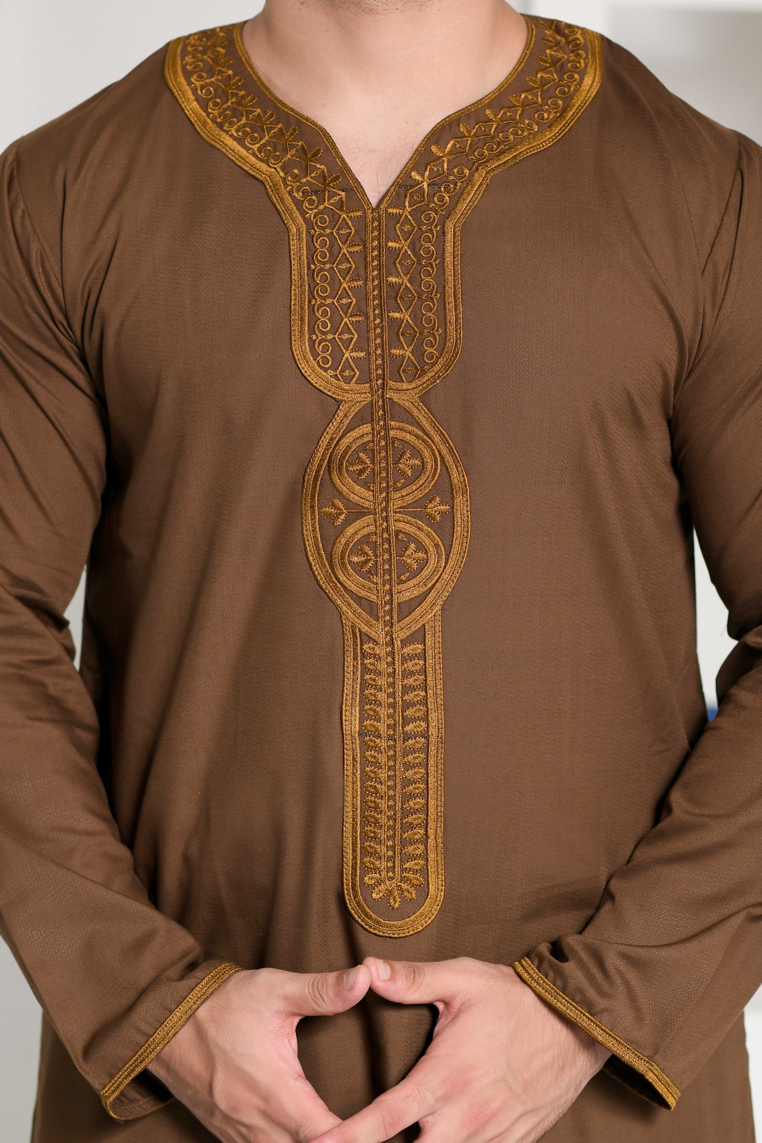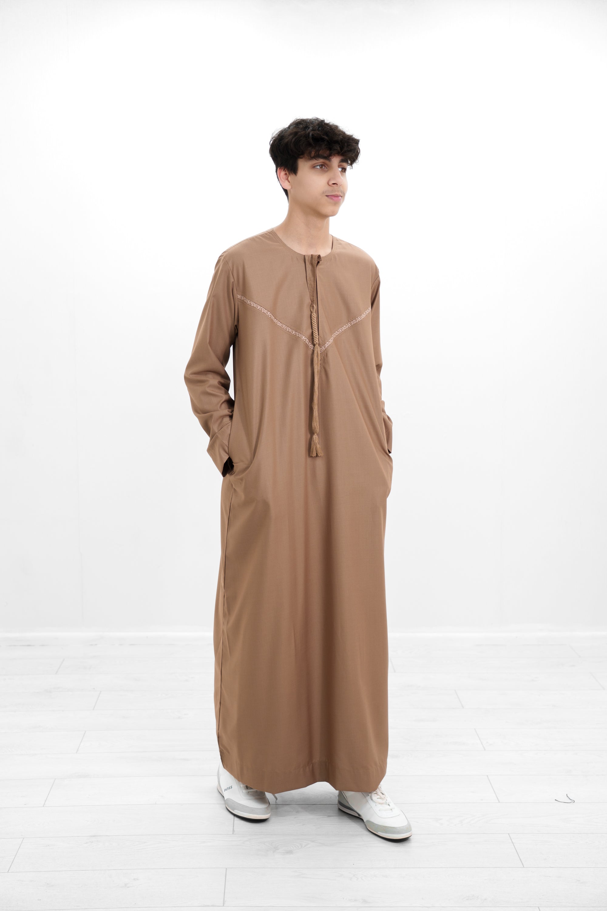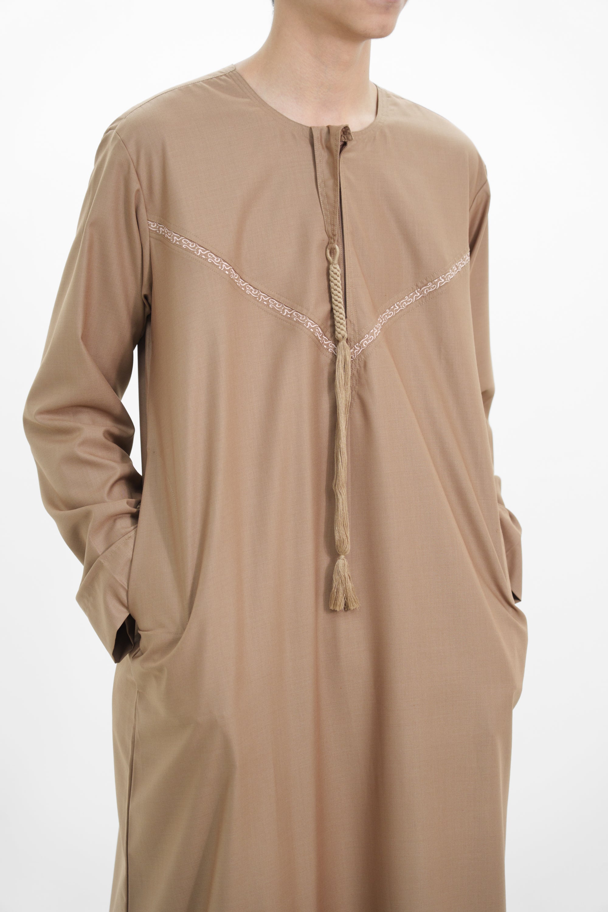 Tan Omani Shiny Zip Neck with V Neck Embroidery Design Jubba