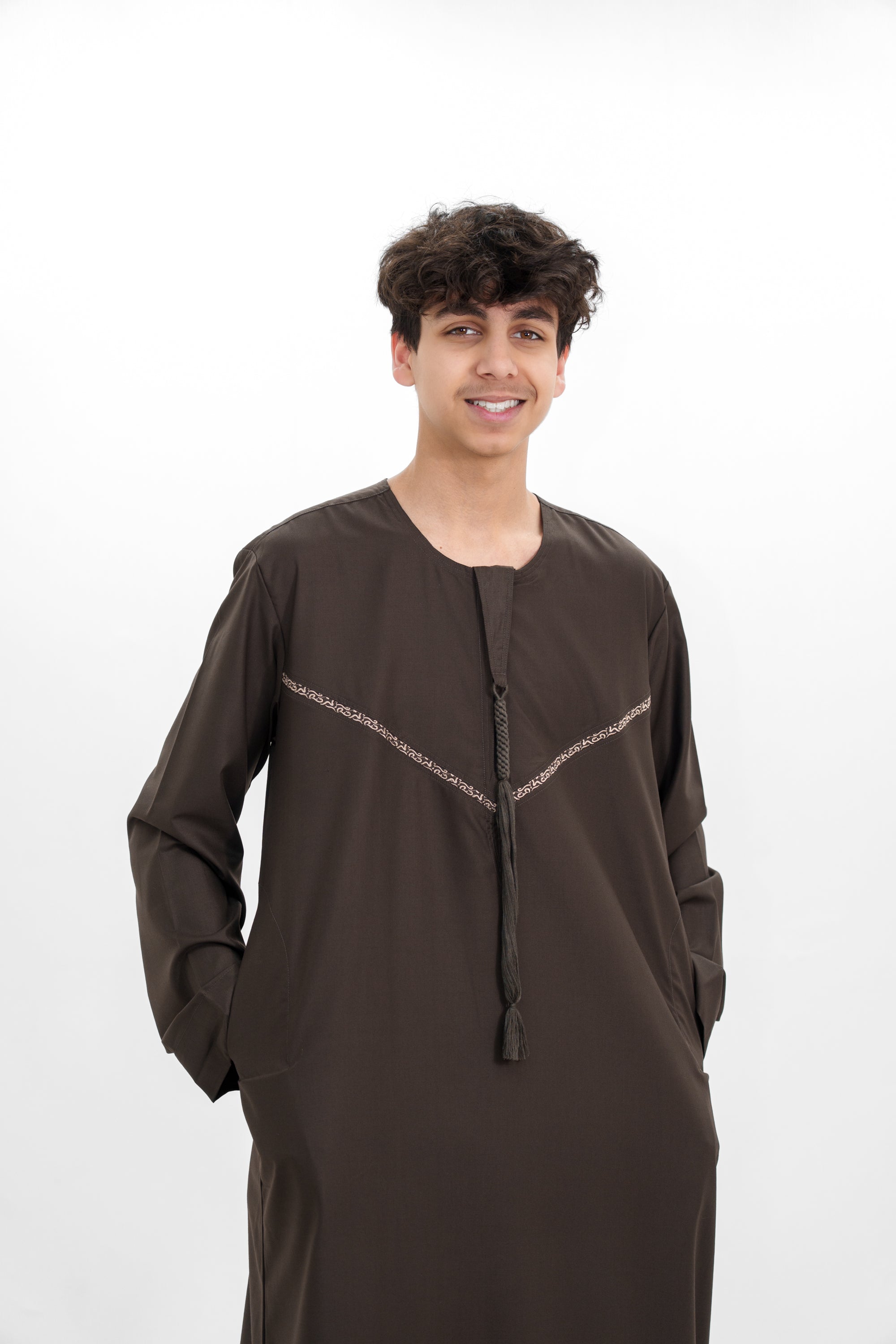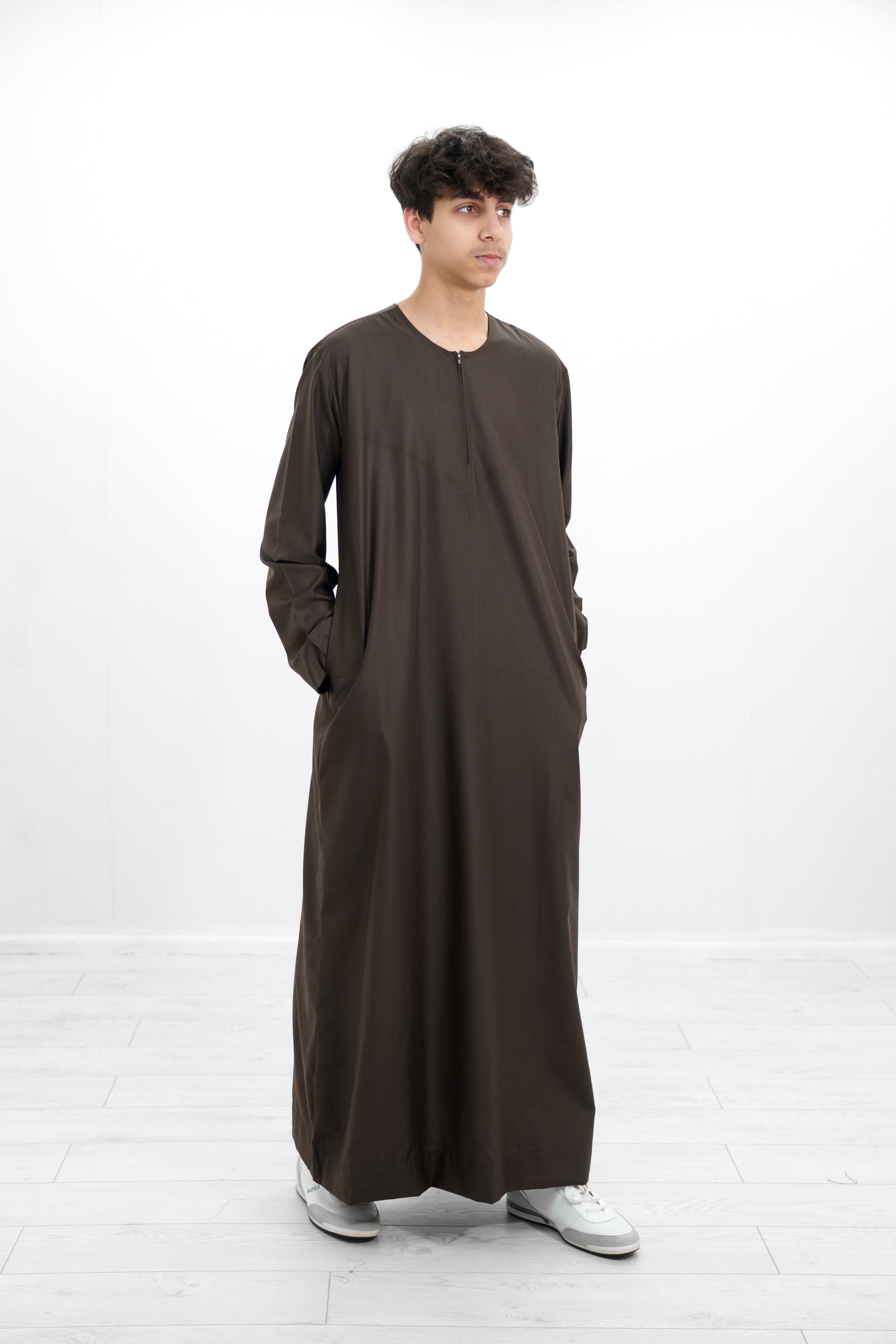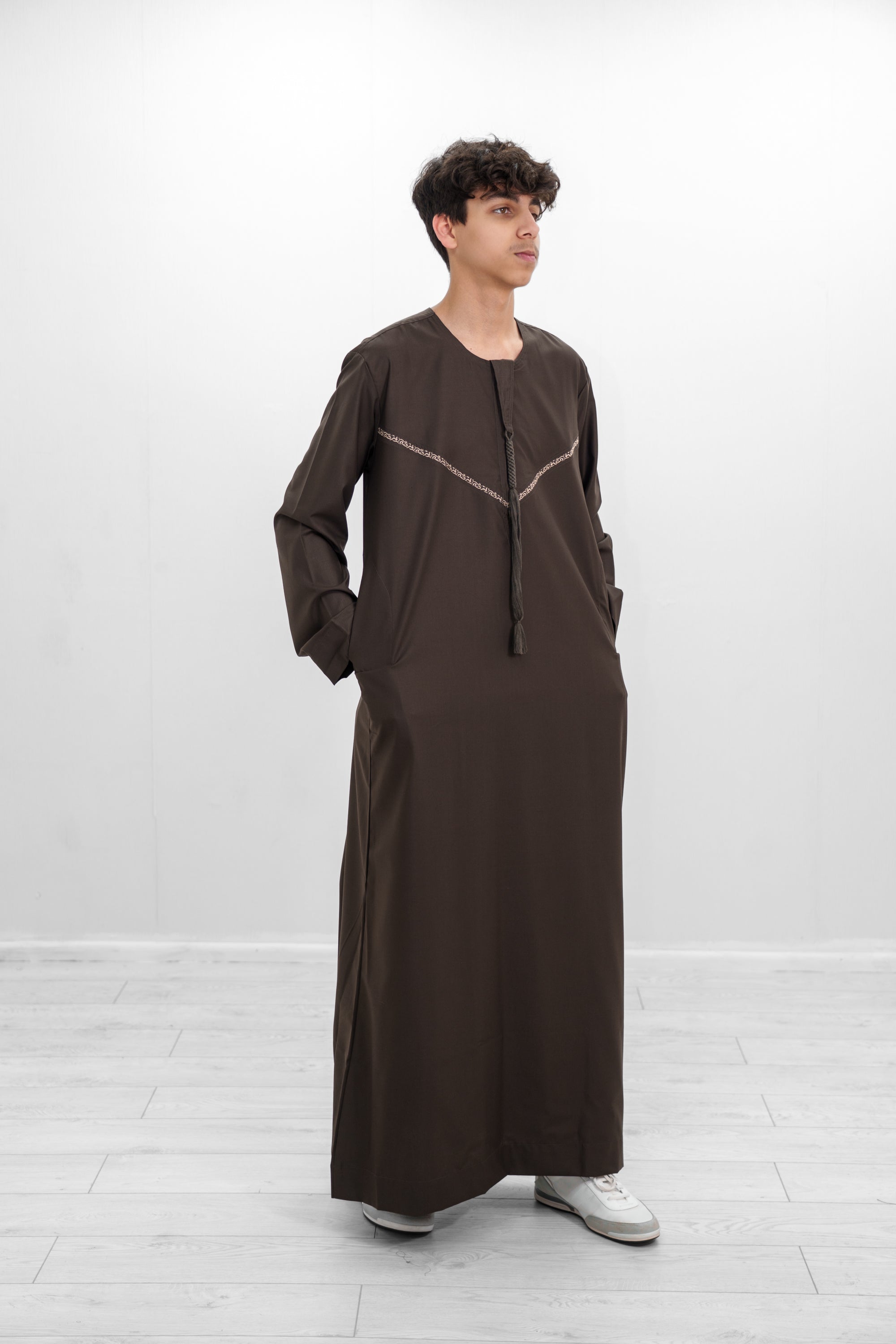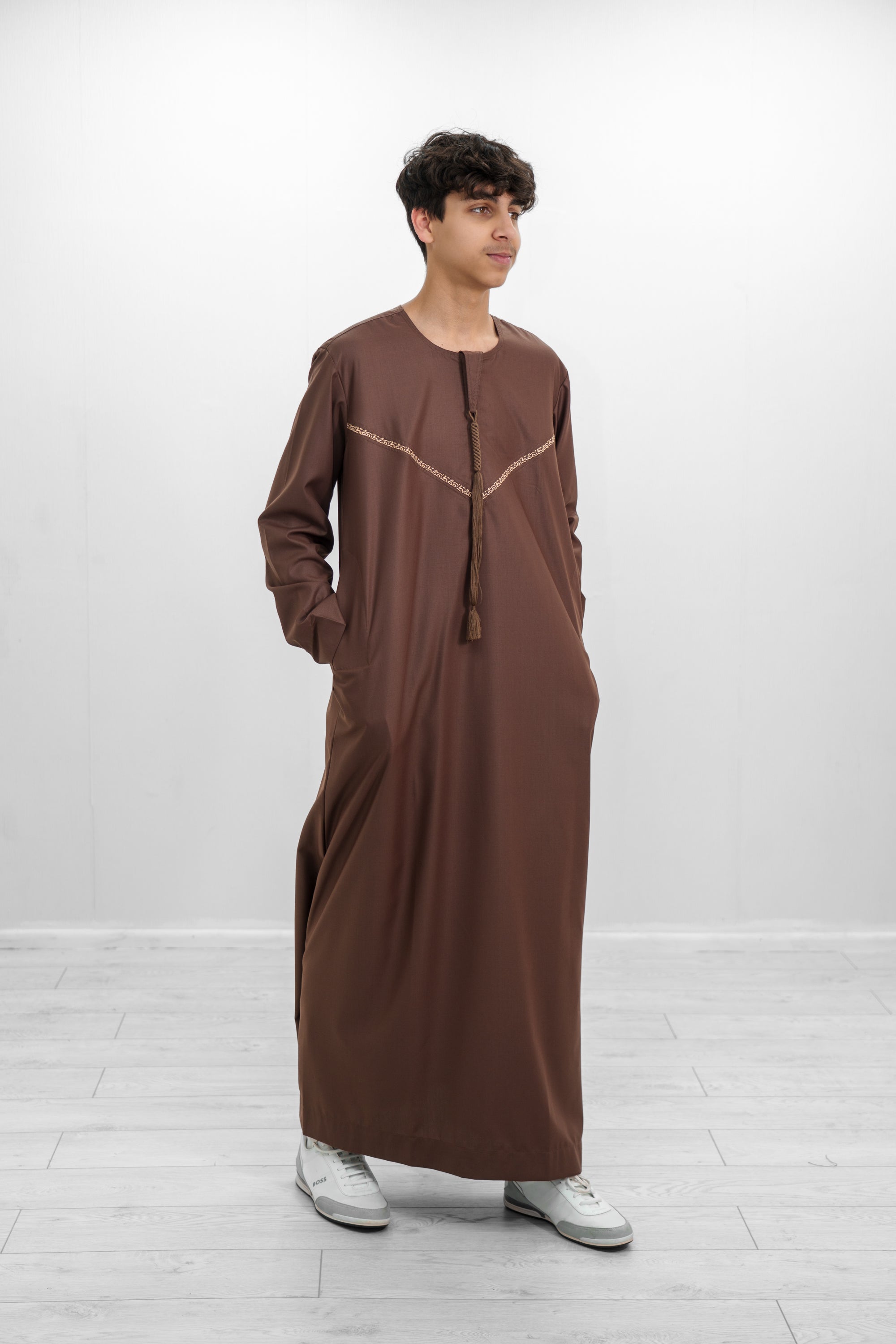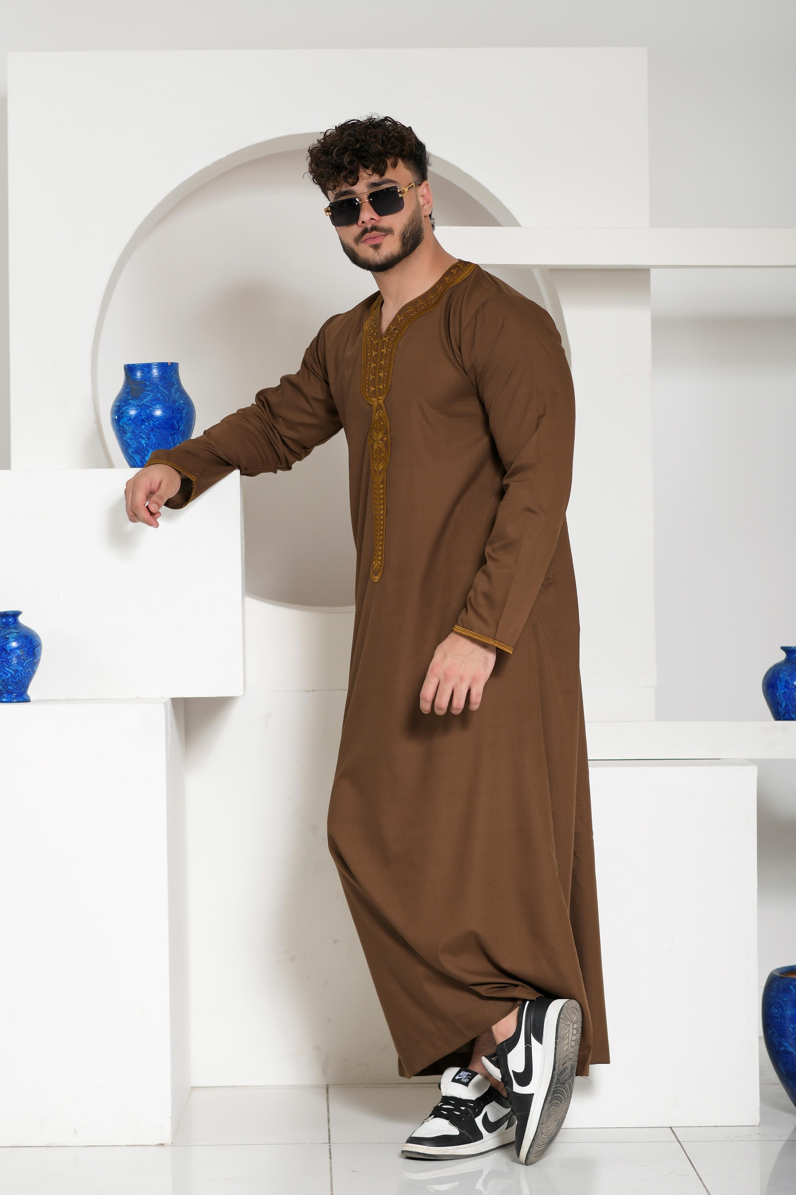 Tan Omani Shiny Zip Neck with V Neck Embroidery Design Jubba