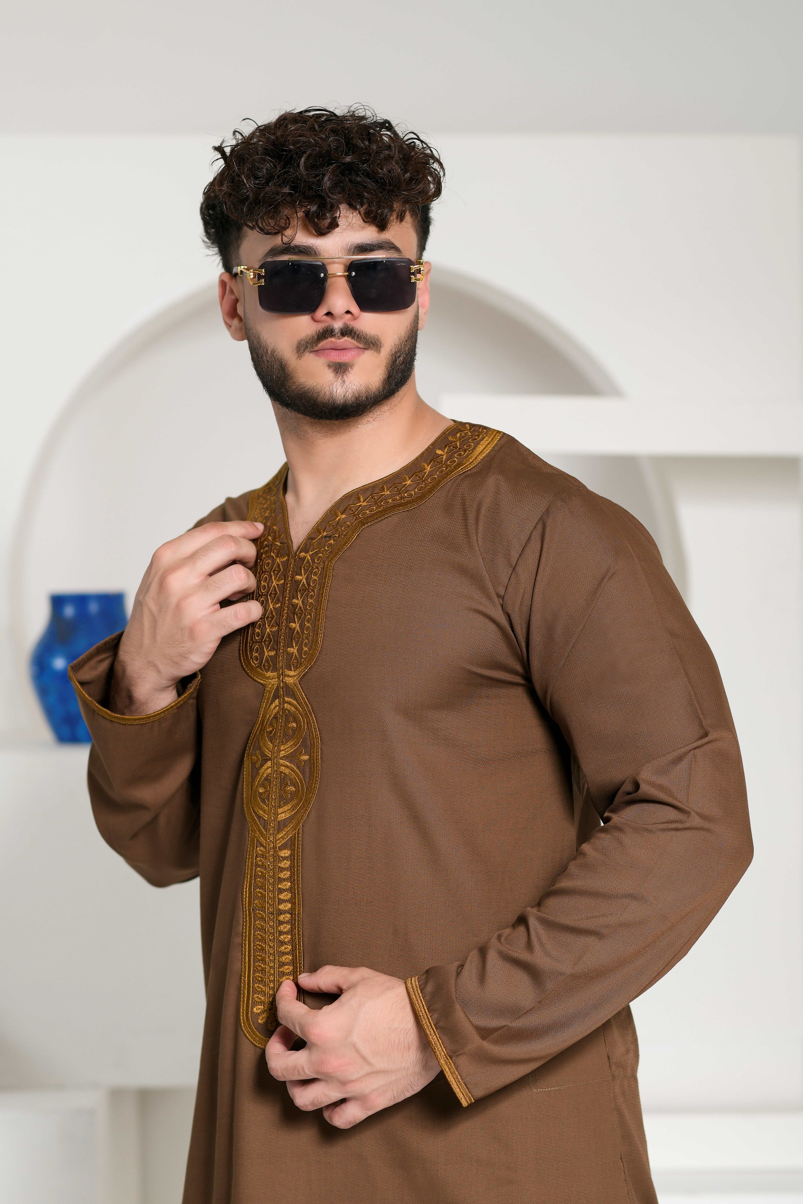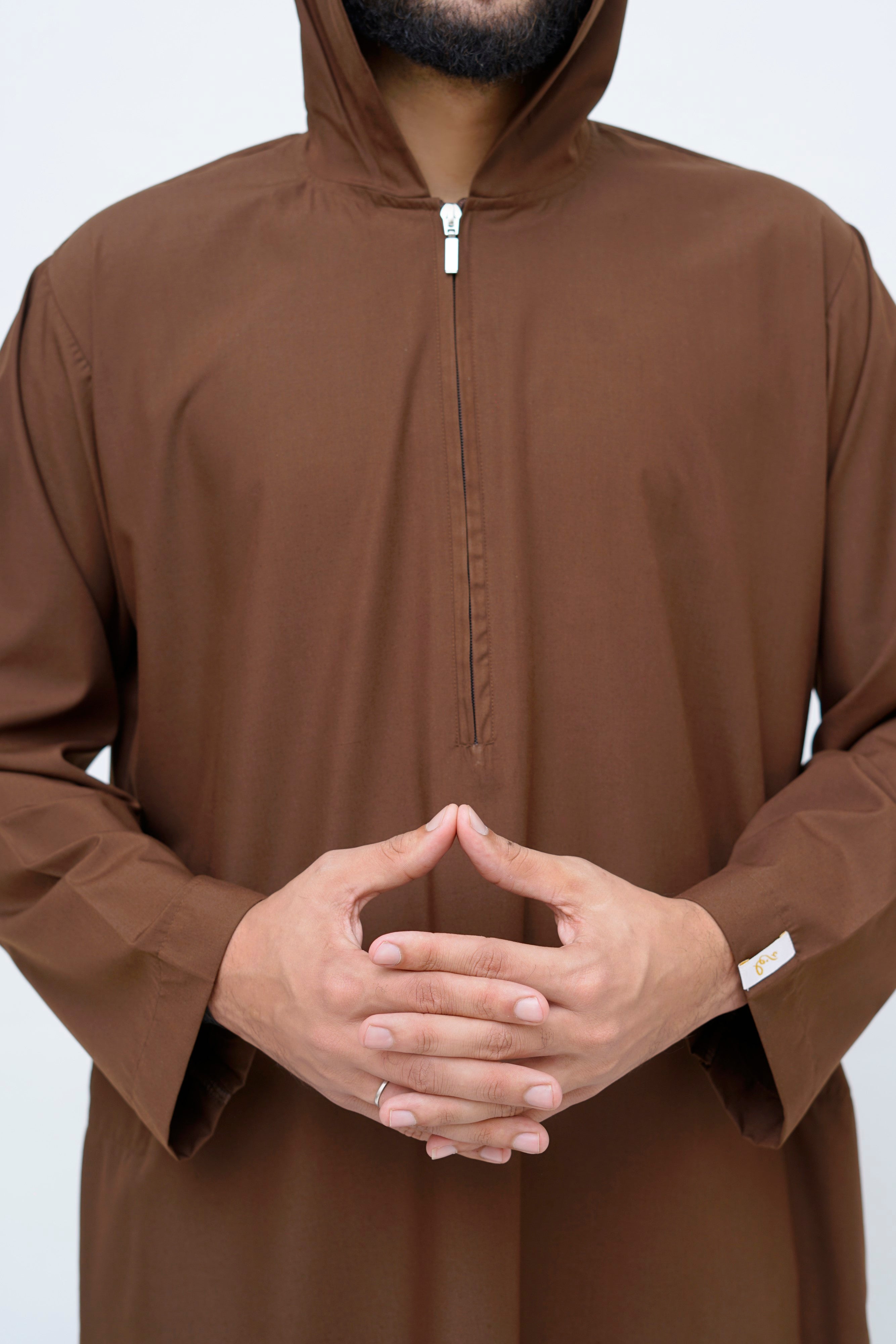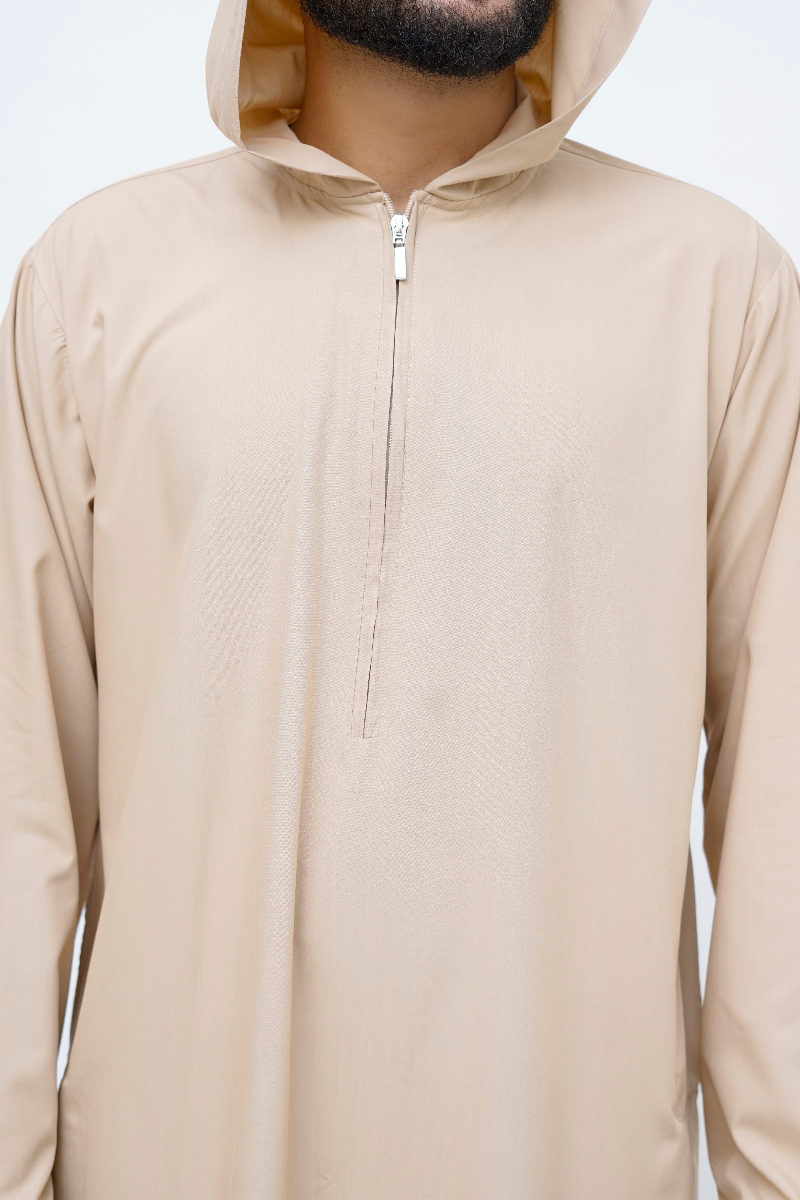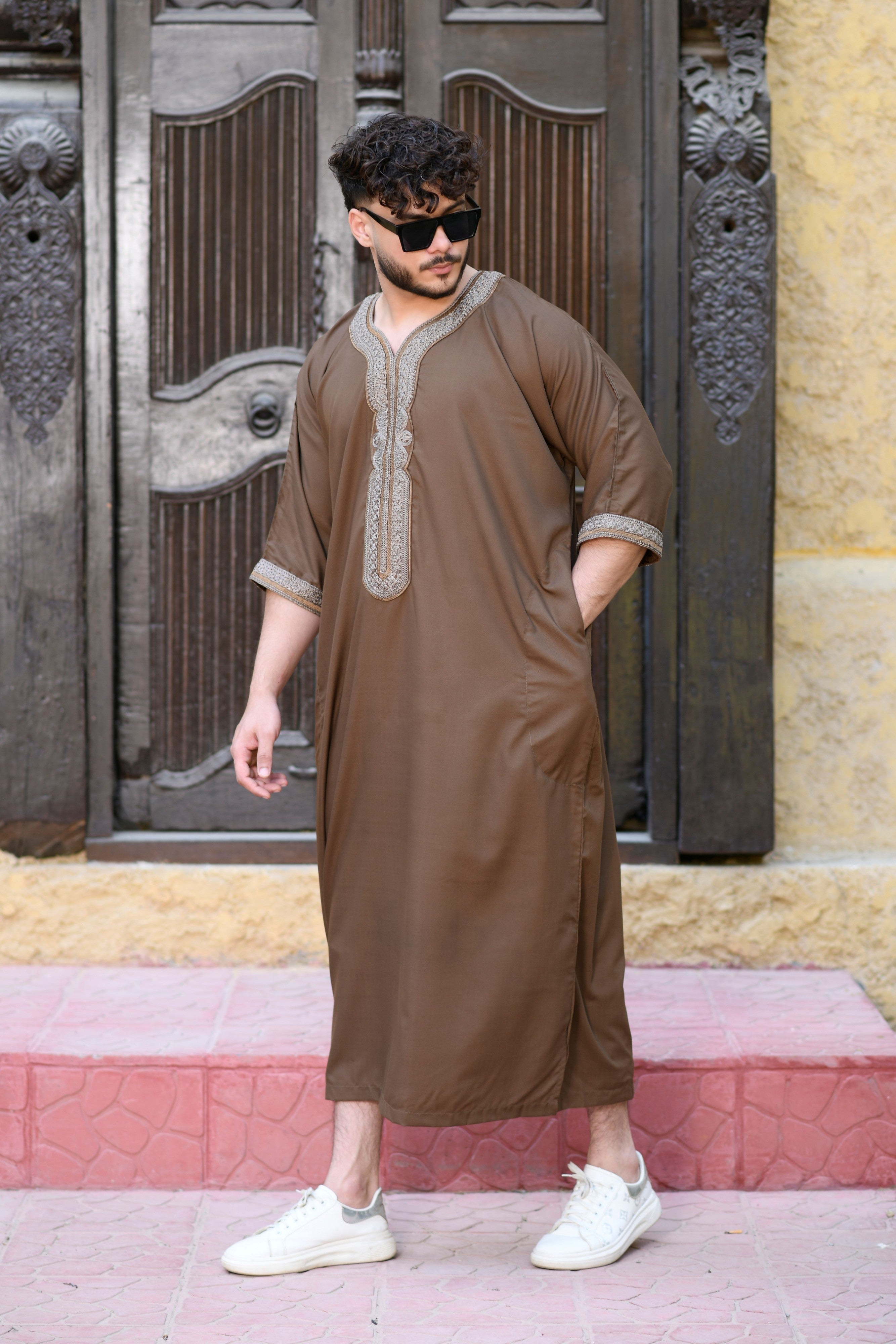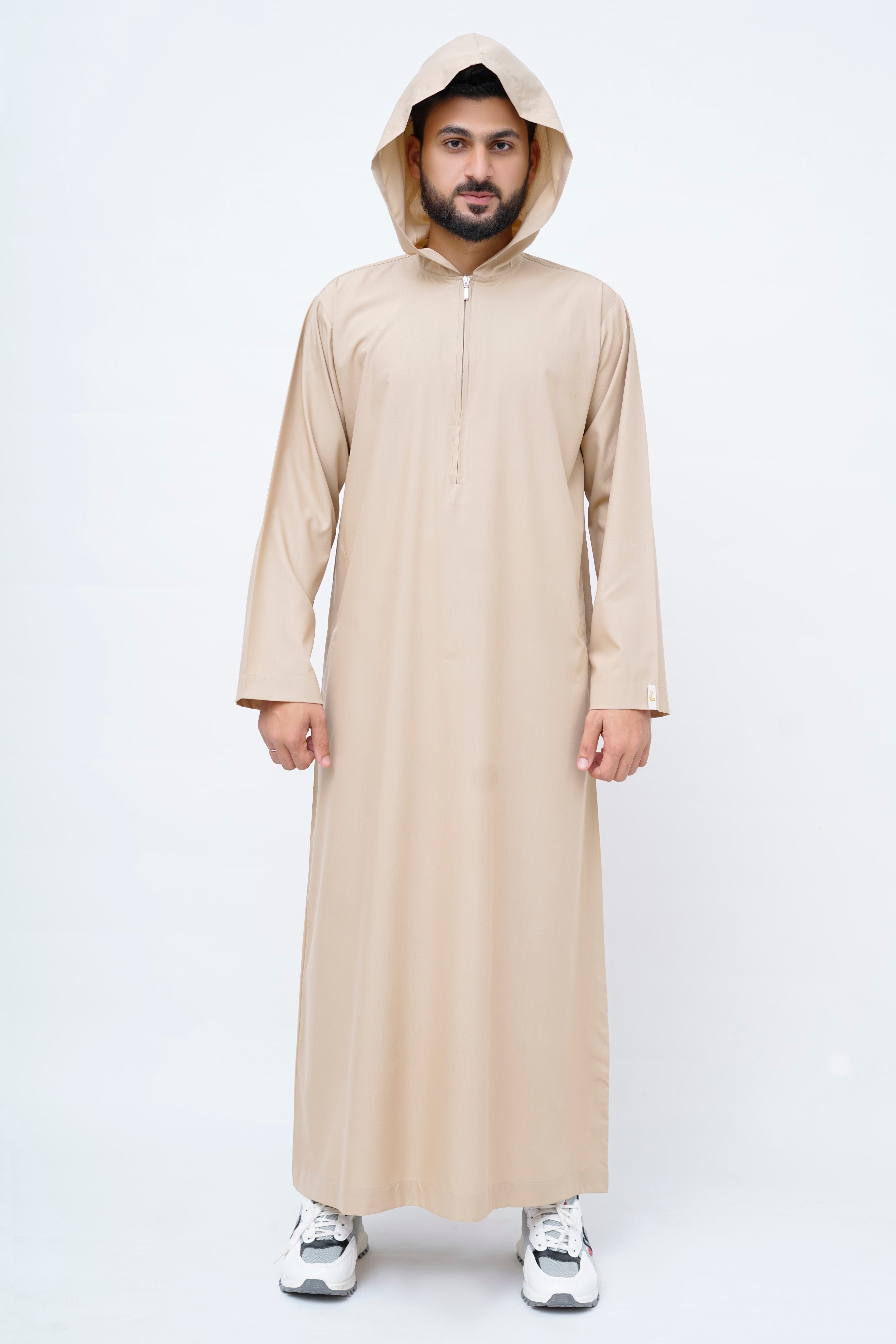 Tan Omani Shiny Zip Neck with V Neck Embroidery Design Jubba
