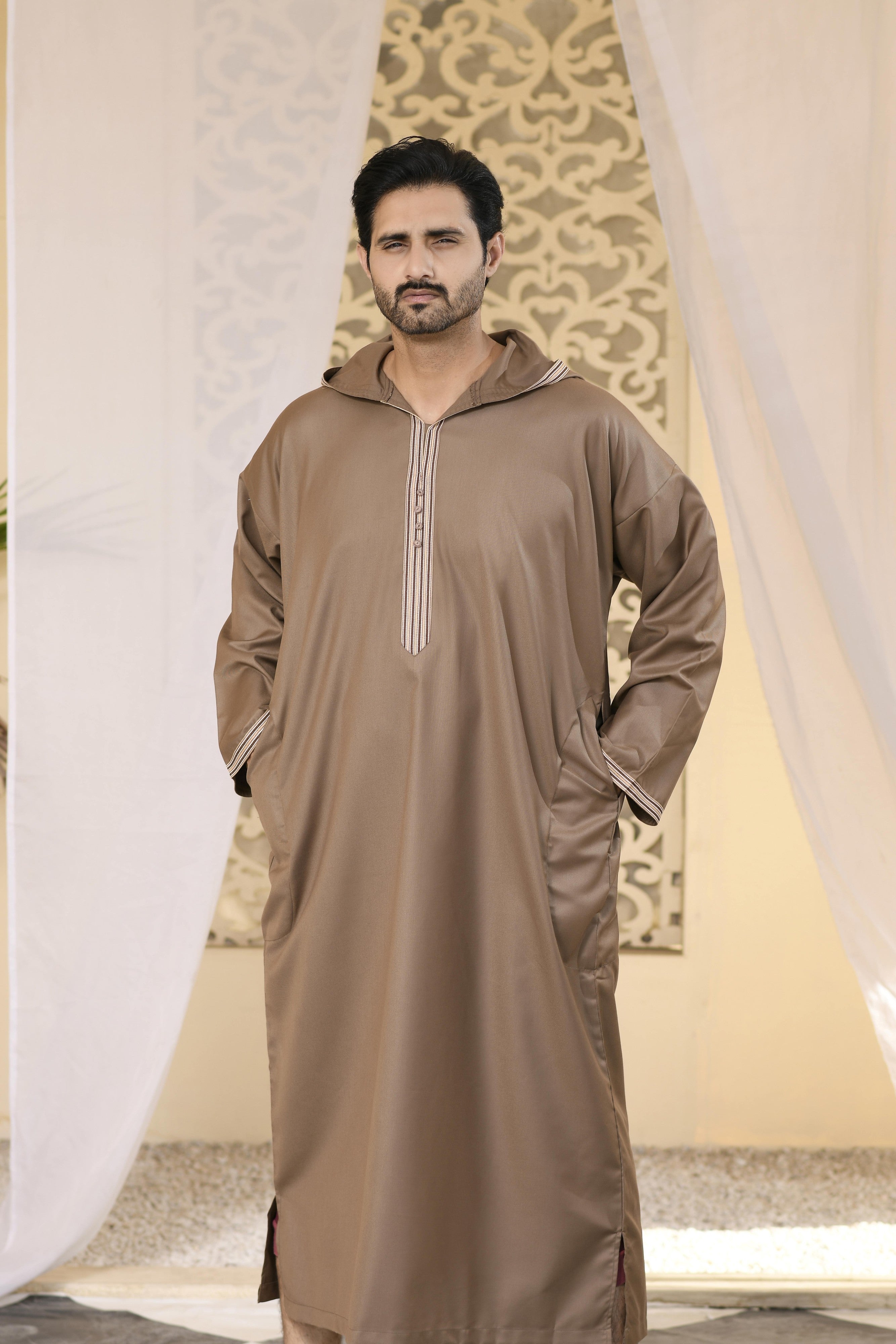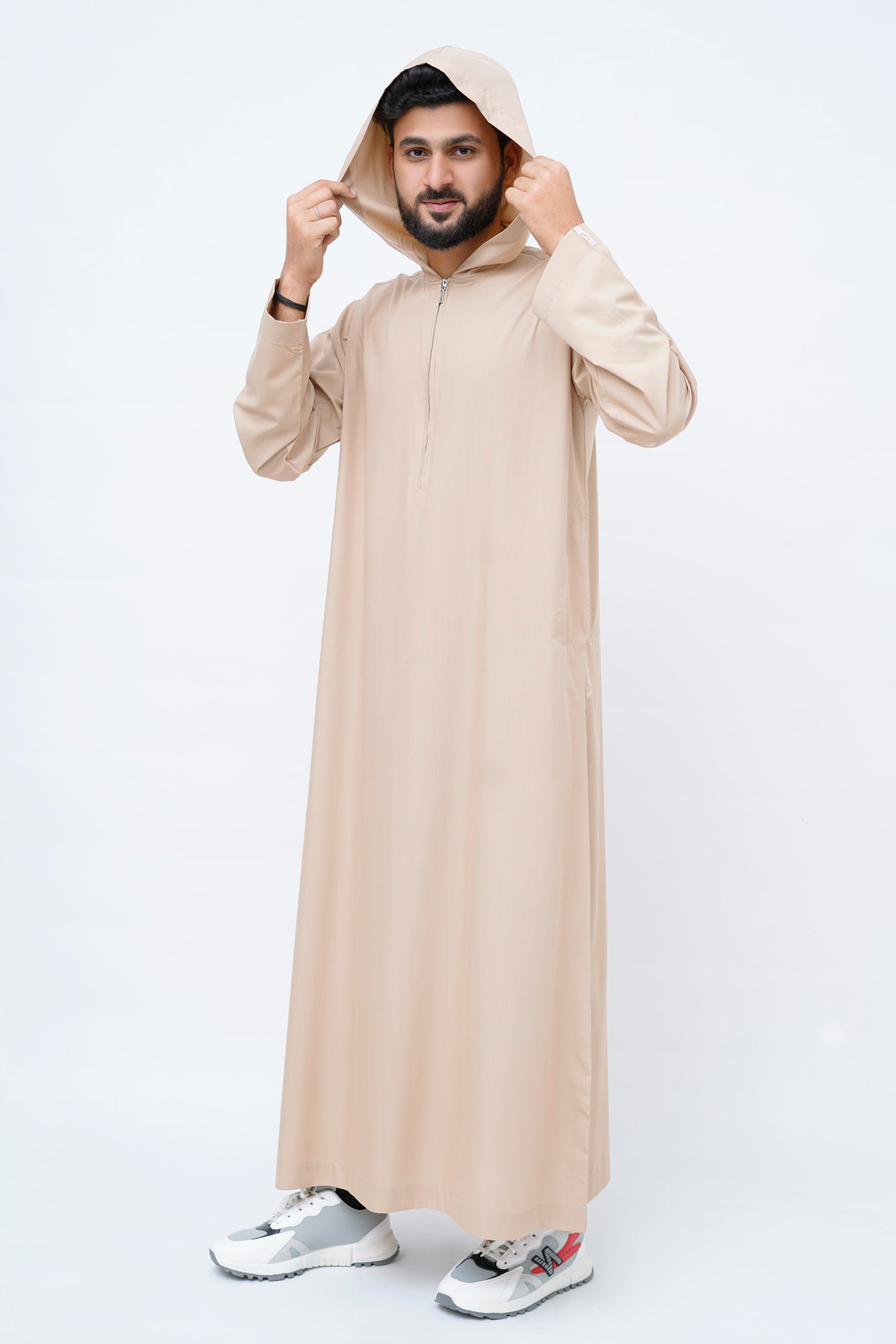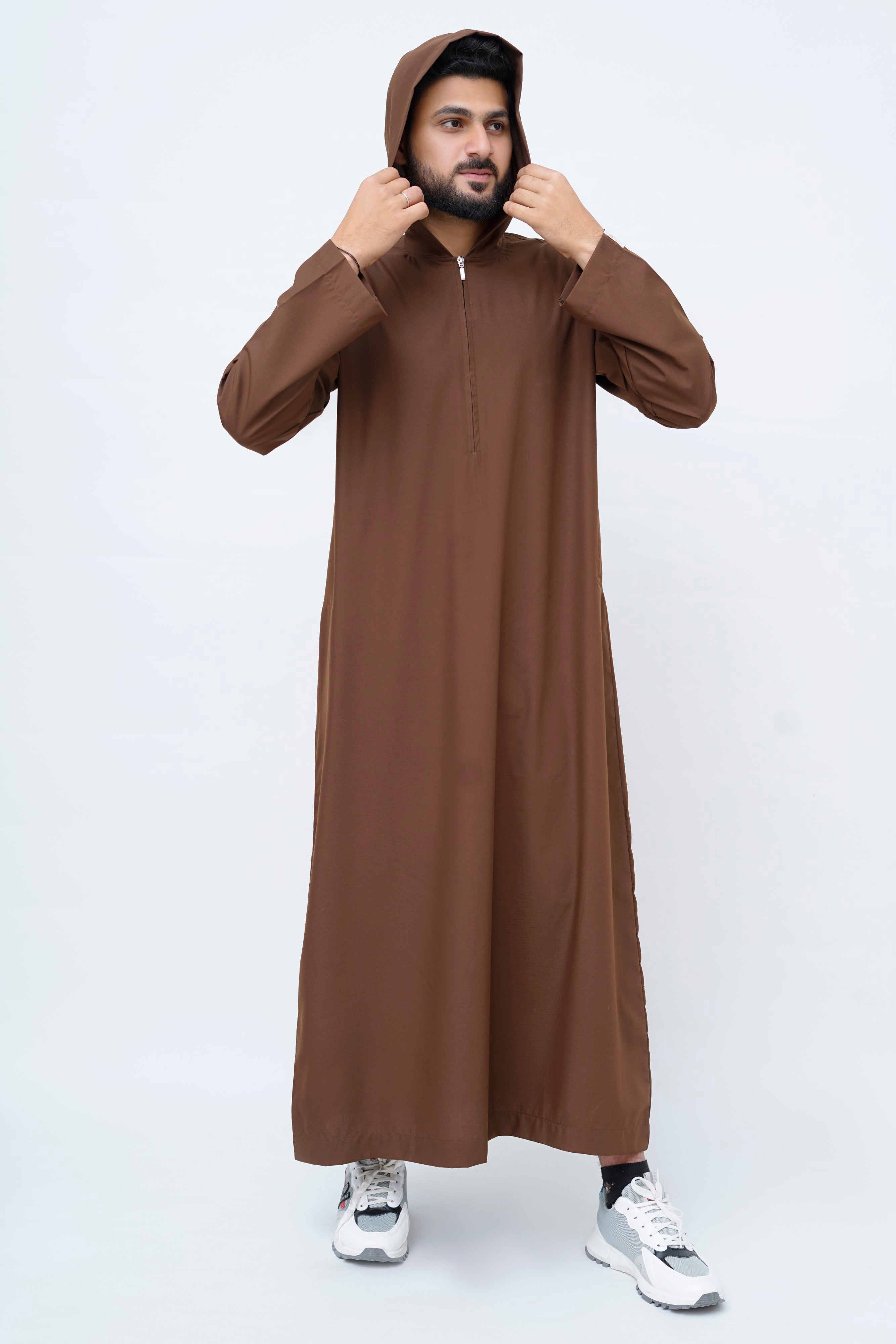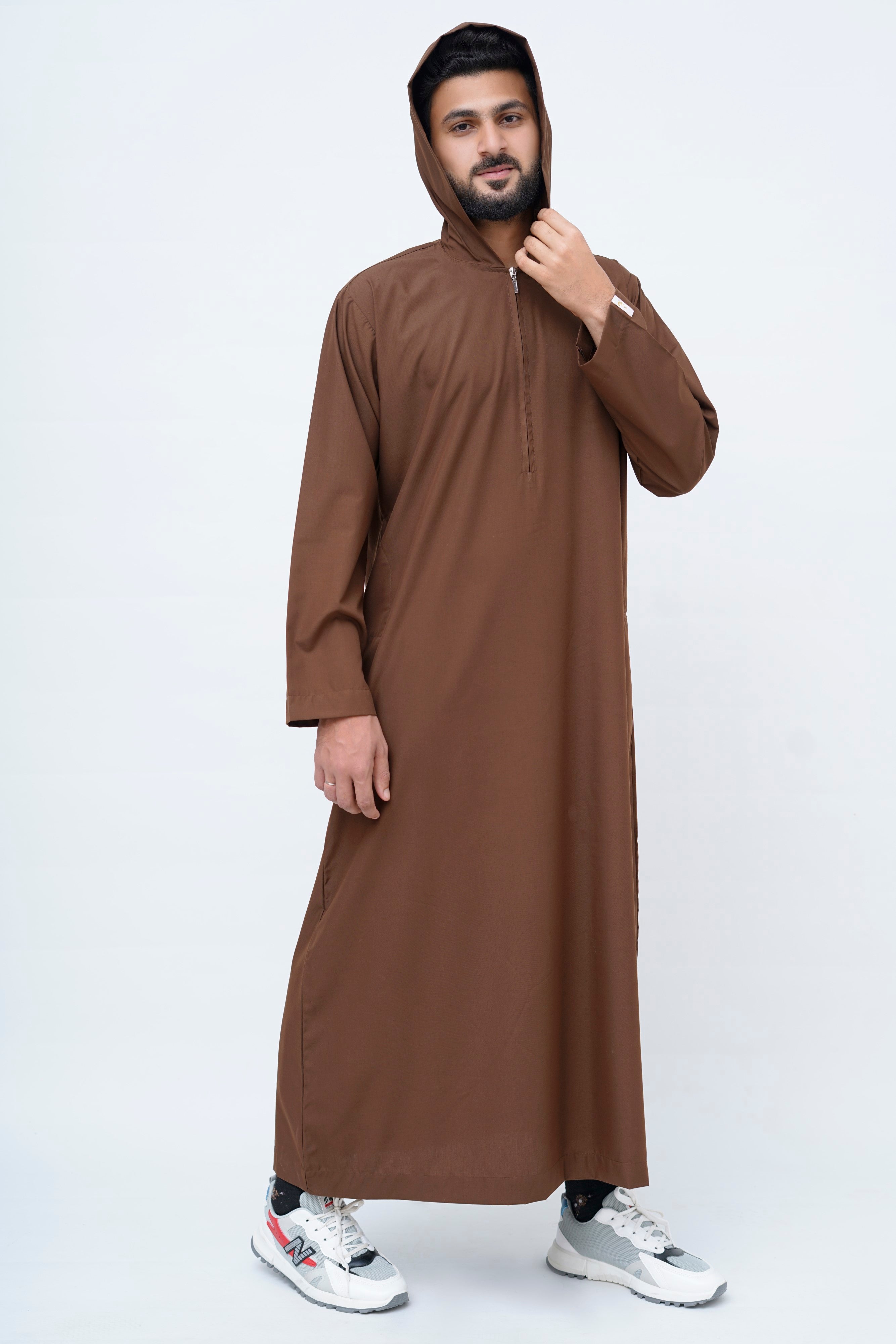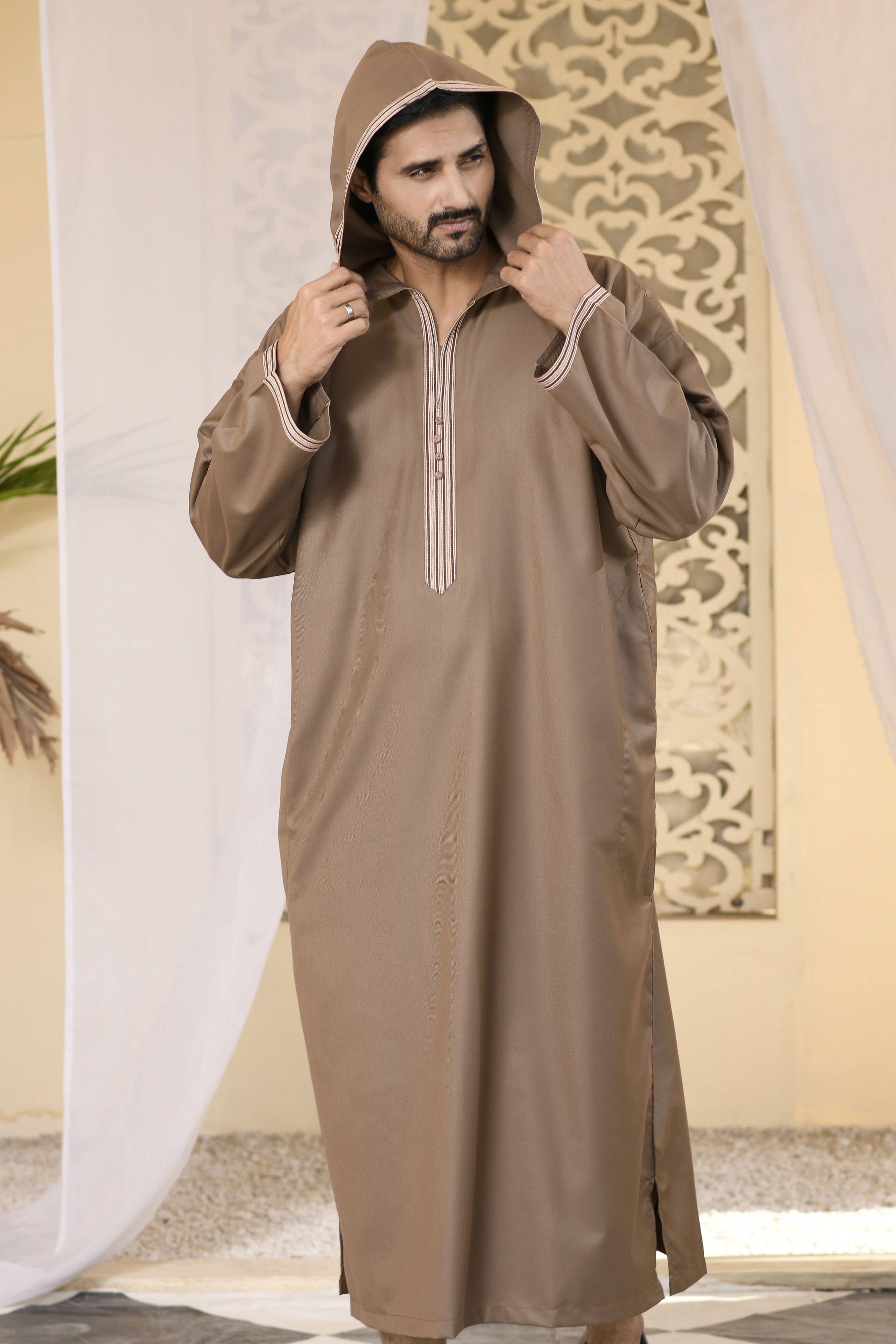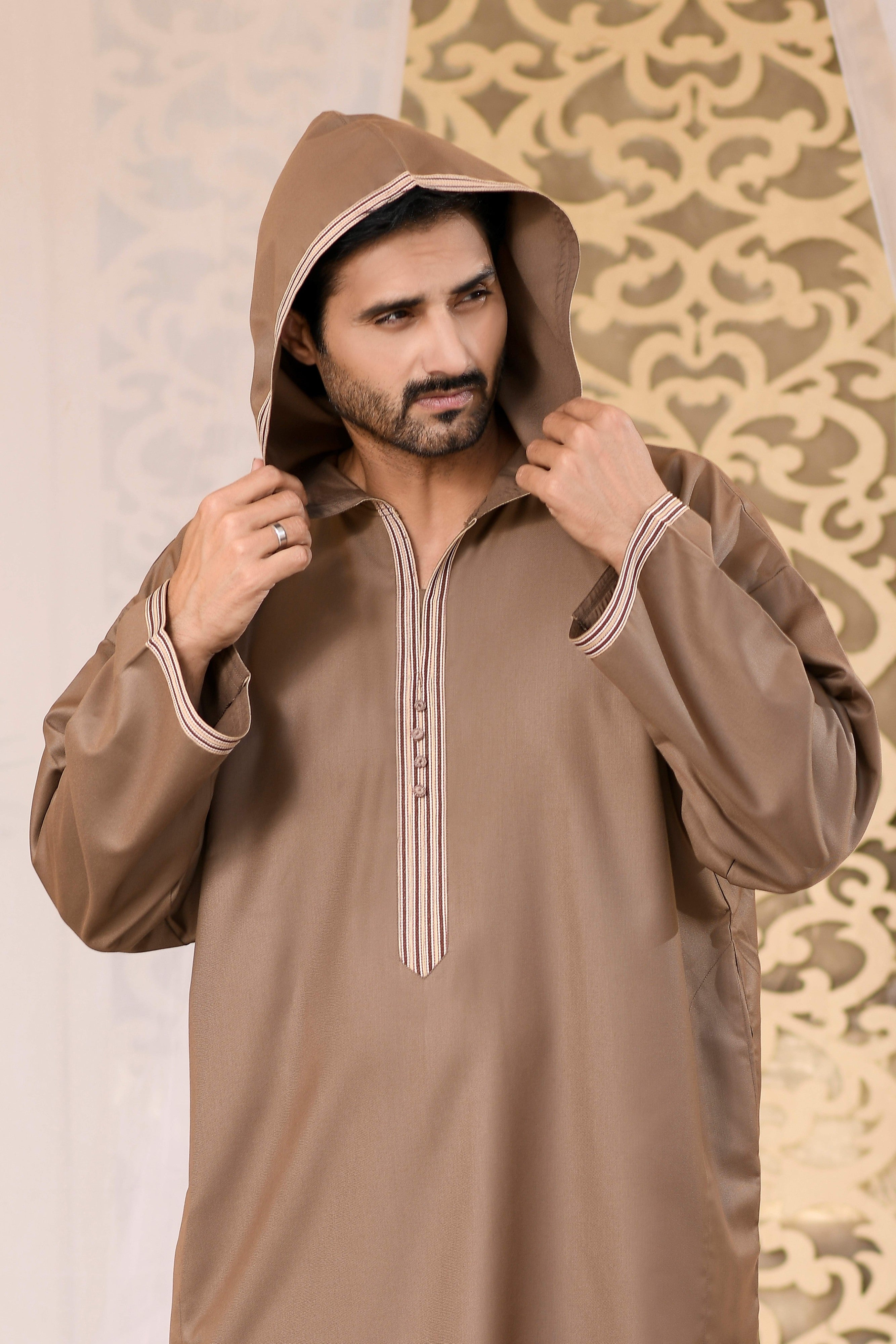 Tan Omani Shiny Zip Neck with V Neck Embroidery Design Jubba