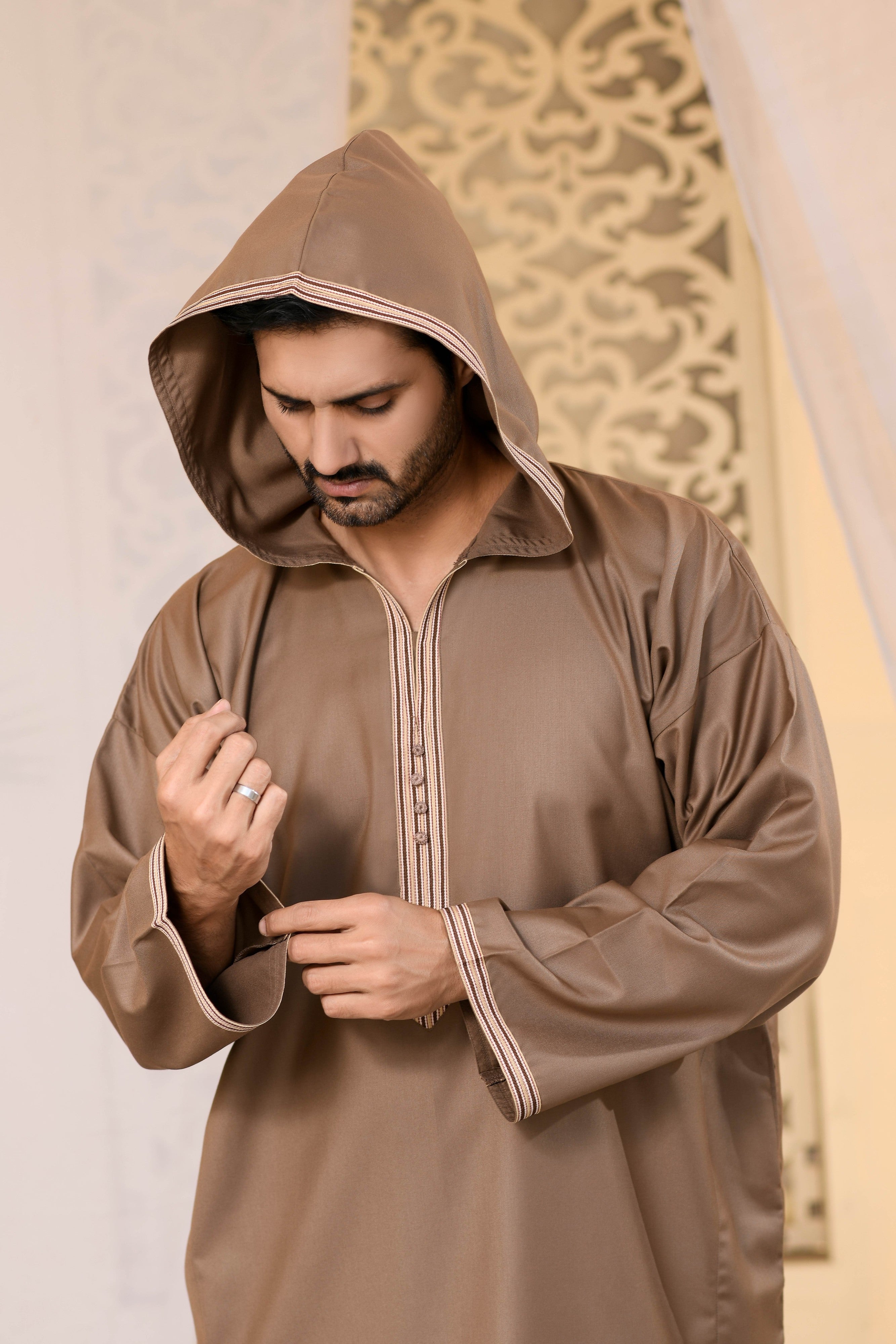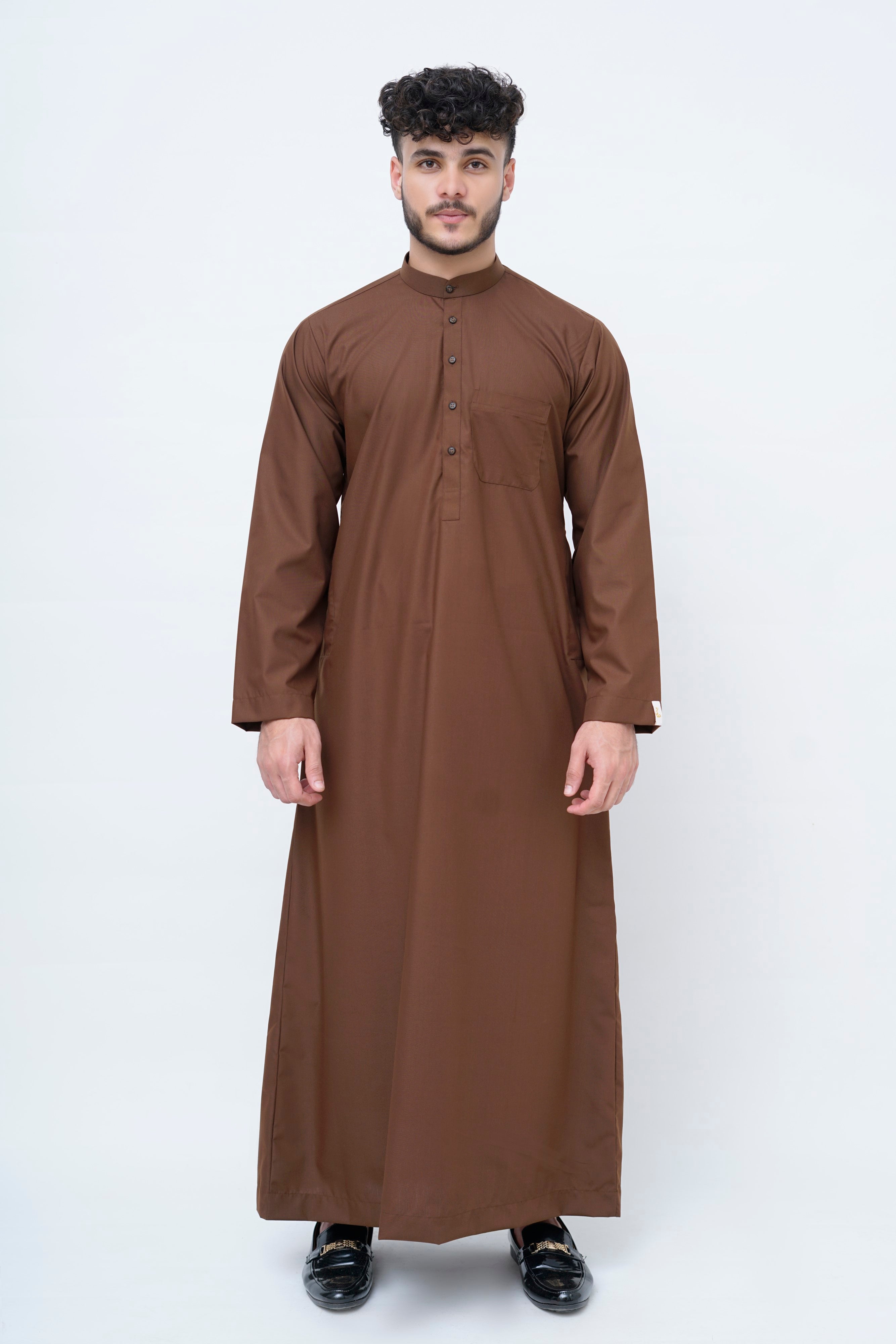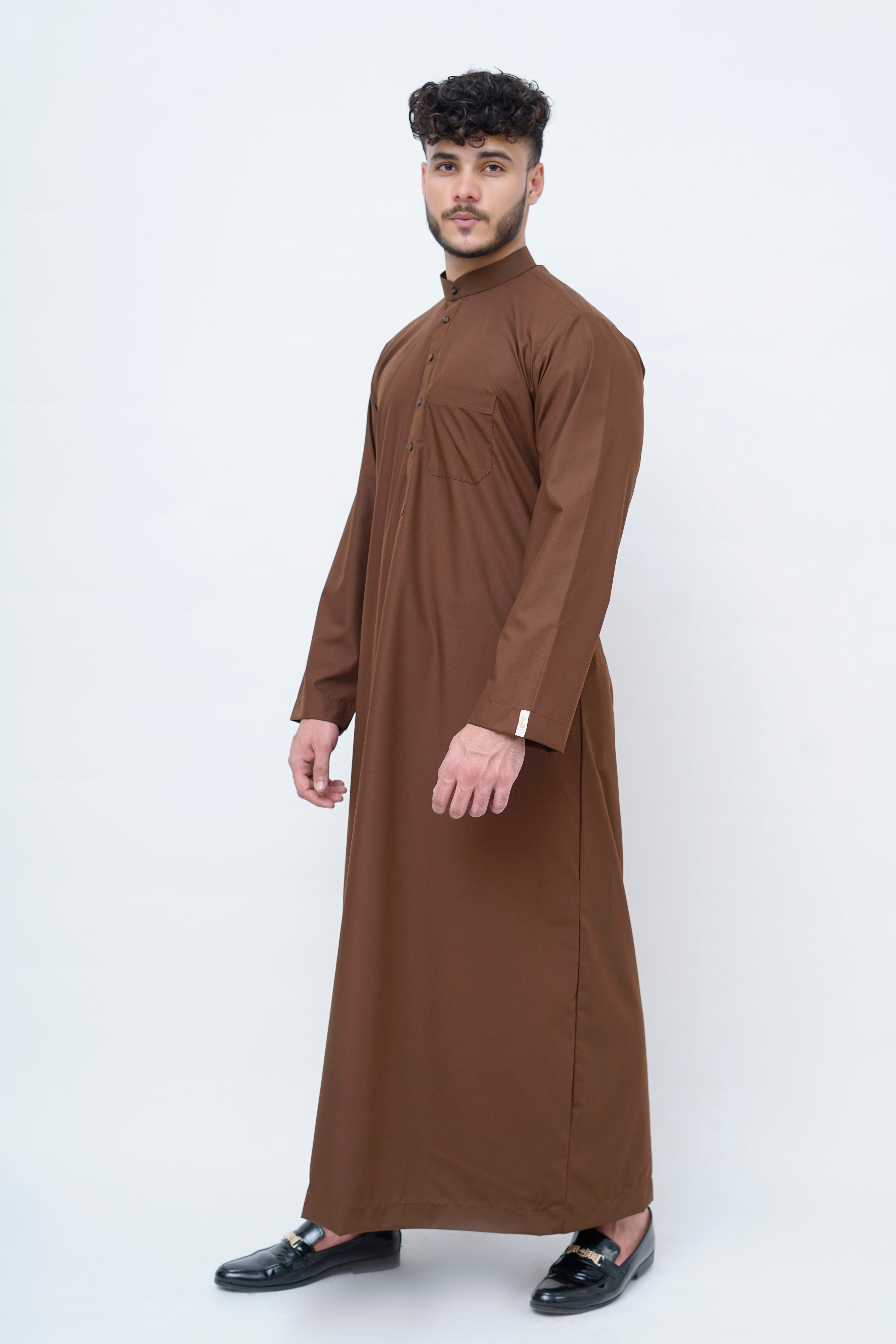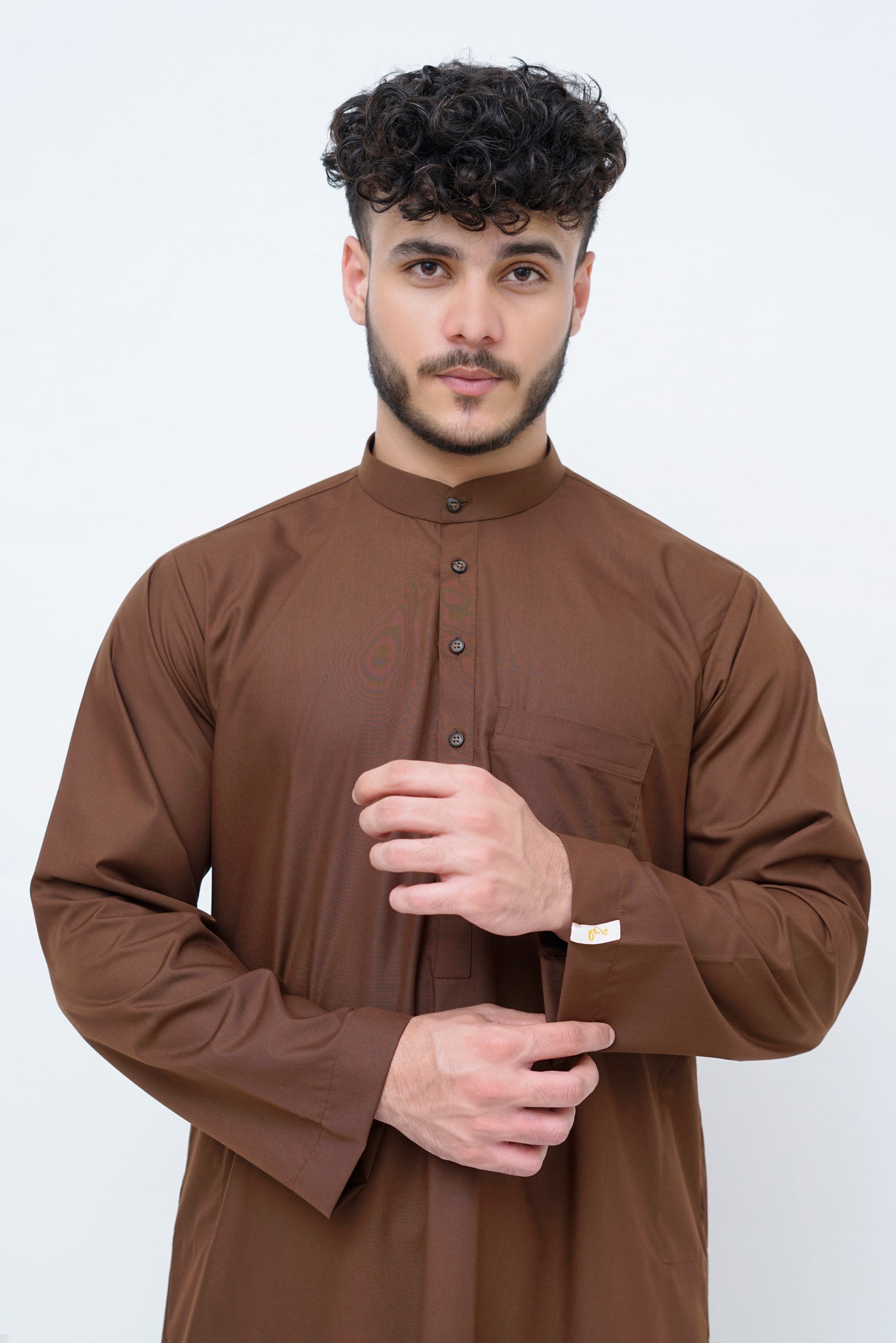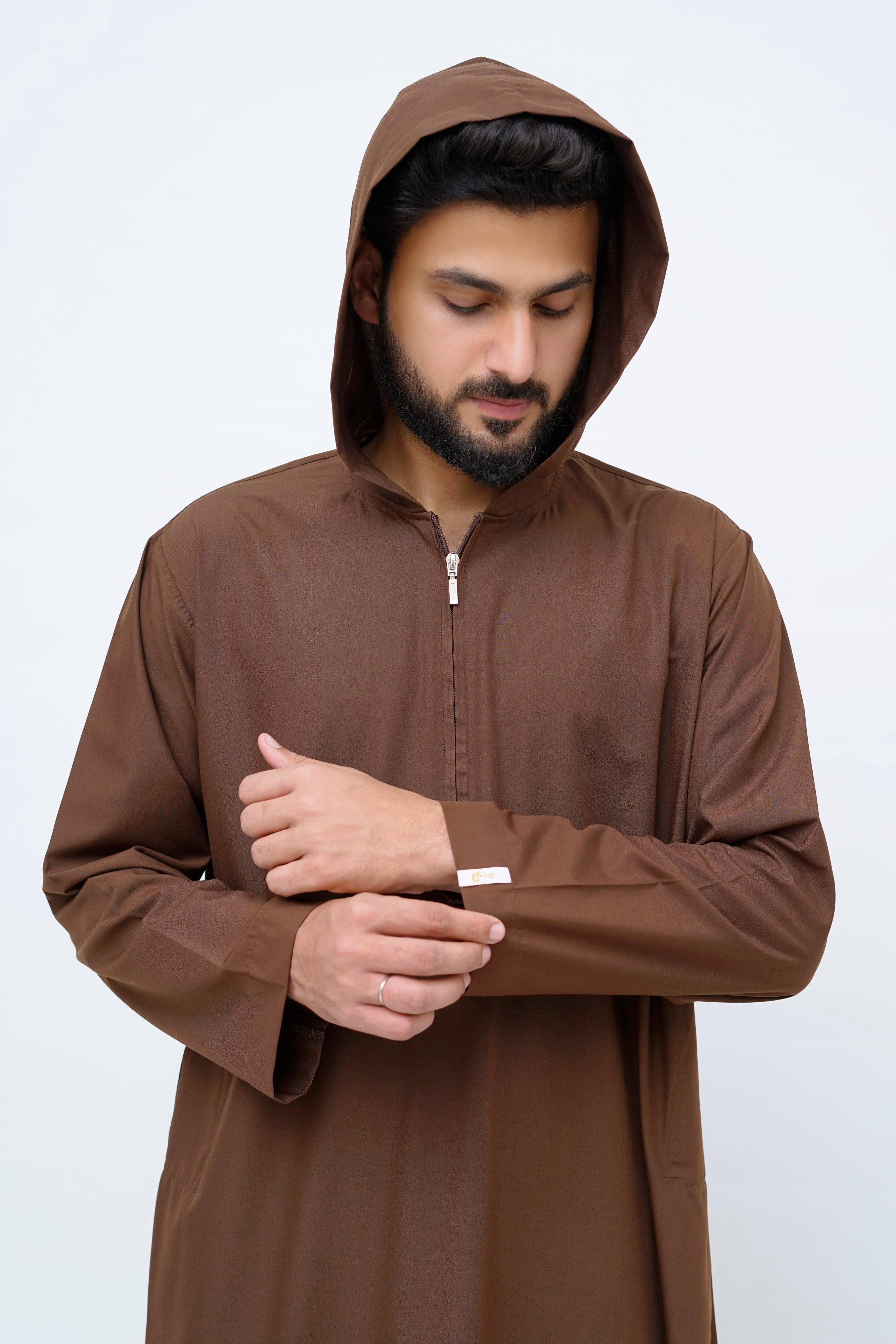 Tan Omani Shiny Zip Neck with V Neck Embroidery Design Jubba