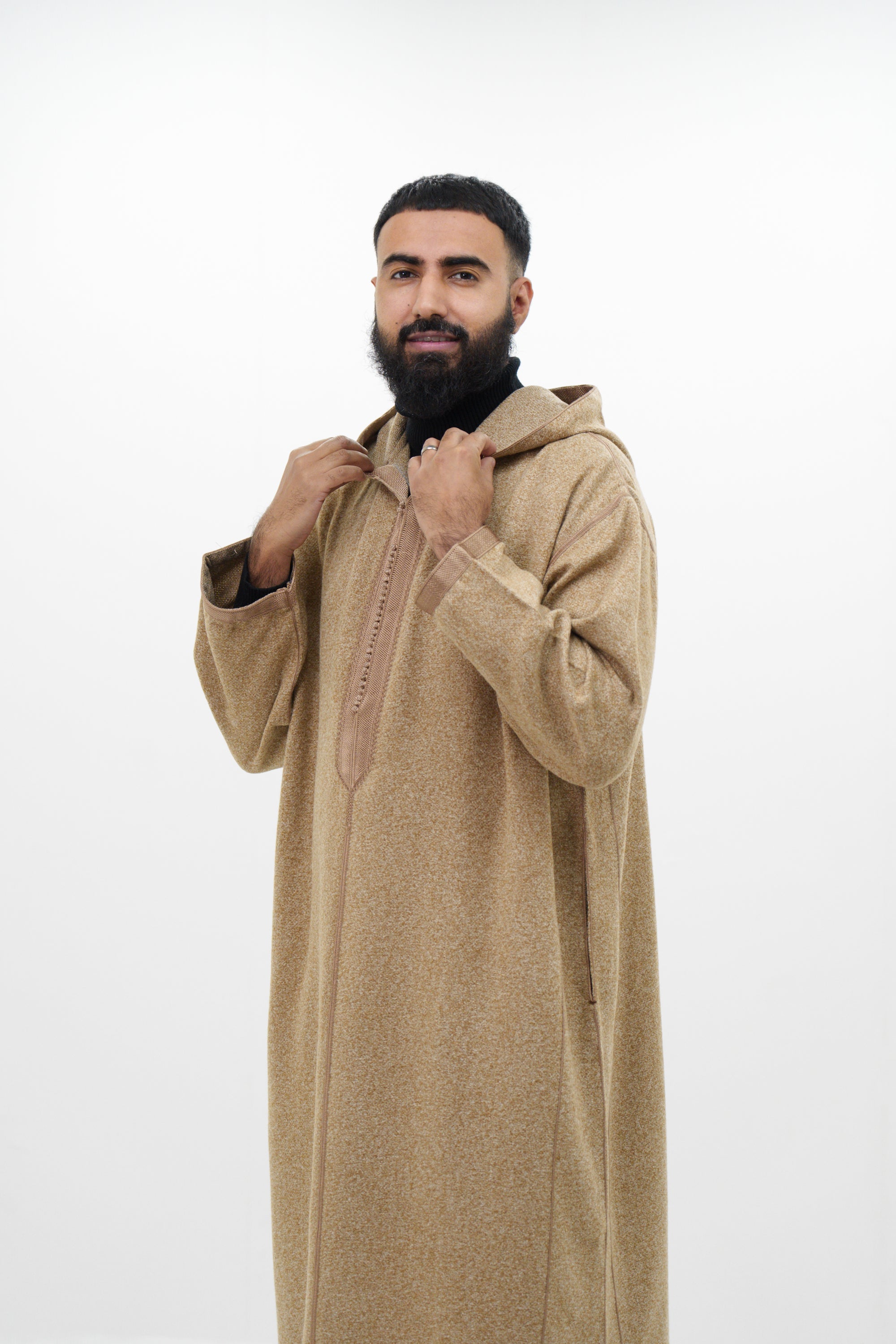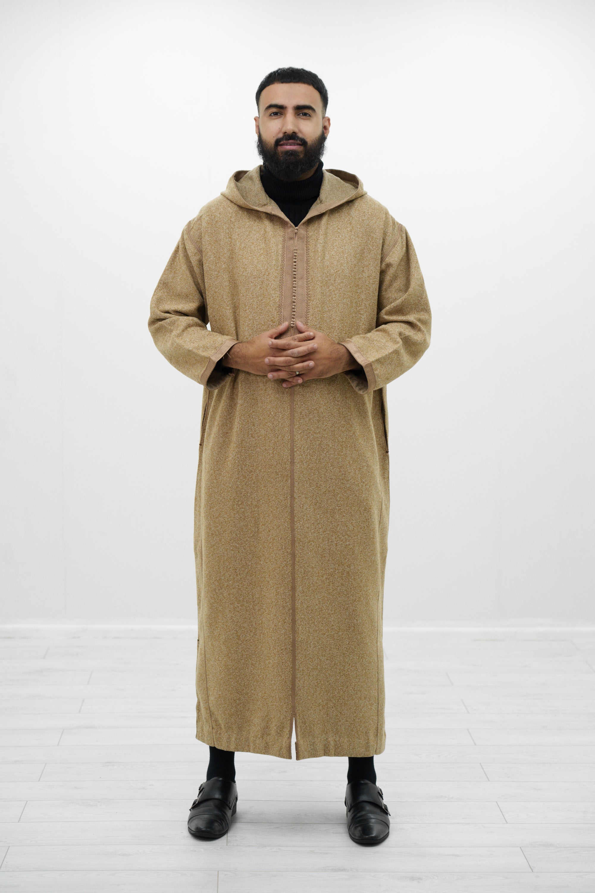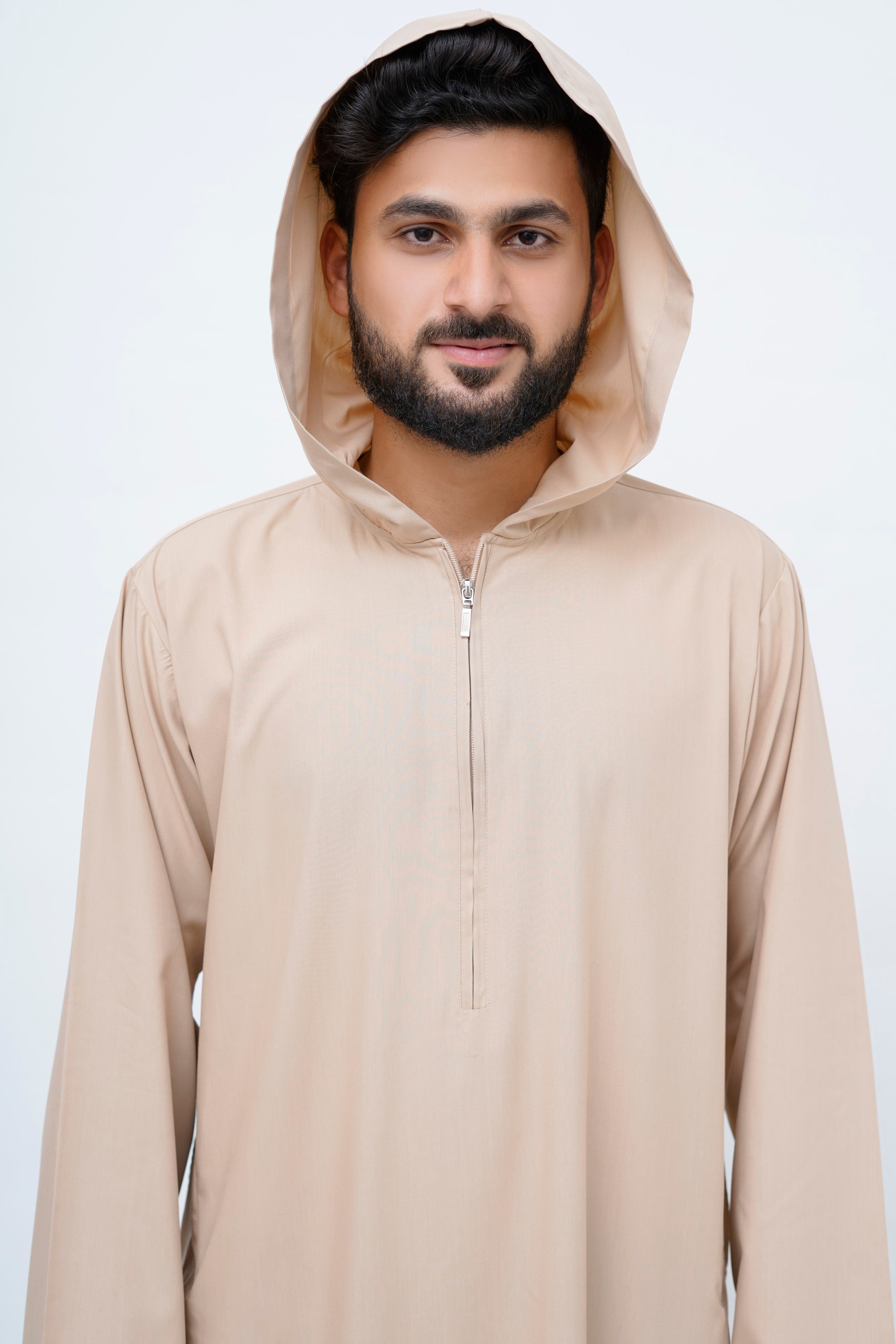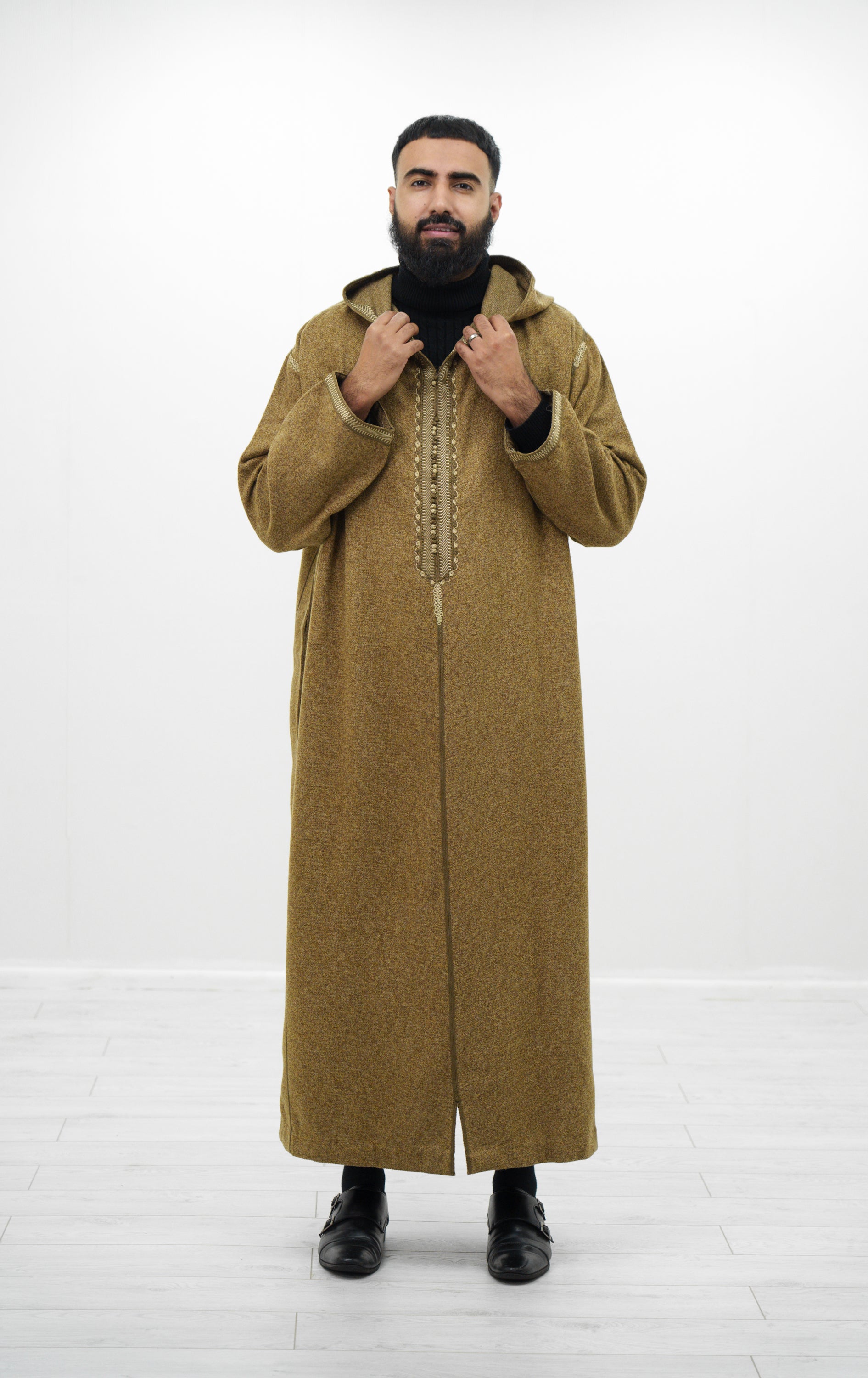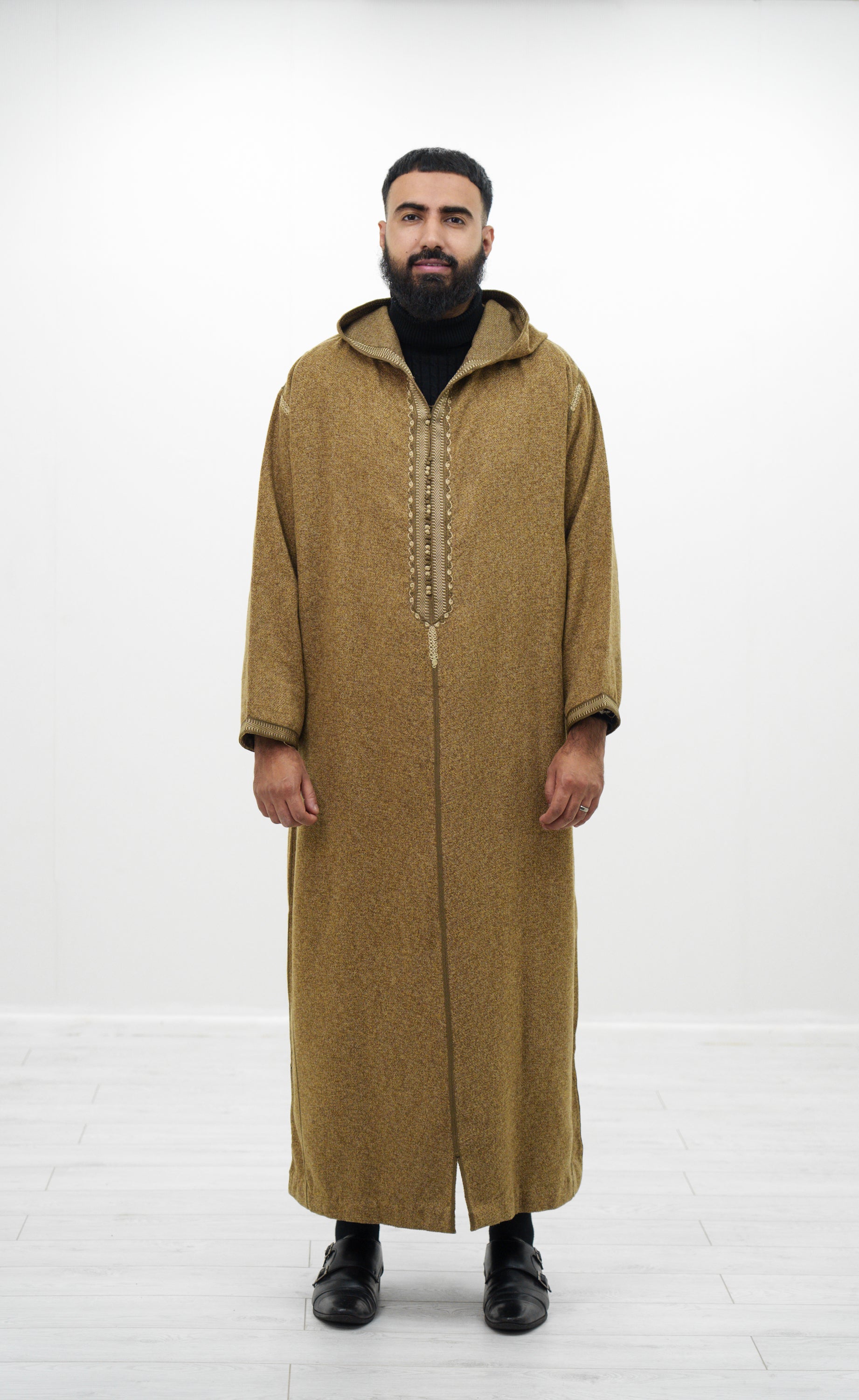 Tan Omani Shiny Zip Neck with V Neck Embroidery Design Jubba