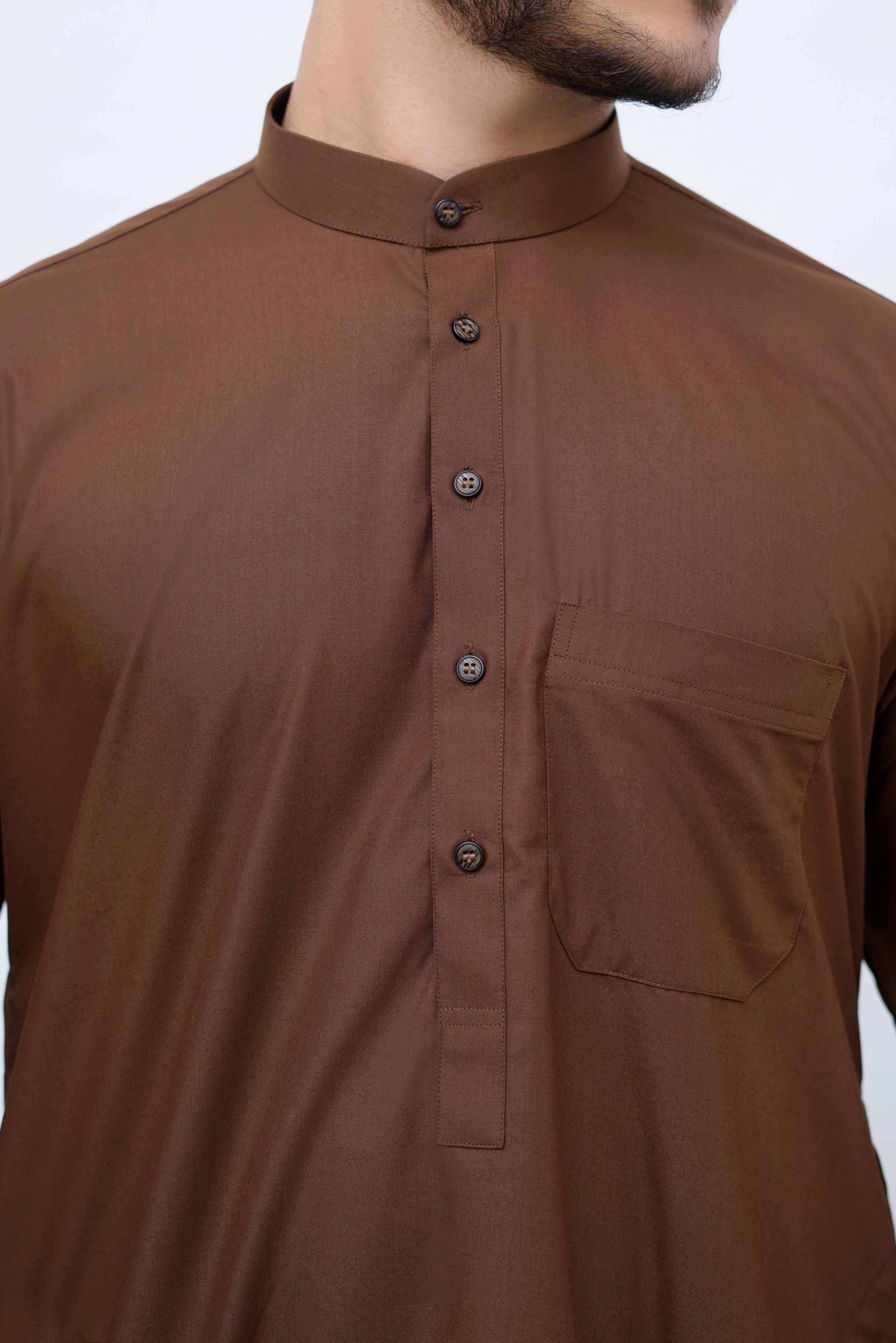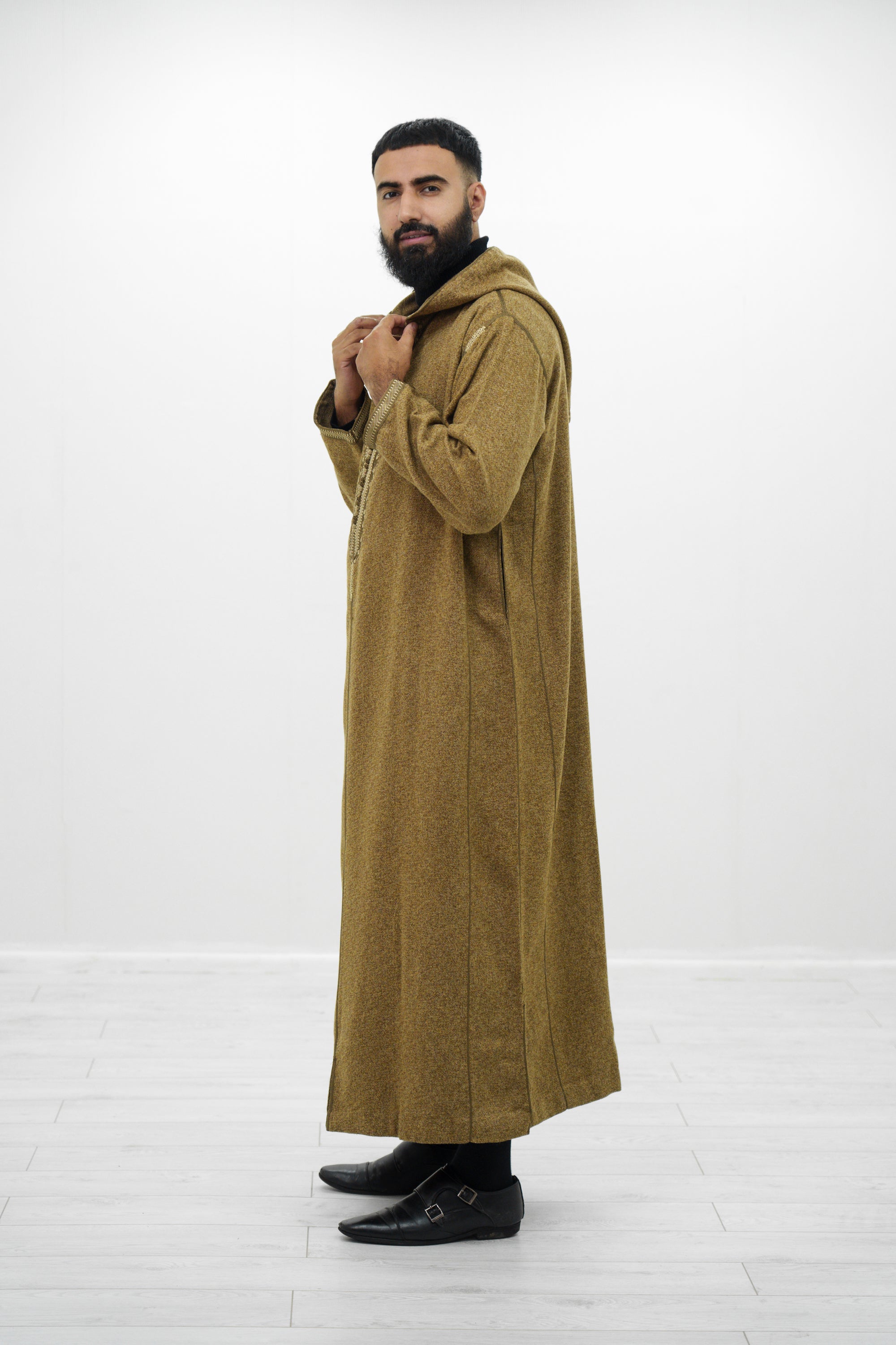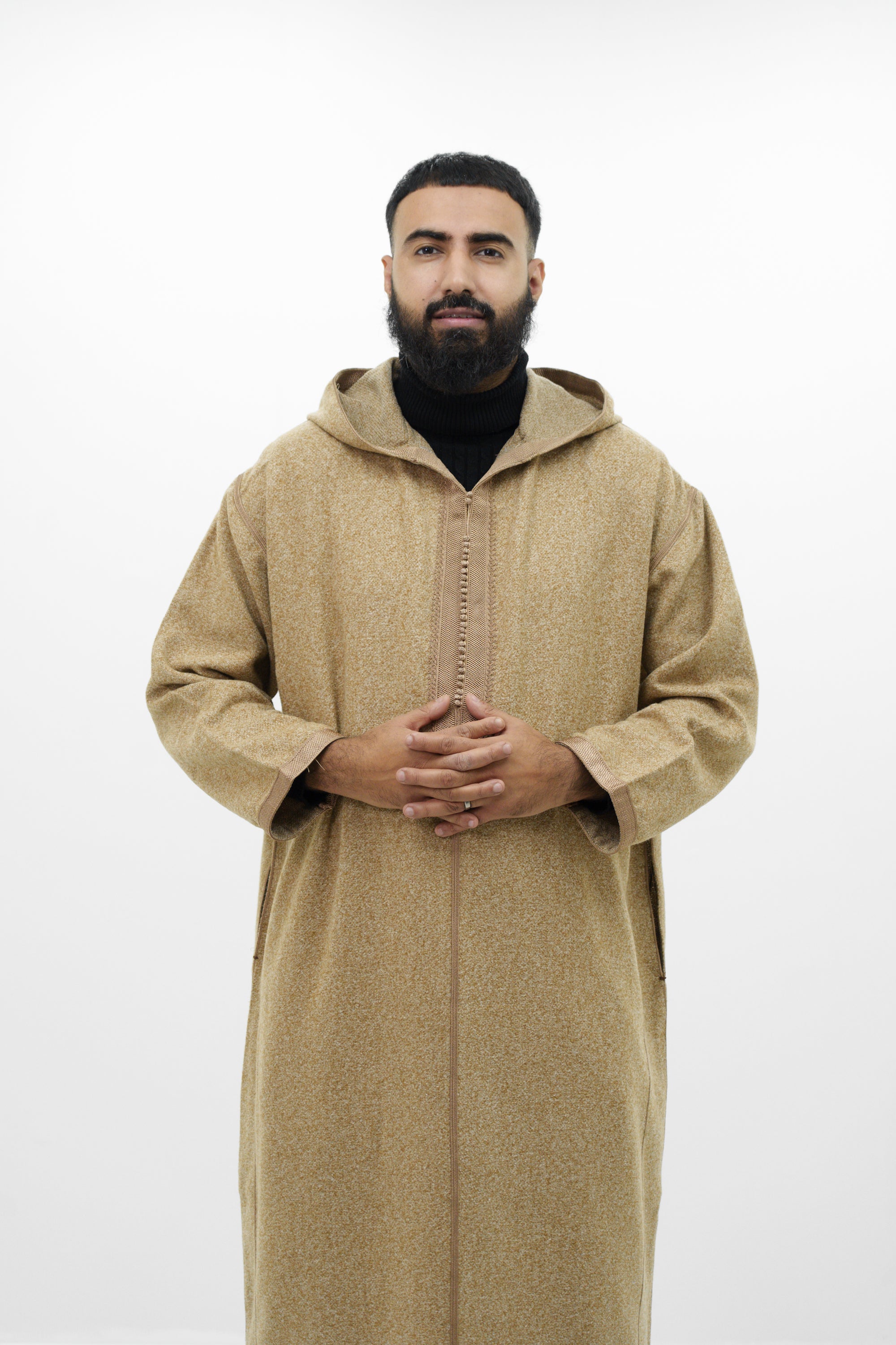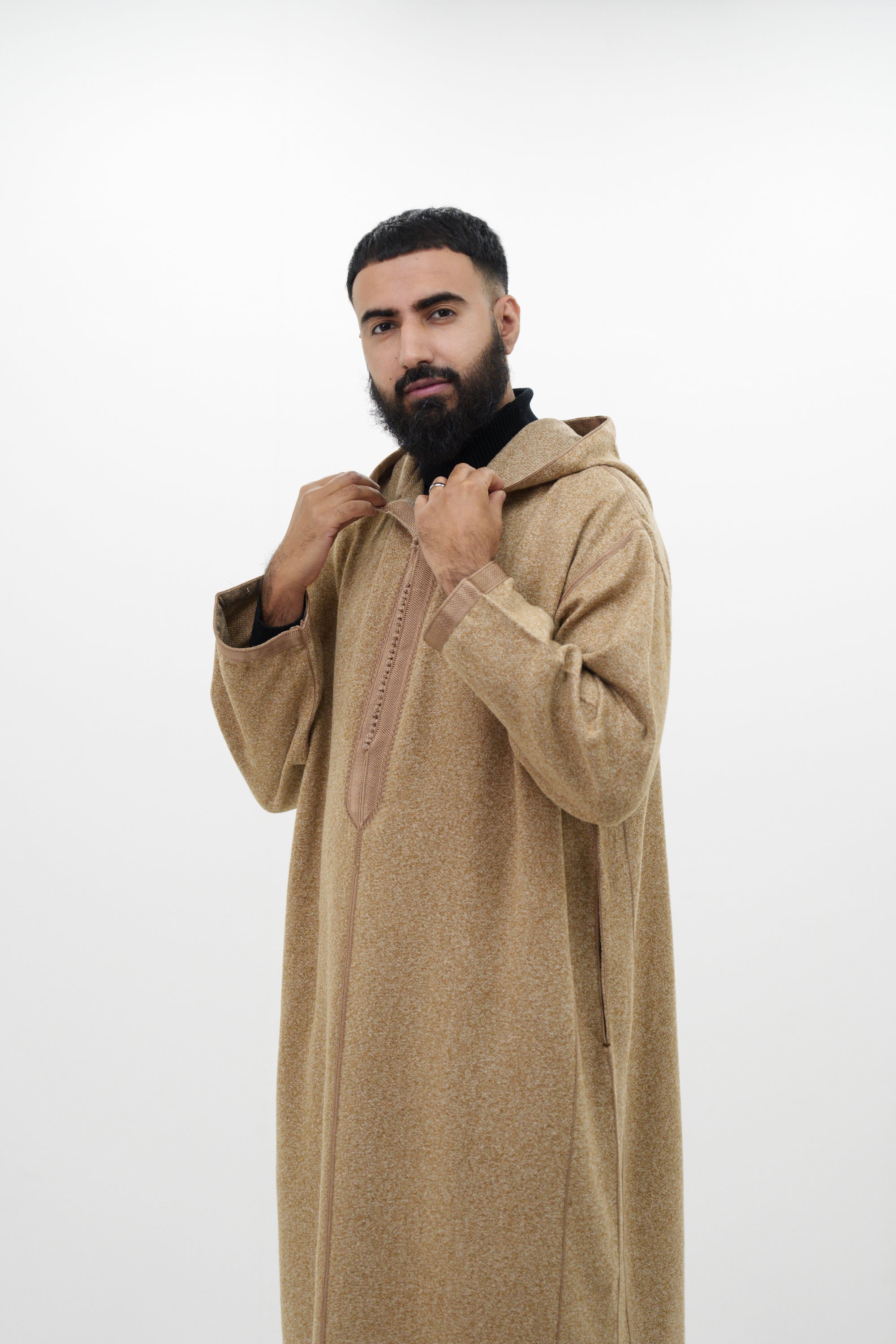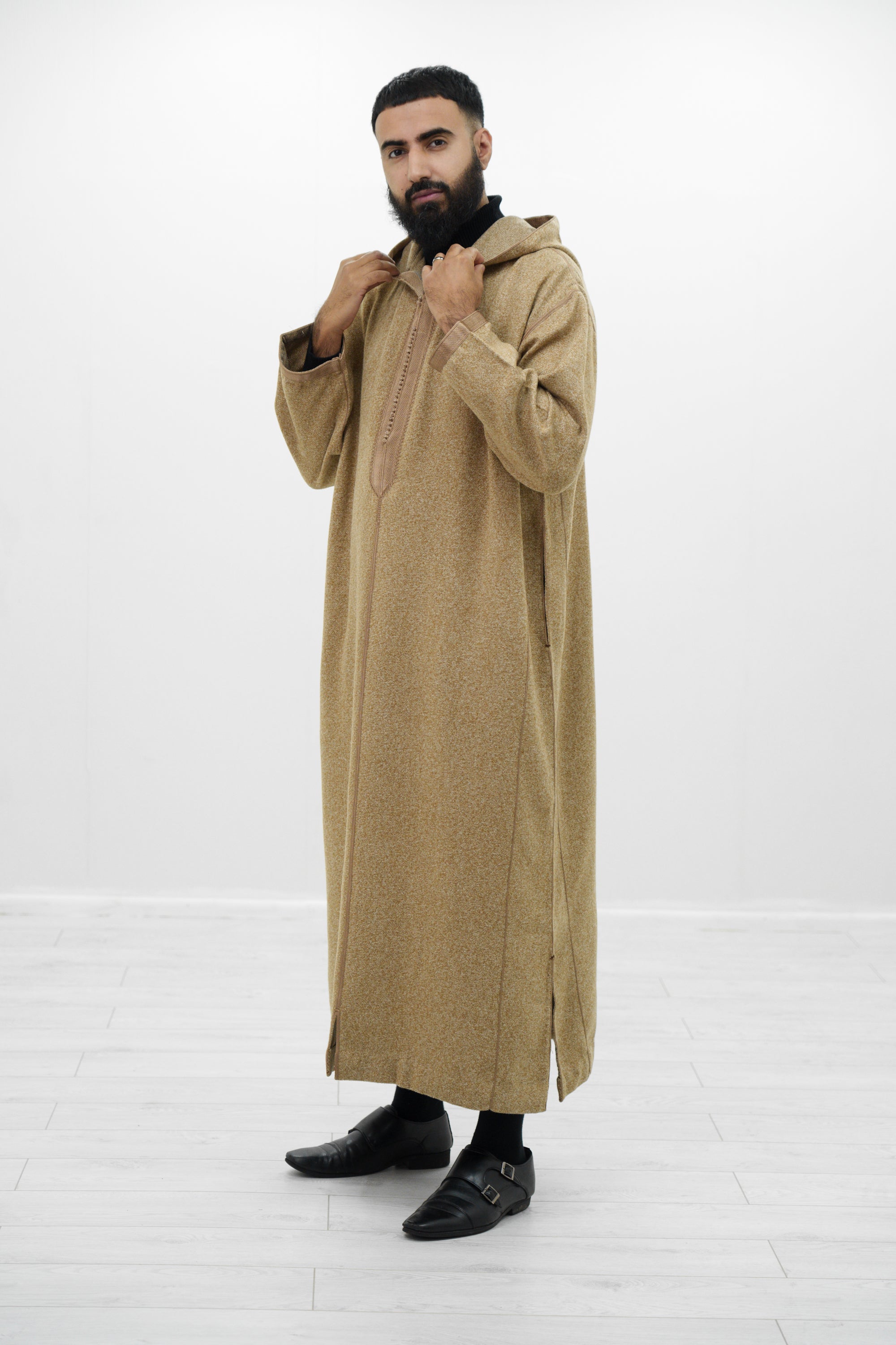 Tan Omani Shiny Zip Neck with V Neck Embroidery Design Jubba