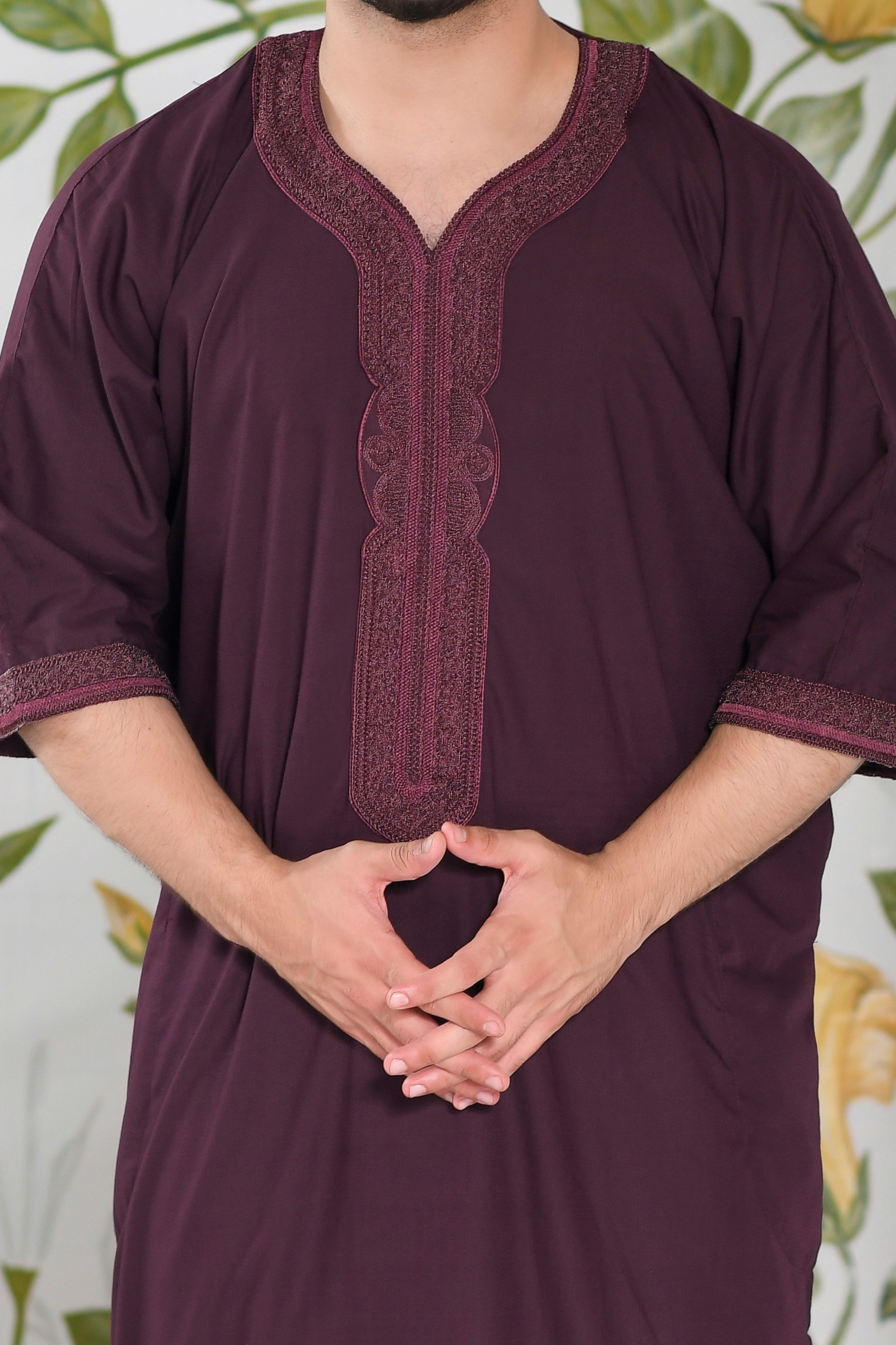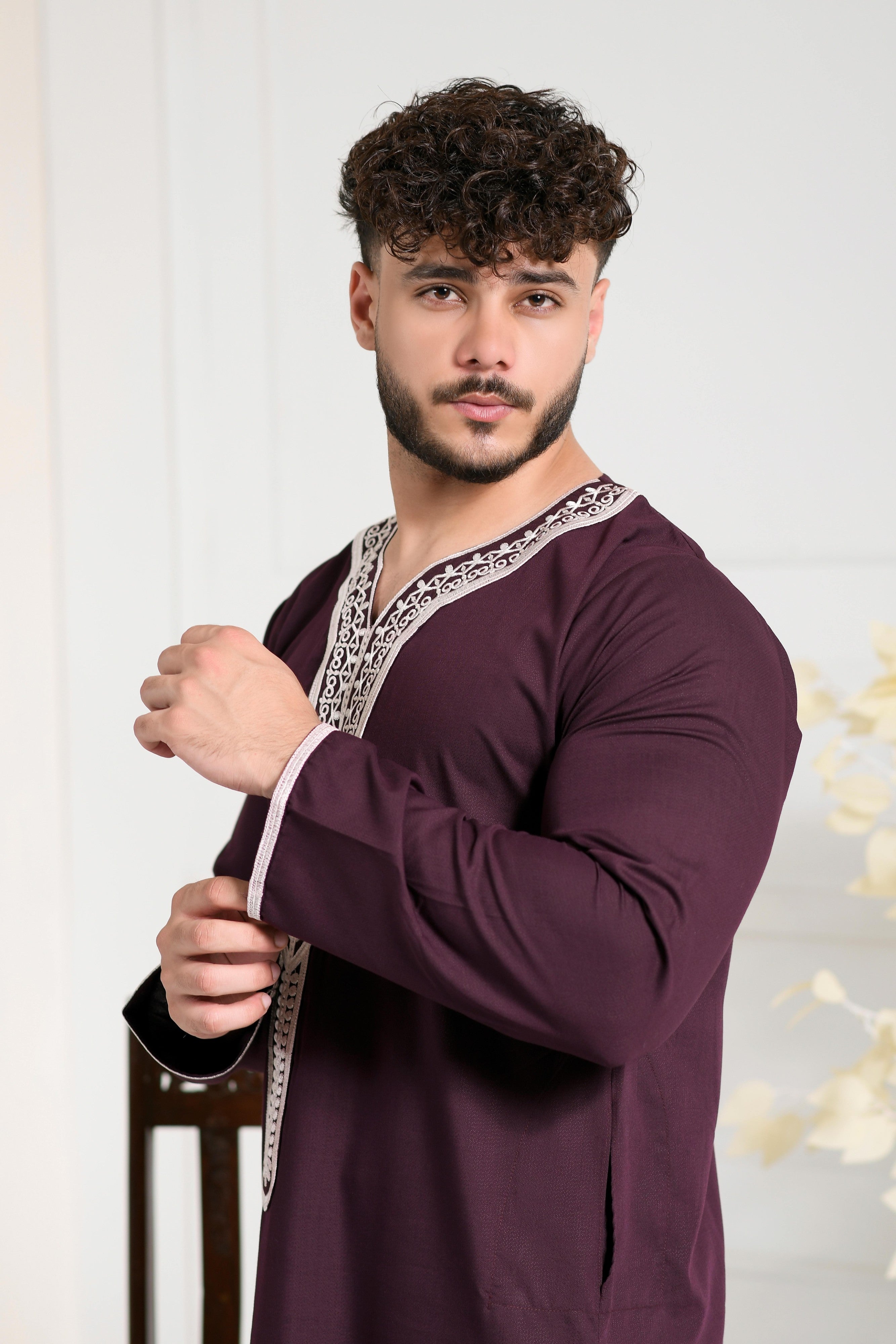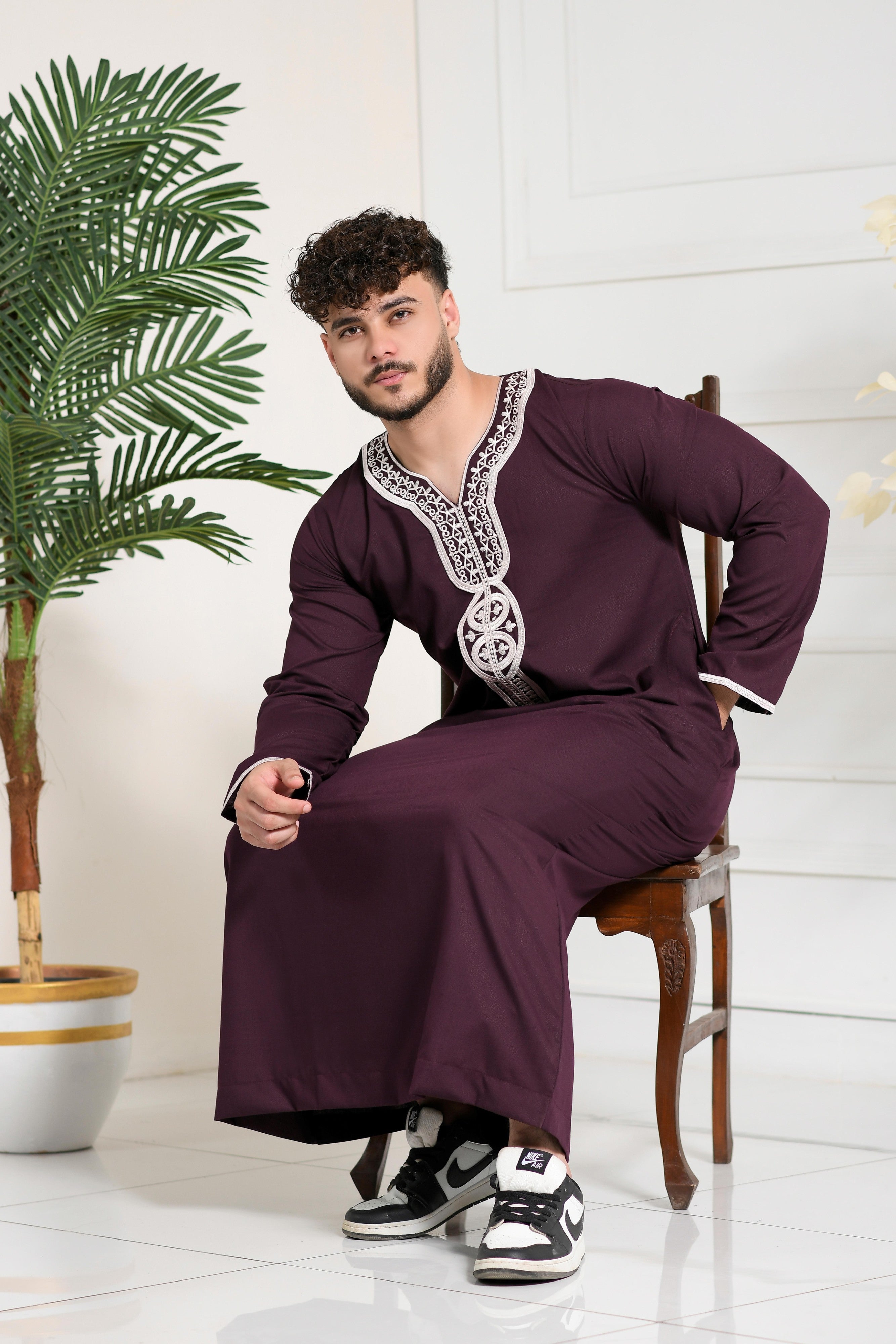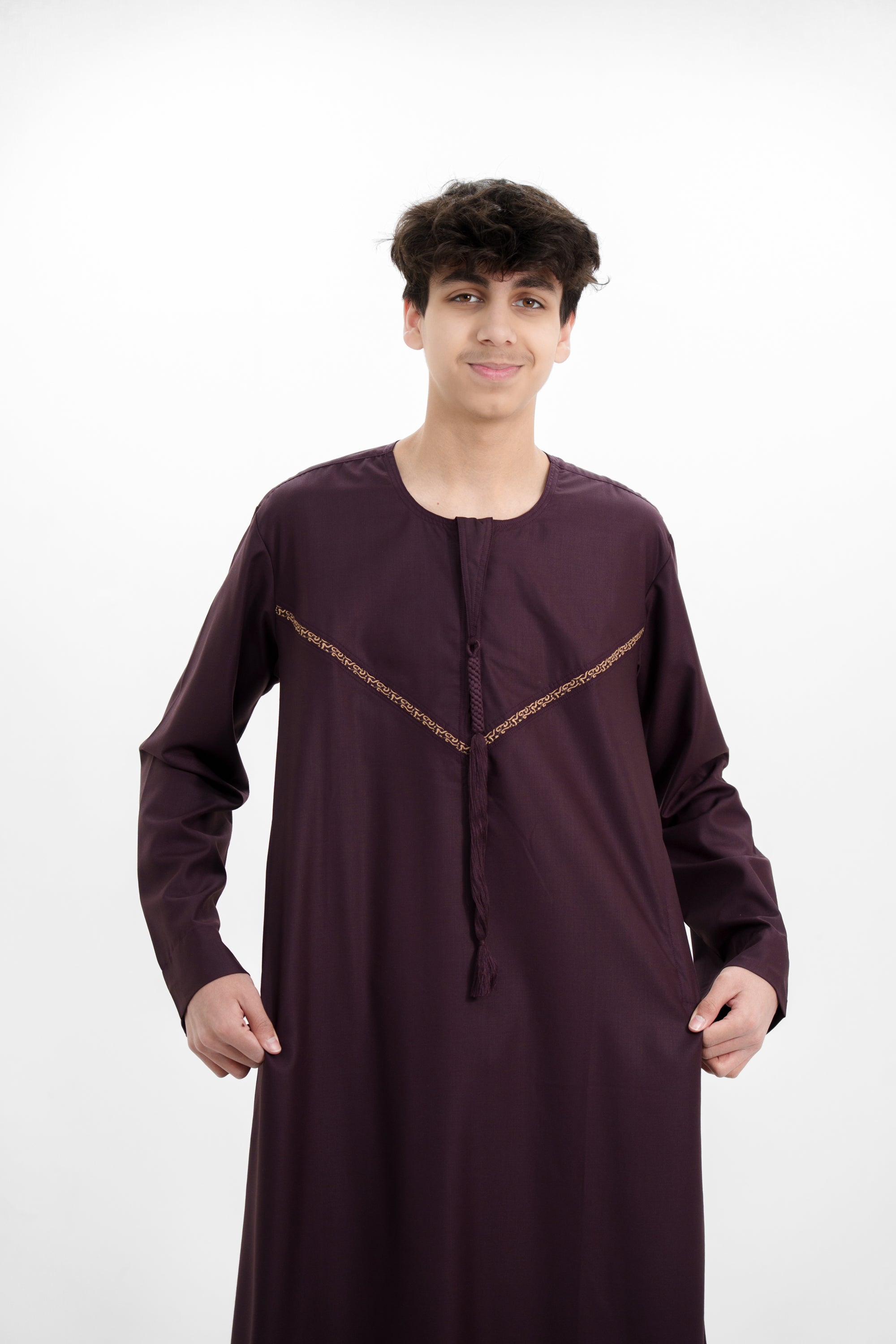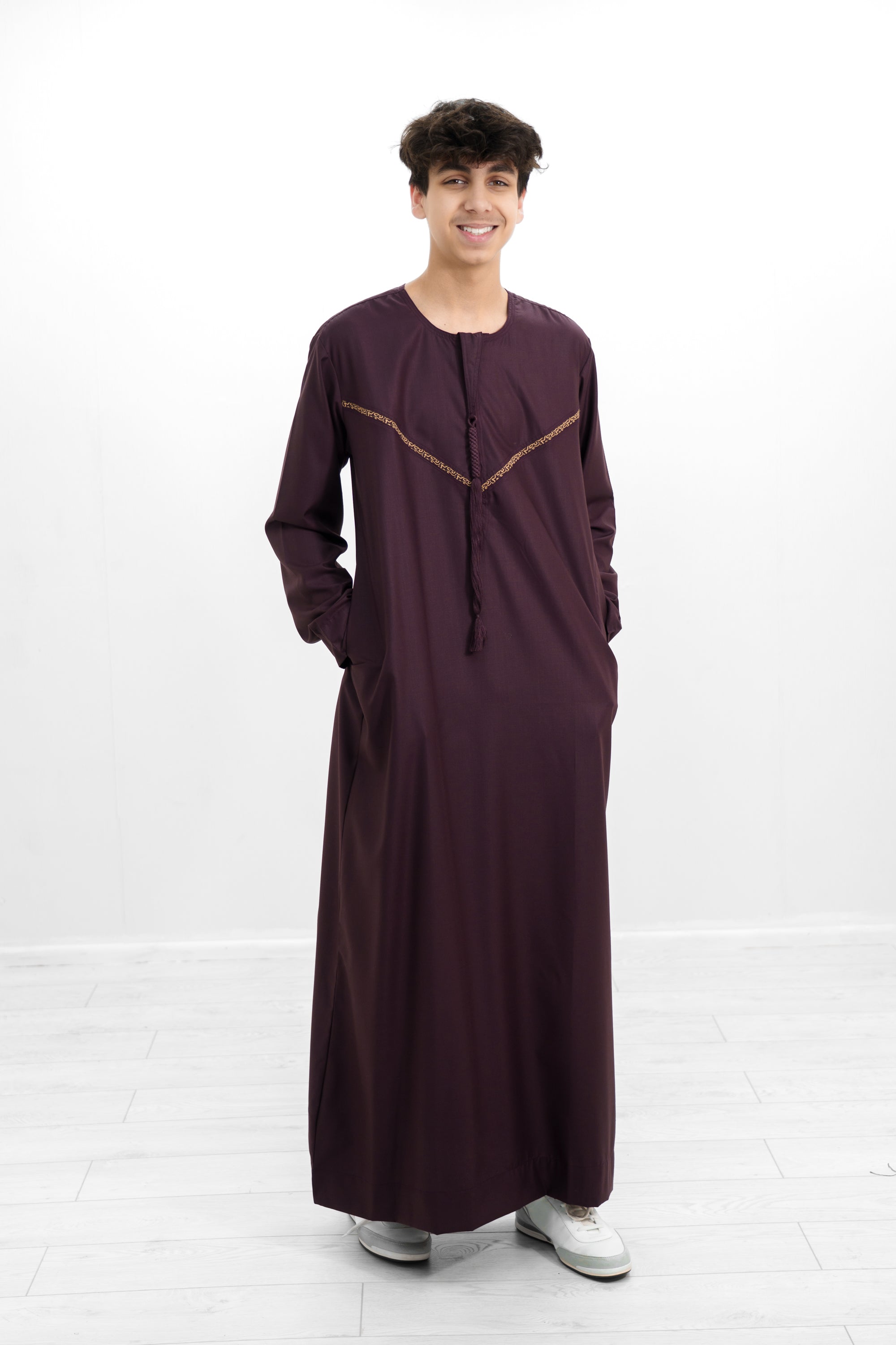 Plum Emirati Long Sleeve Tassel and V Neck Embroidered Jubba with Pockets