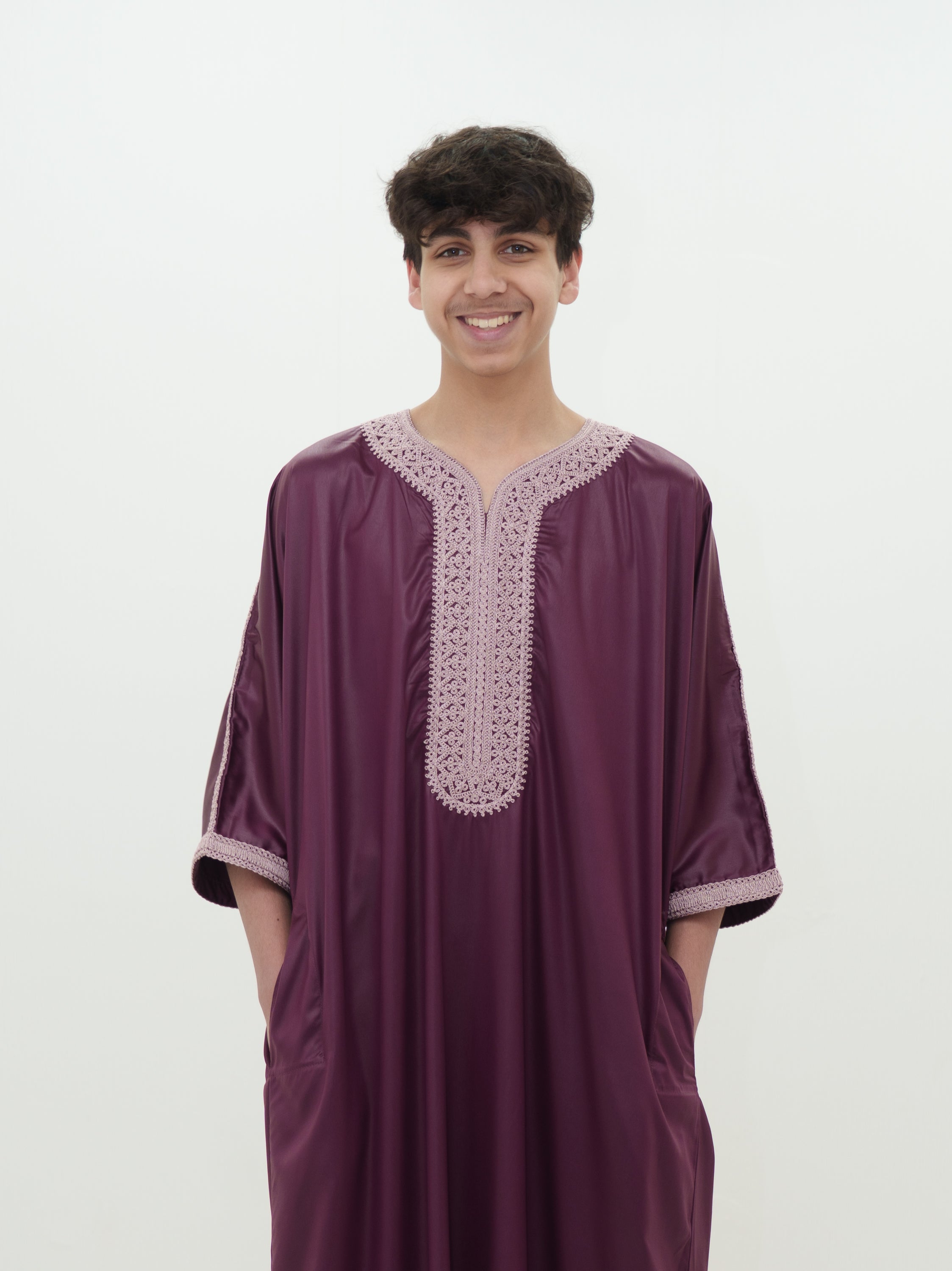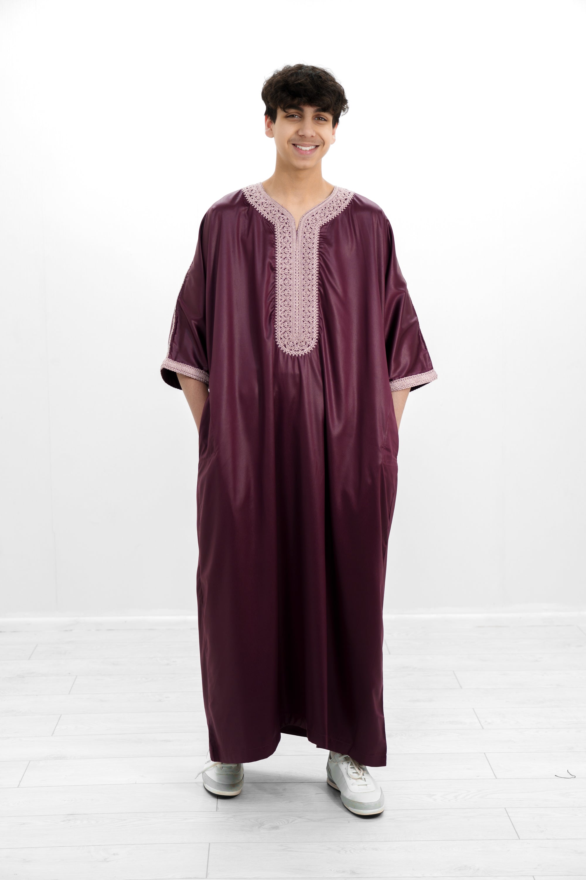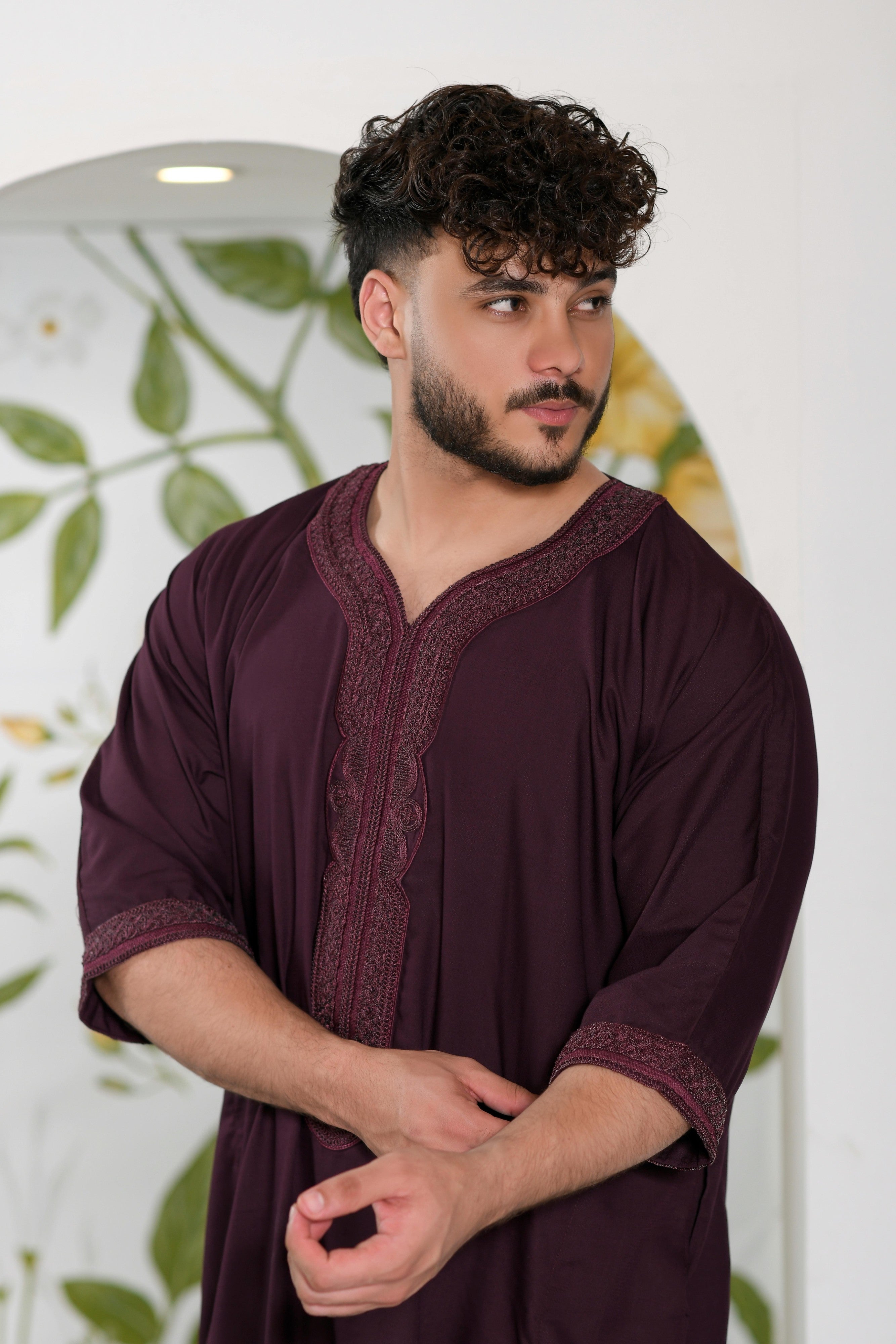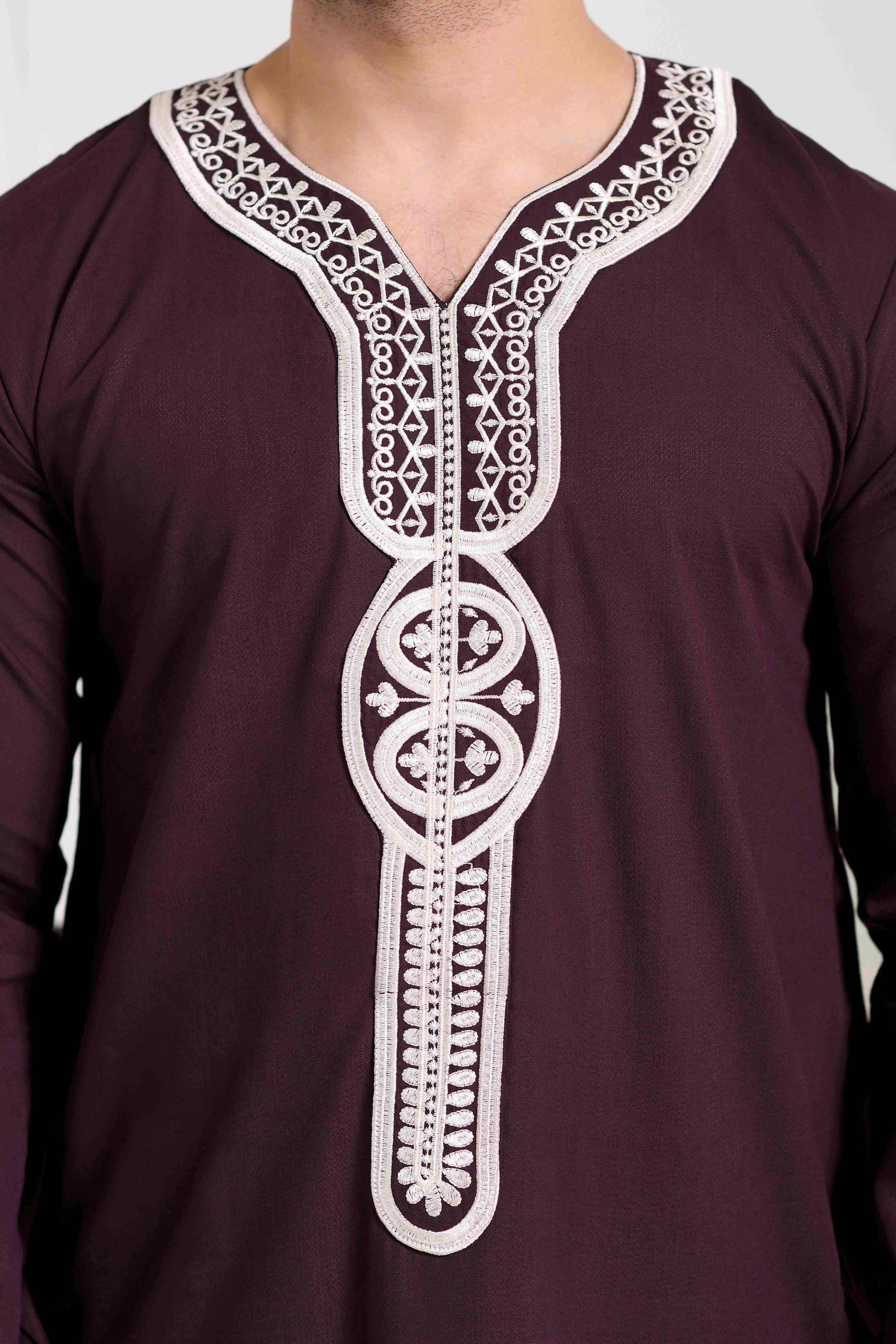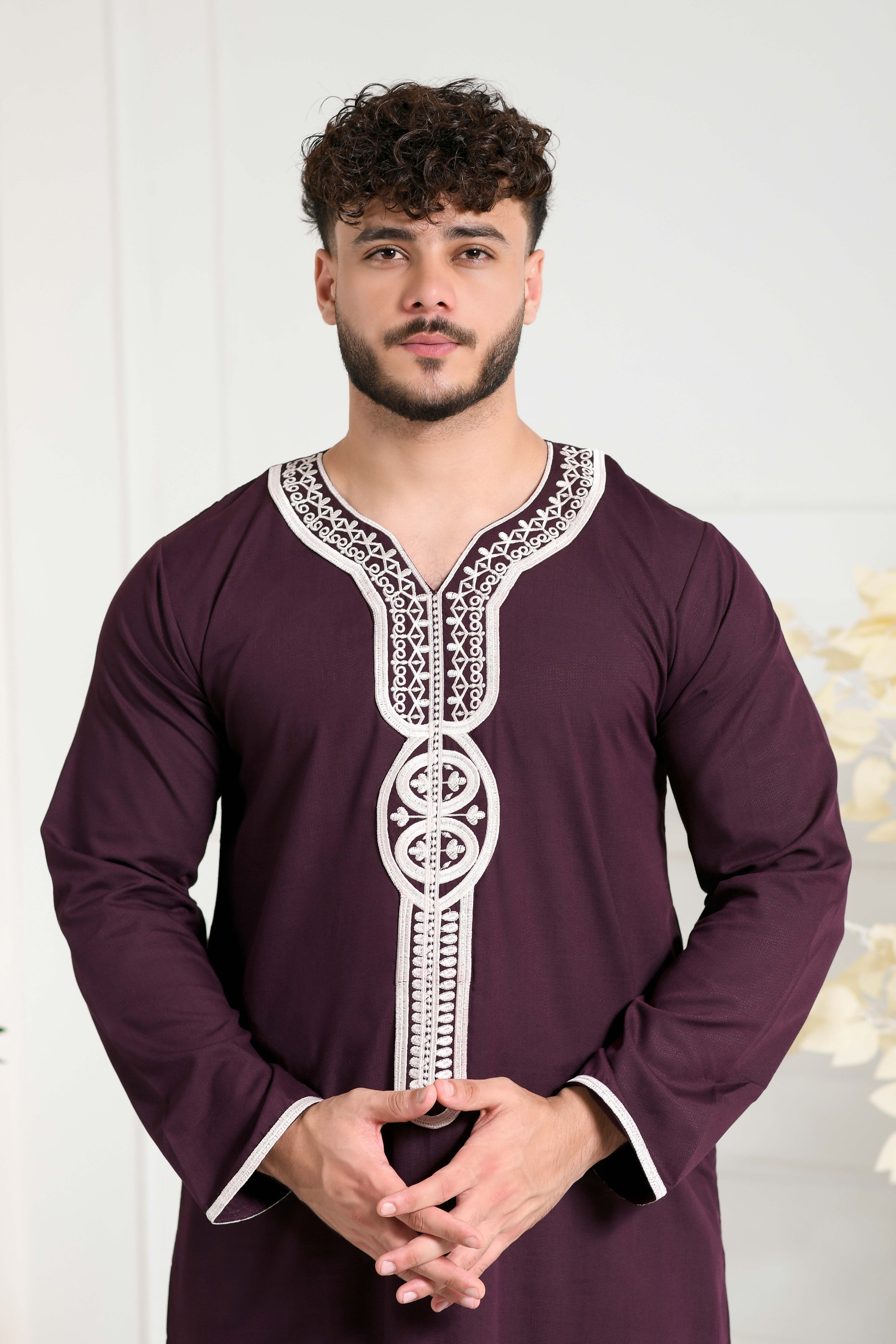 Plum Emirati Long Sleeve Tassel and V Neck Embroidered Jubba with Pockets