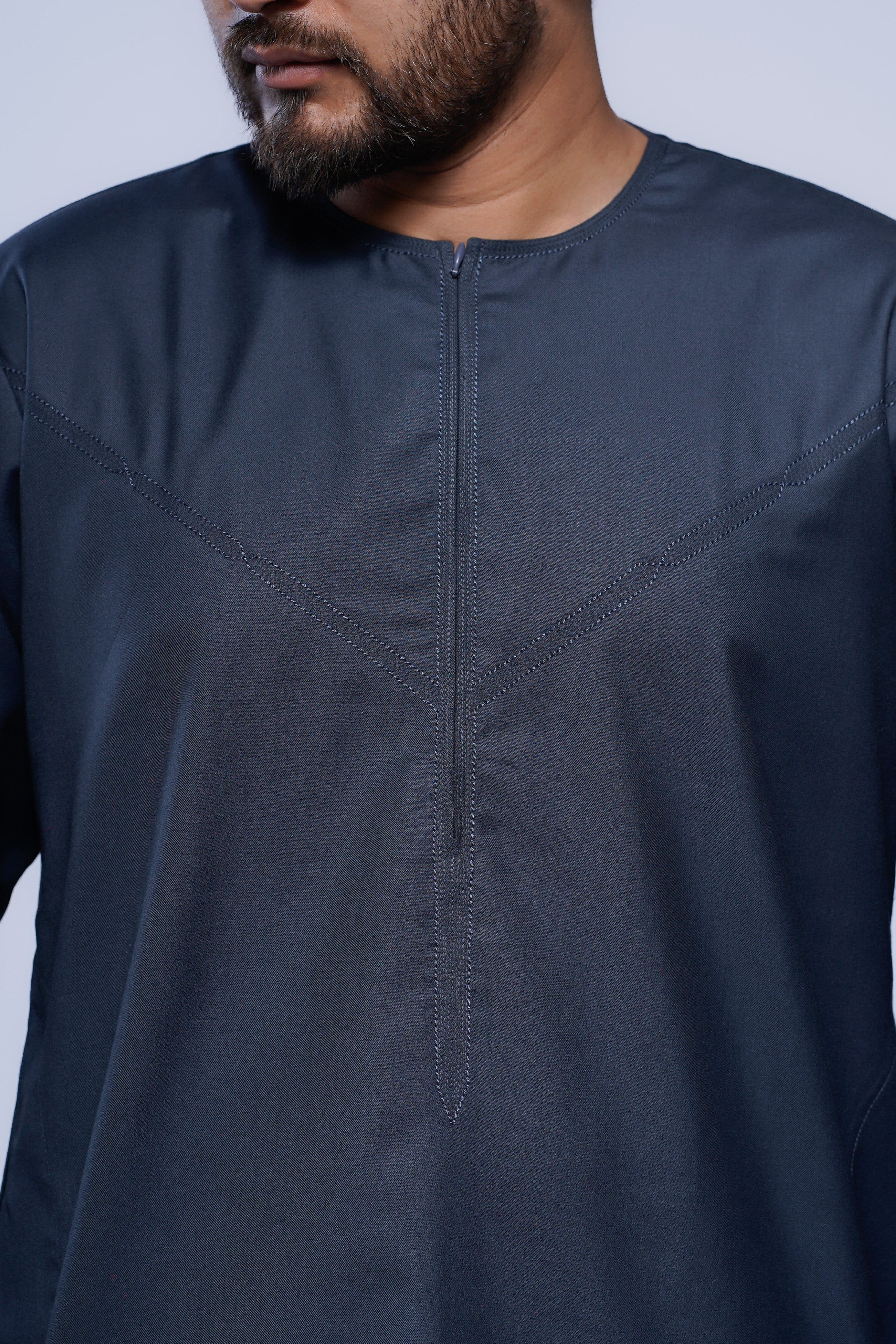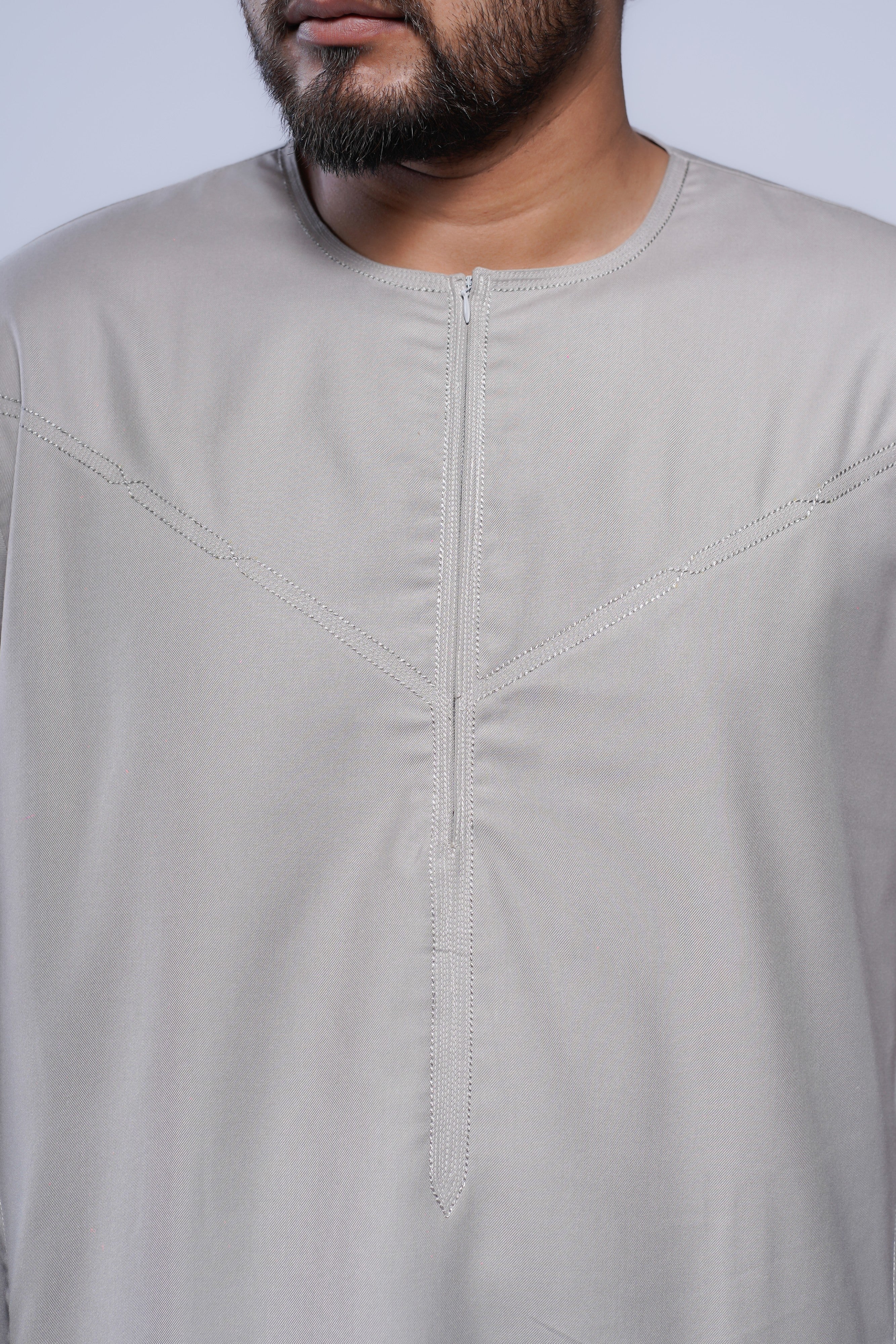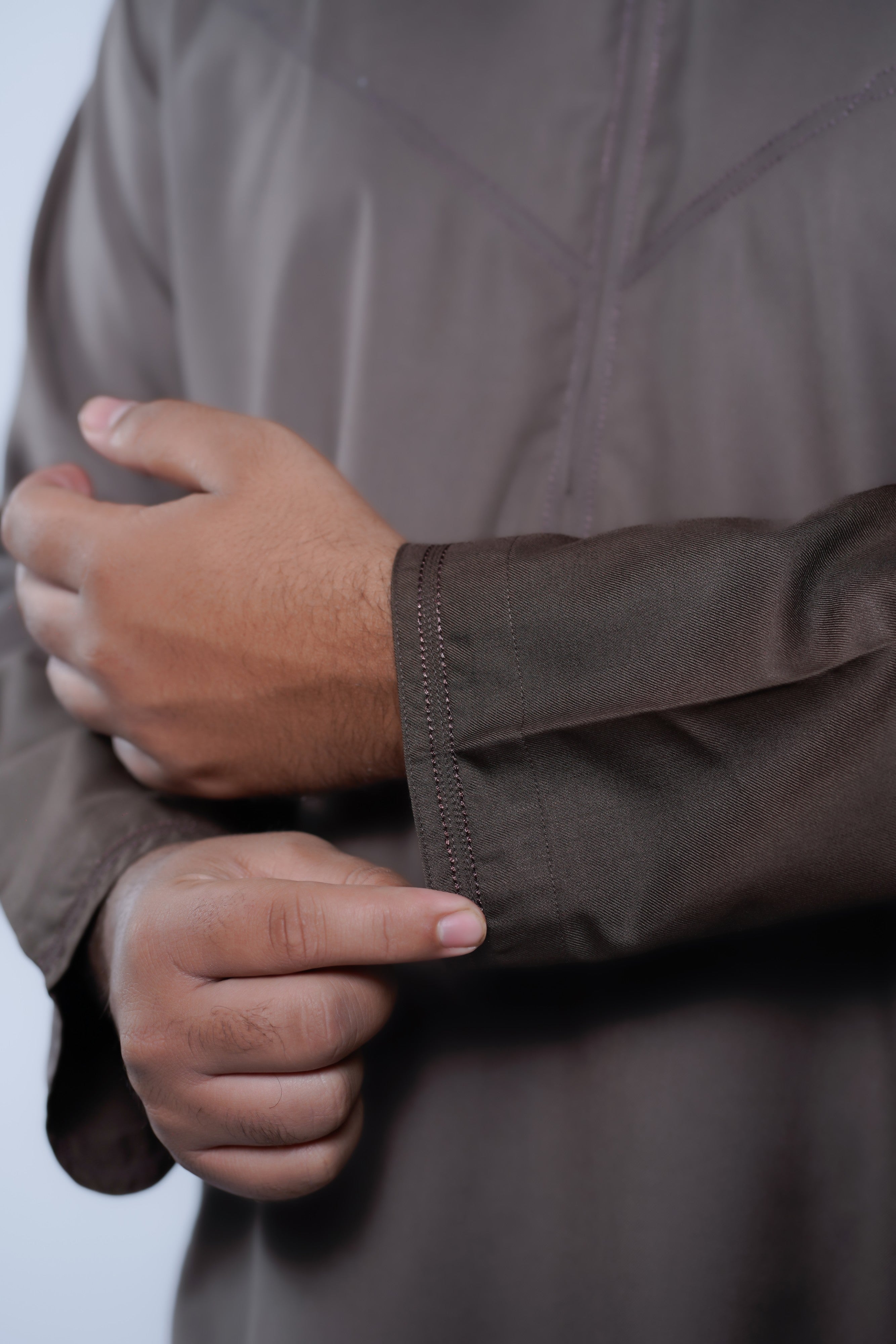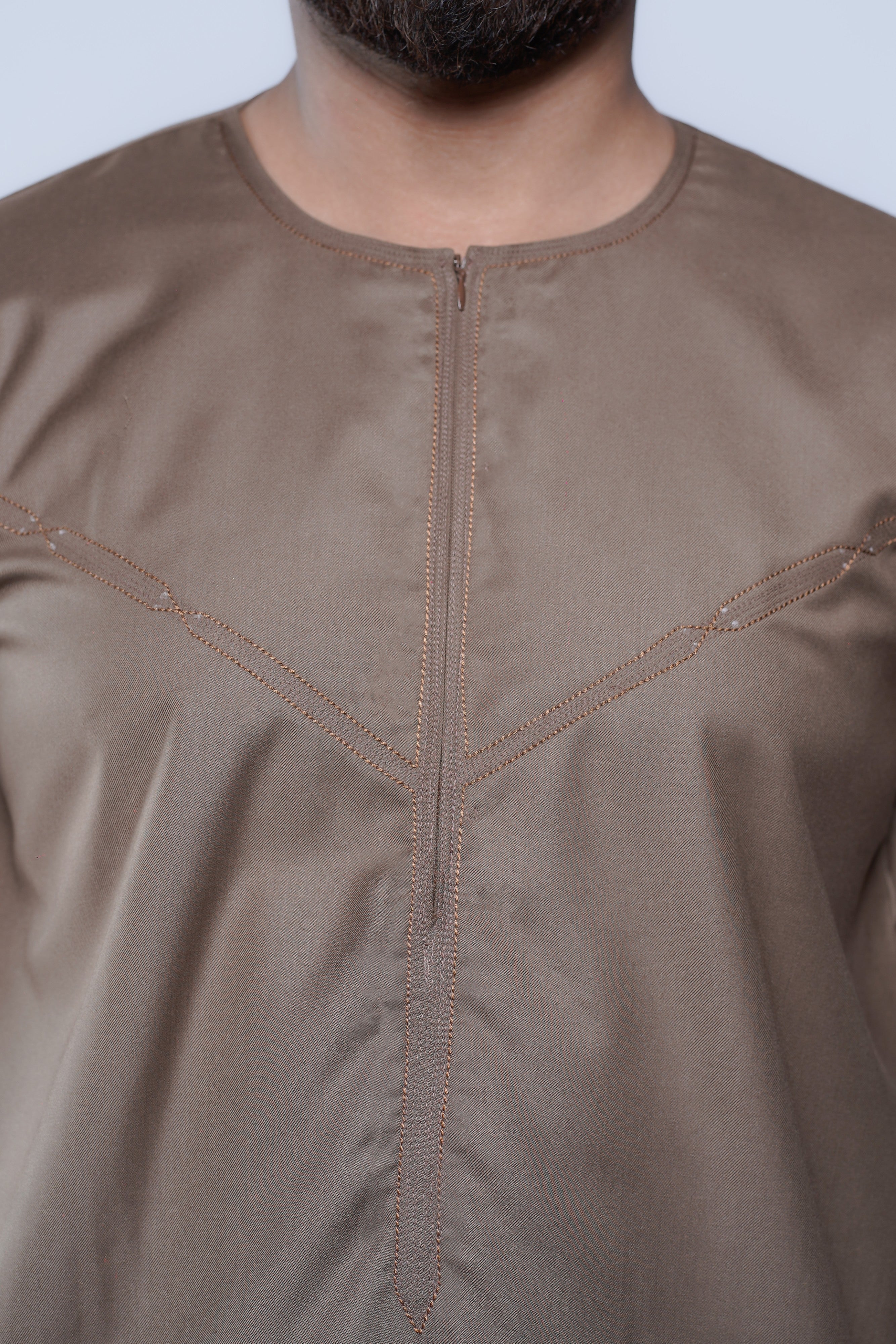 Made from high-quality, breathable fabric, this jubba ensures all-day comfort whether you're attending Jumu’ah prayers, Eid celebrations, weddings, or formal gatherings. The standout feature is the curved intricate jump stitch embroidery running along the chest panel, adding depth, texture, and a sophisticated decorative finish that reflects authentic Omani tailoring.