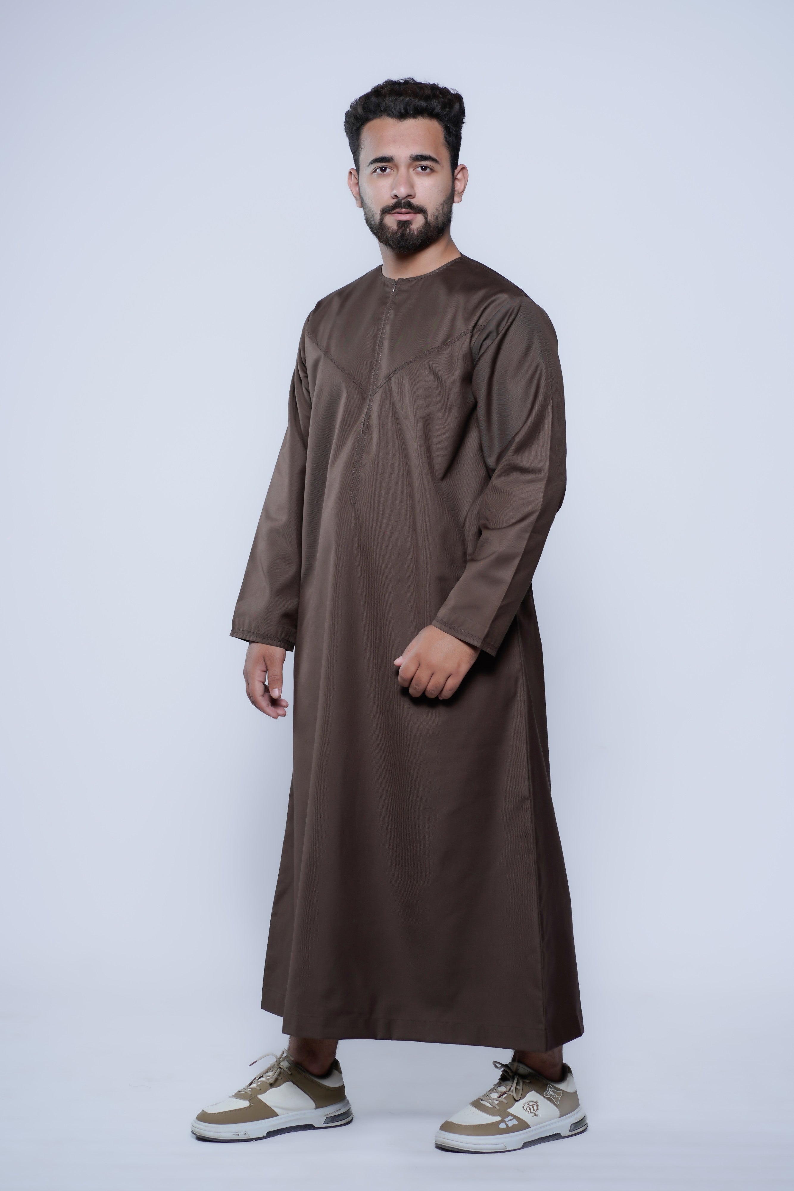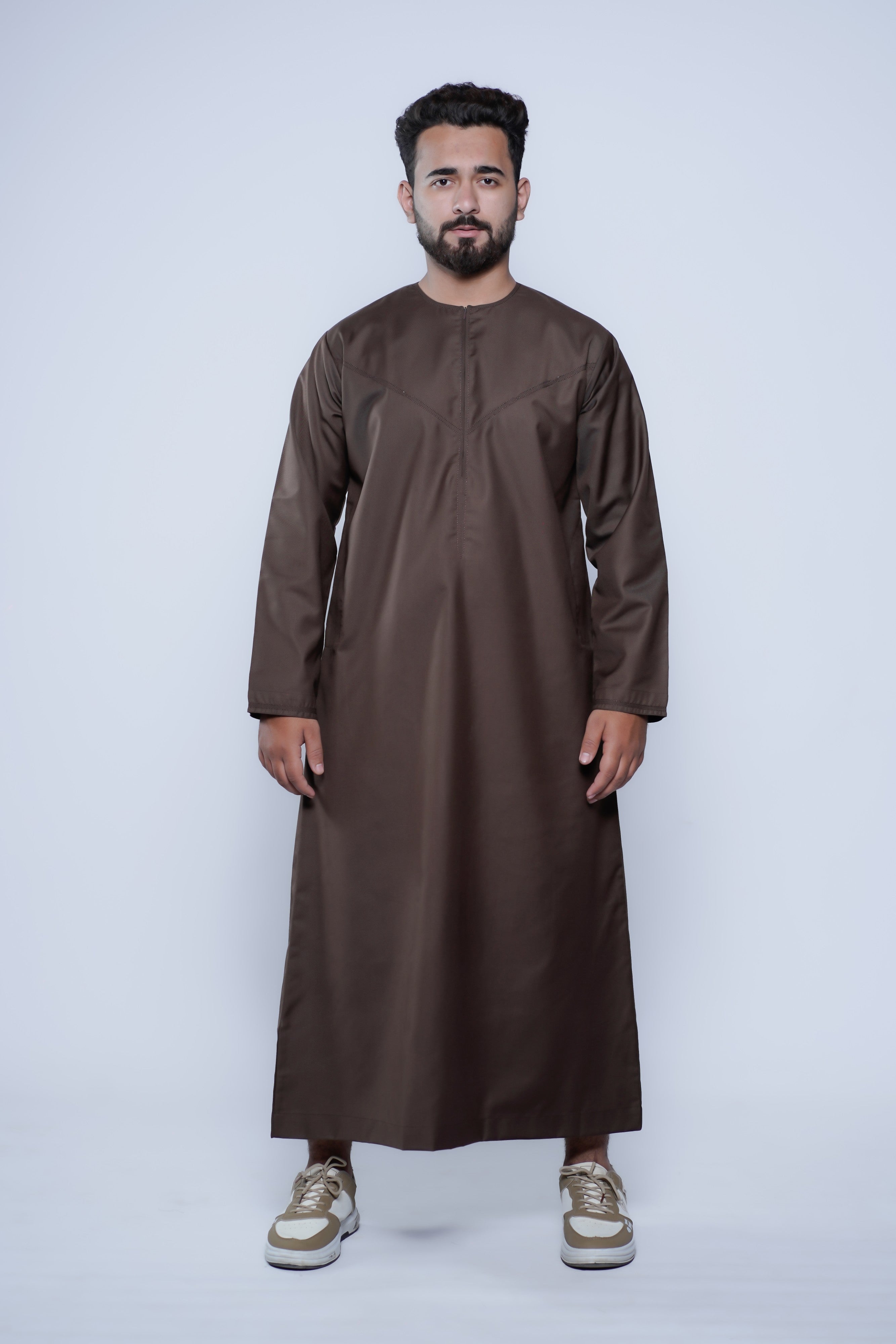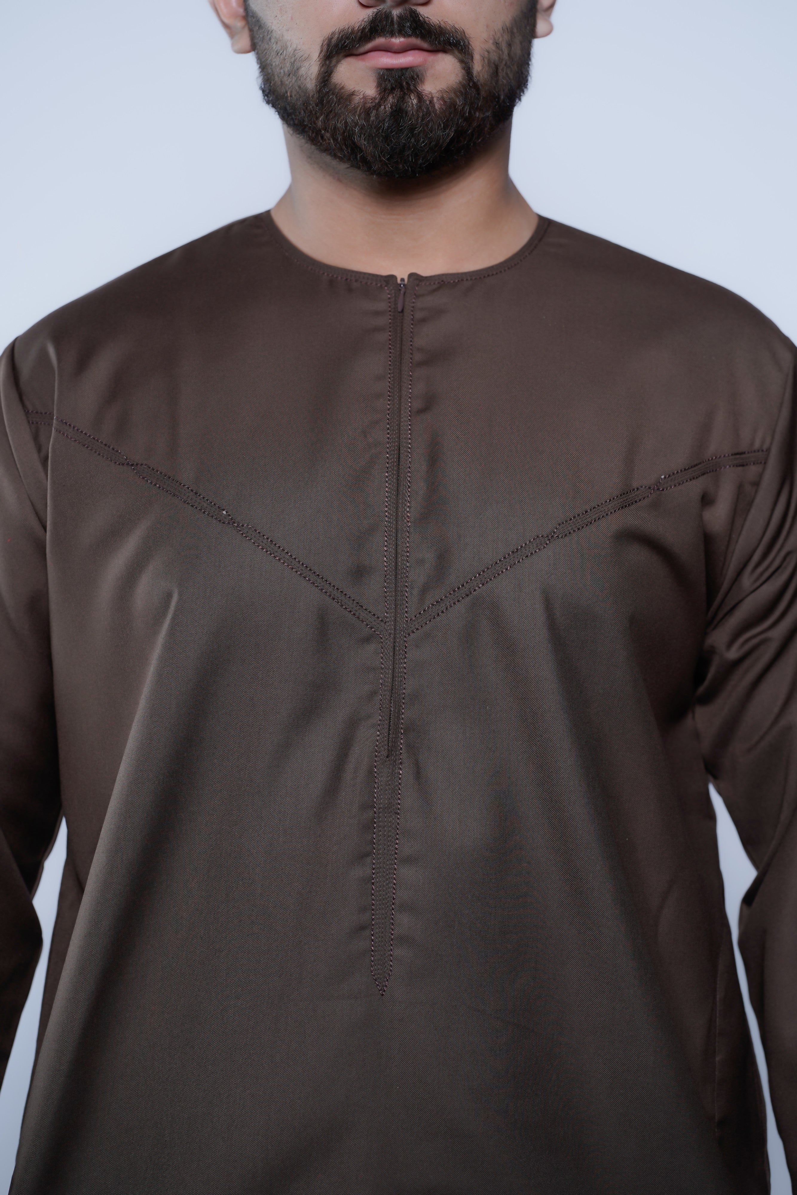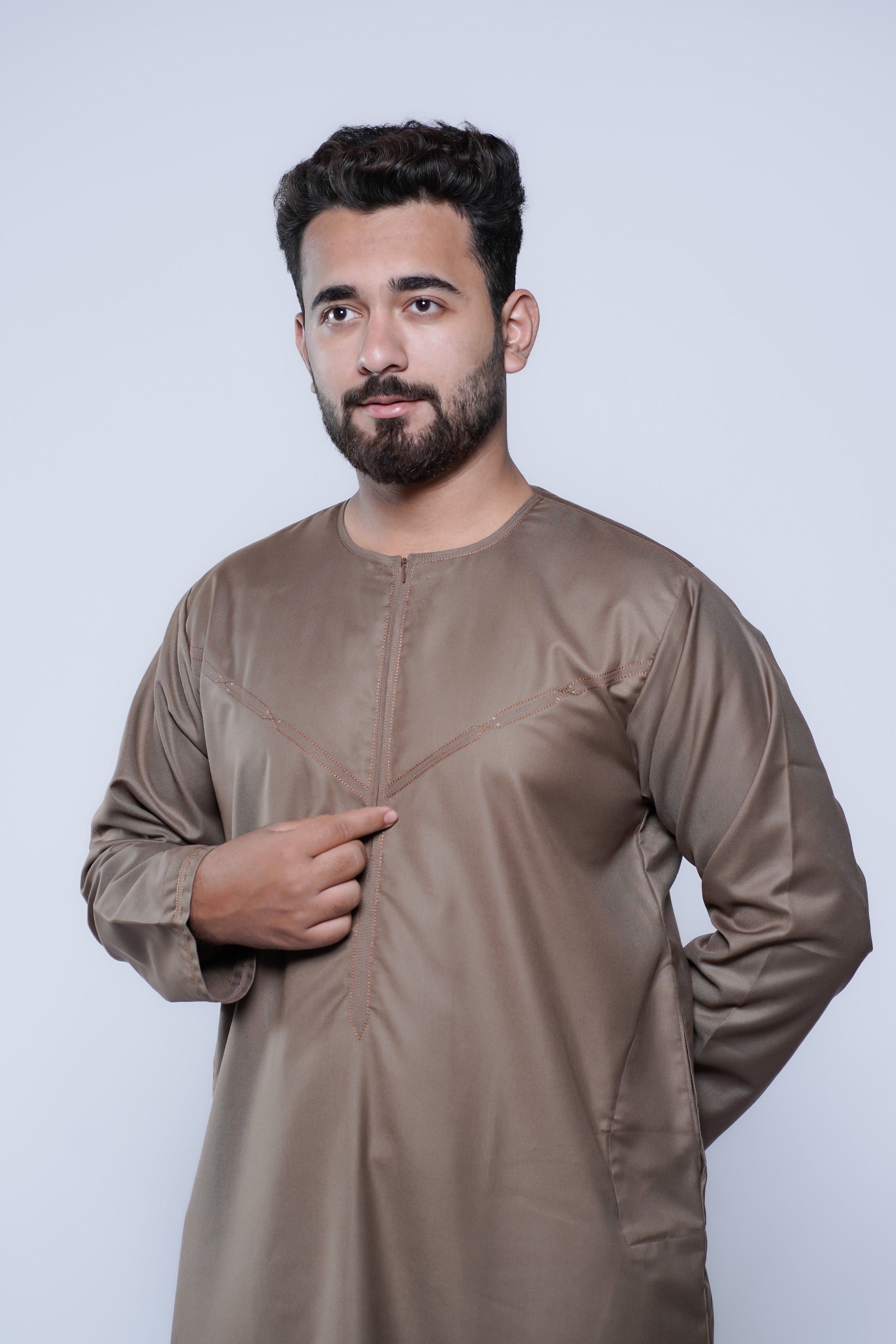 Tan Omani Shiny Zip Neck with V Neck Embroidery Design Jubba
