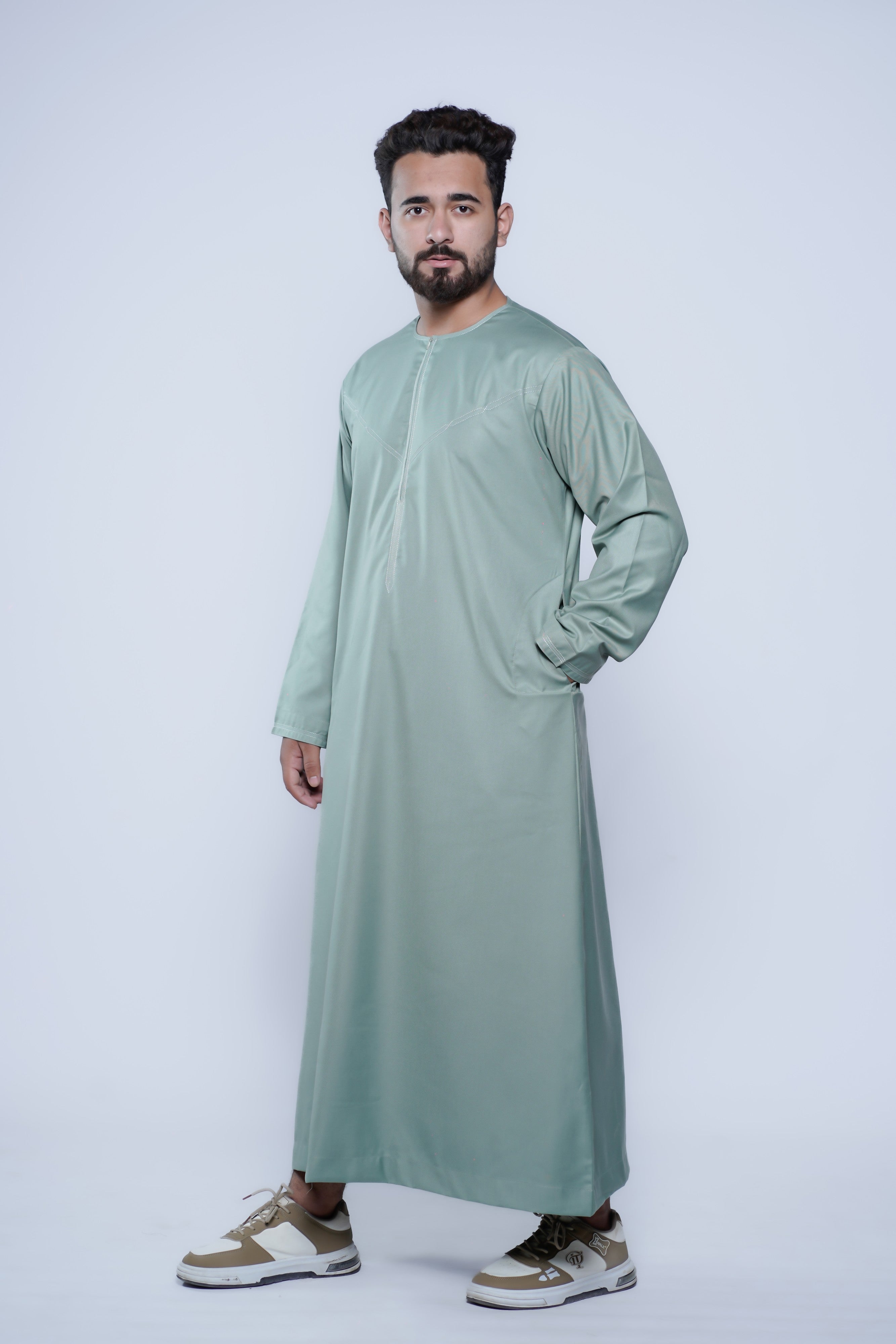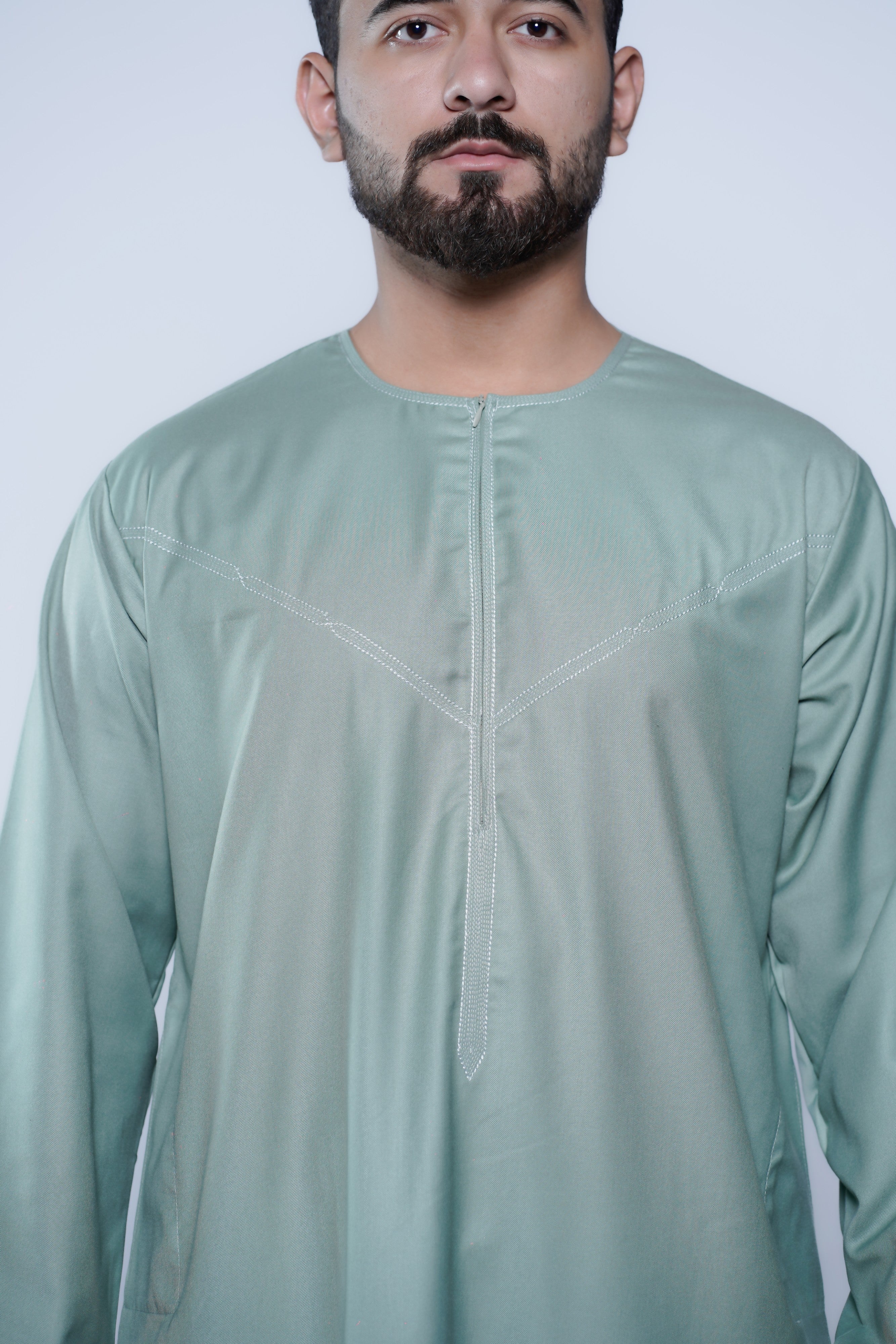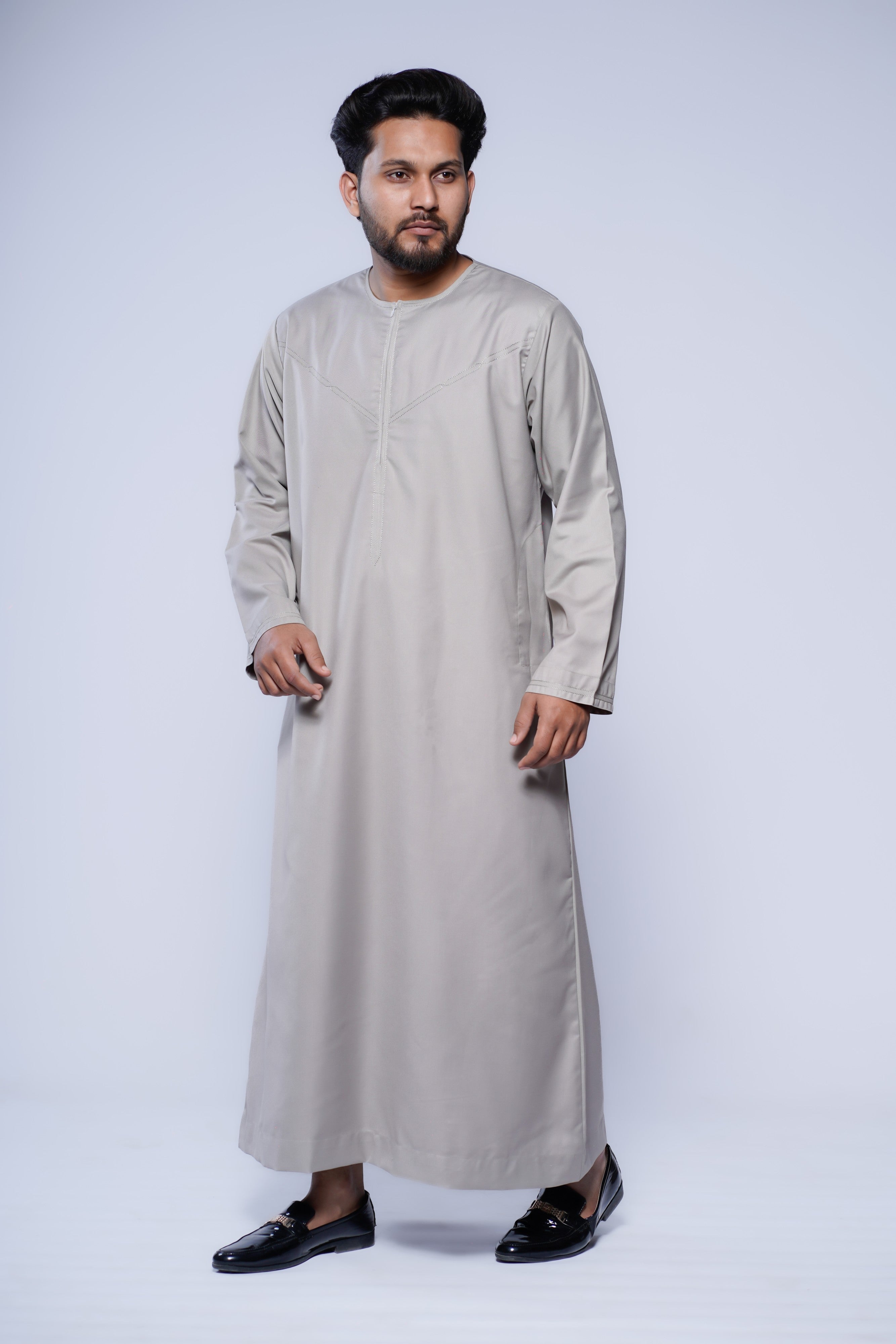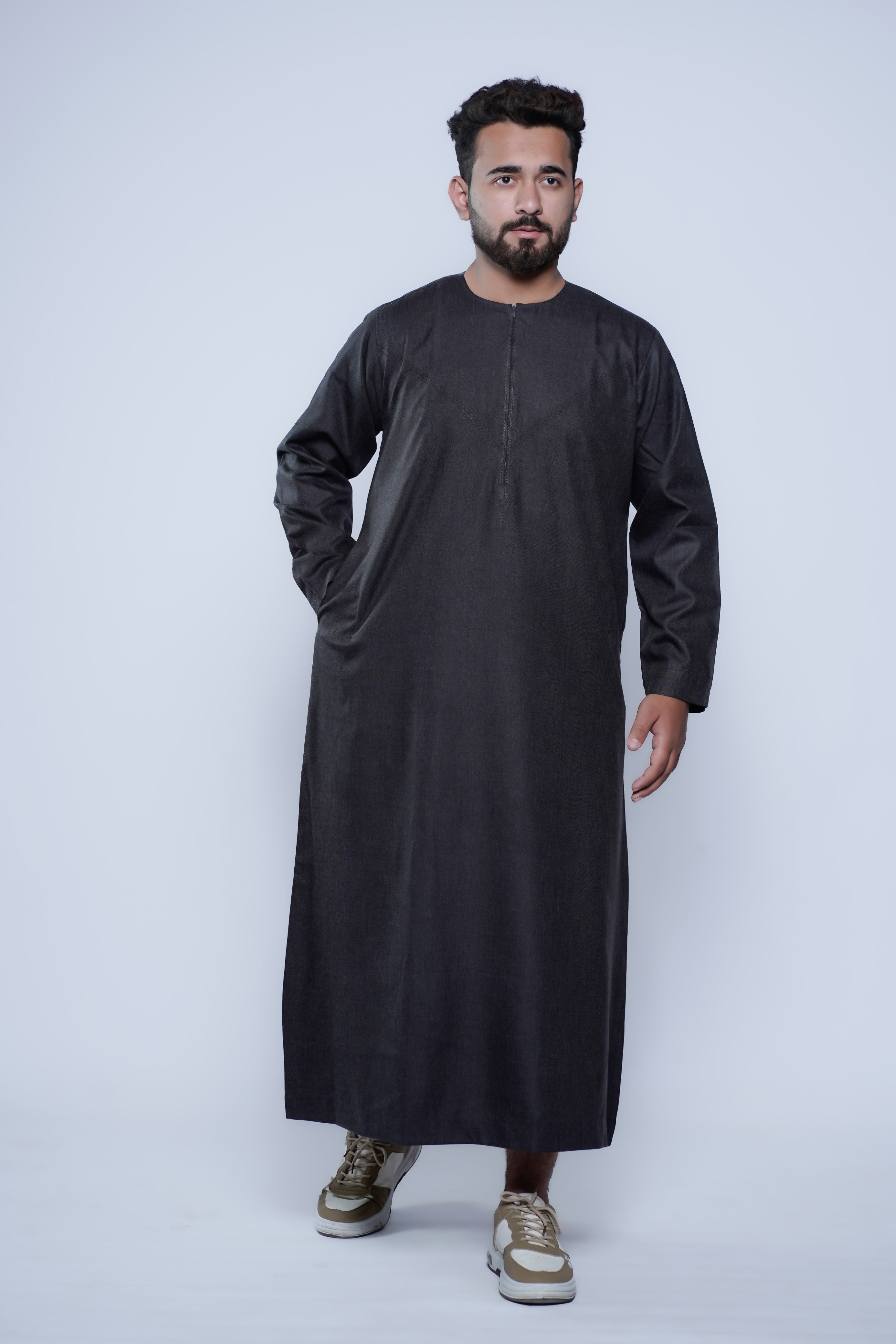 Tan Omani Shiny Zip Neck with V Neck Embroidery Design Jubba