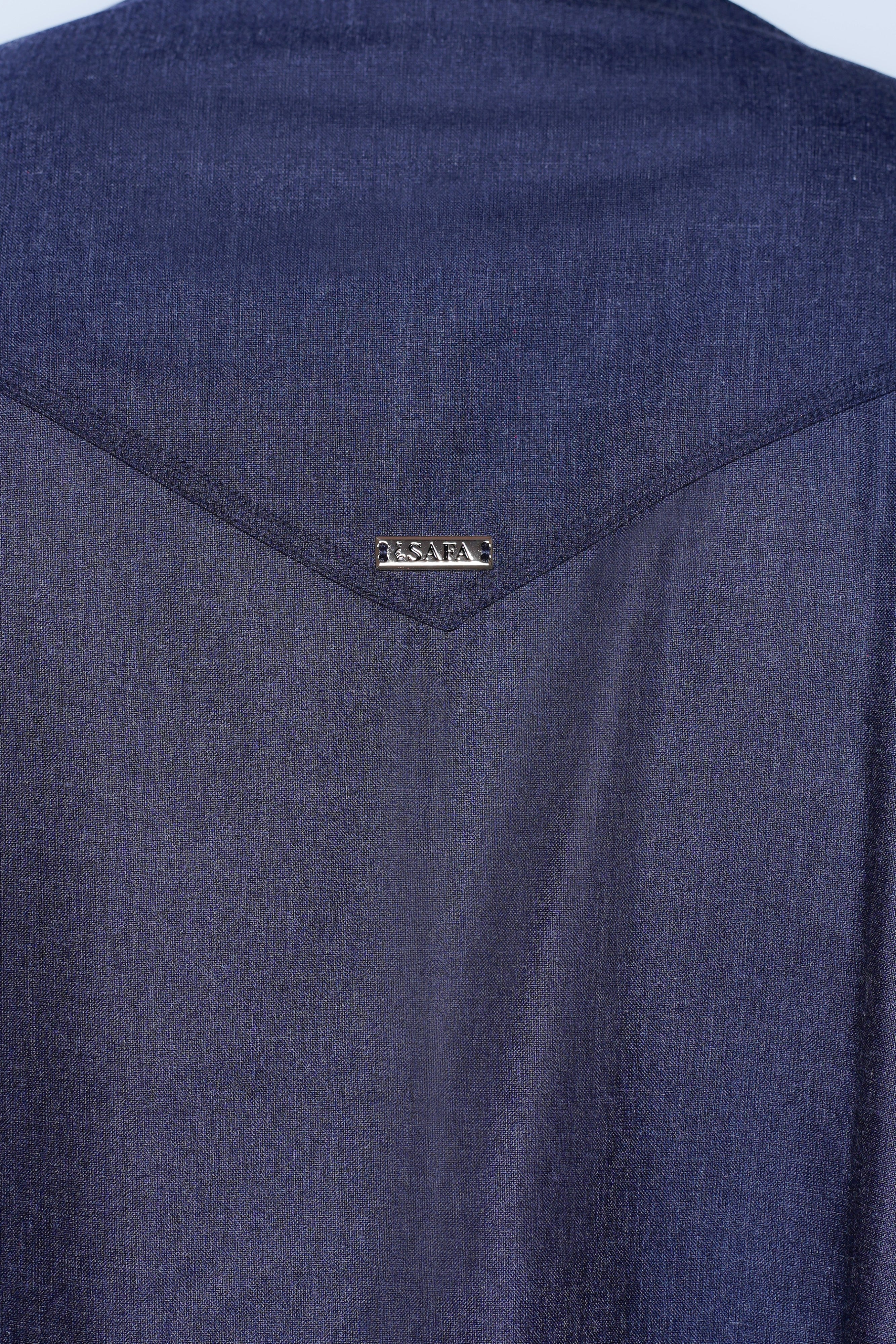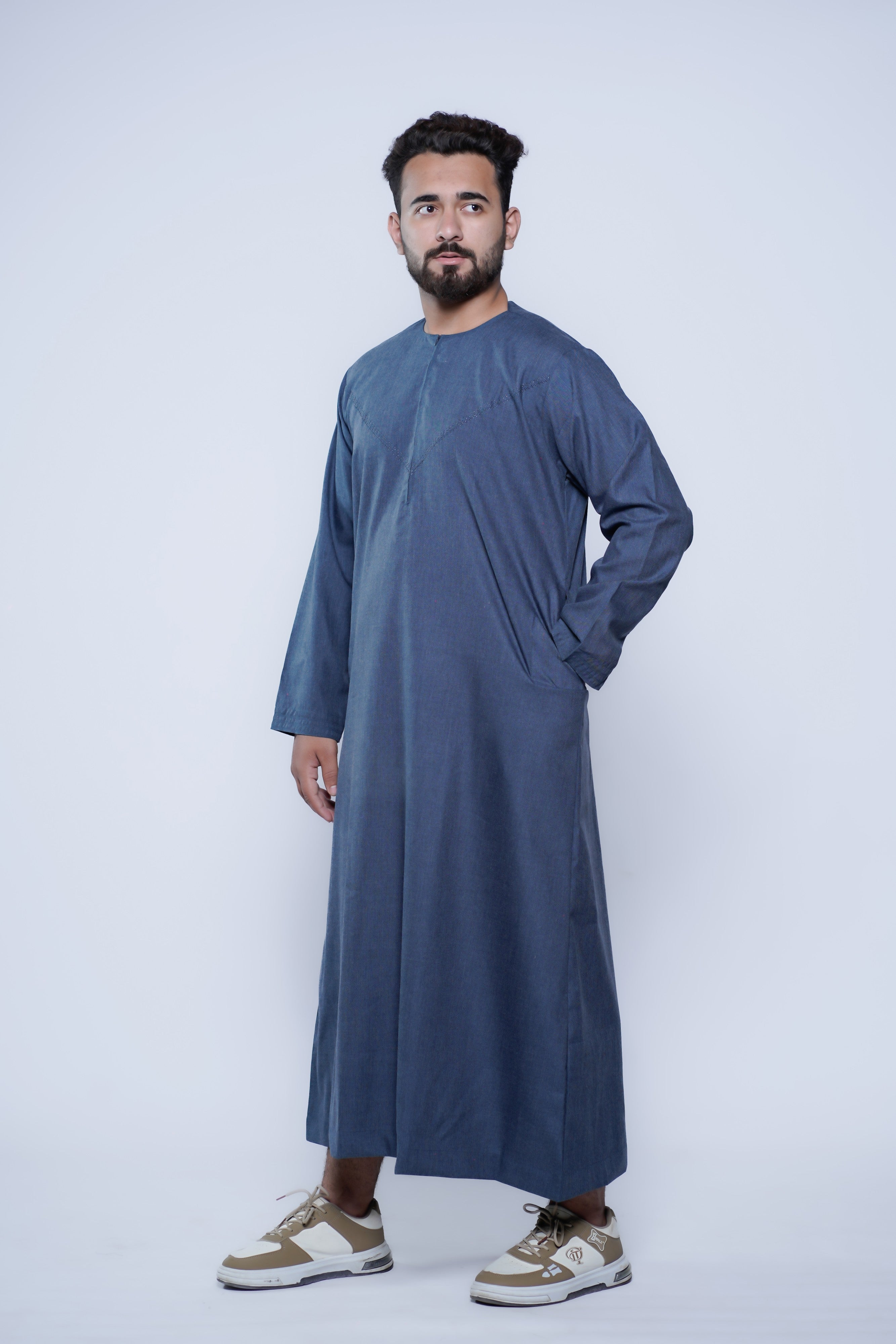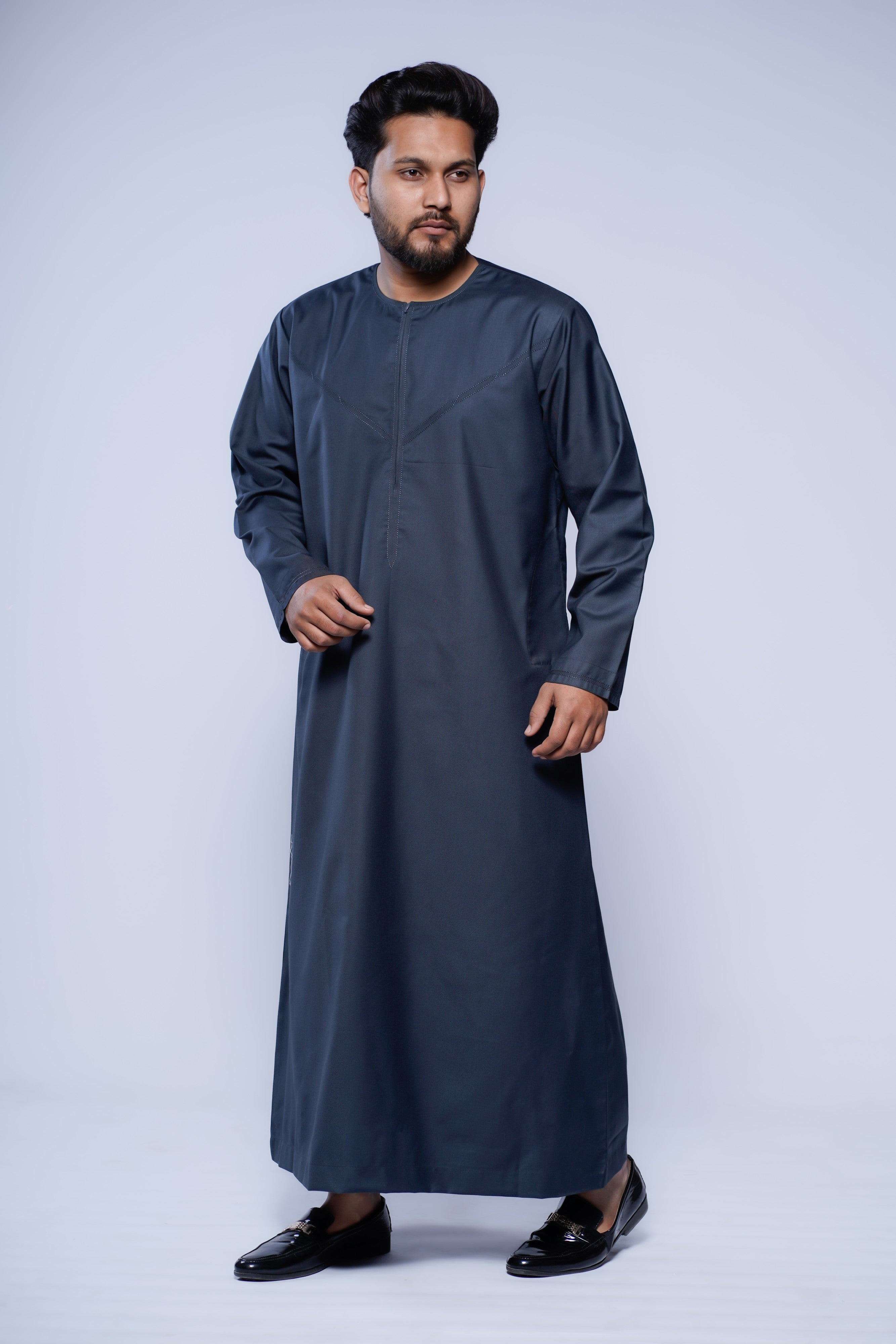 Navy Omani Round Neck Jubba with V Neck Stitched Embroidery