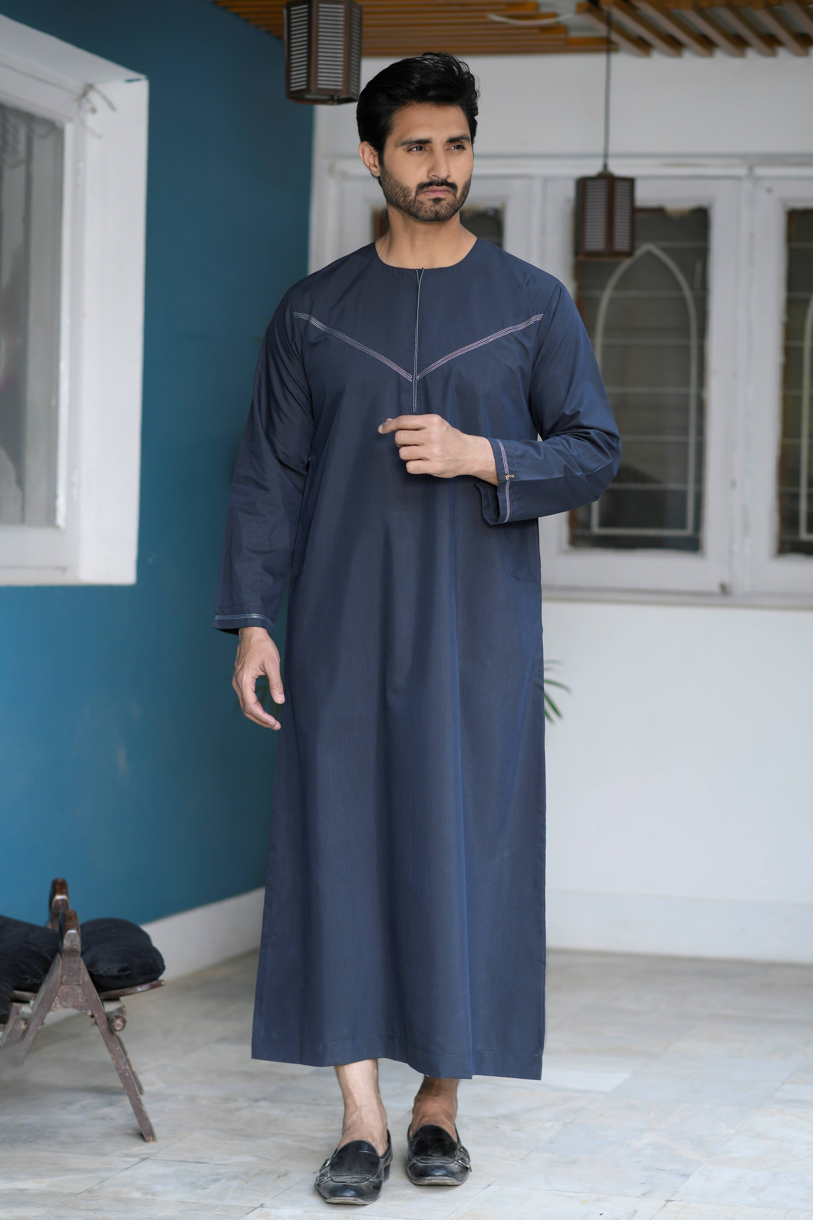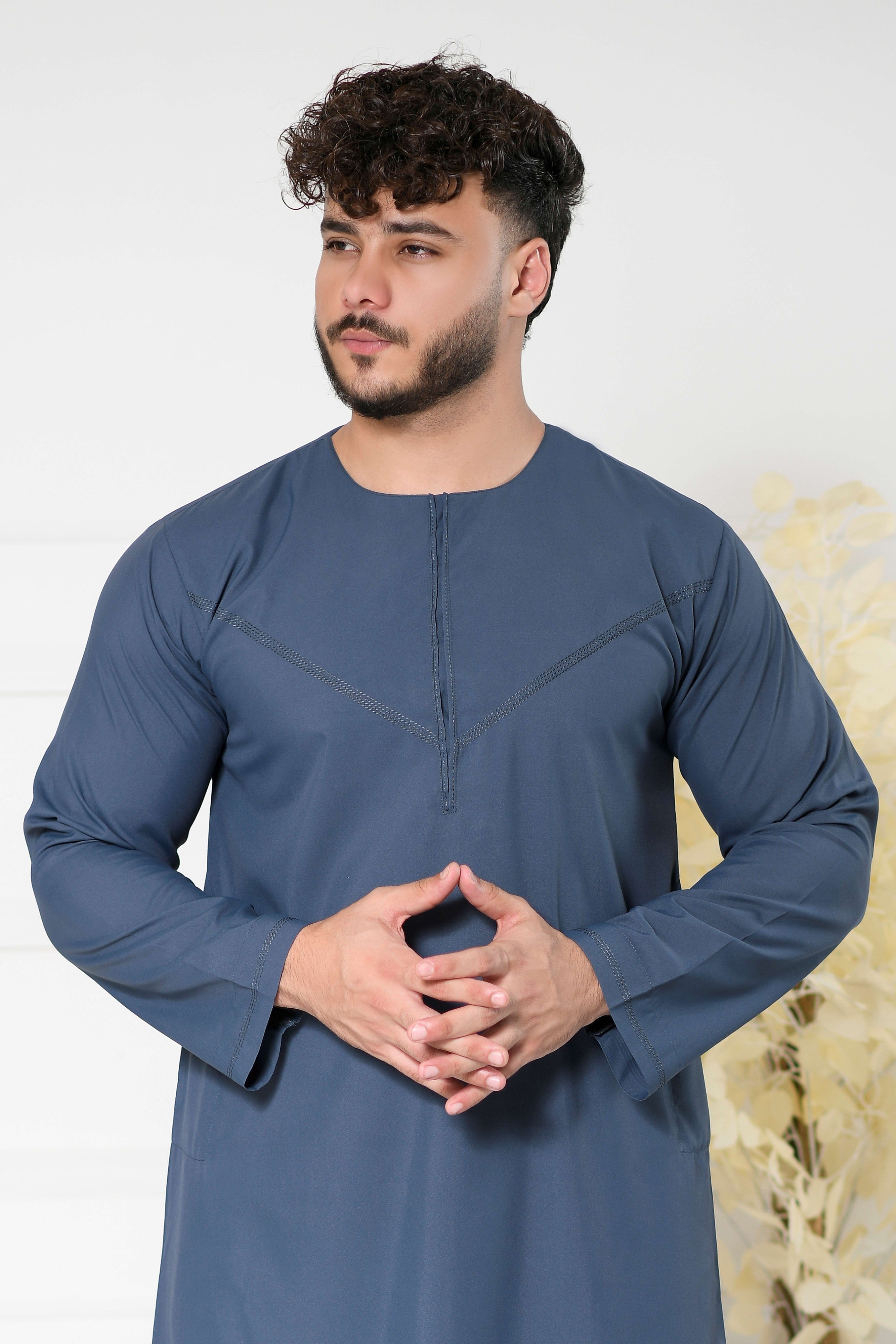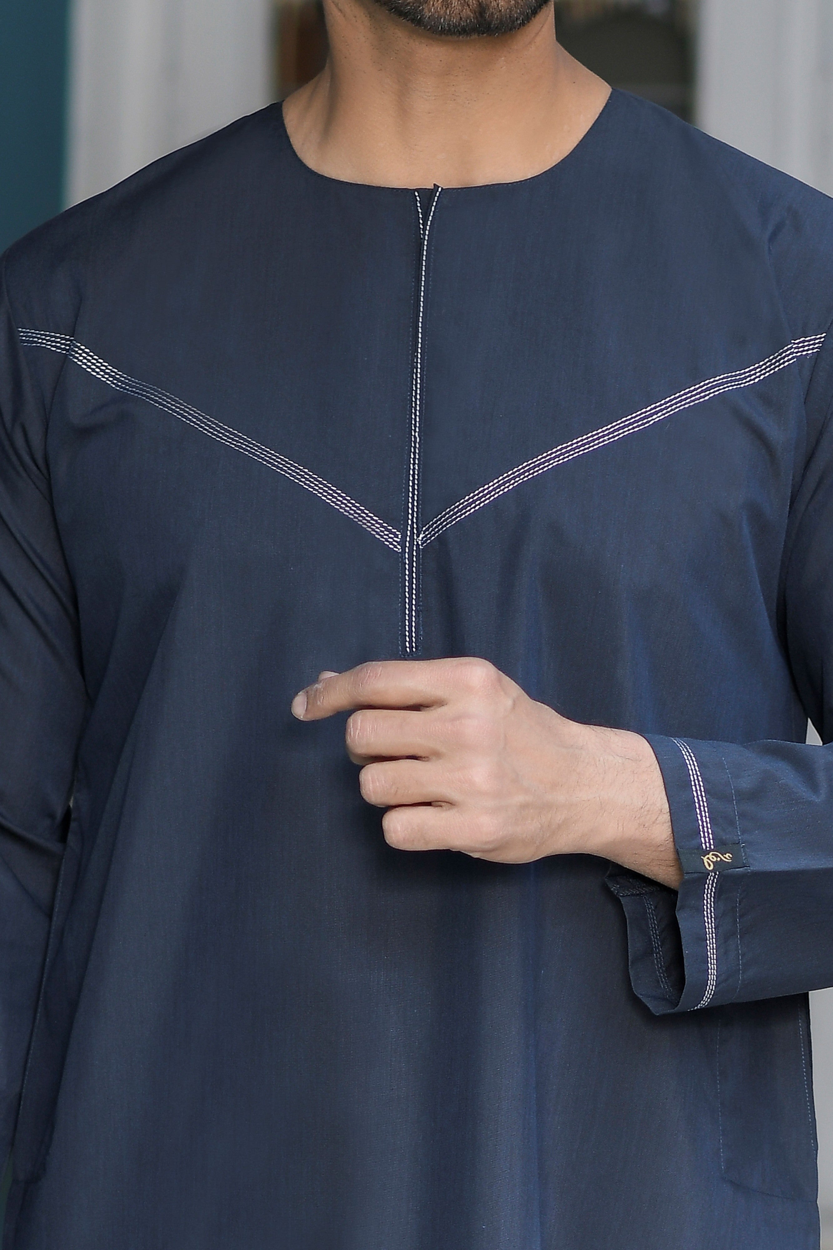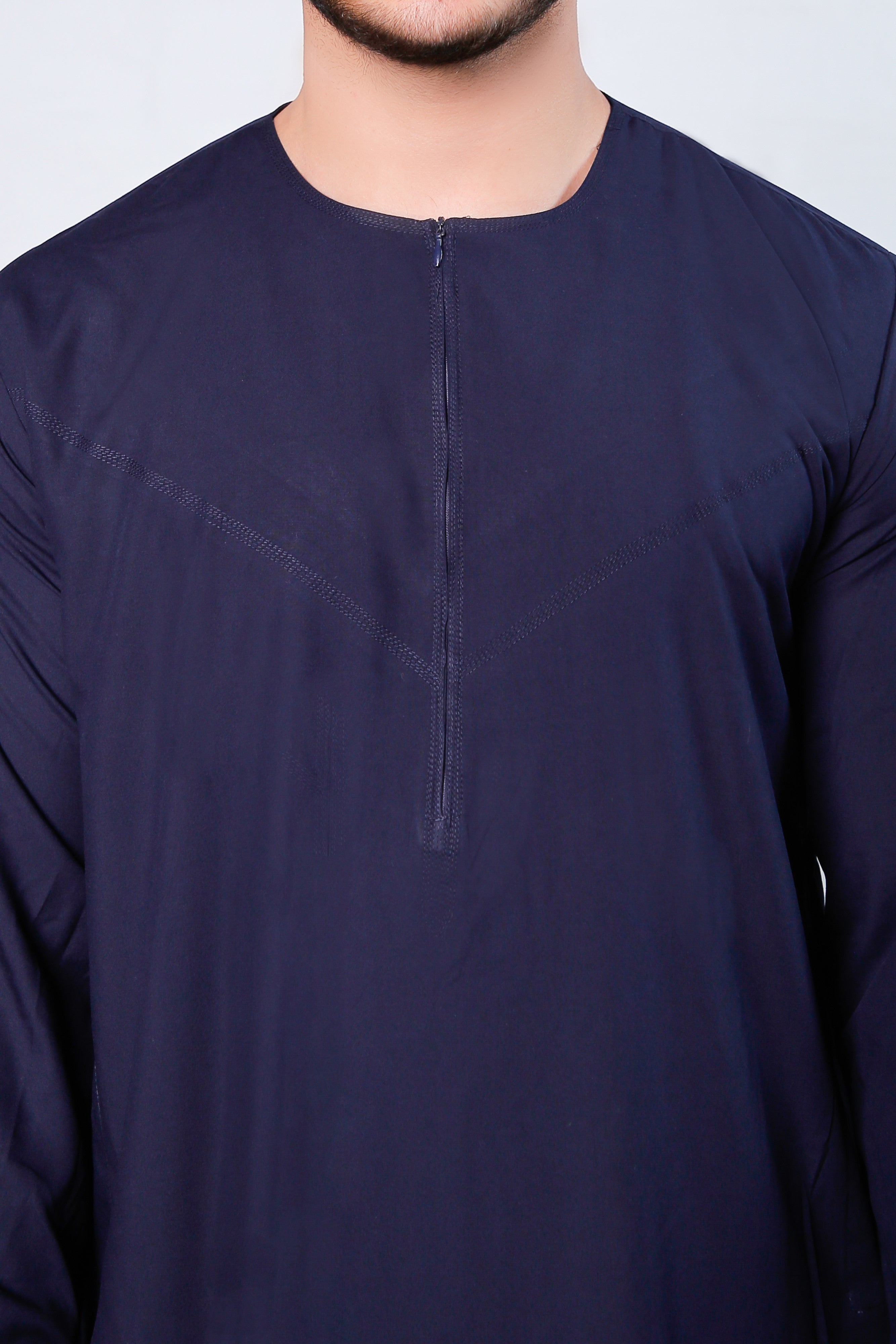 Navy Omani Round Neck Jubba with V Neck Stitched Embroidery