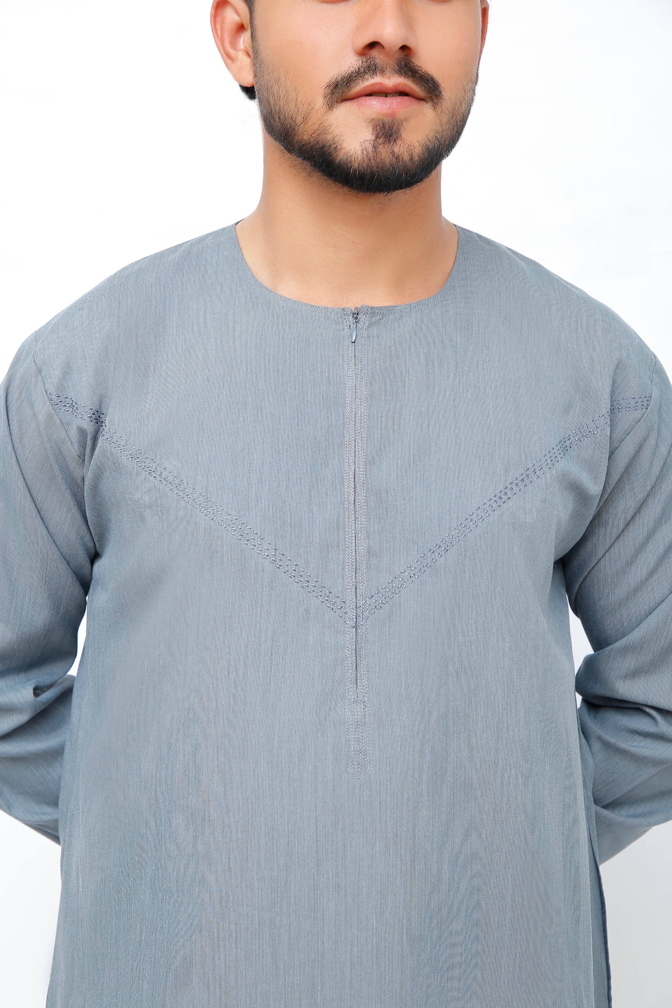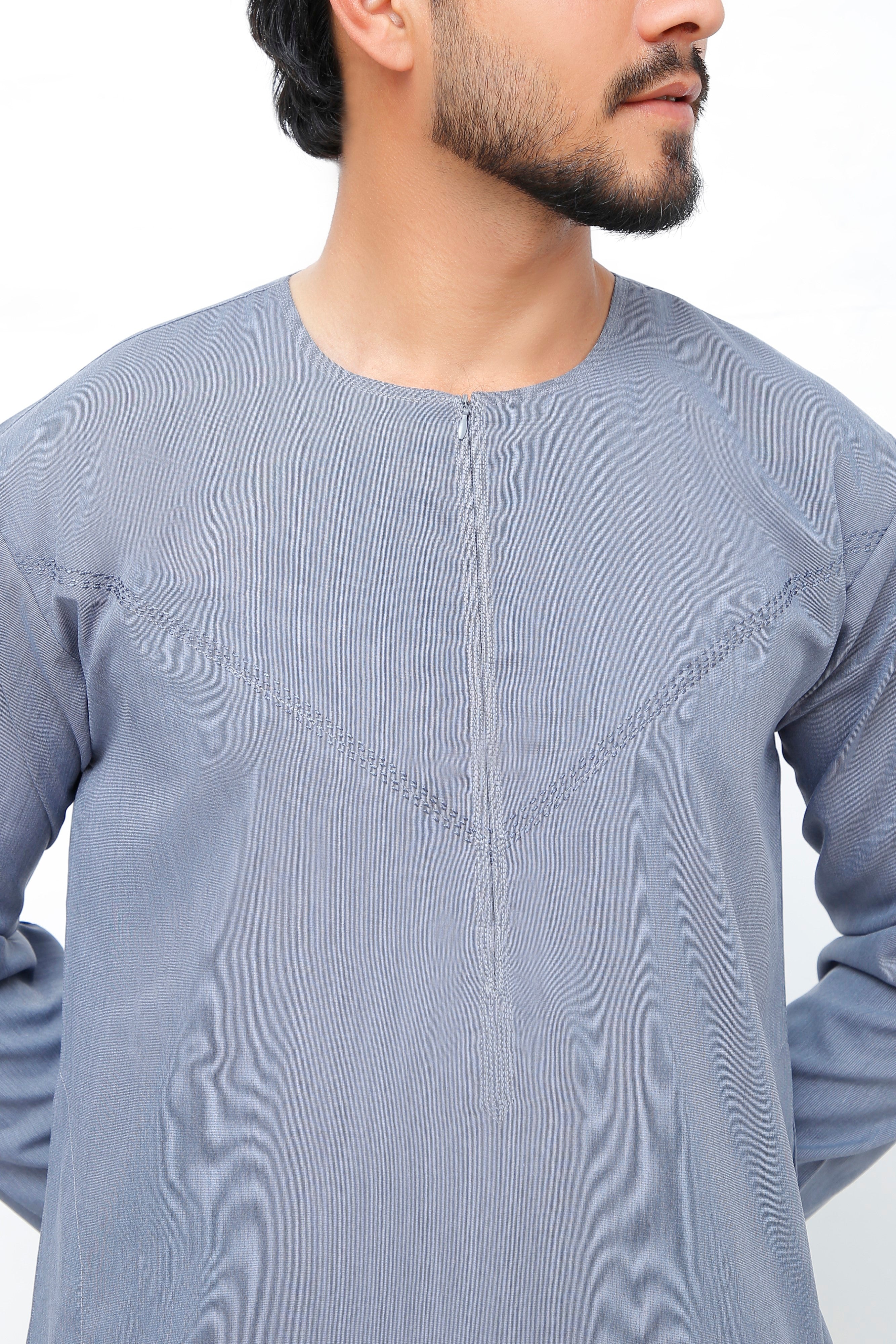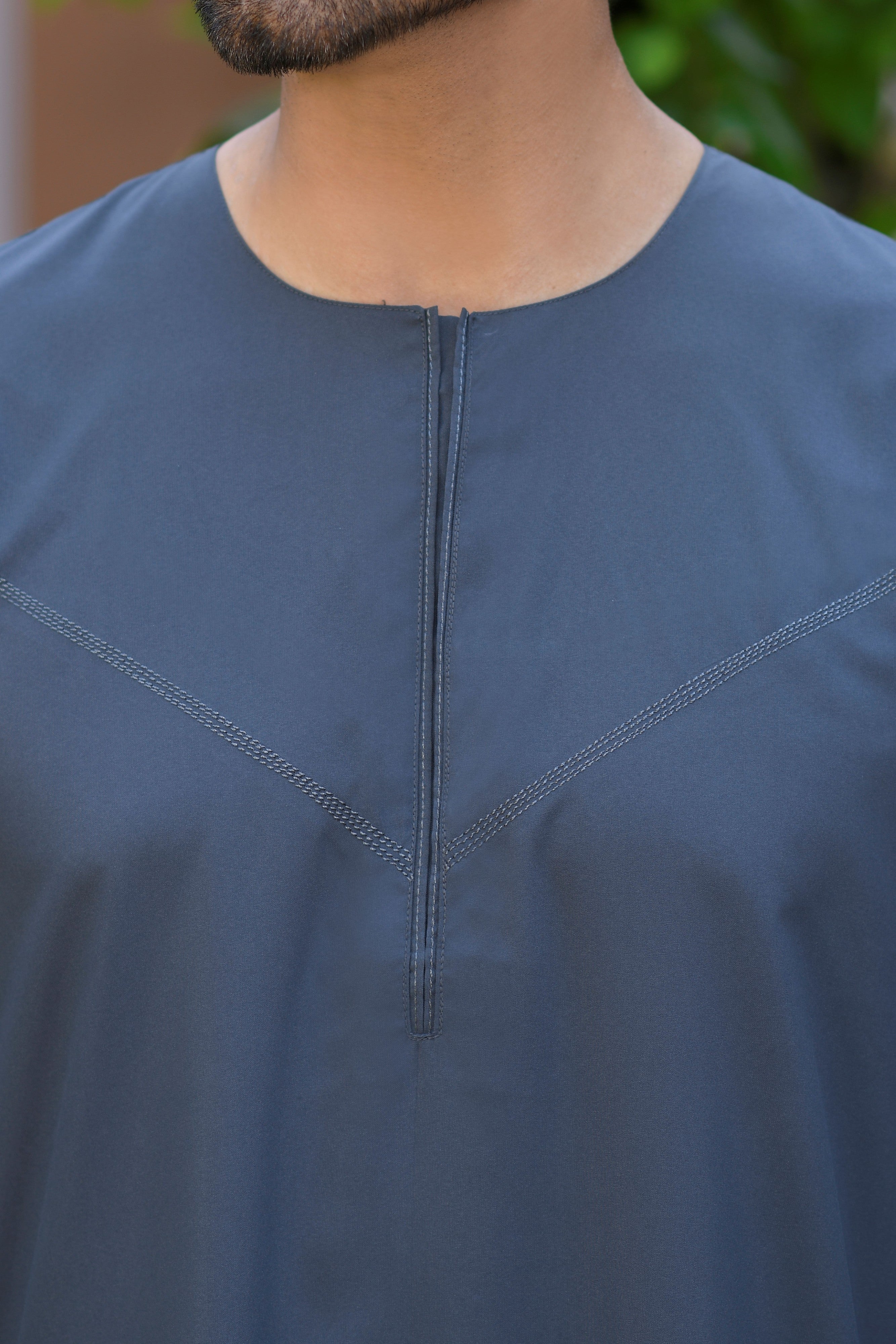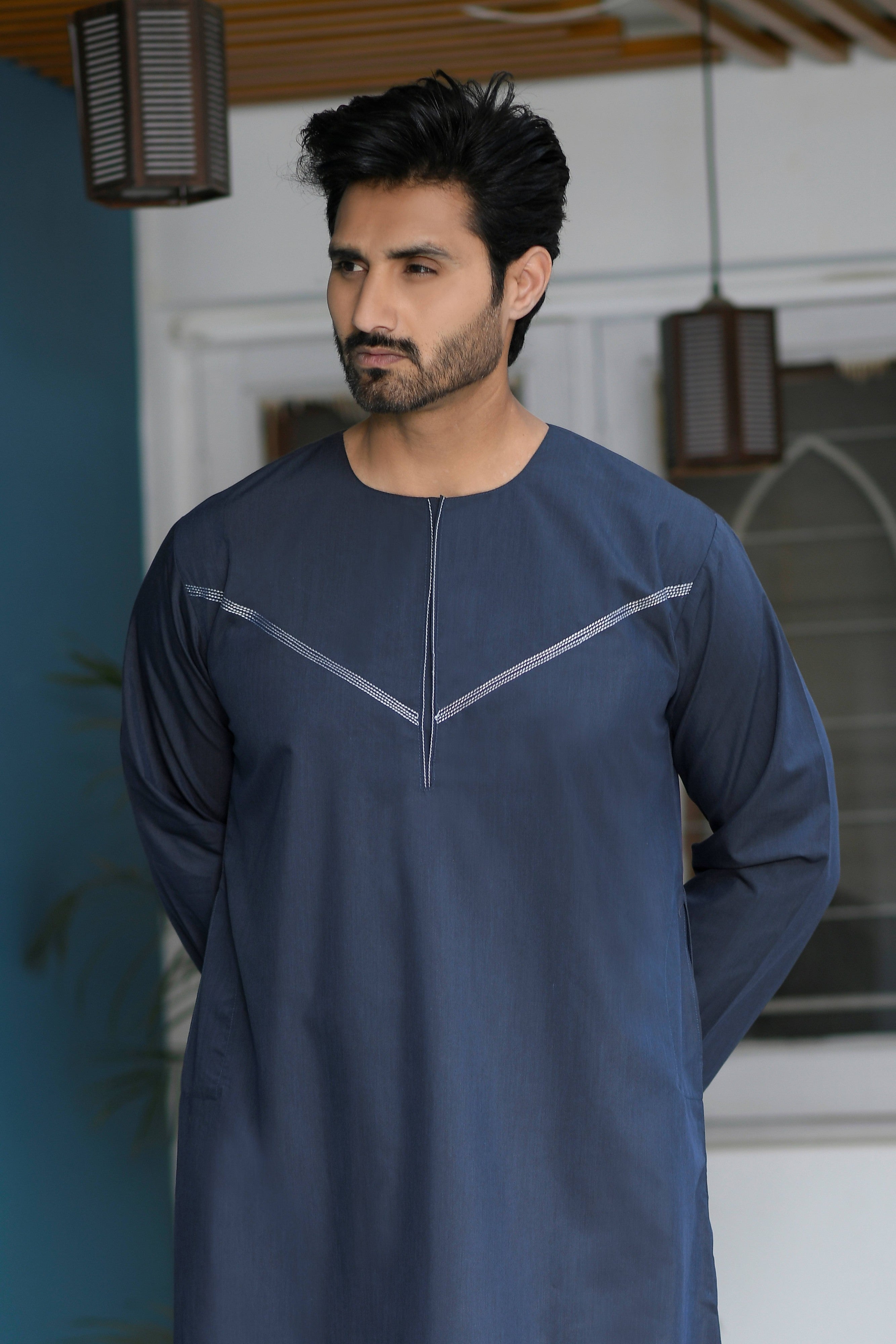 Navy Omani Round Neck Jubba with V Neck Stitched Embroidery