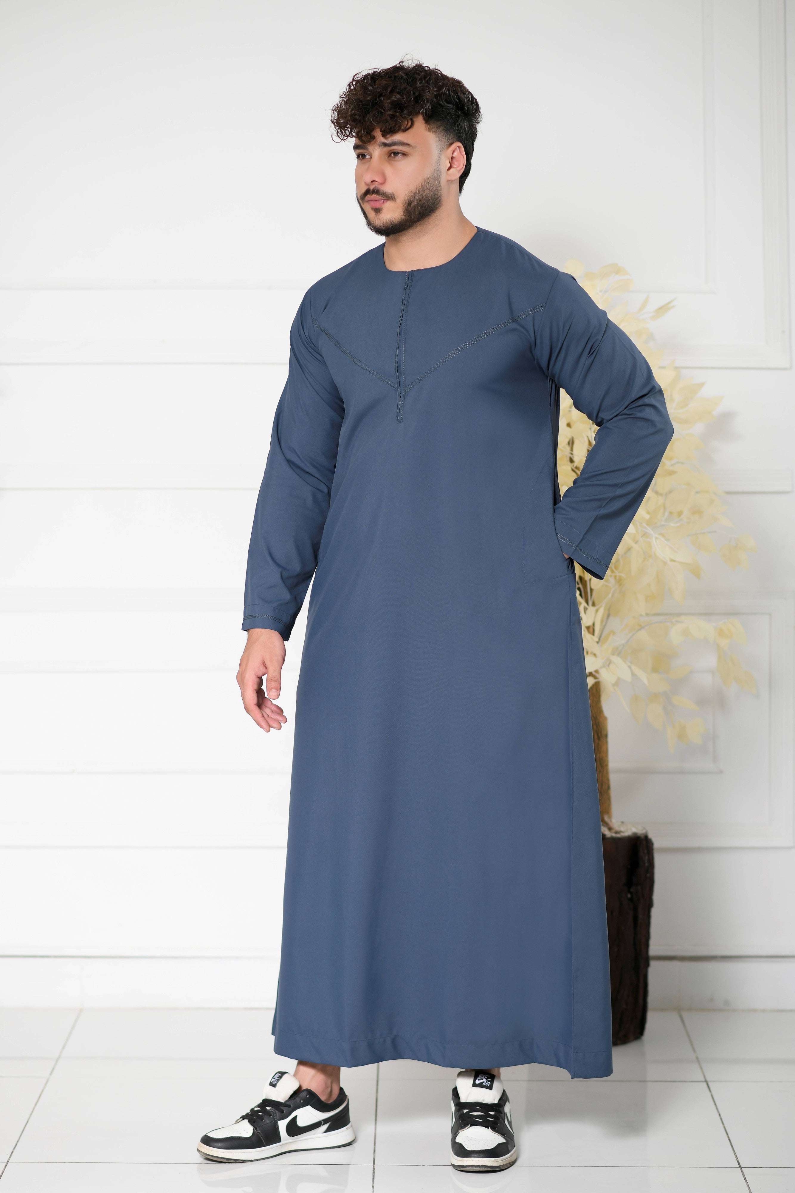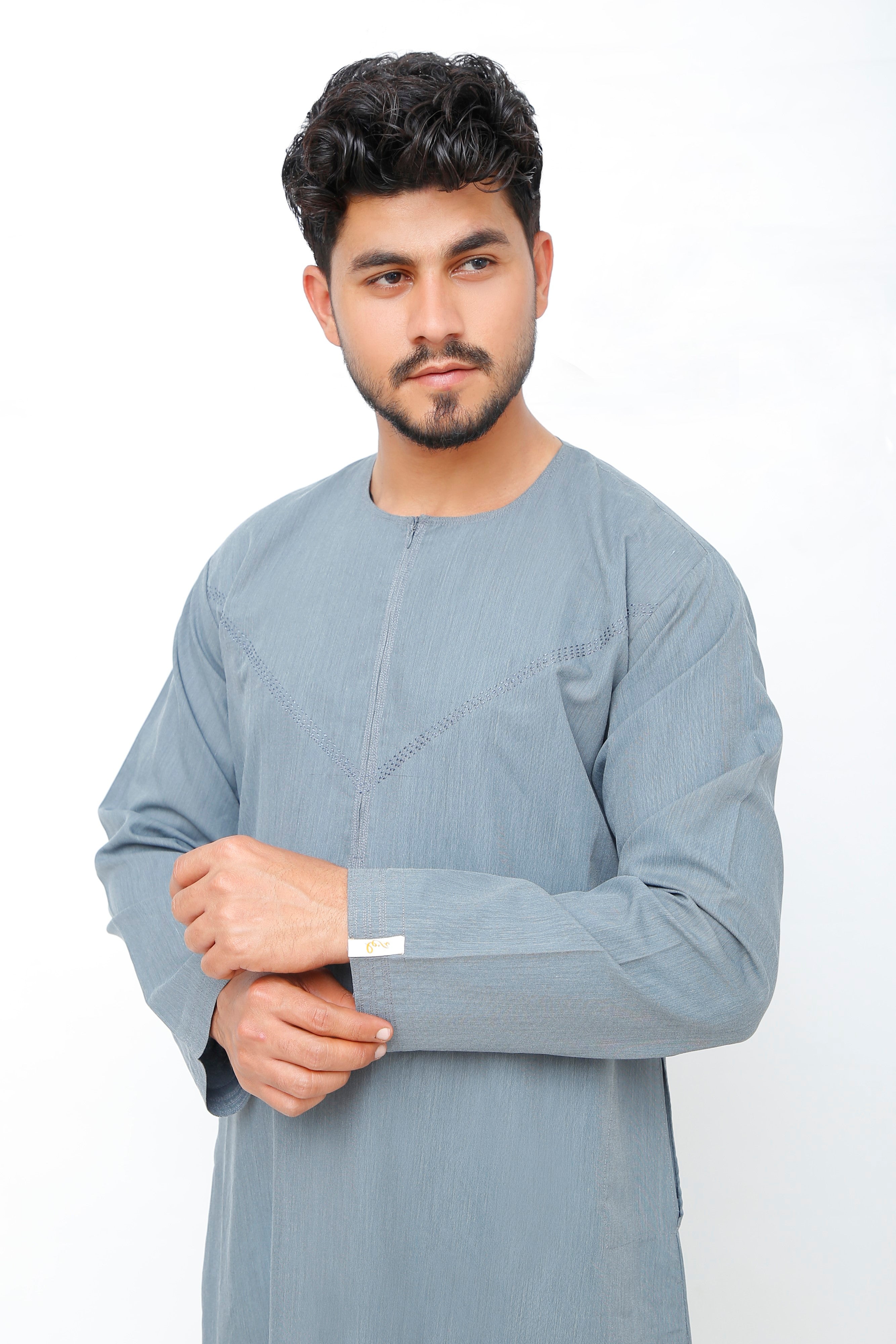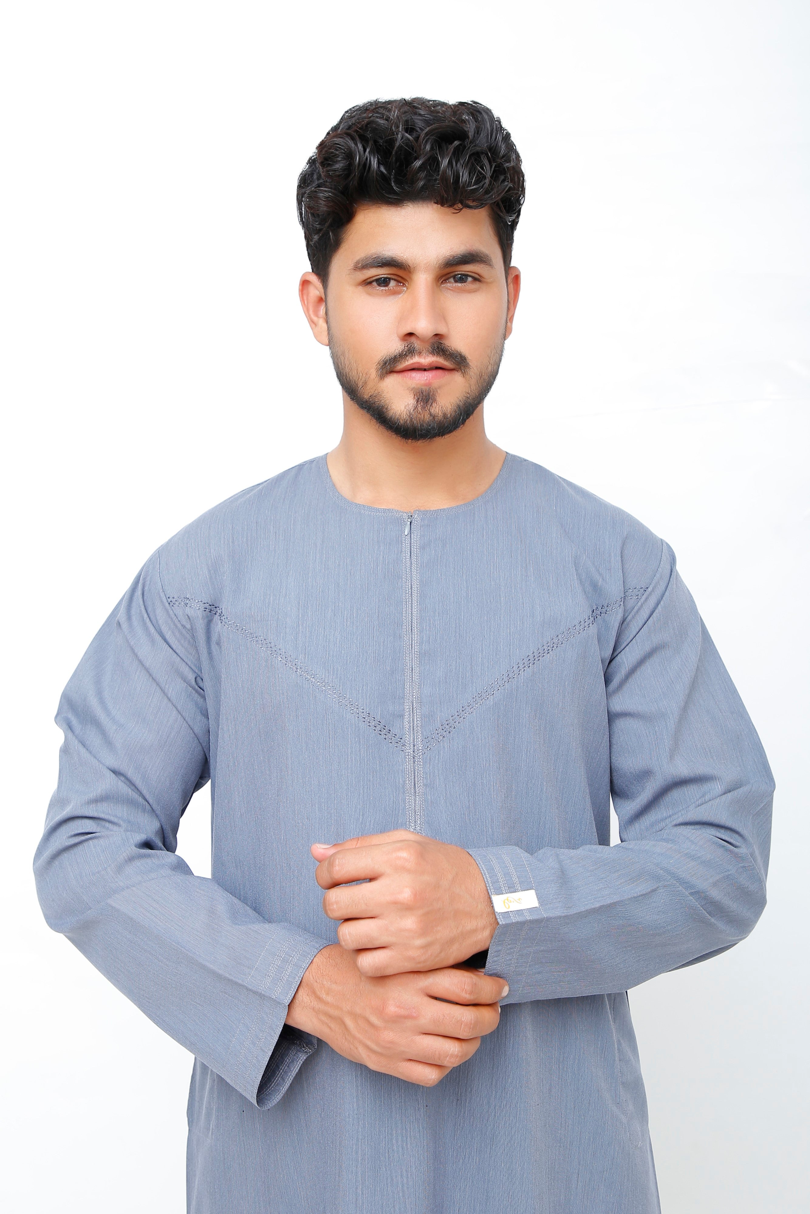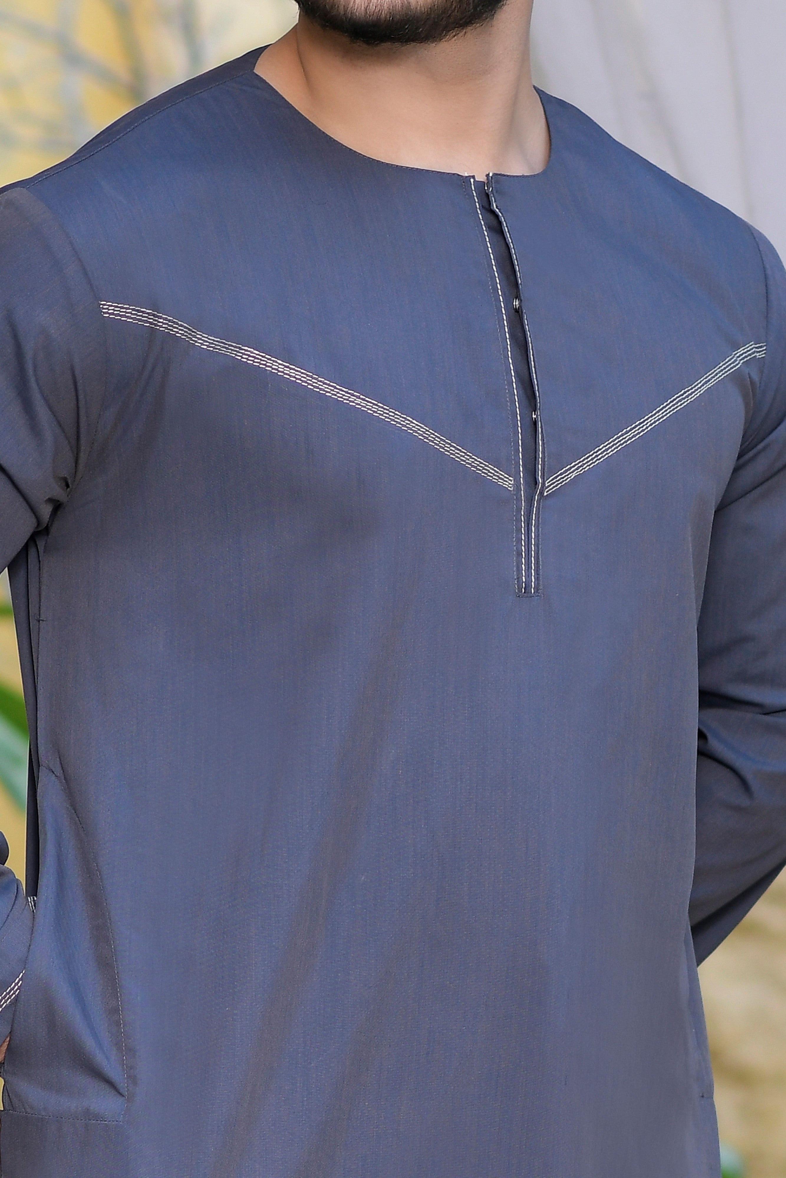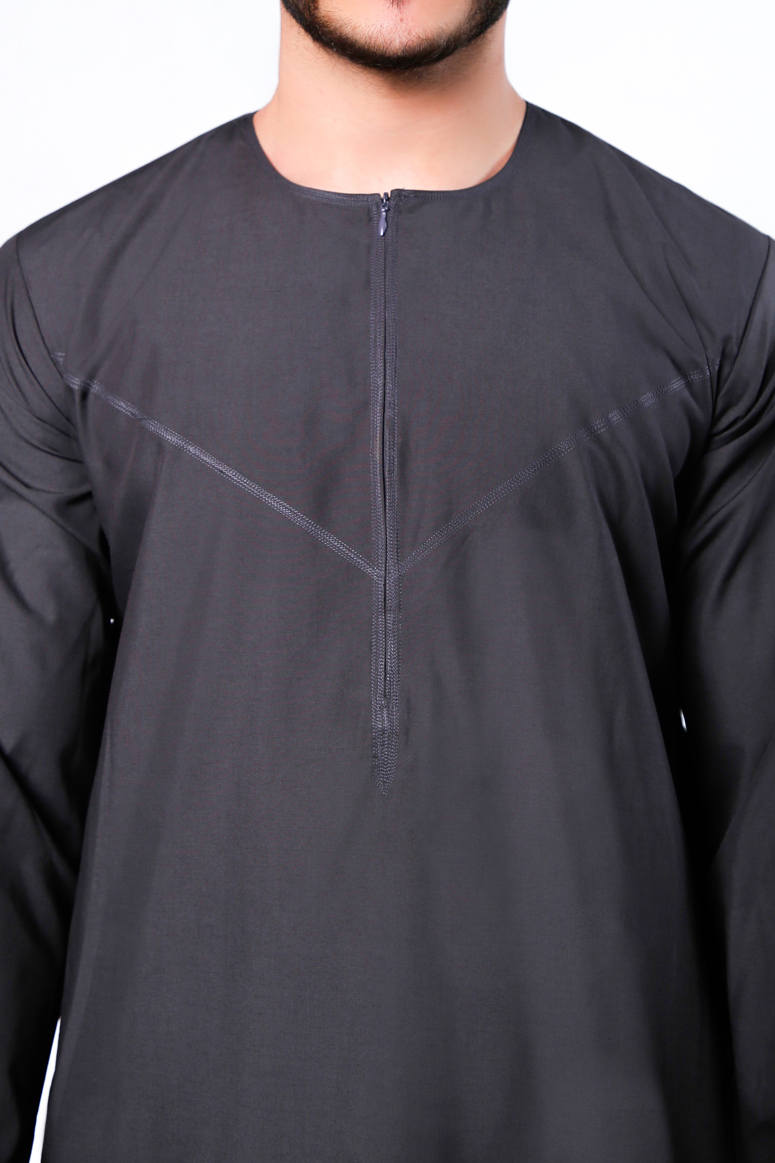 Navy Omani Round Neck Jubba with V Neck Stitched Embroidery