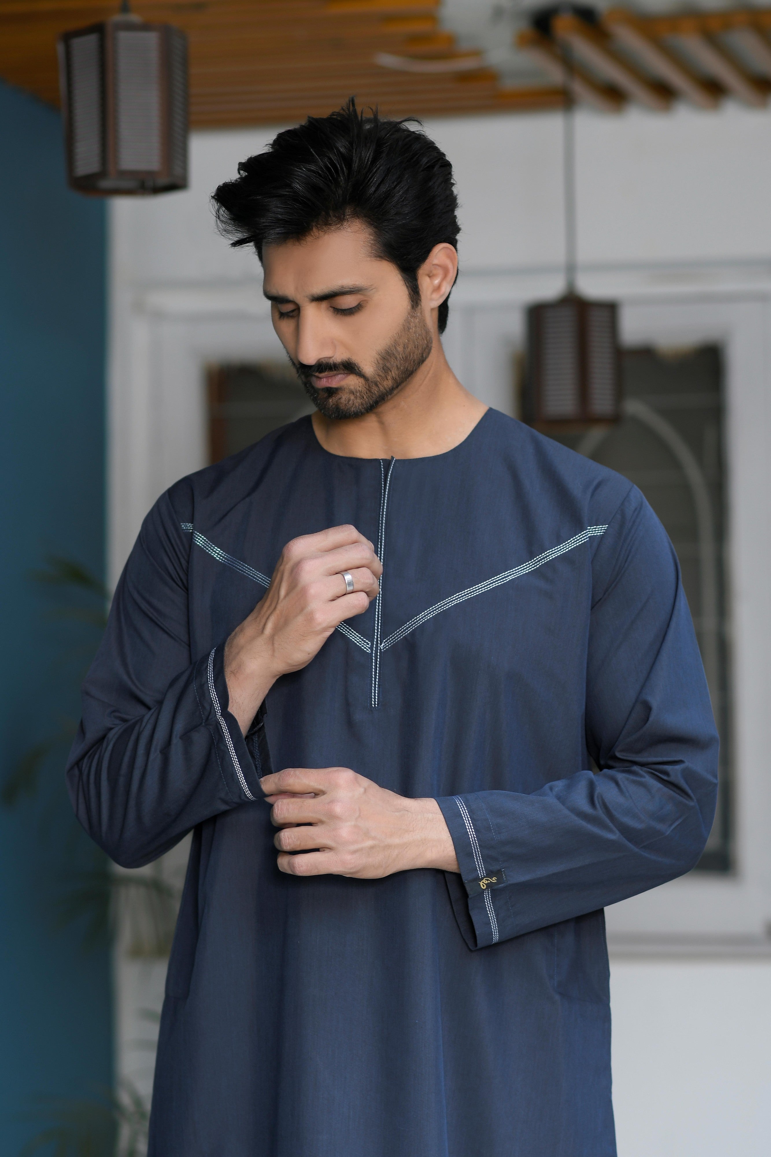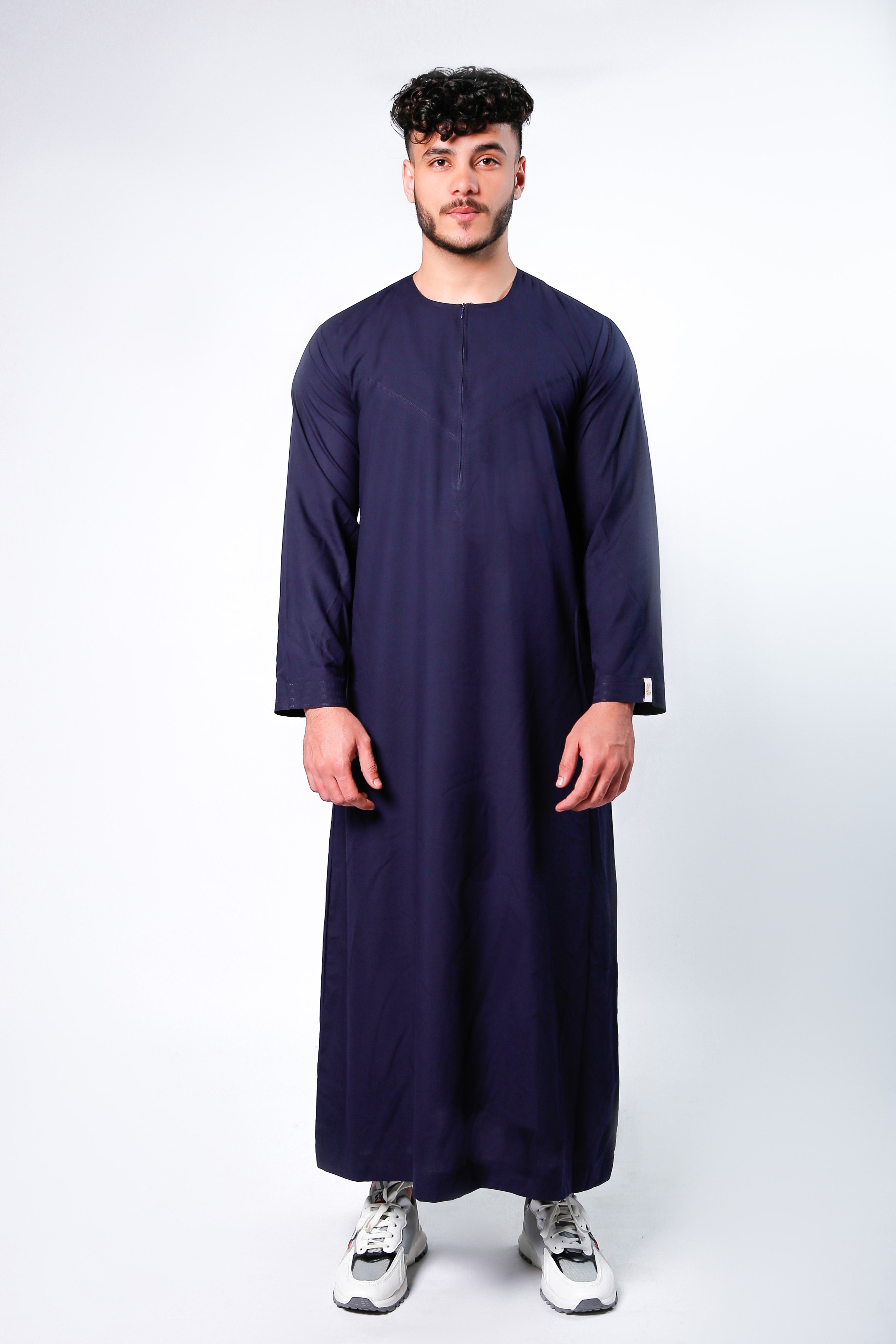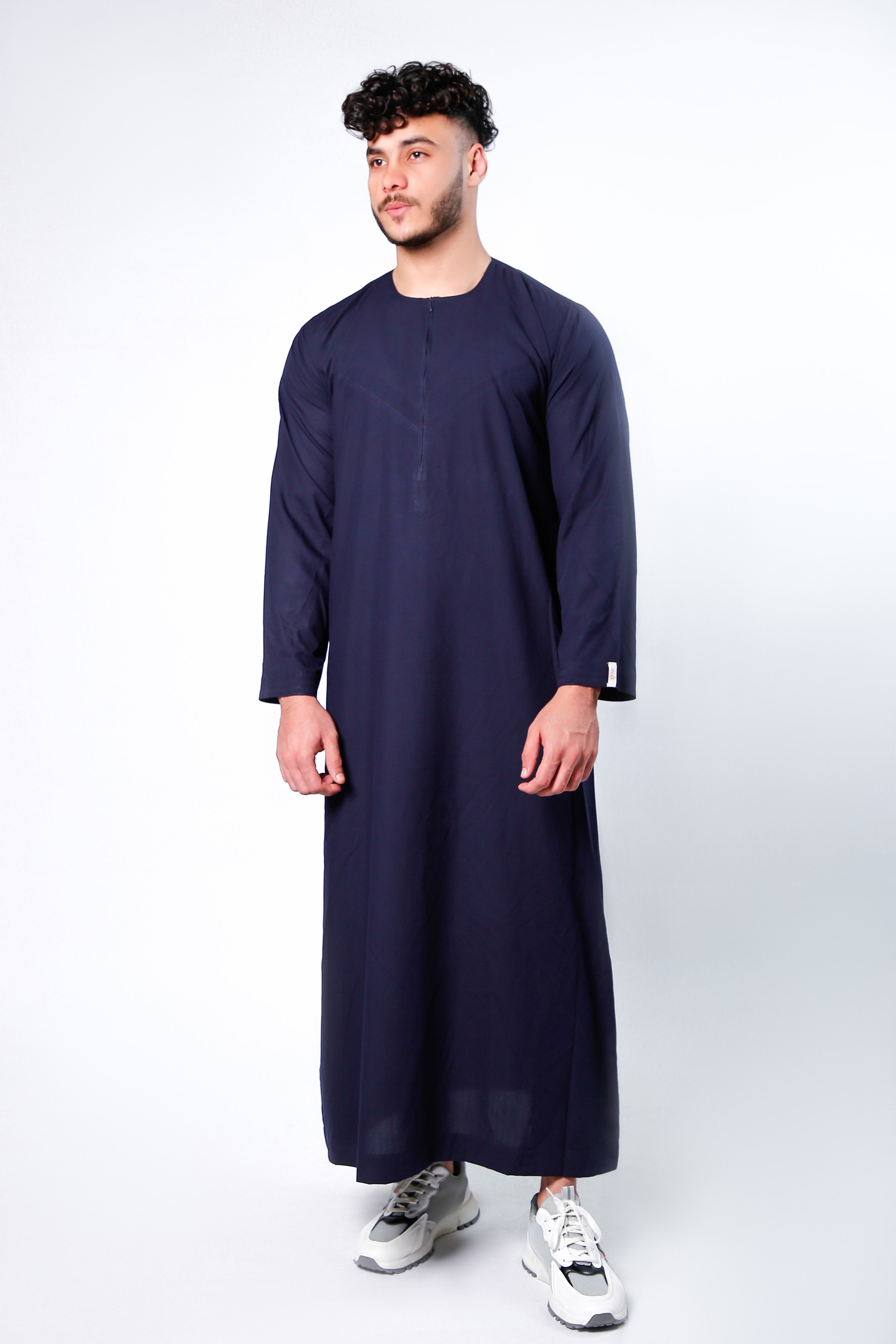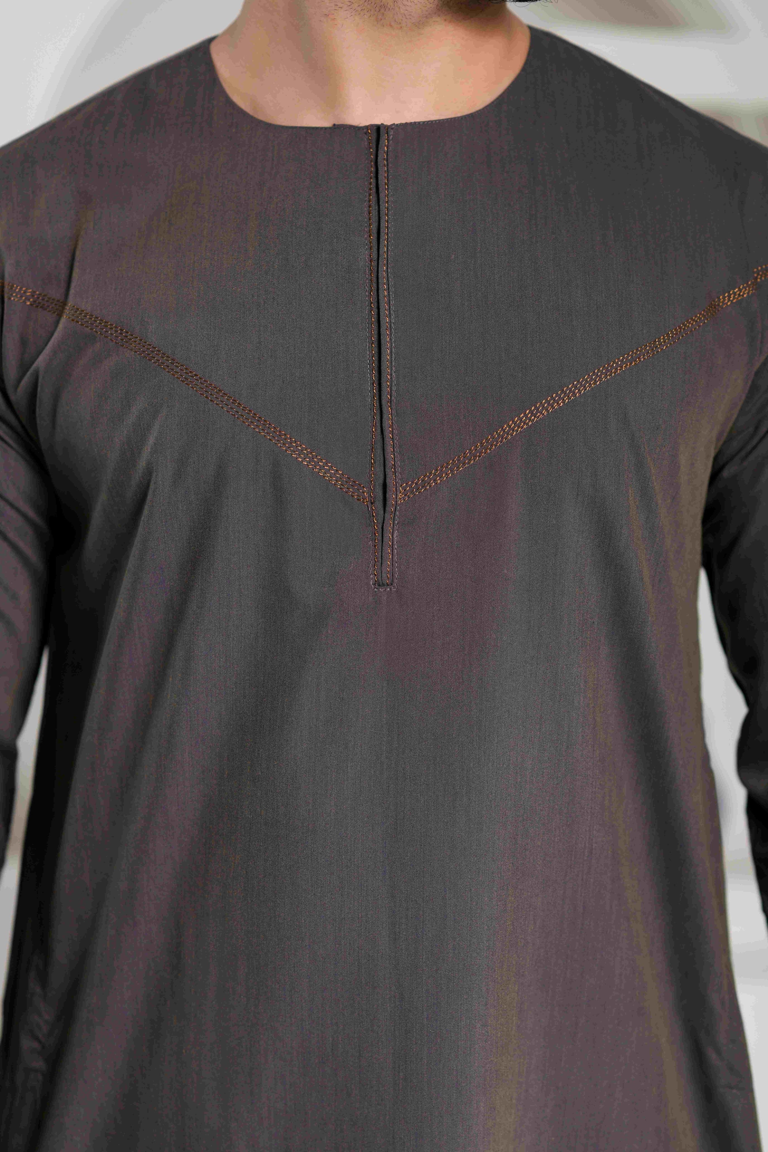 Navy Omani Round Neck Jubba with V Neck Stitched Embroidery