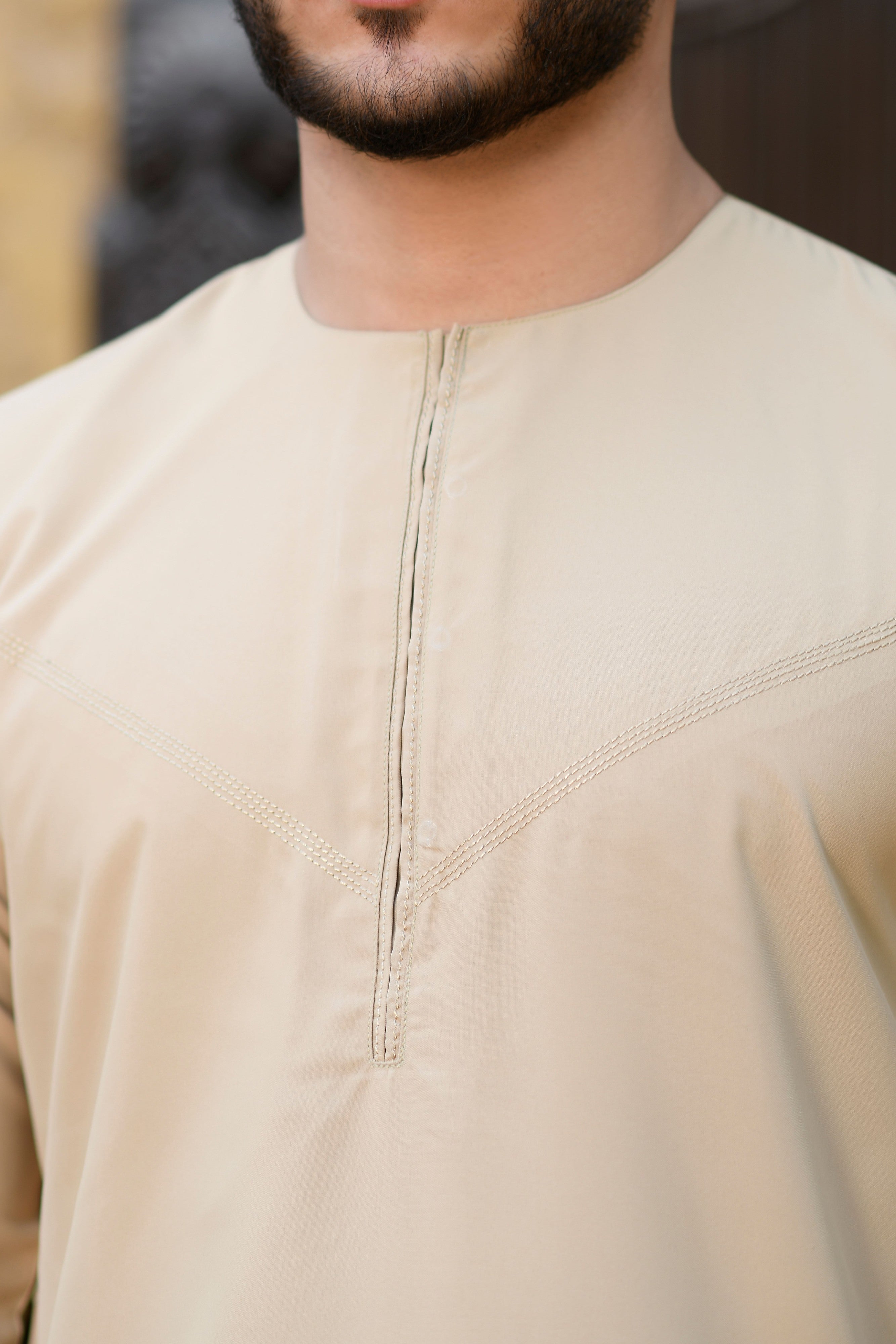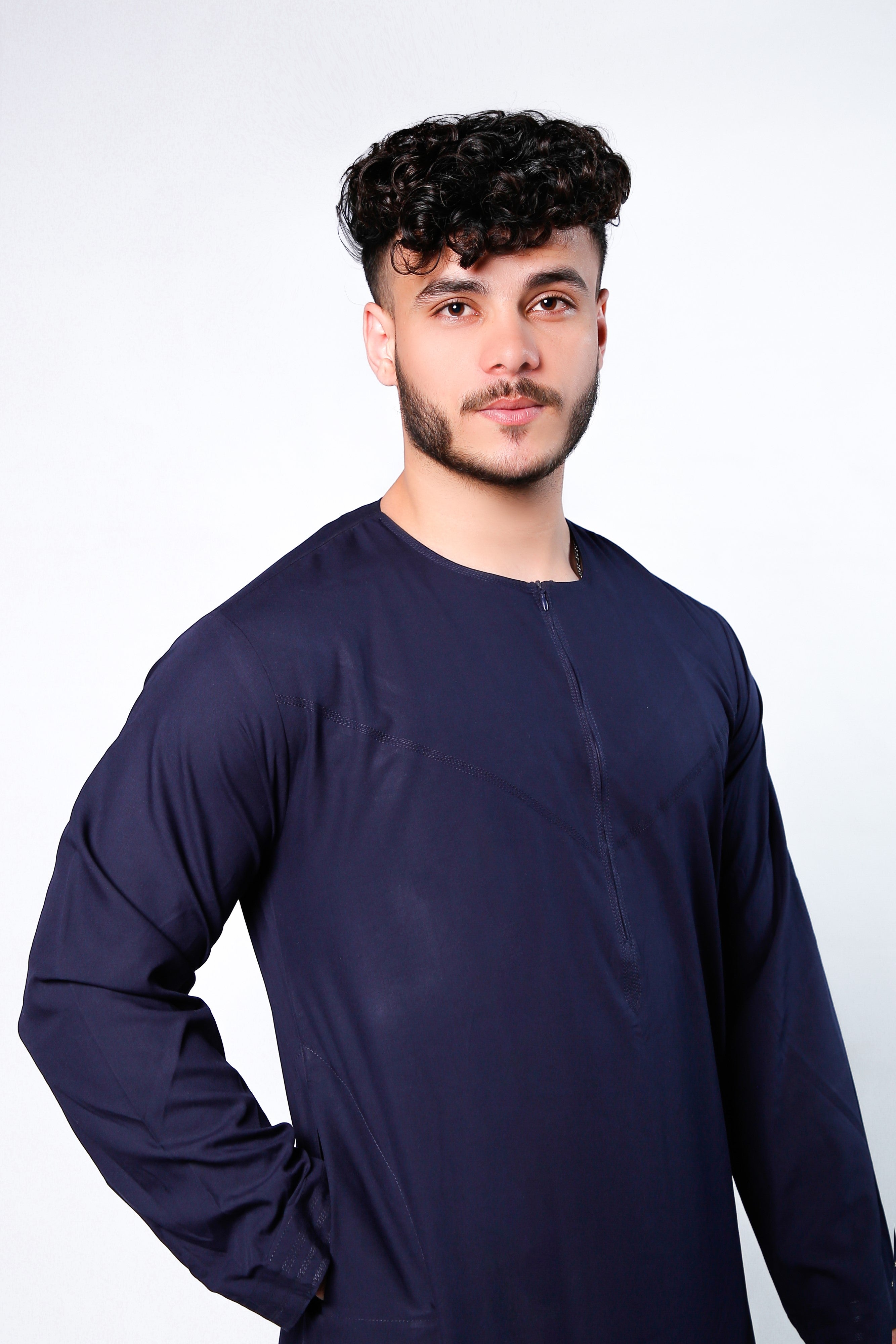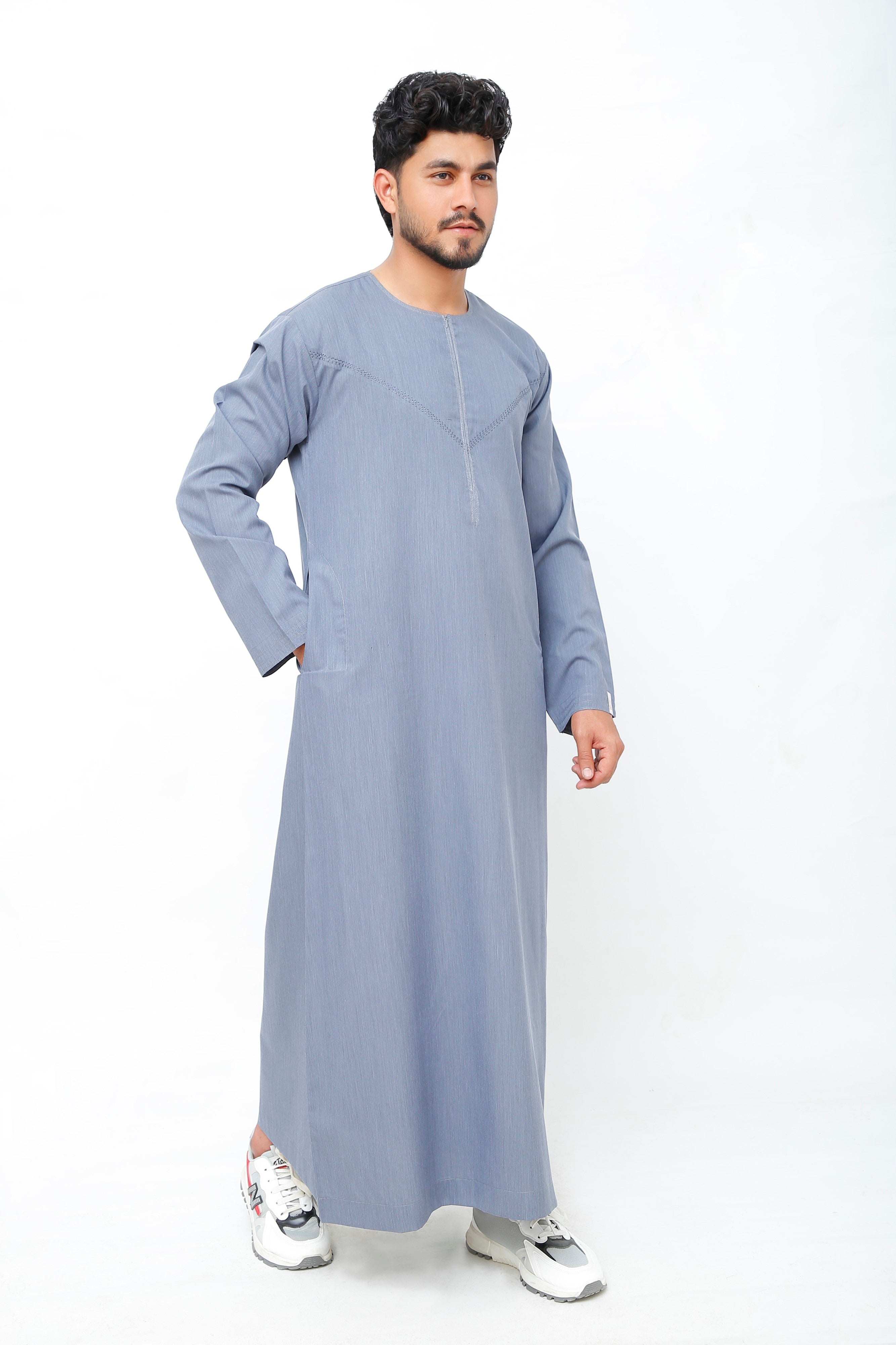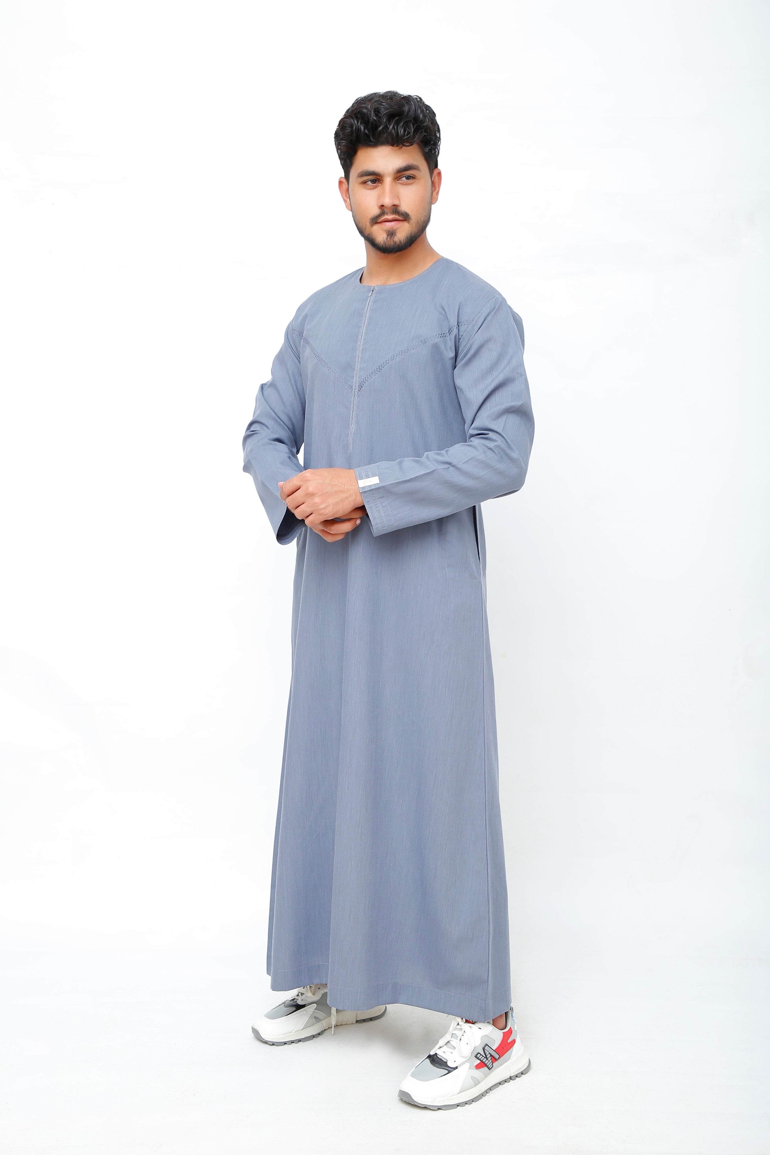 Navy Omani Round Neck Jubba with V Neck Stitched Embroidery