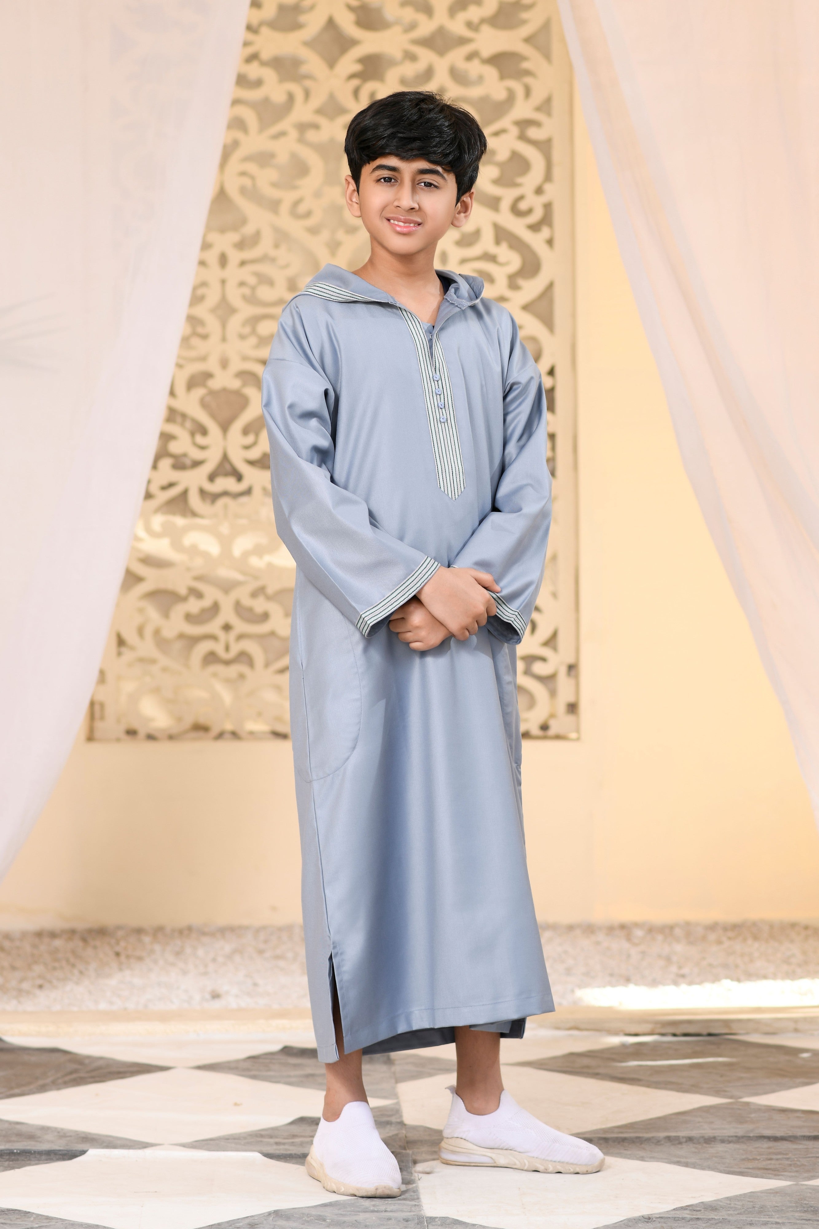 The added pockets offer practicality, allowing your child to carry small essentials effortlessly without sacrificing style. Whether it's a formal event, family gathering, or casual outing, this versatile Boys Hooded Jubba / Thobe is designed to make your child look sharp and feel comfortable in any setting.