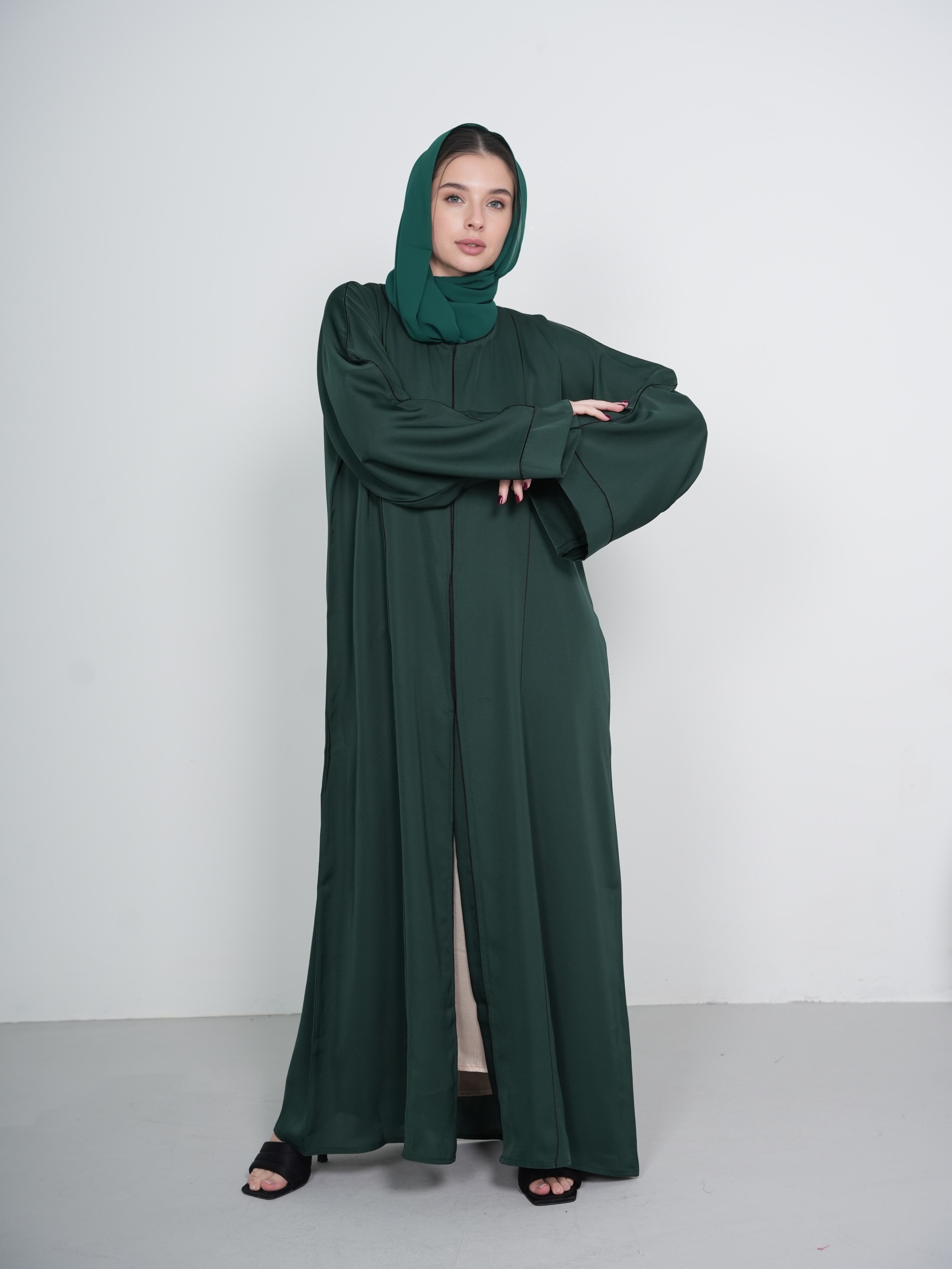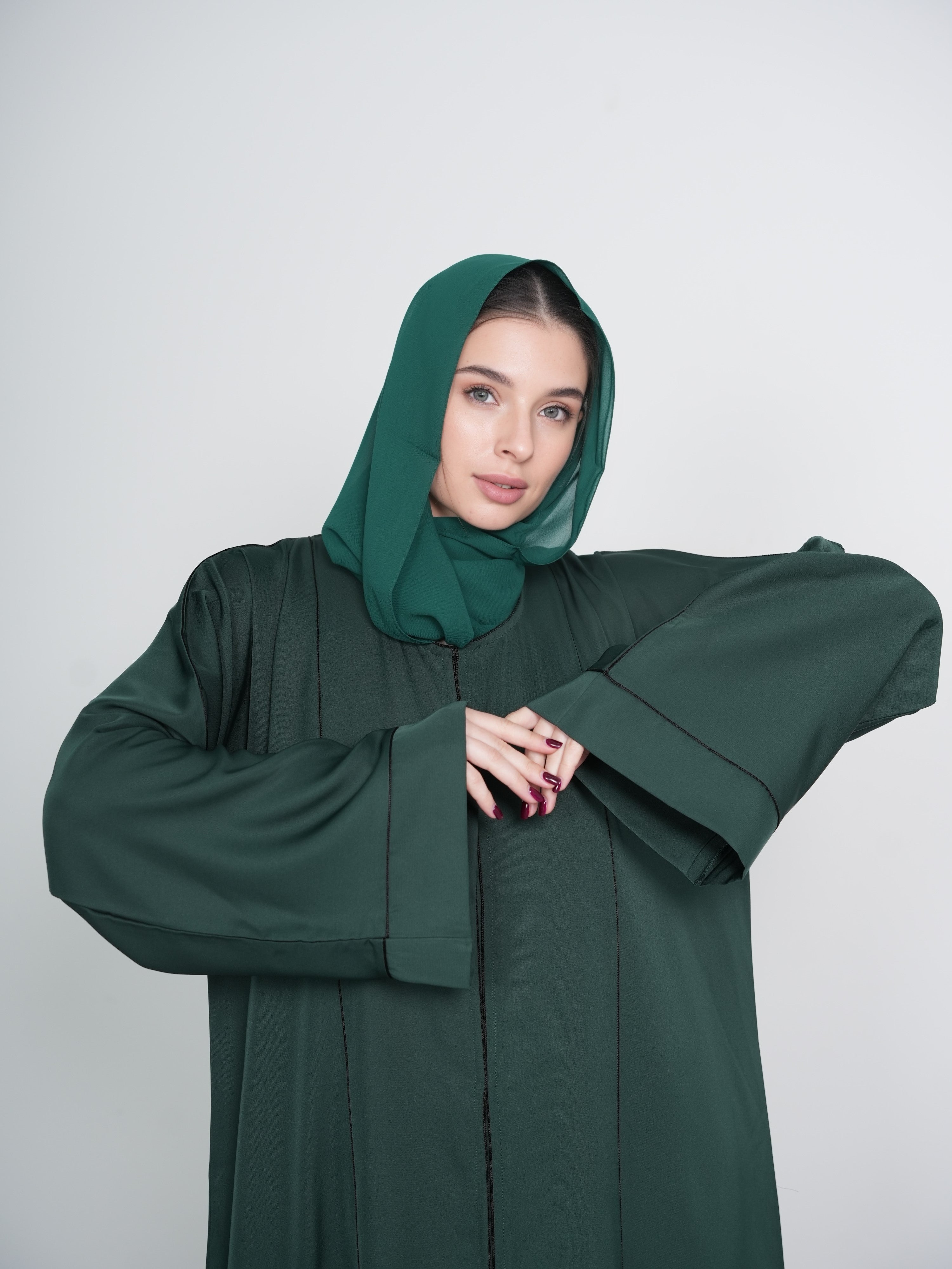 Featuring intricate stitch pipe detailing running throughout, this abaya adds a subtle yet striking texture that enhances its refined look. The clean lines and elegant silhouette flatter all body types, while the flowing fabric allows for ease of movement and all-day comfort.