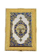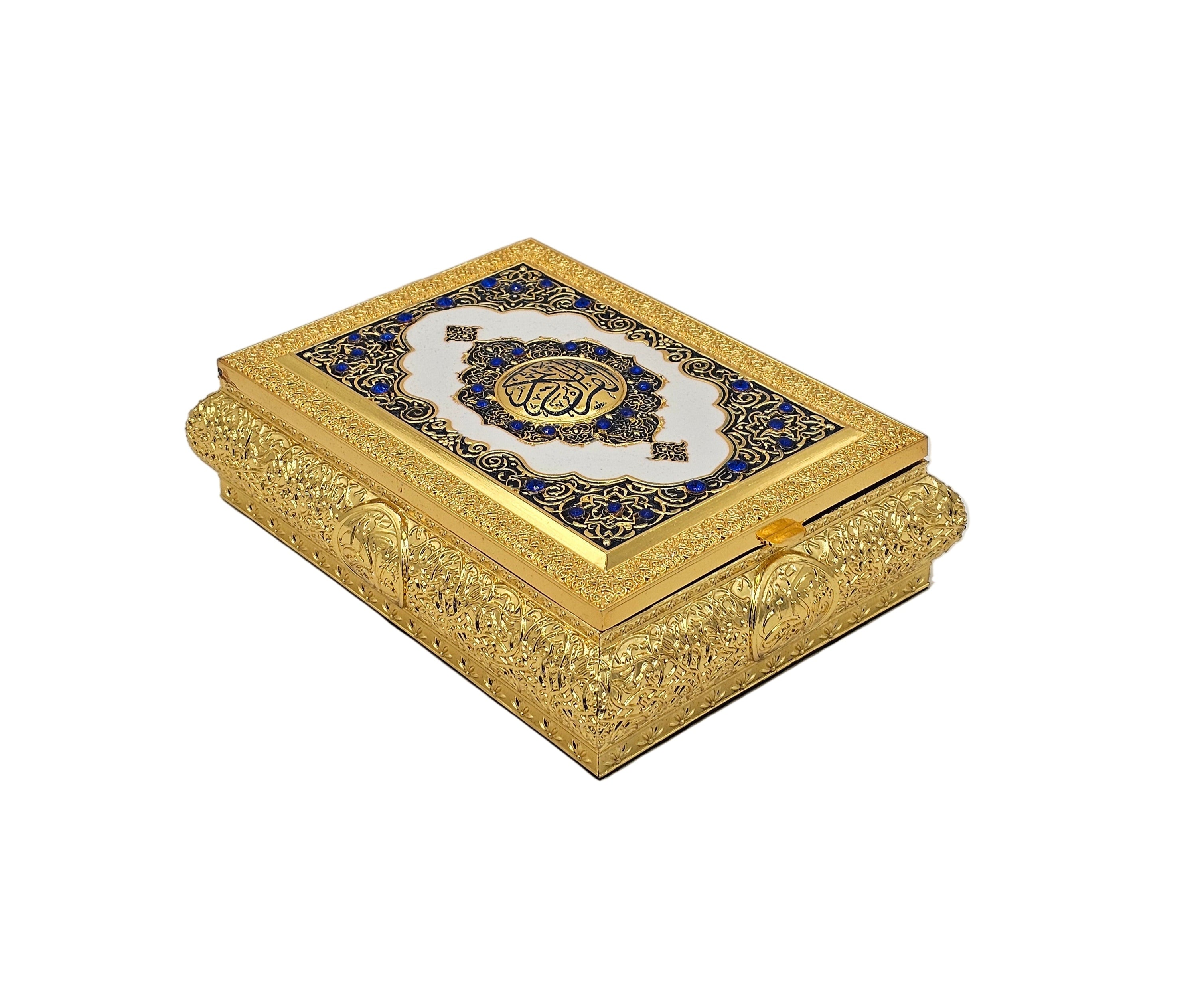 Protect and display your Holy Quran in style with our Blue, Gold & White Metal Quran Box – a stunning blend of durability, elegance, and Islamic tradition. Made from high-quality, heavy-duty metal, this box is designed to last, while its intricate detailing and luxurious color combination make it a standout piece in any home or prayer space.