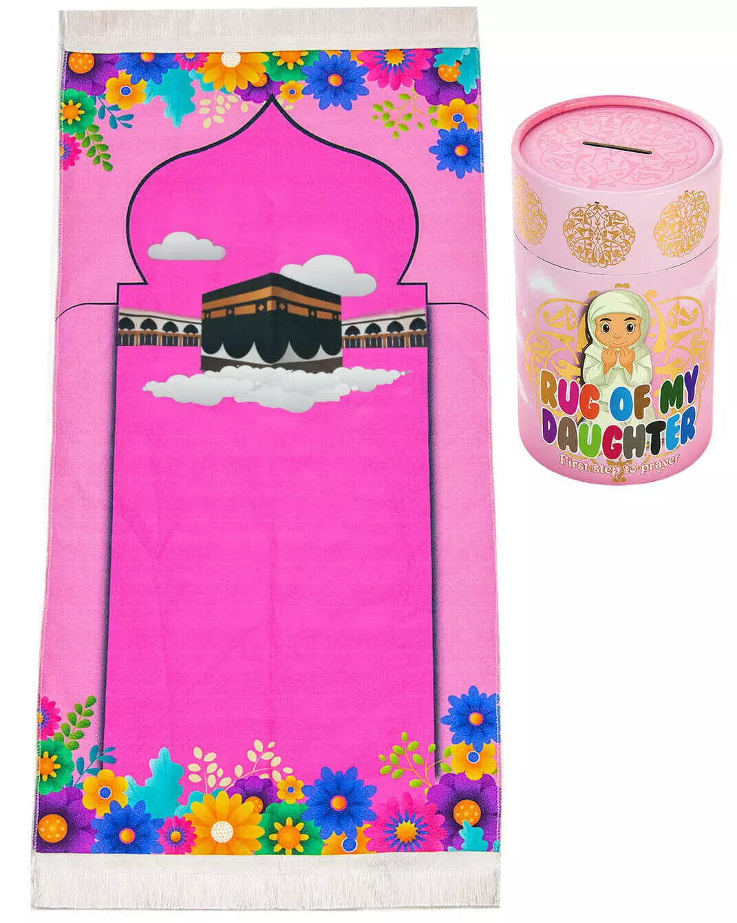 GREAT VALUE - The prayer rug set is designed for children. It will be a lot of fun to get your child used to prayer with this set. With the piggy bank feature in the cylindrical box, you can put a gift inside each time you pray and get your child used to praying.